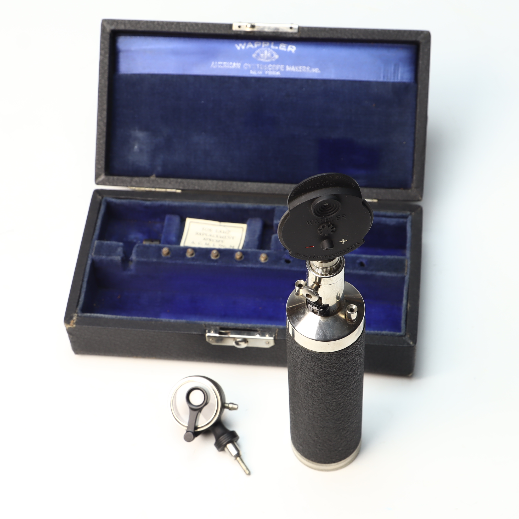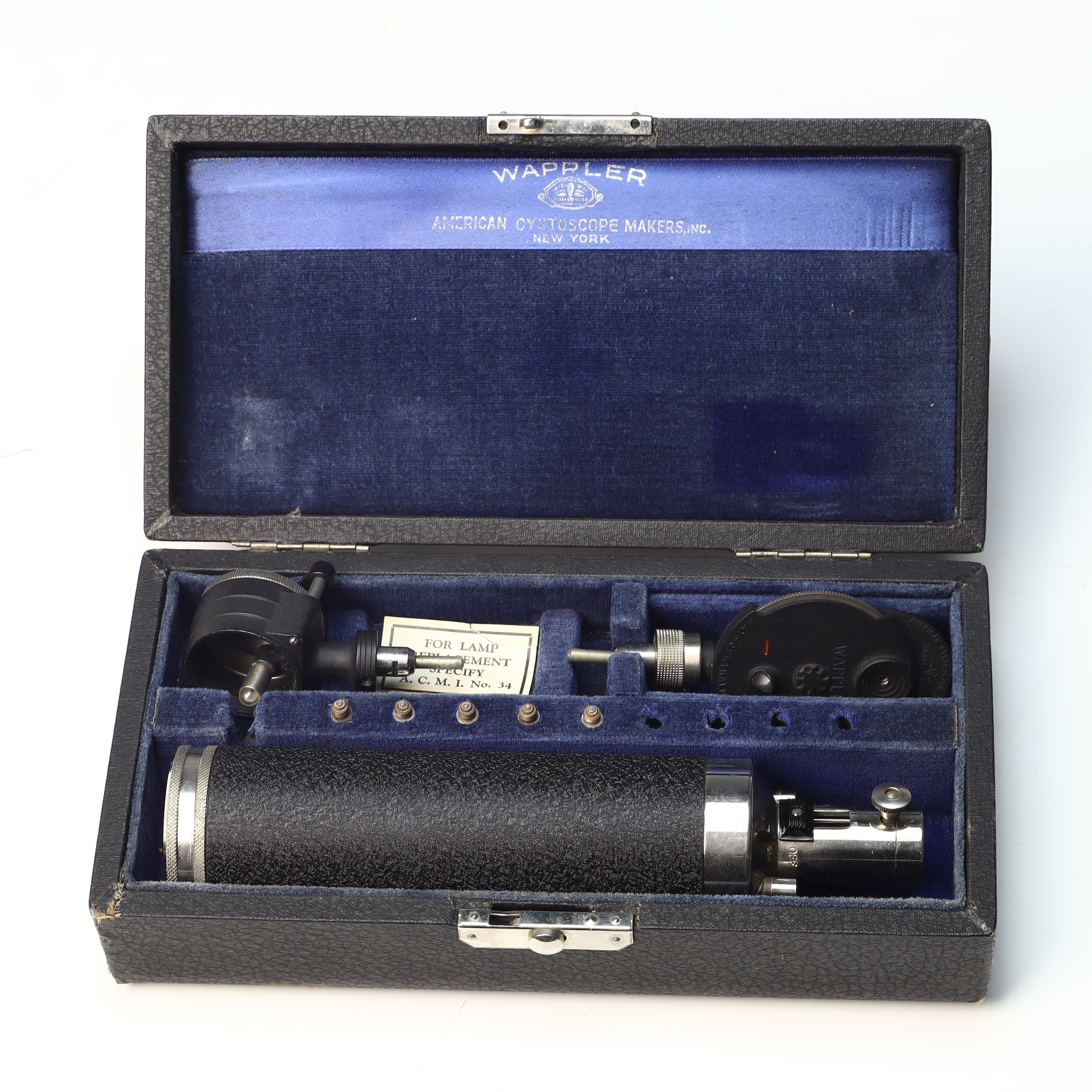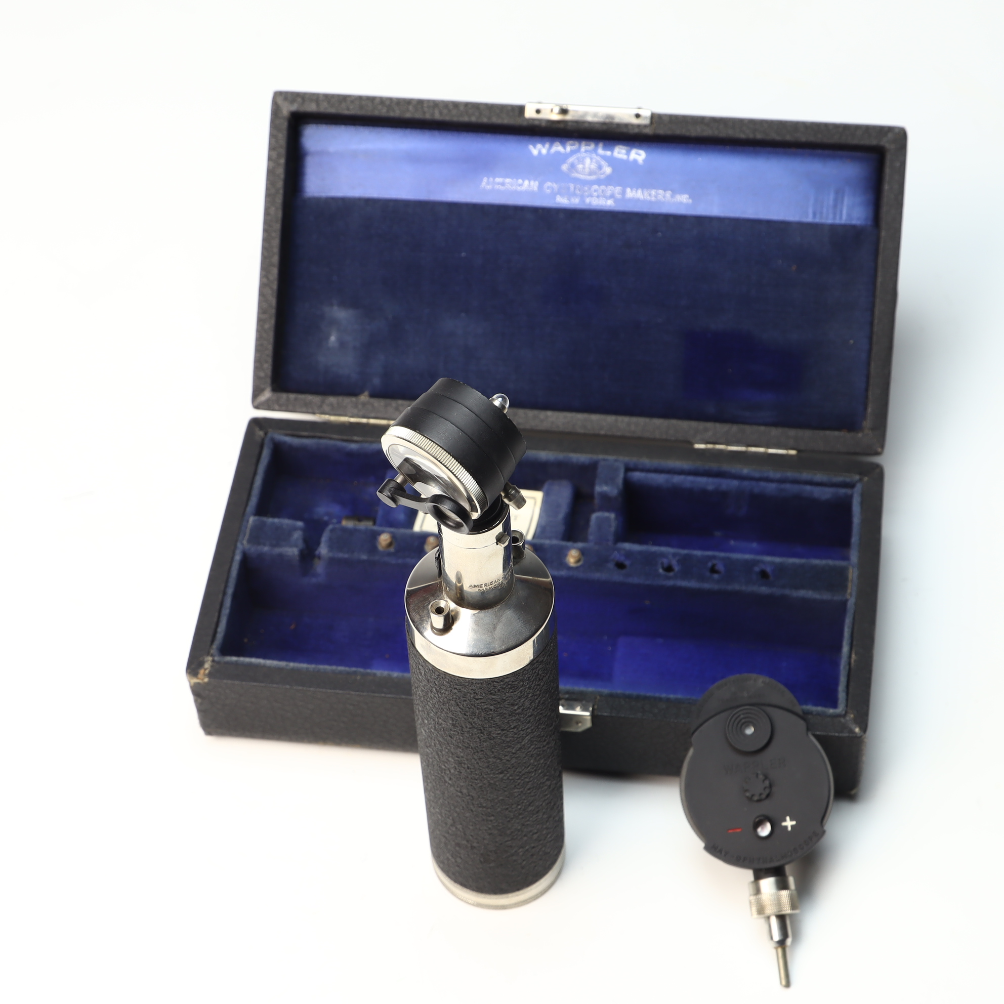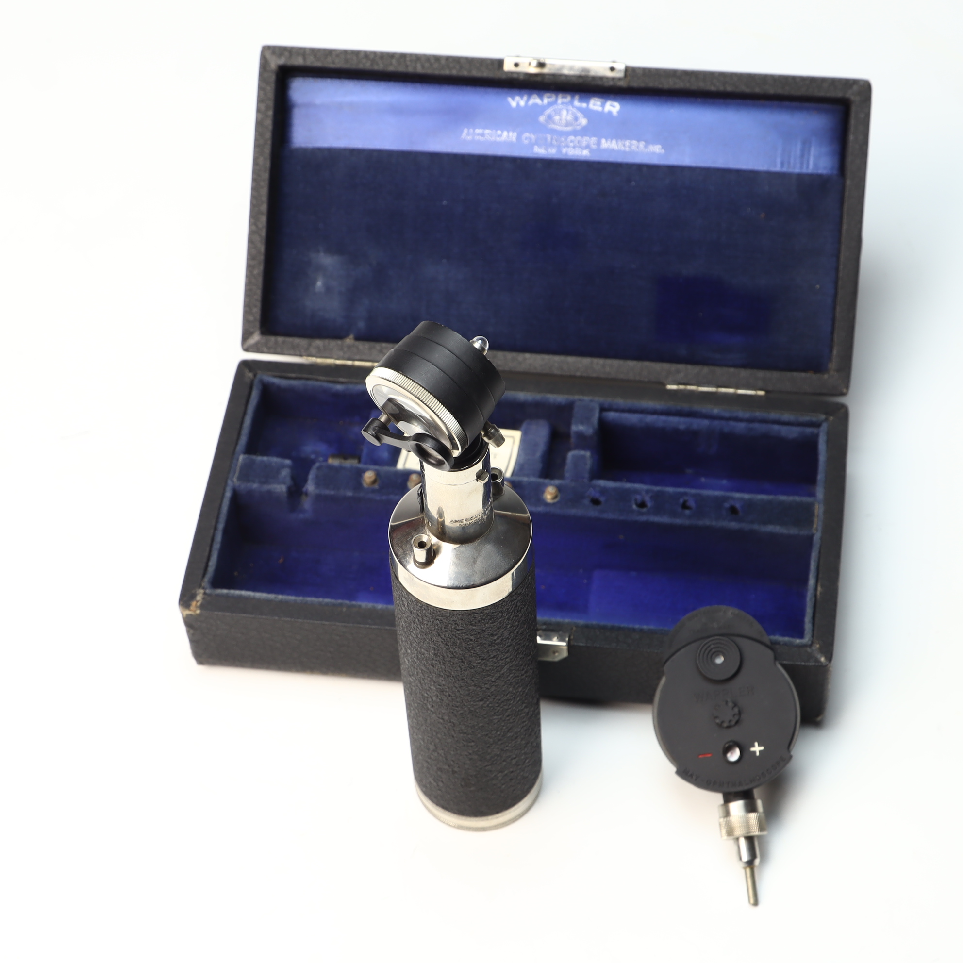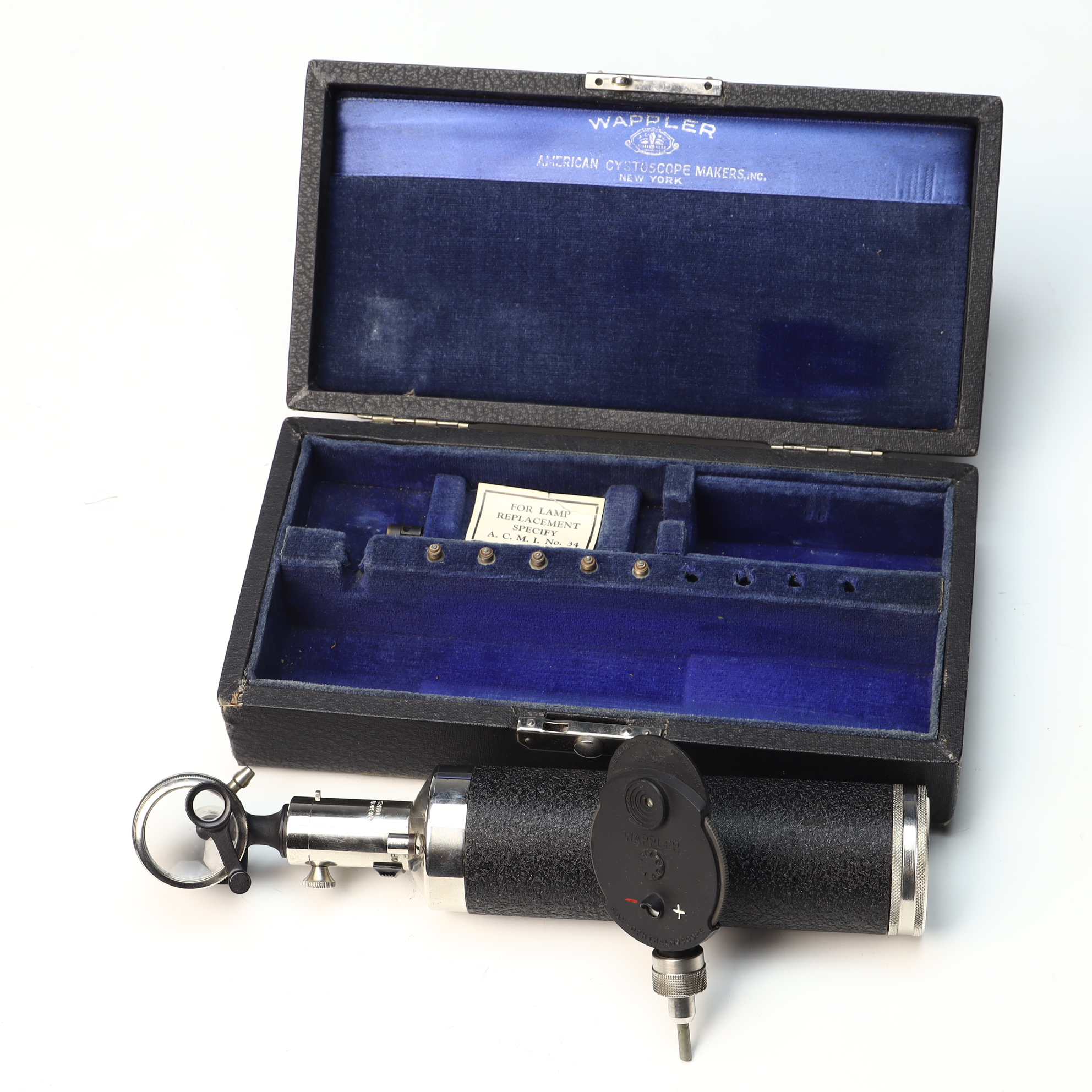 A mid-20th century medical diagnostic set manufactured by American Cystoscope Makers, Inc. (A.C.M.I.) under the Wappler brand name. The professional set includes a battery-powered handle, a May-Ophthalmoscope head, an otoscope head with a hinged magnifying lens, and six graduated chrome-plated metal ear speculums. The instruments are constructed from chrome-plated and black-finished metal, with the handle featuring a textured black grip. The set is housed in its original rectangular presentation case with a black textured faux-leather exterior and a blue velvet and satin-lined interior. The interior lid is printed with Wappler, a central circular trade mark logo, and American Cystoscope Makers, Inc. New York. The handle neck is incised with American Cystoscope Makers, Inc. N.Y. The ophthalmoscope head is marked Wappler and May-Ophthalmoscope, featuring a rotating lens disk with a numerical scale in red and white. A small paper tag in the case specifies lamp replacement for A. C. M. I. No. 34.