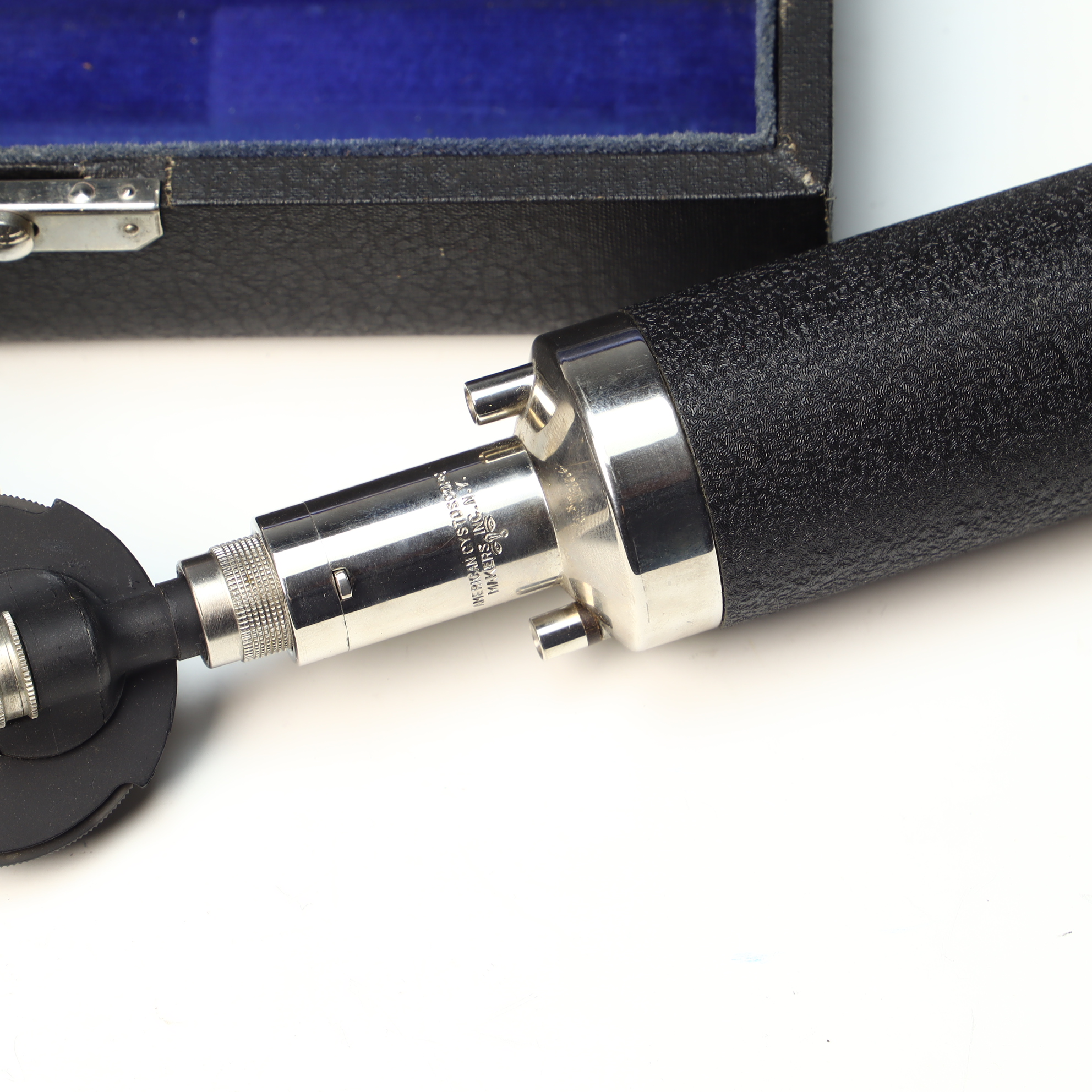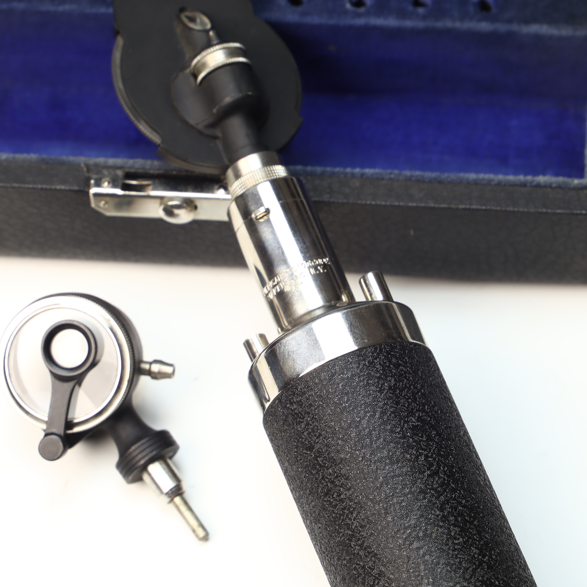 The set is in well-preserved vintage condition and appears substantially complete. Lenses in both diagnostic heads are clear and free of significant scratches. Mechanical components, including the ophthalmoscope lens disk and the otoscope hinge, operate smoothly. The chrome-plated surfaces exhibit light wear and minor tarnishing consistent with age and clinical use. The case exterior shows minor scuffing at the corners, while the interior lining remains well-preserved. Electrical functionality and lamp operation have not been tested.