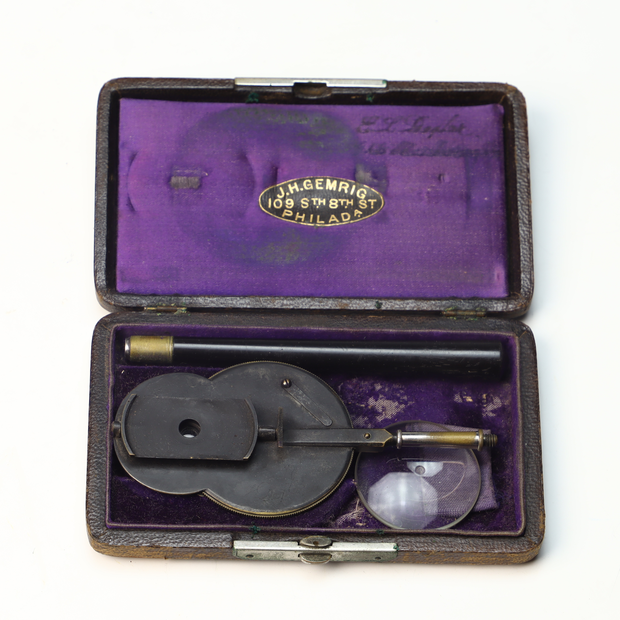 This Dr. Loring’s model ophthalmoscope was manufactured by the firm of J.H. Gemrig in Philadelphia. The instrument is constructed of blackened brass and features a detachable handle made of ebonized wood or hard rubber. The set consists of the main ophthalmoscope head with a rotating lens disk, a flip-down auxiliary lens mount, and a separate large biconvex glass condensing lens. The exterior of the case lid is embossed in gold lettering with Dr. Lorings Ophthalmoscope. A gold-printed label on the purple velvet lining of the lid reads J.H.GEMRIG / 109 STH 8TH ST / PHILADA. The rotating disk is engraved with two circular scales of numbers including 1, 2, 3, 4, 5, 6, 7, 8, 9, 10, 12, 15, 20, 24, and 48. Faint ink handwriting is visible on the velvet lid lining, appearing to read C. L. Taylor. The components are housed in a rectangular wood case covered in dark brown leather with a push-button brass latch and a fitted purple velvet interior.