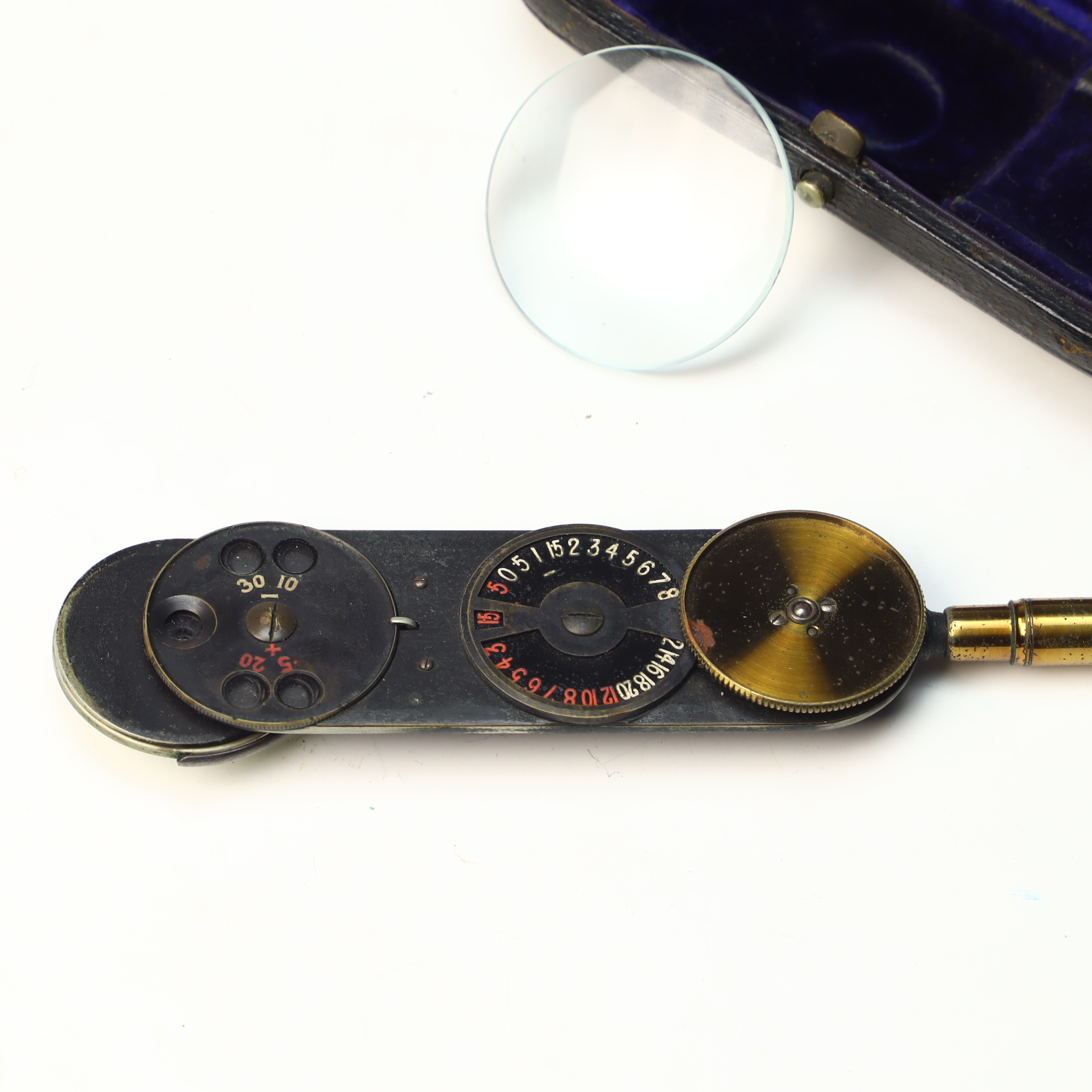 The instrument shows visible wear to the black finish on the brass body. The cream-colored handle remains intact. The rotating dials and internal chain mechanism appear functional, though they have not been tested for mechanical fluidity. The lenses are intact with some surface dust and minor oxidation present. The case exhibits moderate shelf wear, scuffing to the exterior, and minor staining to the interior silk padding.