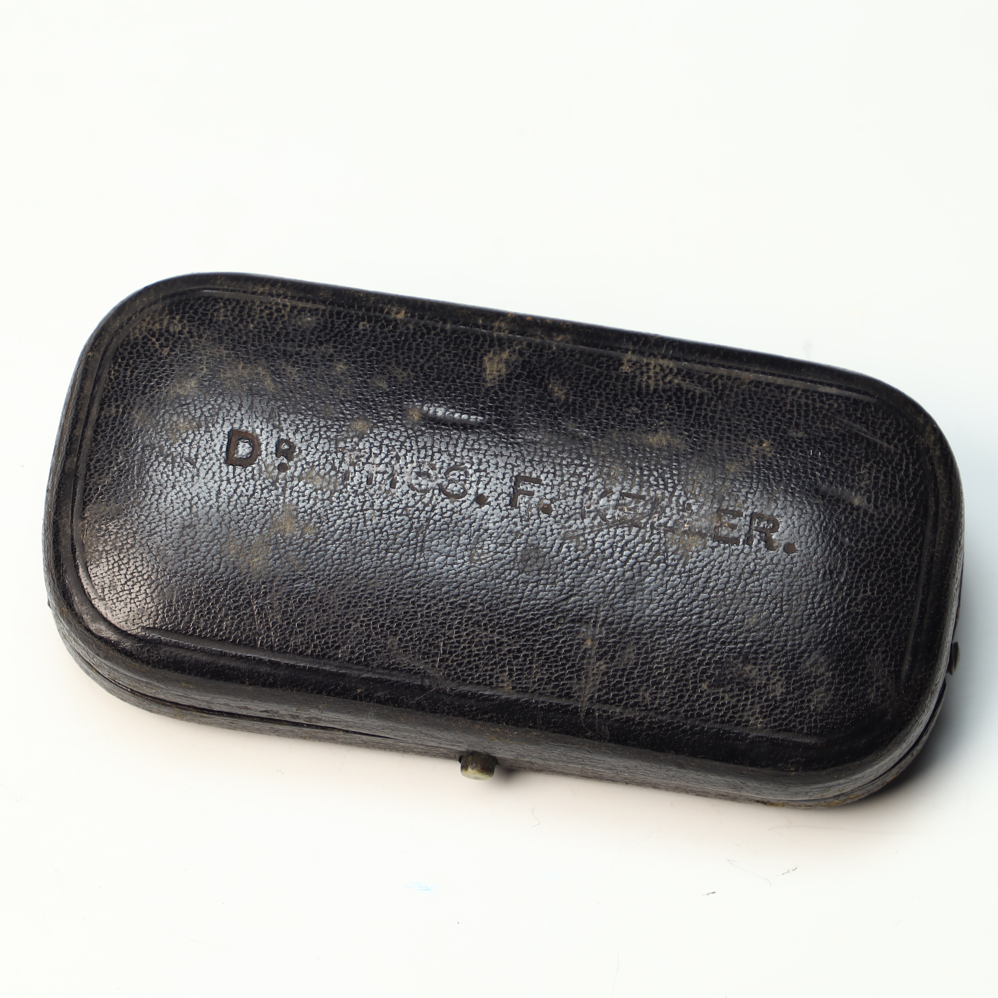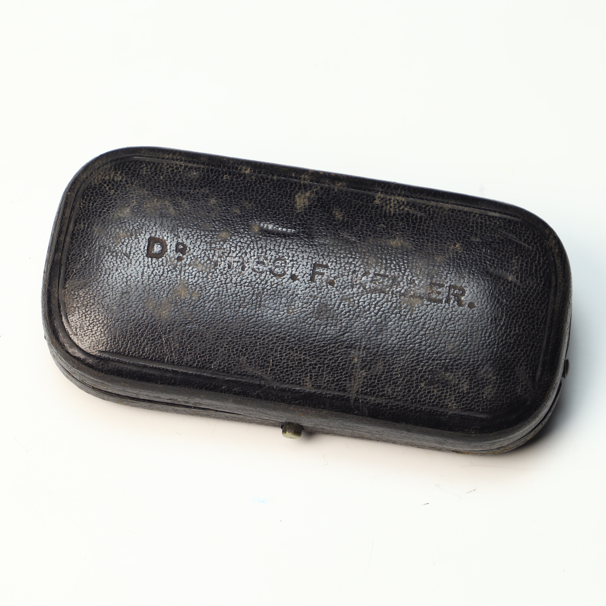 This professional medical diagnostic instrument is a Morton’s Ophthalmoscope manufactured by the firm Curry and Paxton of London. The instrument is constructed with a blackened brass body and features a cream-colored handle. It is equipped with three rotating dials, including a primary lens selection wheel with diopter powers marked in white for positive and red for negative values. The reverse of the instrument body is incised with the text MORTON’S OPHTHALMOSCOPE CURRY & PAXTON LONDON. The set is housed in its original hardshell case with a textured black exterior and a dual-tone interior lined with purple velvet and blue silk. The interior lid contains an oval gold stamp for CURRY & PAXTON. The exterior of the case is stamped with the name DR. J.E.G.F. KELLER. The lot includes the primary ophthalmoscope and one detached large condensing lens.