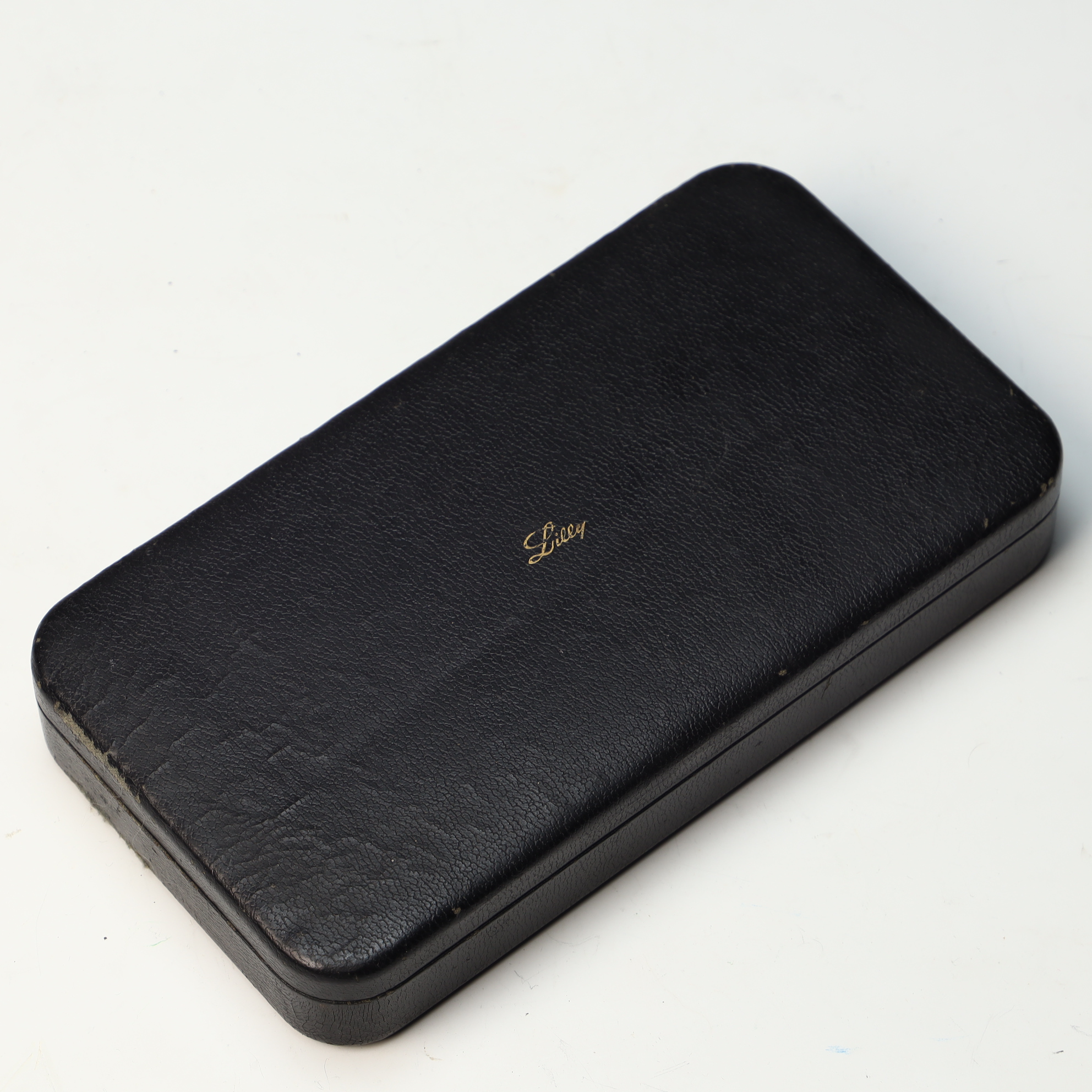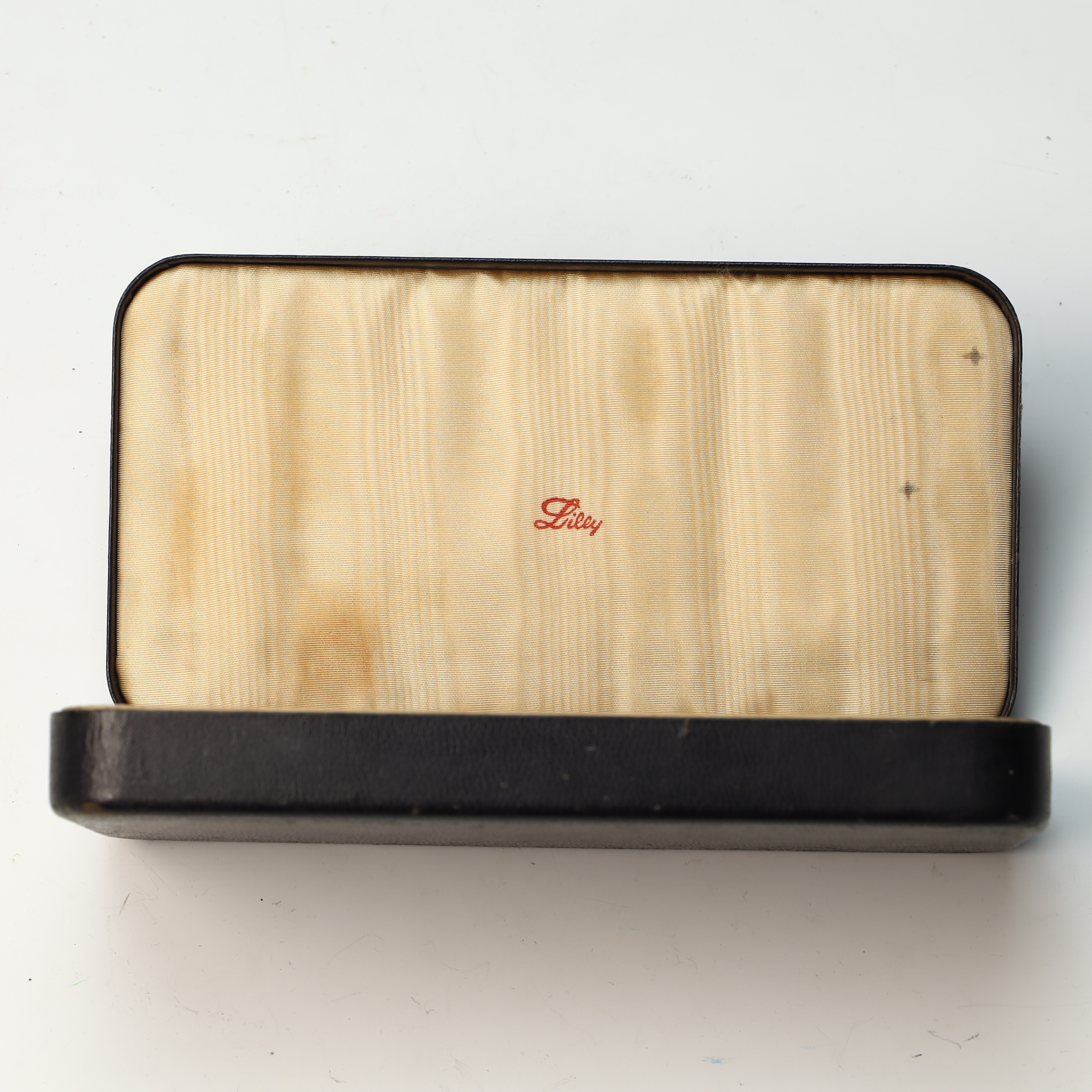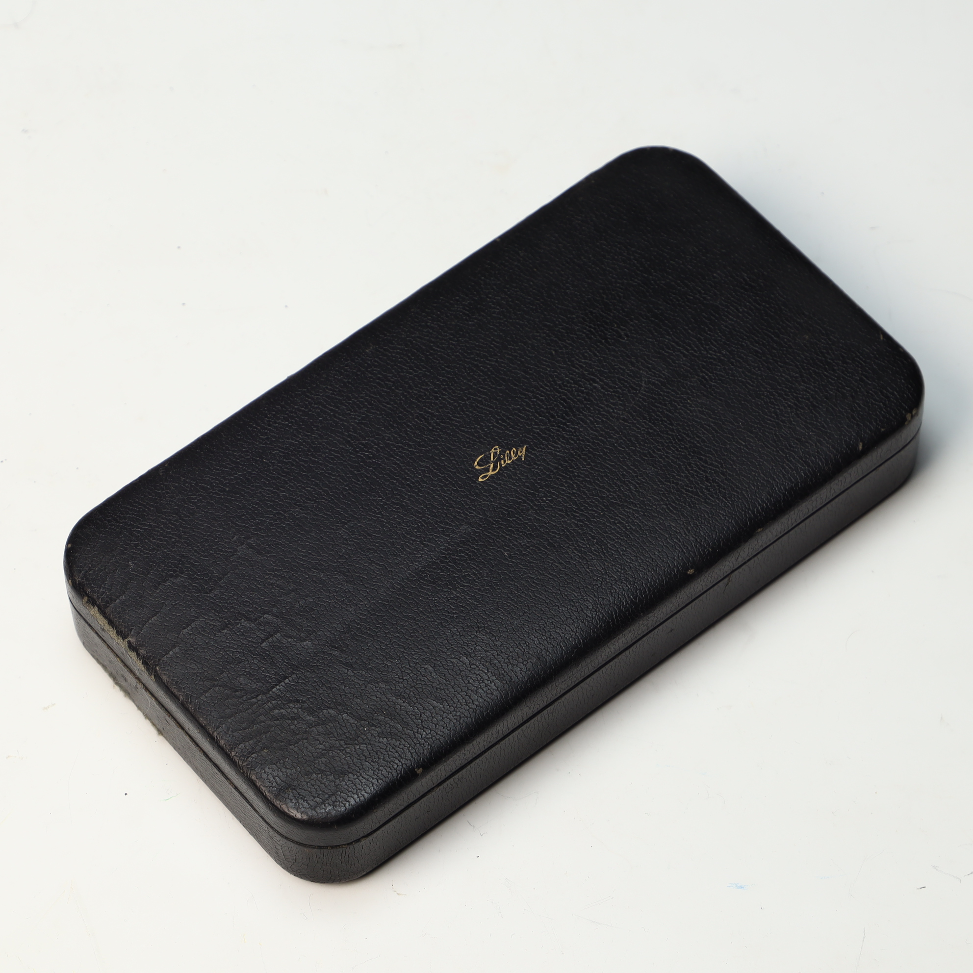 A vintage pharmaceutical presentation or sample case featuring a black textured exterior with the Lilly cursive script mark in gold on the lid. The interior is lined with champagne-colored satin and bears the Lilly mark in red script. The base contains a molded black insert with multiple compartments designed to hold glass ampoules. Included in the case is one 4 mL glass ampoule of Levophed brand of norepinephrine bitartrate injection, USP, produced by Winthrop Laboratories. The ampoule remains sealed and contains its original liquid contents.