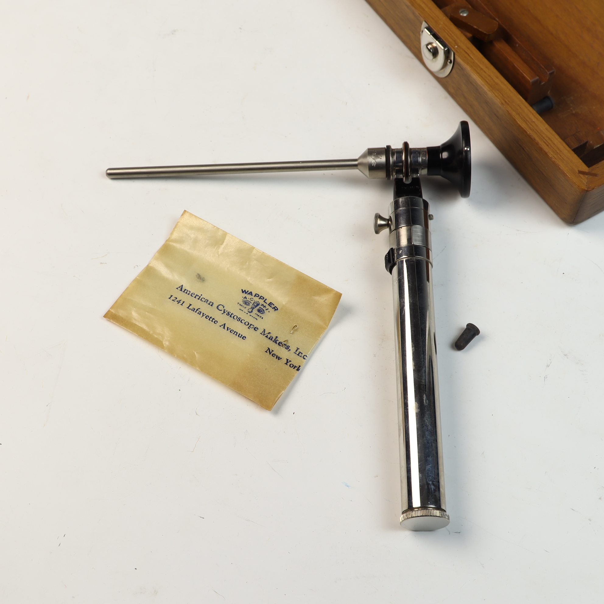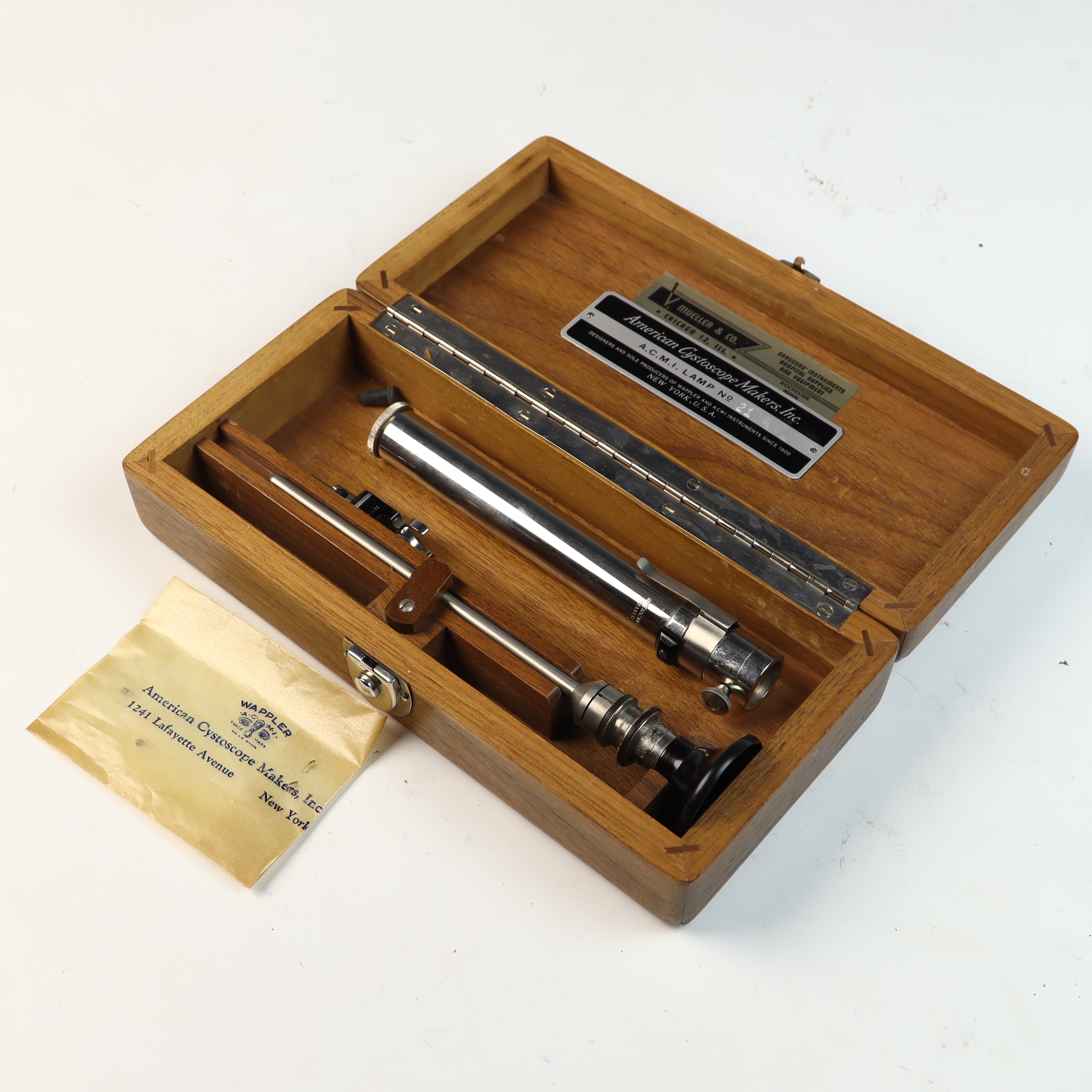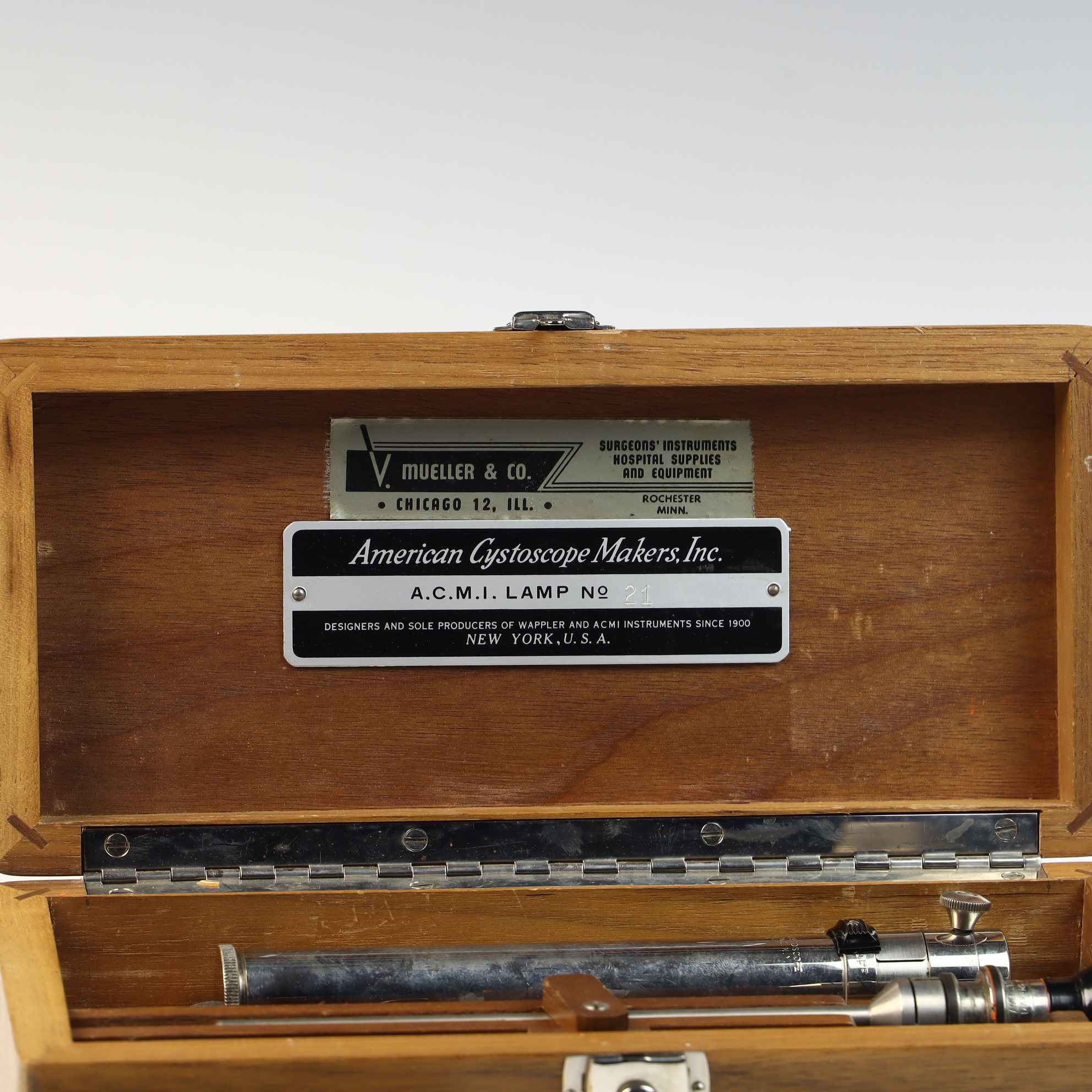 This vintage medical diagnostic set was manufactured by American Cystoscope Makers, Inc. (A.C.M.I.) of New York and distributed by V. Mueller & Co. The set is designed for cystoscopic examination and consists of a rigid telescope and a power supply handle. The telescope features a black flared eyepiece and a slender metal shaft. It is accompanied by a large cylindrical battery handle constructed of polished metal with a sliding switch marked ON and OFF. Components are made of chrome-plated or stainless steel with glass optical elements and rubber fittings.The interior of the fitted wooden storage case contains two primary identification plates. The first plate is inscribed American Cystoscope Makers, Inc. A.C.M.I. LAMP No 21 DESIGNERS AND SOLE PRODUCERS OF WAPPLER AND ACMI INSTRUMENTS SINCE 1900 NEW YORK, U.S.A. The second label reads V. MUELLER & CO. CHICAGO 12, ILL. ROCHESTER MINN. SURGEONS’ INSTRUMENTS HOSPITAL SUPPLIES AND EQUIPMENT. The eyepiece section of the instrument is engraved with WAPPLER above an eye-shaped logo and A.C.M.I. NEW YORK. An included translucent paper envelope is printed with WAPPLER, the eye logo, and American Cystoscope Makers, Inc. 1241 Lafayette Avenue New York. The case is constructed of hardwood with a metal piano hinge and a silver-tone front latch.