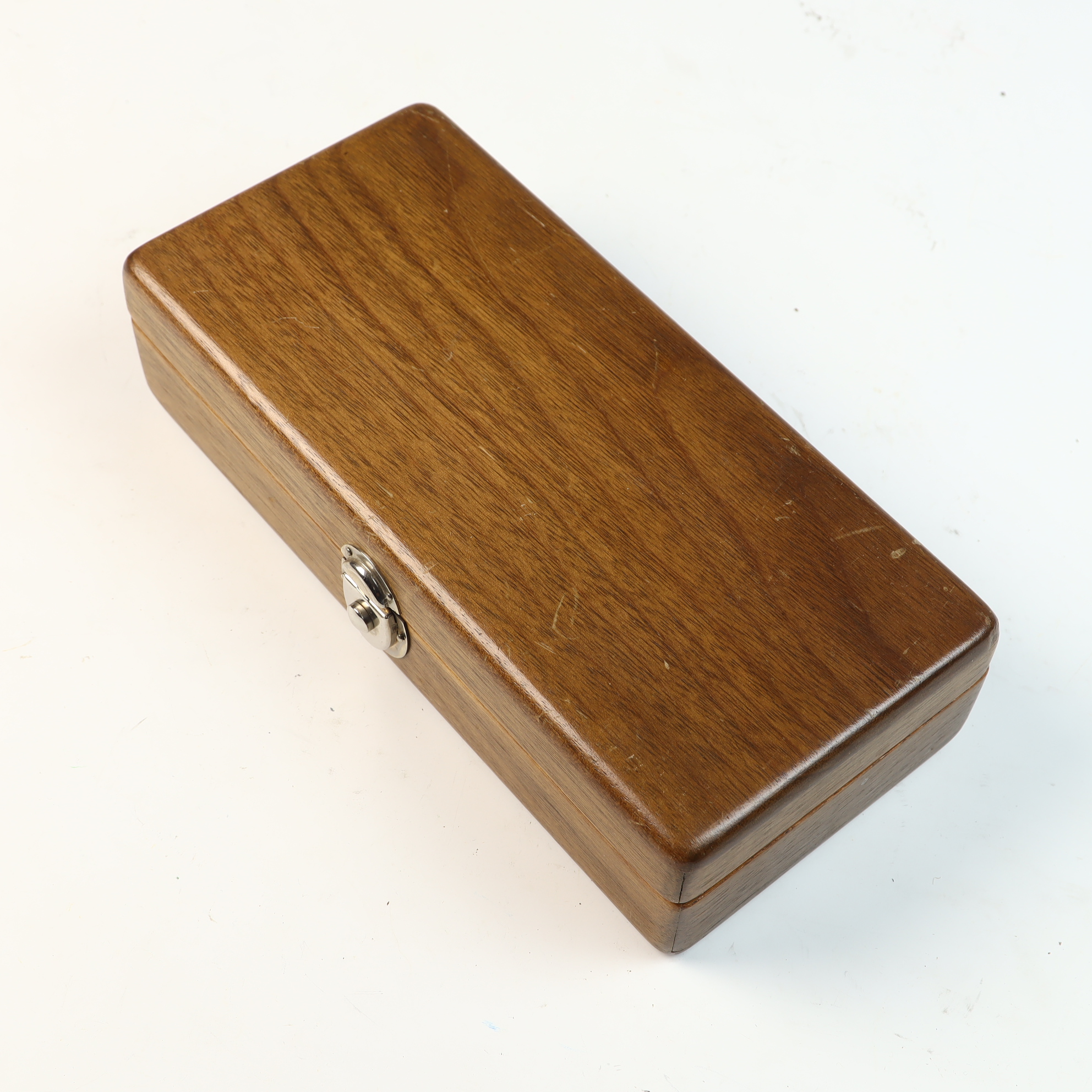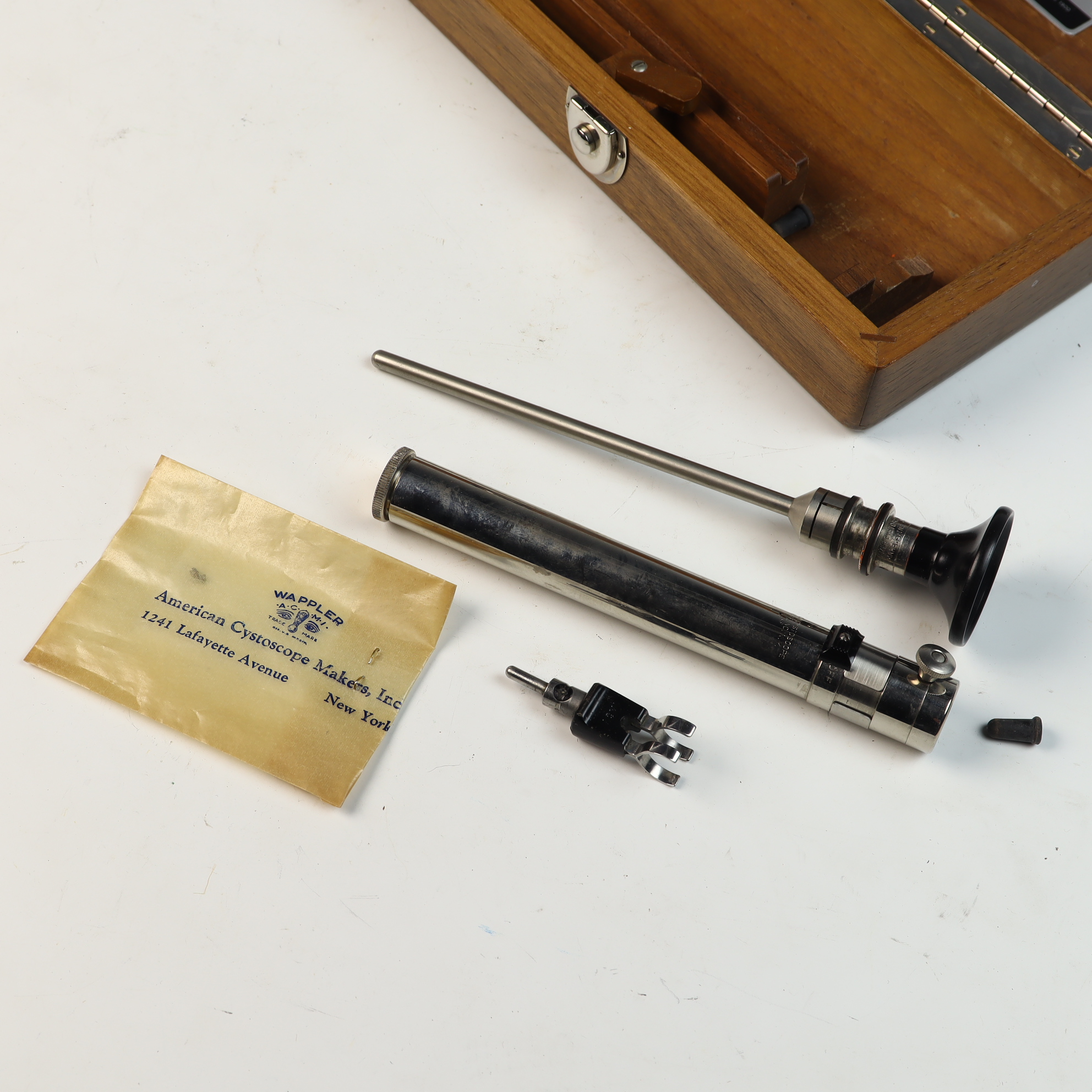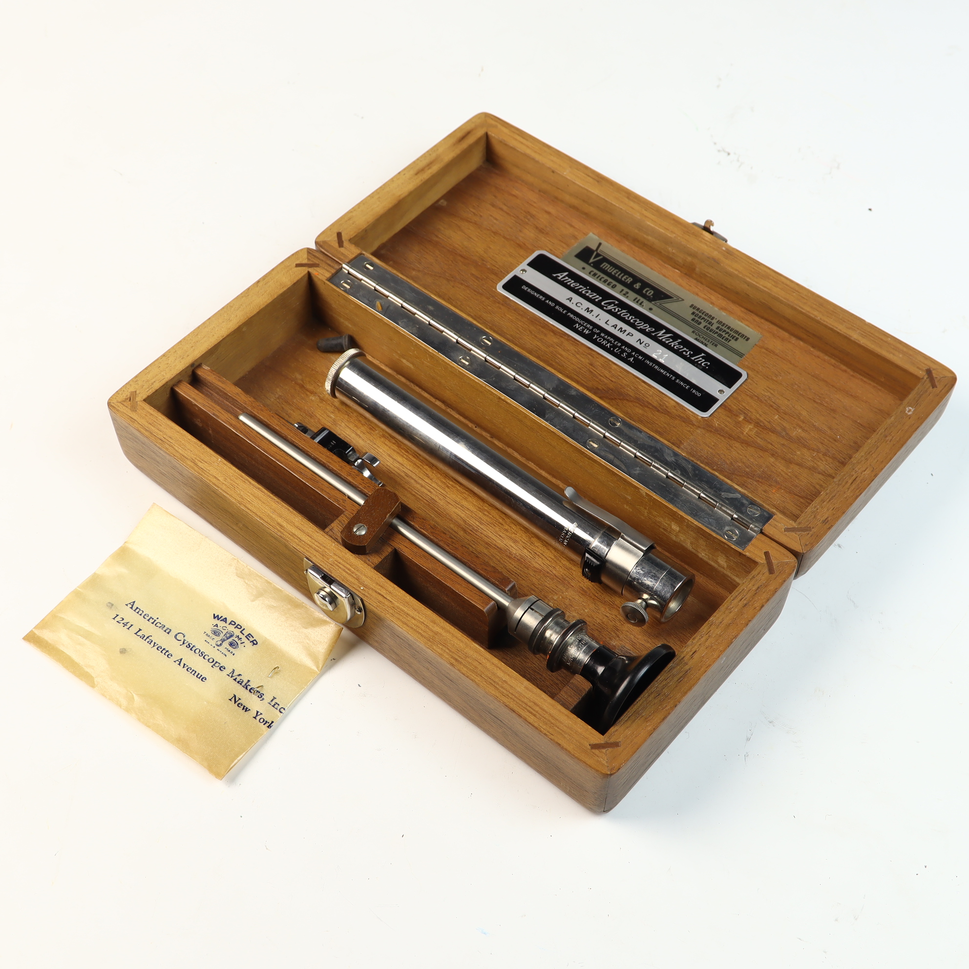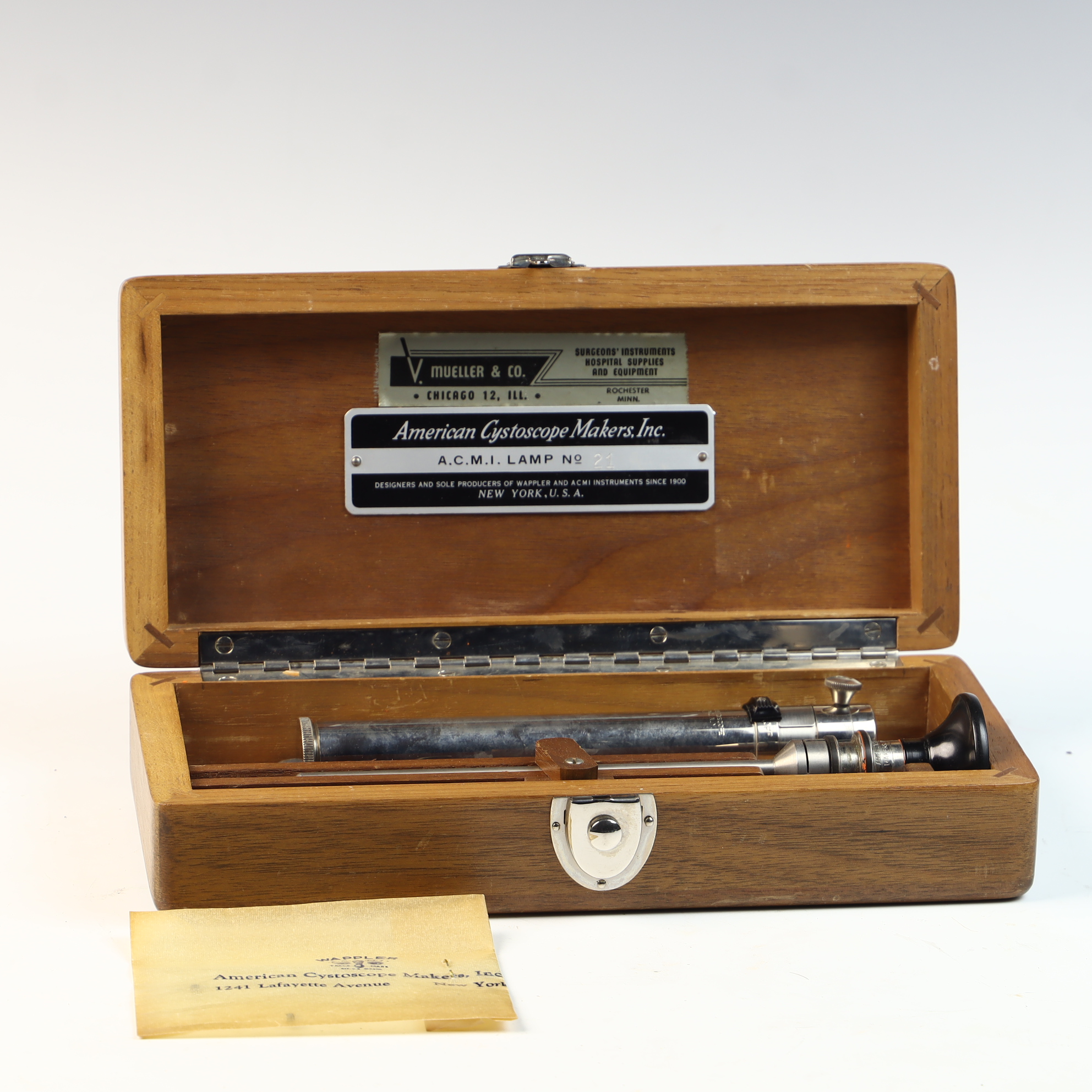 This vintage medical diagnostic set was manufactured by American Cystoscope Makers, Inc. (A.C.M.I.) of New York and distributed by V. Mueller & Co. The set is designed for cystoscopic examination and consists of a rigid telescope and a power supply handle. The telescope features a black flared eyepiece and a slender metal shaft. It is accompanied by a large cylindrical battery handle constructed of polished metal with a sliding switch marked ON and OFF. Components are made of chrome-plated or stainless steel with glass optical elements and rubber fittings.The interior of the fitted wooden storage case contains two primary identification plates. The first plate is inscribed American Cystoscope Makers, Inc. A.C.M.I. LAMP No 21 DESIGNERS AND SOLE PRODUCERS OF WAPPLER AND ACMI INSTRUMENTS SINCE 1900 NEW YORK, U.S.A. The second label reads V. MUELLER & CO. CHICAGO 12, ILL. ROCHESTER MINN. SURGEONS’ INSTRUMENTS HOSPITAL SUPPLIES AND EQUIPMENT. The eyepiece section of the instrument is engraved with WAPPLER above an eye-shaped logo and A.C.M.I. NEW YORK. An included translucent paper envelope is printed with WAPPLER, the eye logo, and American Cystoscope Makers, Inc. 1241 Lafayette Avenue New York. The case is constructed of hardwood with a metal piano hinge and a silver-tone front latch.