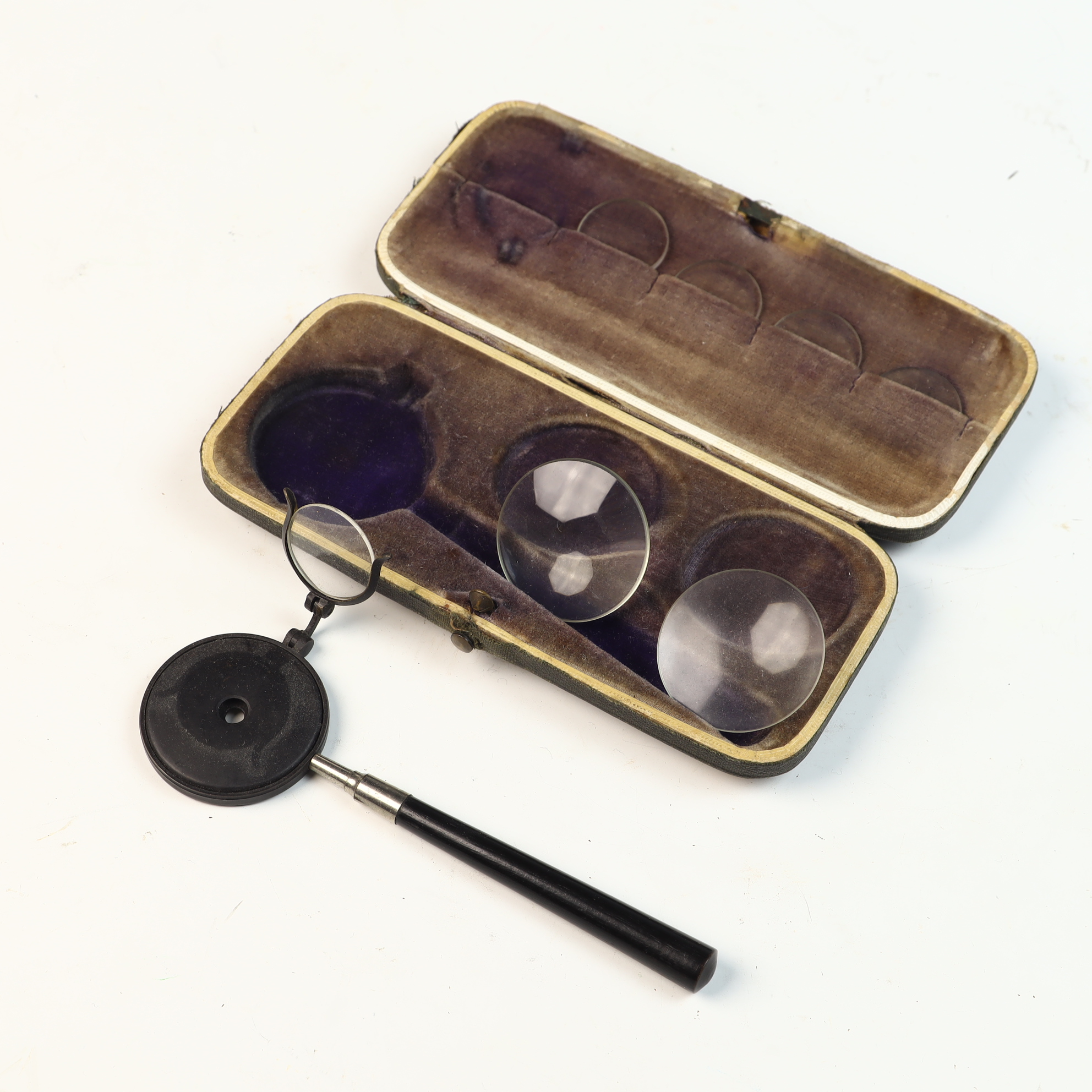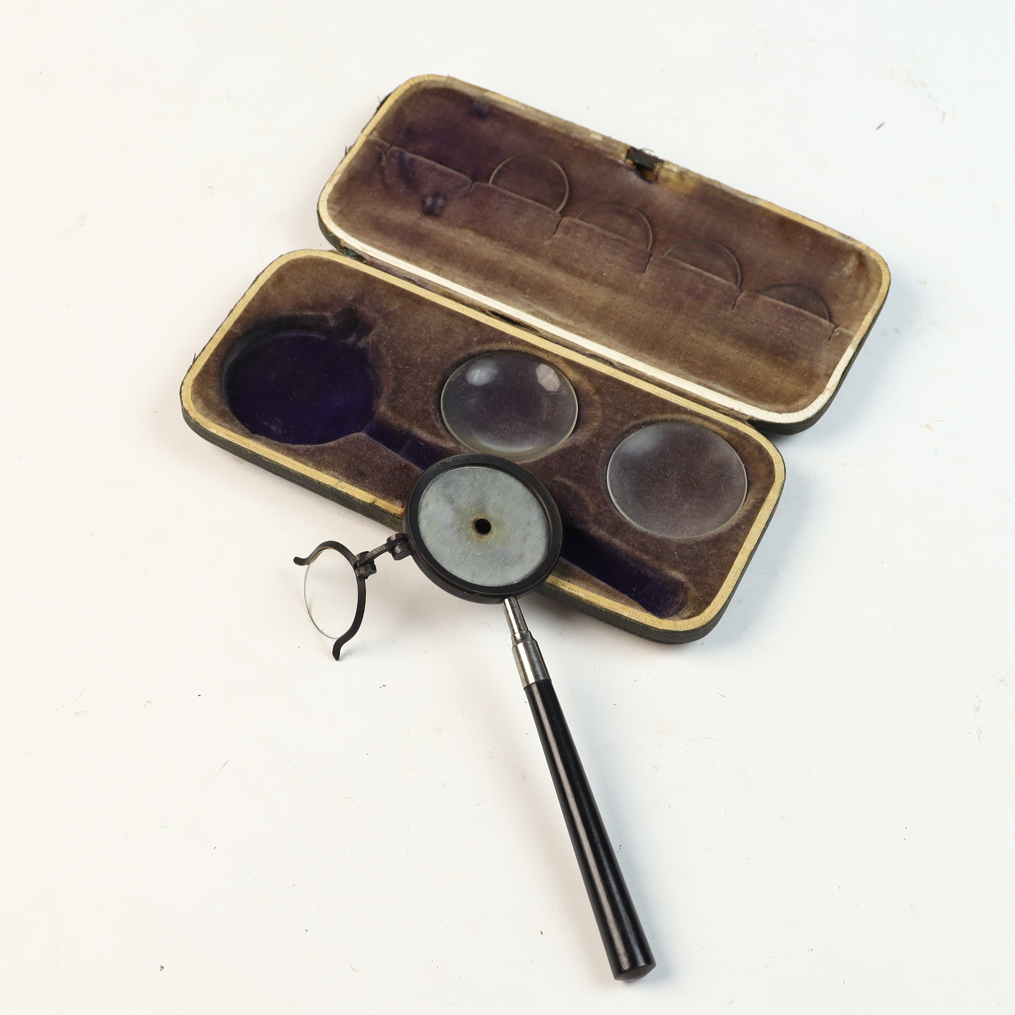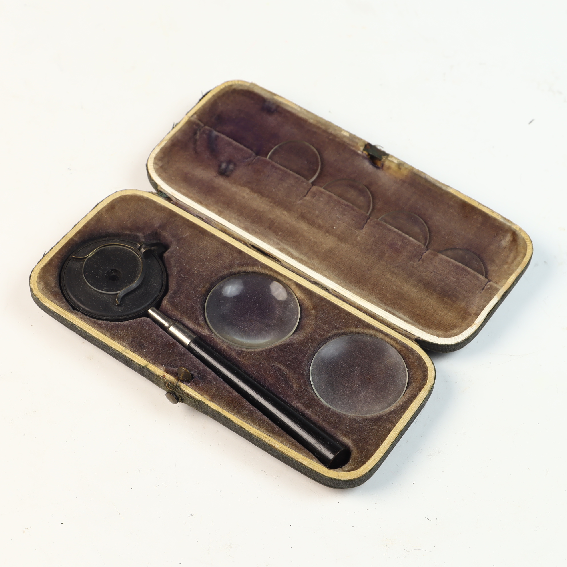 The set is in fair to good antique condition. Metal components show tarnish and patina consistent with age. The glass lenses appear clear with minor surface dust and light scratches. The presentation case exhibits noticeable external wear, including scuffing, edge wear, and surface loss to the leatherette. The interior velvet lining is faded and shows wear in the recessed areas. The mechanical hinge on the auxiliary lens remains functional.
