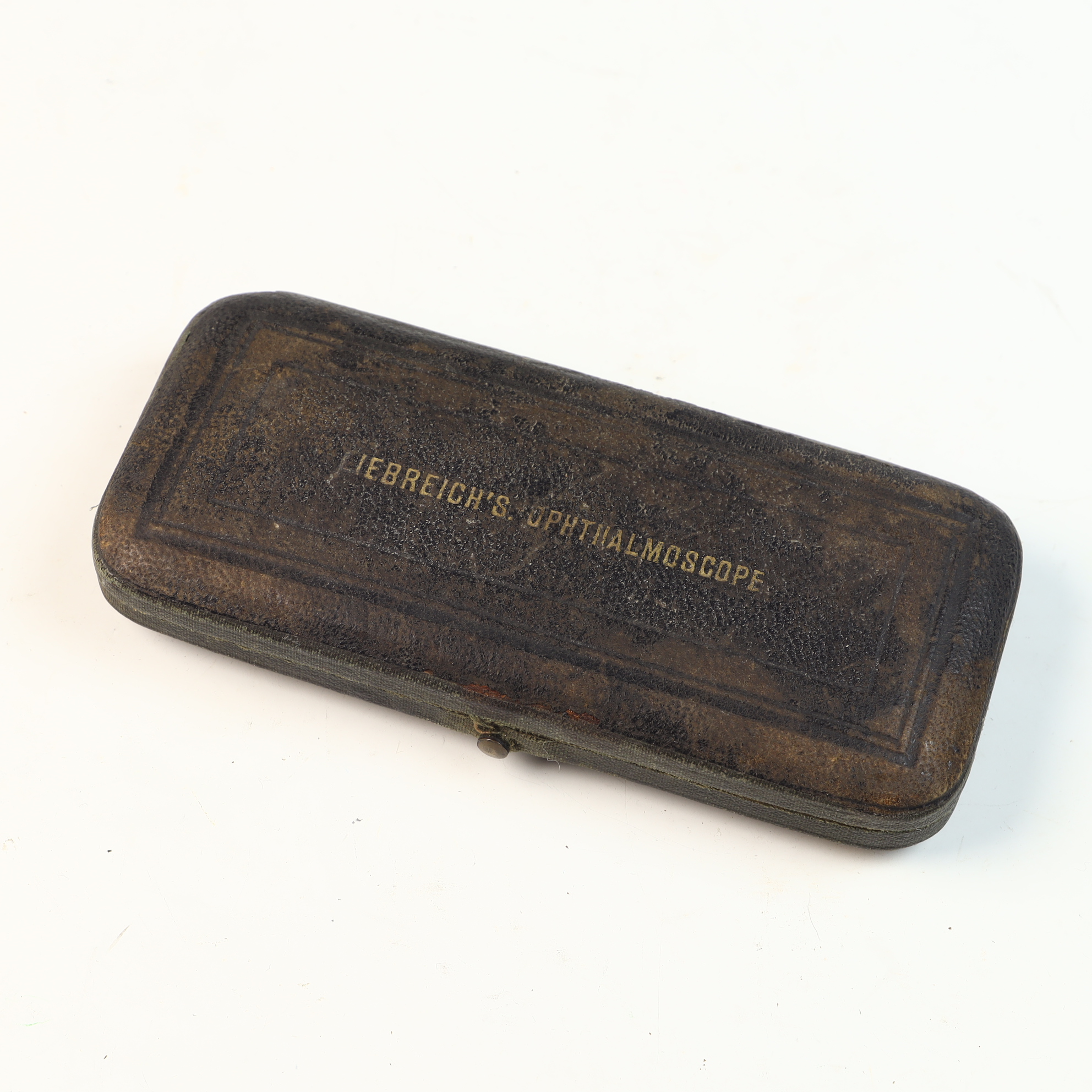 This set is a Liebreich’s Ophthalmoscope, an ophthalmic diagnostic tool designed by ophthalmologist Richard Liebreich. The instrument features a circular mirror with a central aperture, equipped with a small hinged magnifying lens for focus adjustment. This assembly is mounted onto a detachable handle crafted from a dark, polished material, such as ebonized wood or vulcanite, with silver-toned metal connectors. Included in the set are two large biconvex glass condensing lenses and four additional small lenses housed in specialized compartments within the lid of the case. The rectangular presentation case is covered in a dark, textured leather or leatherette and features the gold-stamped inscription LIEBREICH’S. OPHTHALMOSCOPE on the lid. The interior is lined with a padded purple velvet and contains custom-fitted recesses for the handle and lenses.