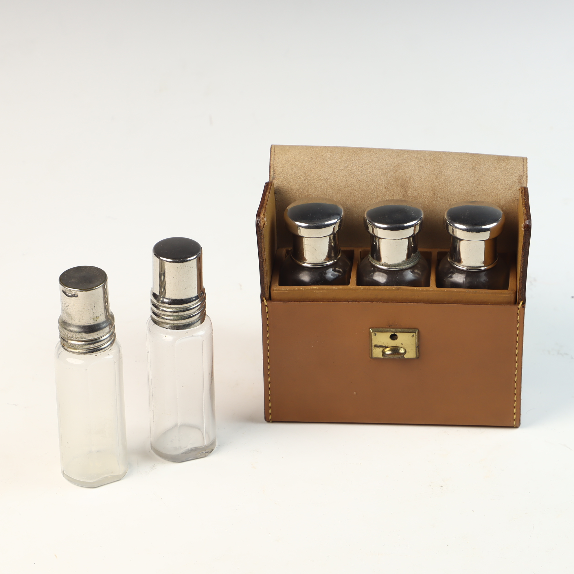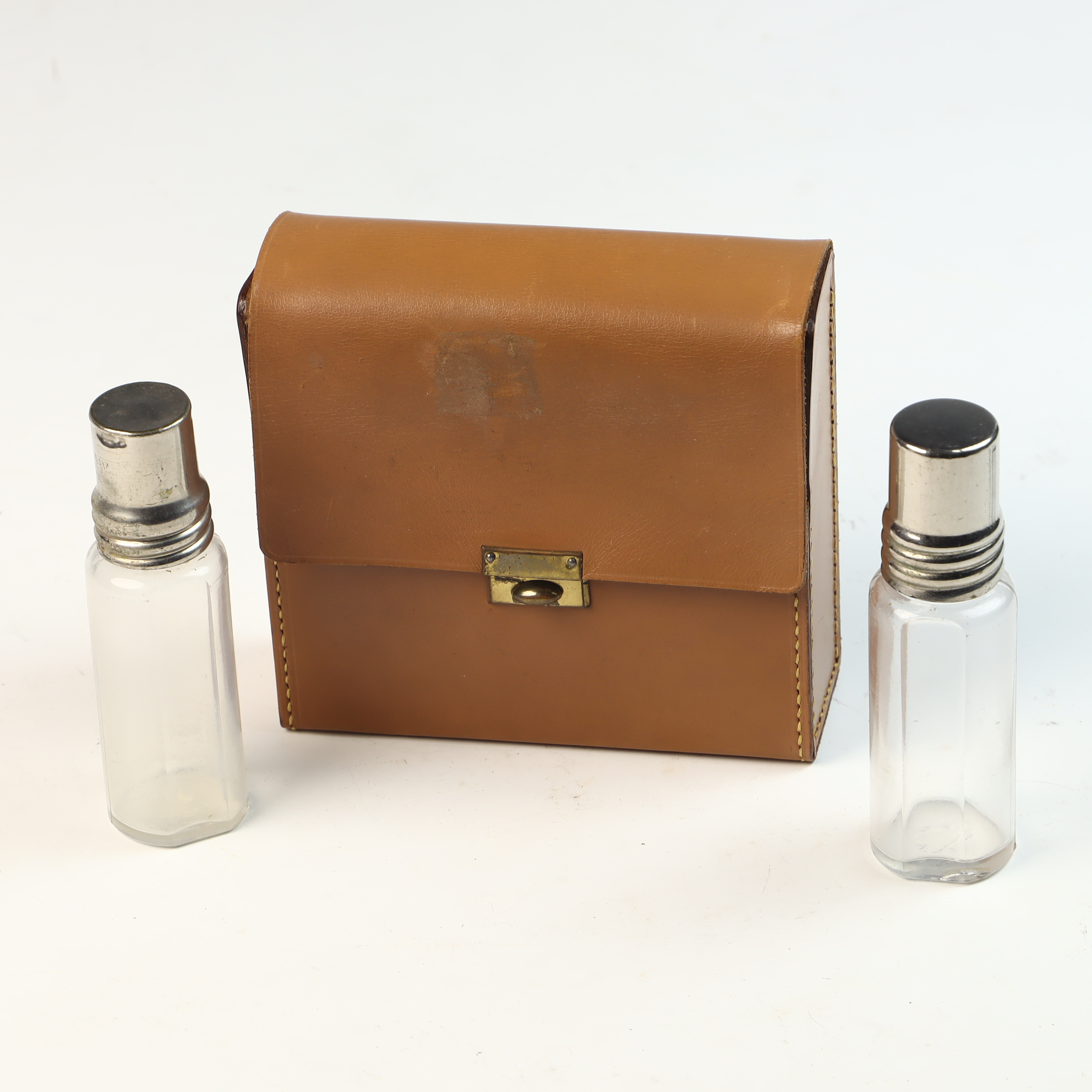 The leather case exhibits surface wear, scuffing, and minor staining consistent with age and use. The glass bottles appear in good condition with no apparent chips or cracks. The metal caps show light surface scratches and minor oxidation. The brass-toned latch is functional.