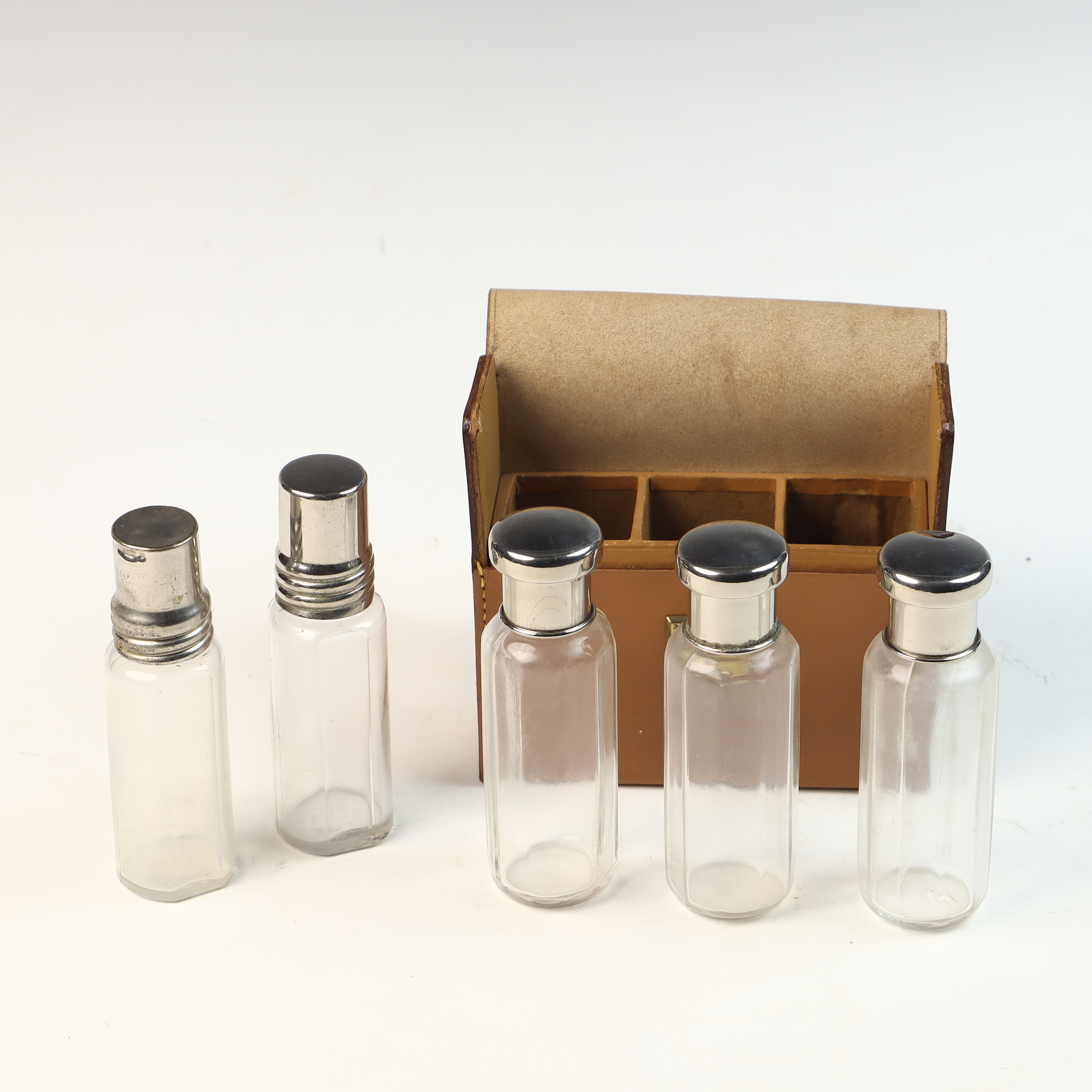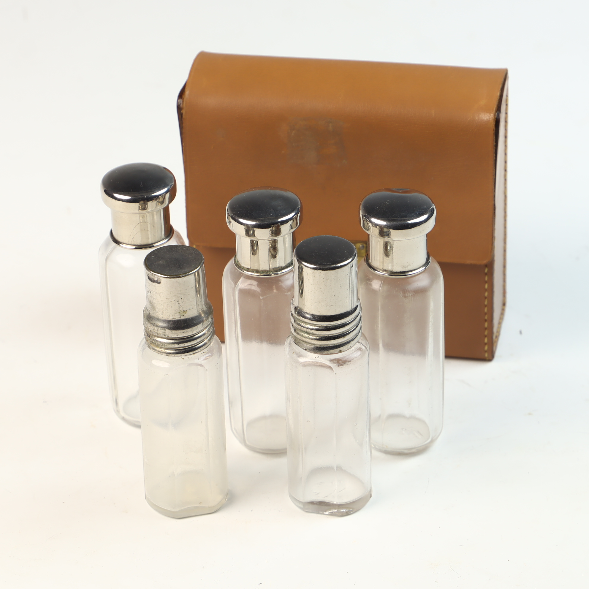 This set consists of clear glass bottles with silver-toned metal caps, presented in a fitted tan leather-bound travel case. Each bottle is designed with an octagonal faceted body. The collection includes two styles of caps: several bottles feature domed caps while others feature flatter, stepped caps. The leather case is rectangular with a front-opening flap and is secured by a brass-toned metal latch. The interior is divided into separate compartments to hold each bottle securely. No maker’s marks or silver hallmarks are present on the metal, glass, or leather components, indicating the caps are silver-plated or chrome.