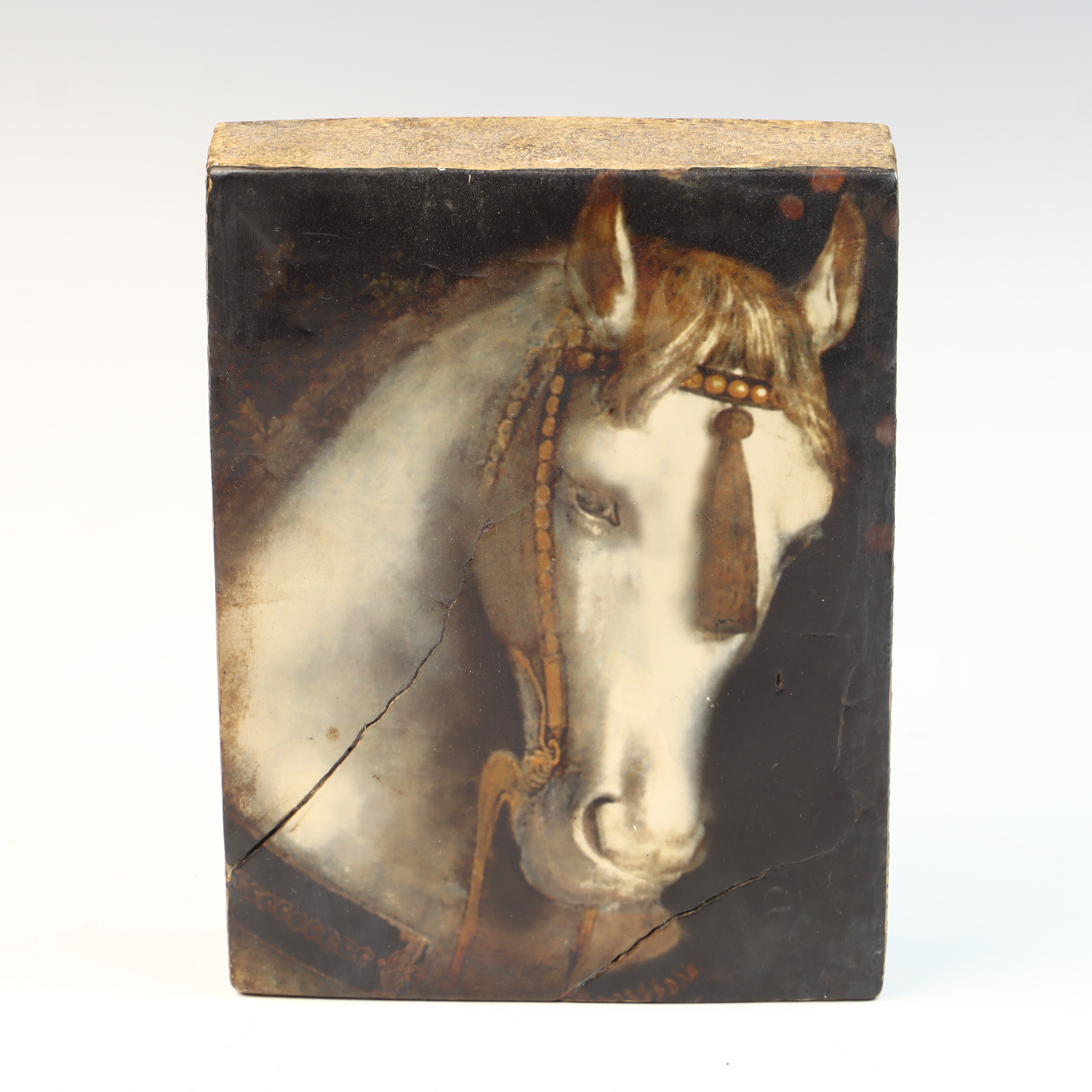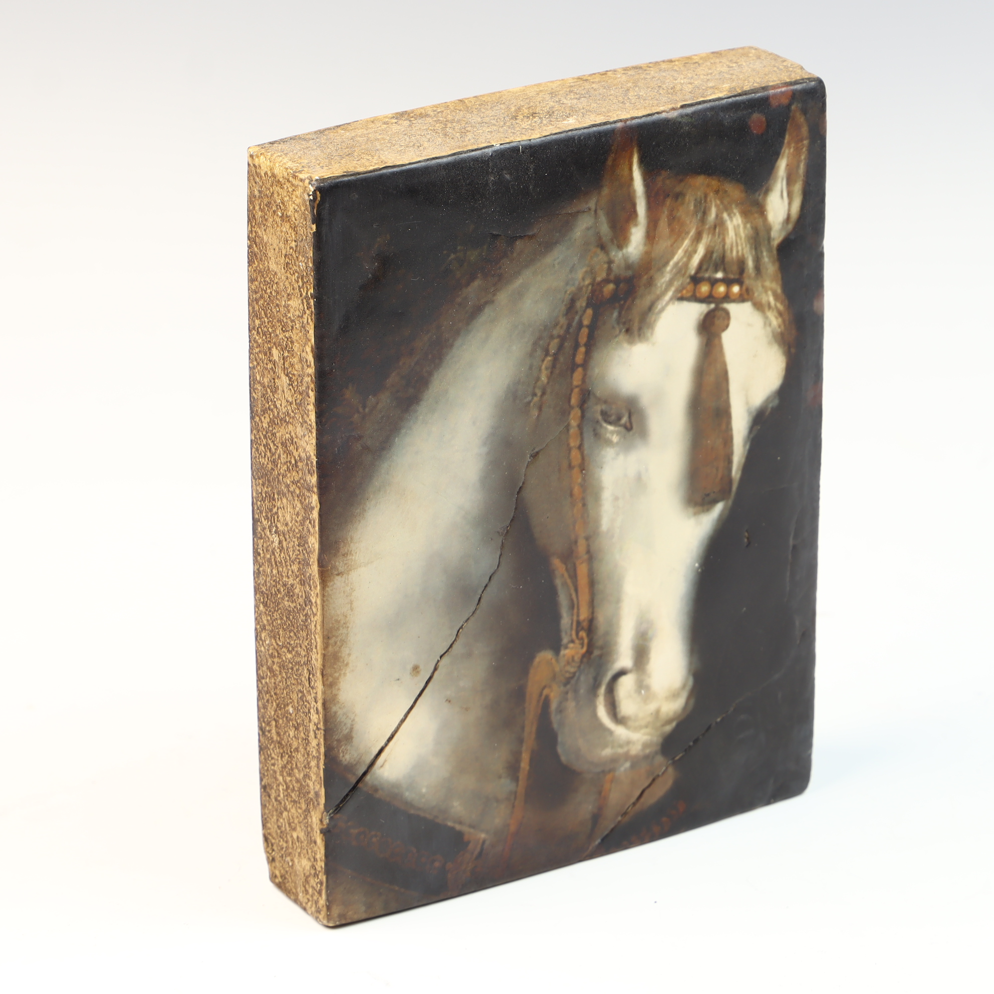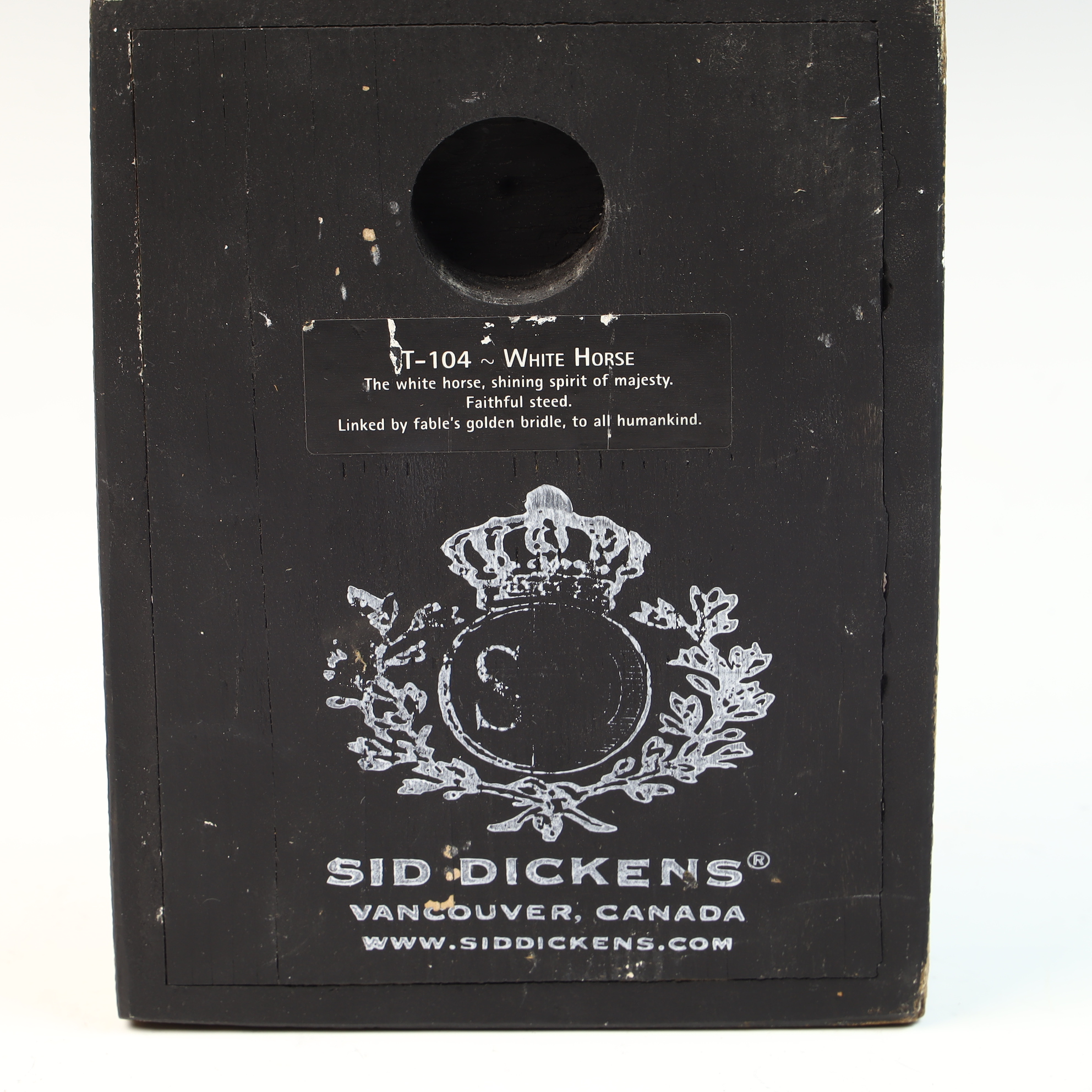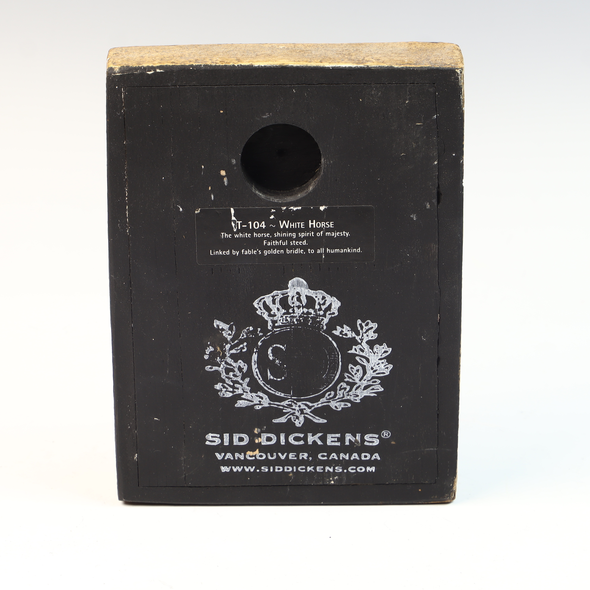 This Sid Dickens Memory Block, titled White Horse and designated as T-104, is a decorative wall tile manufactured in Vancouver, Canada. The piece features a hand-poured plaster or composite front surface on a rectangular base. The imagery depicts a white horse head in profile wearing a decorative bridle with a prominent hanging tassel, set against a dark background. The work utilizes a muted color palette and soft blending typical of the artist’s style. The reverse of the block is finished in black paint with a circular recessed mounting hole. It bears a black adhesive label with white text that reads T-104 White Horse, The white horse, shining spirit of majesty, Faithful steed, Linked by fable’s golden bridle, to all humankind. Below the label is a printed graphic featuring a crown and wreath-enclosed letter S, with the text SID DICKENS, VANCOUVER, CANADA, and the artist’s website address.8 x 6 x 1.25 inches.