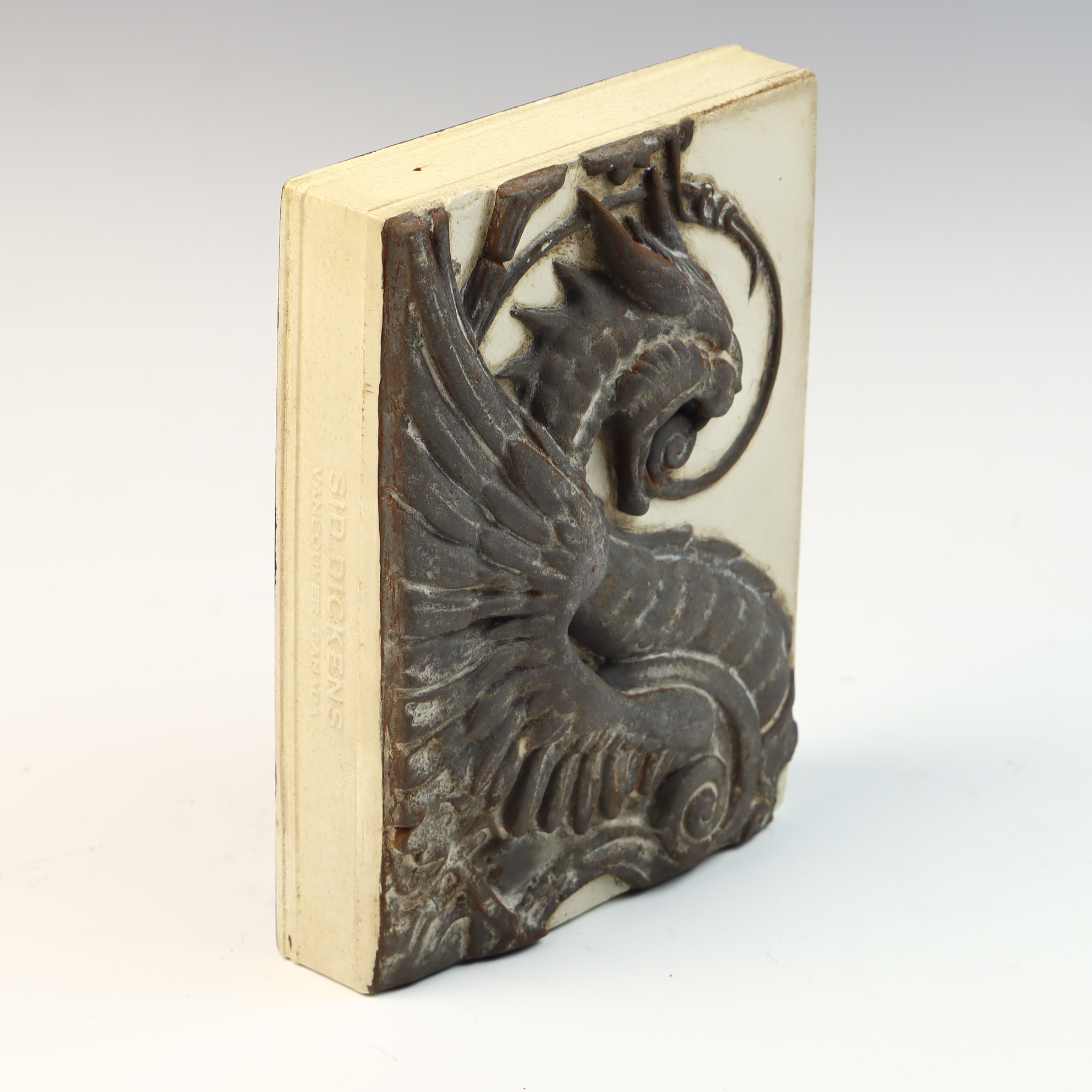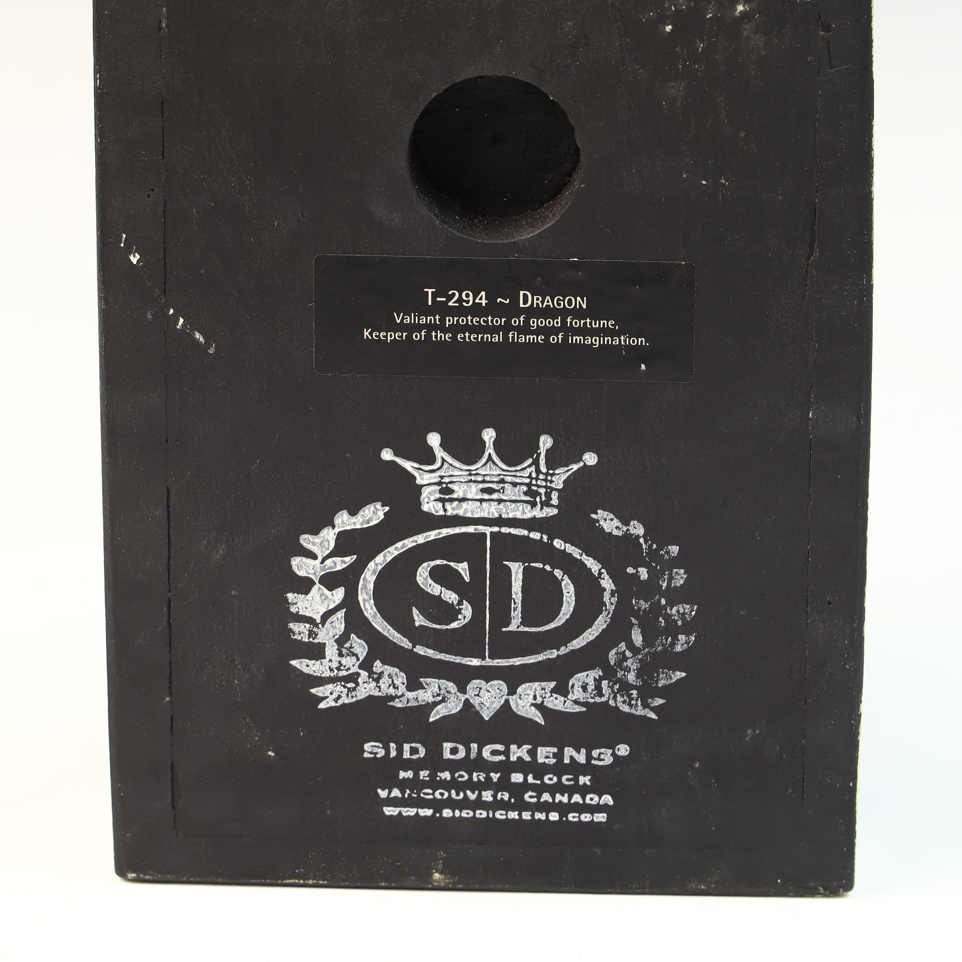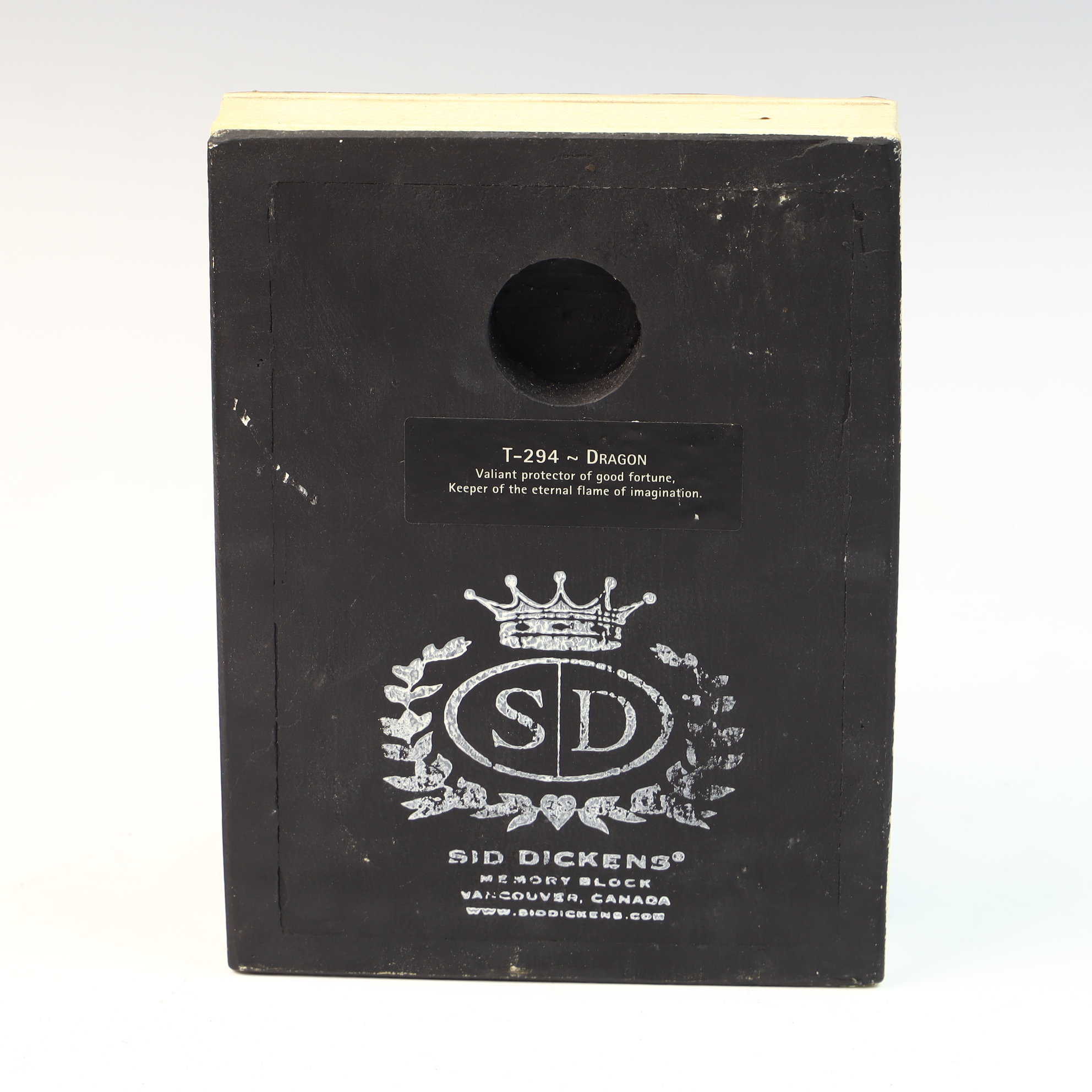 A Sid Dickens Memory Block, model T-294, titled Dragon from the Orient Express Collection. This decorative wall plaque is constructed of cast plaster with a high-relief stylized dragon motif. The dragon is depicted in a dynamic pose with outstretched wings and a coiled tail. The surface features a multi-layered, distressed finish in shades of dark brown and charcoal grey over a light cream base, creating an aged or metallic appearance. The sides of the block are finished in a neutral cream color, and the reverse is painted black with a circular indentation for mounting. One side of the block is impressed with the text SID DICKENS and VANCOUVER, CANADA. The reverse side features a silver-toned printed hallmark consisting of a crown above an oval containing the initials SD, surrounded by a laurel wreath. Below this mark is the text SID DICKENS MEMORY BLOCK VANCOUVER, CANADA WWW.SIDDICKENS.COM. A black adhesive label on the back reads T-294 ~ DRAGON Valiant protector of good fortune, Keeper of the eternal flame of imagination.6 inches x 8 inches x 1.25 inches.