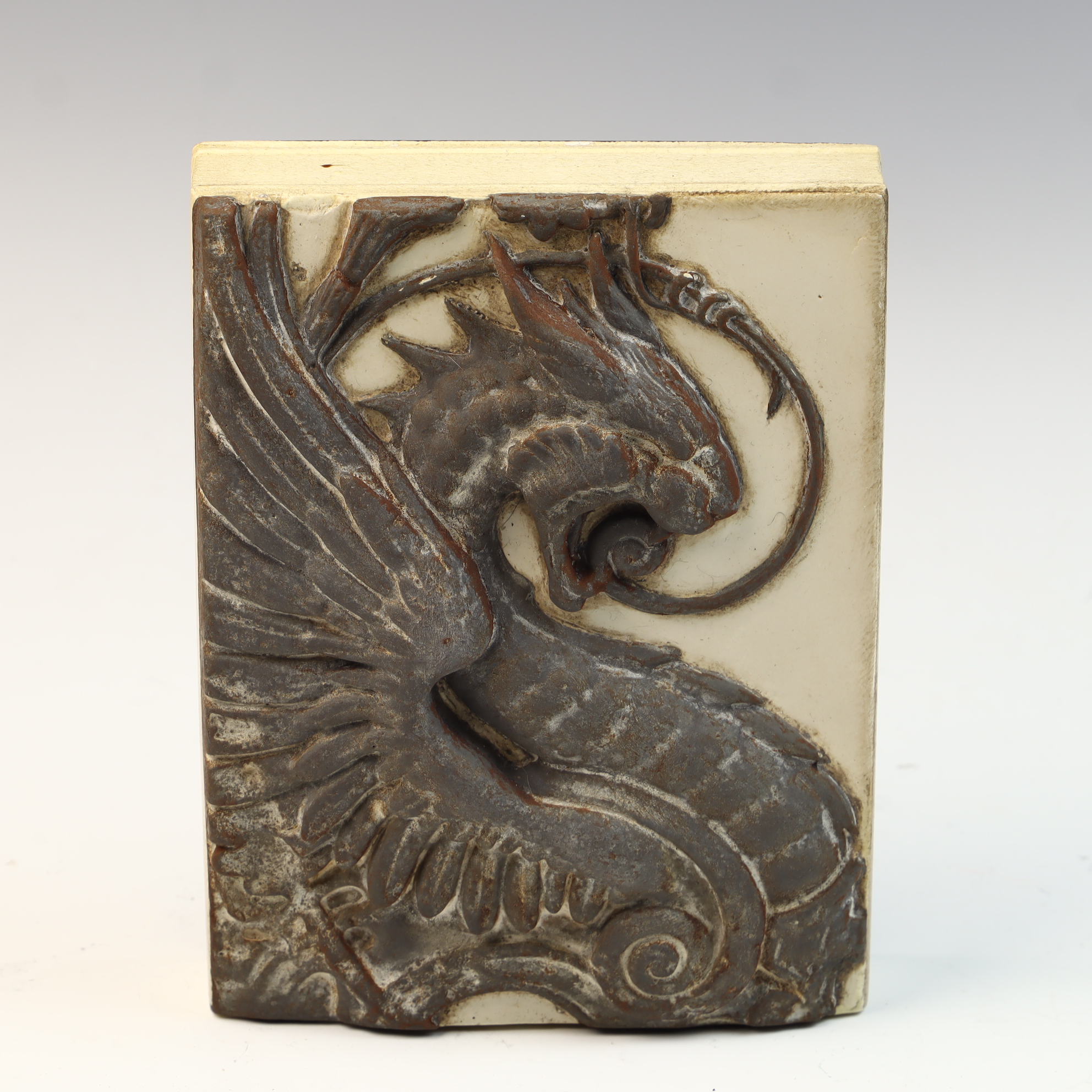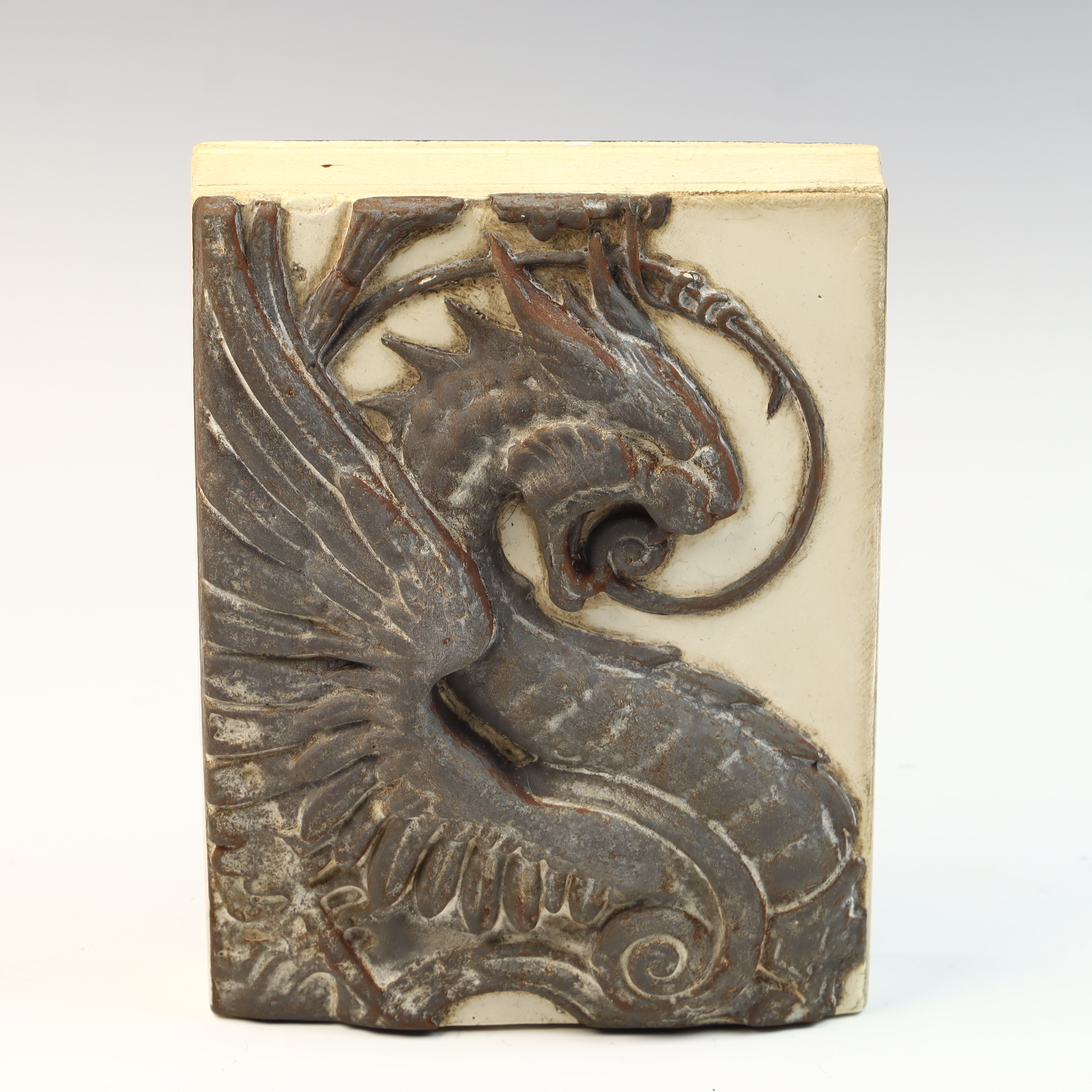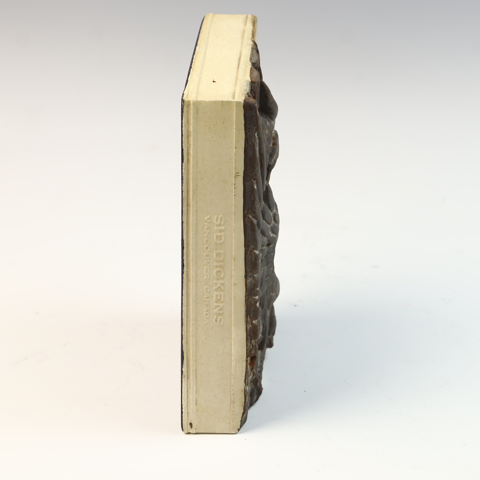 A Sid Dickens Memory Block, model T-294, titled Dragon from the Orient Express Collection. This decorative wall plaque is constructed of cast plaster with a high-relief stylized dragon motif. The dragon is depicted in a dynamic pose with outstretched wings and a coiled tail. The surface features a multi-layered, distressed finish in shades of dark brown and charcoal grey over a light cream base, creating an aged or metallic appearance. The sides of the block are finished in a neutral cream color, and the reverse is painted black with a circular indentation for mounting. One side of the block is impressed with the text SID DICKENS and VANCOUVER, CANADA. The reverse side features a silver-toned printed hallmark consisting of a crown above an oval containing the initials SD, surrounded by a laurel wreath. Below this mark is the text SID DICKENS MEMORY BLOCK VANCOUVER, CANADA WWW.SIDDICKENS.COM. A black adhesive label on the back reads T-294 ~ DRAGON Valiant protector of good fortune, Keeper of the eternal flame of imagination.6 inches x 8 inches x 1.25 inches.