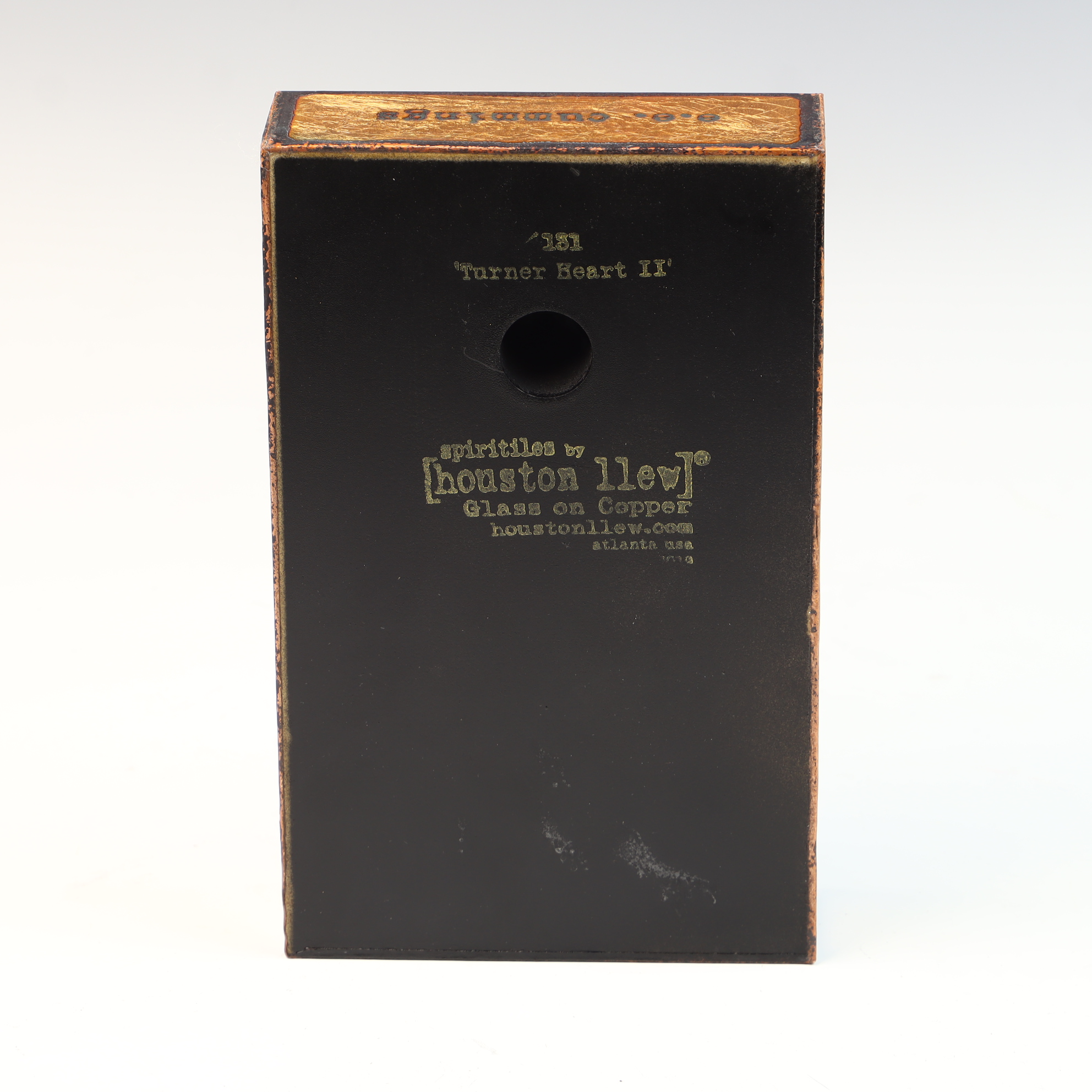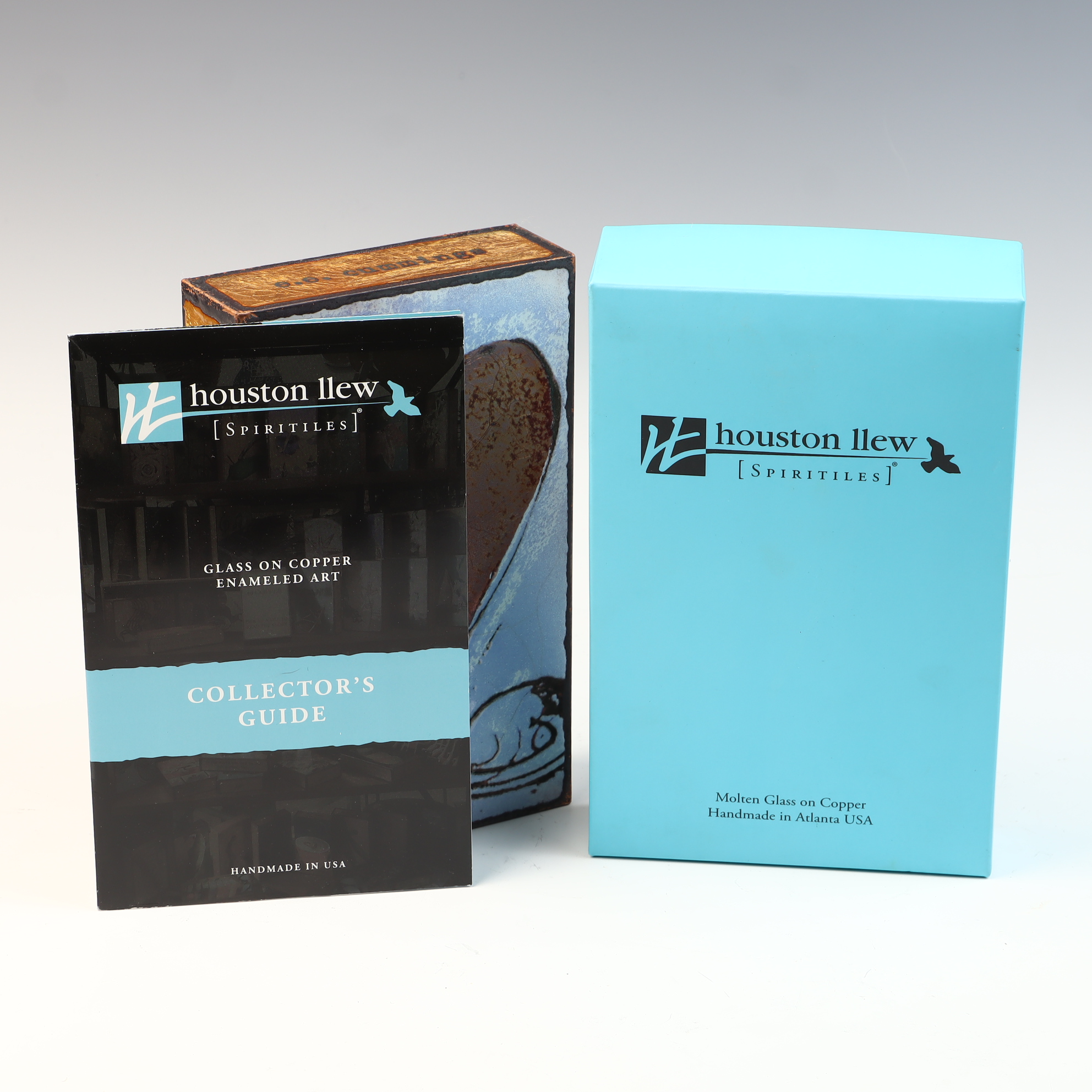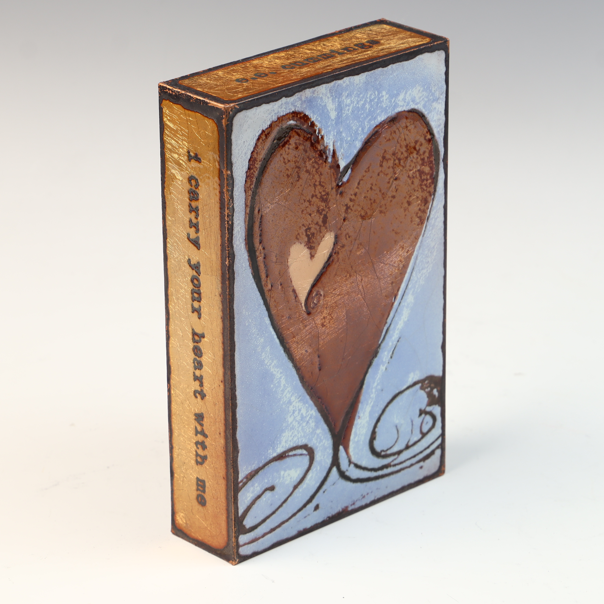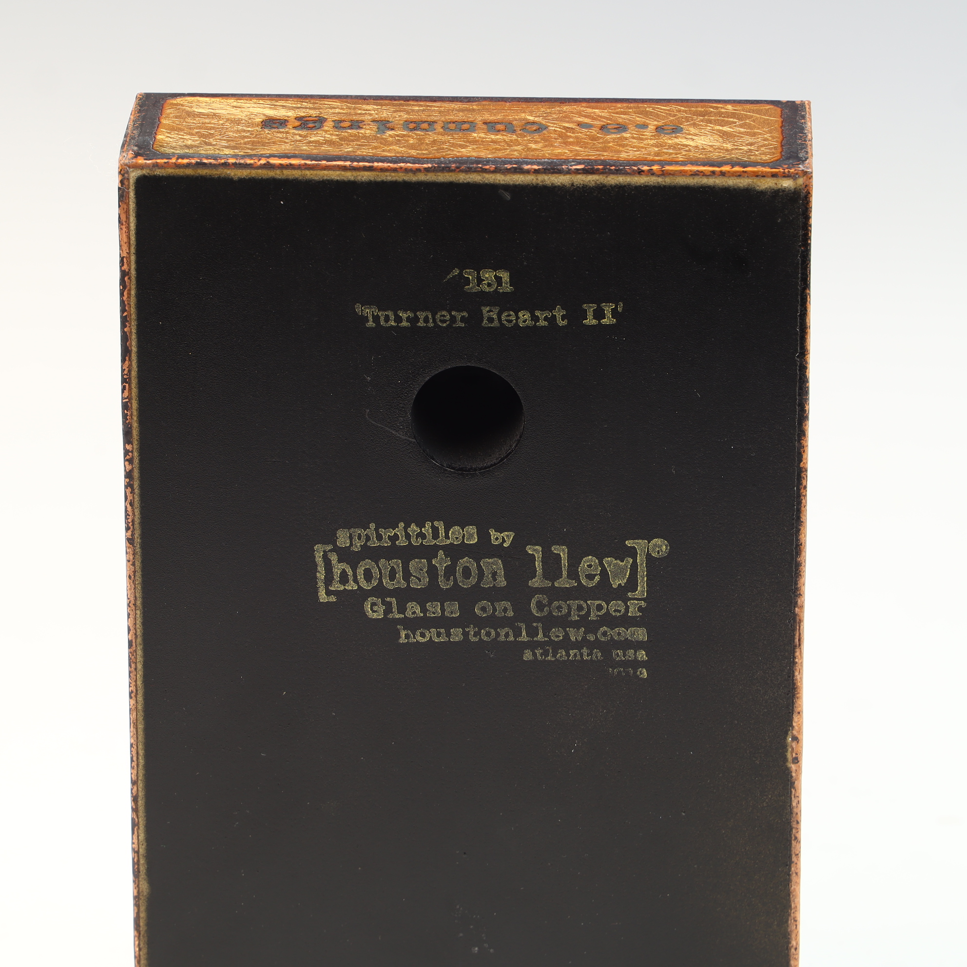 This is a Houston Llew Spiritile, titled Turner Heart II, number 131 in the artist’s collection. The piece is constructed of vitreous enamel (molten glass) fired onto a copper plate that is wrapped around a solid base. The front decorative panel features a large, textured reddish-brown heart containing a smaller, pale-colored heart at its center. This imagery is set against a mottled light blue background with dark scrollwork at the bottom. The sides of the block are finished in a crackled gold-tone enamel. The top edge is inscribed with the name e.e. cummings. The left side edge is inscribed with the text i carry your heart with me, while the right side edge is inscribed (i carry it in my heart). The bottom edge features a stylized black script signature for Houston Llew. The back of the art block is finished in smooth black with a circular hanging point and bears several printed marks: 131, Turner Heart II, spiritiles by [houston llew], Glass on Copper, houstonllew.com, and atlanta usa. The item is accompanied by its original turquoise blue presentation box and a printed Collector’s Guide brochure.