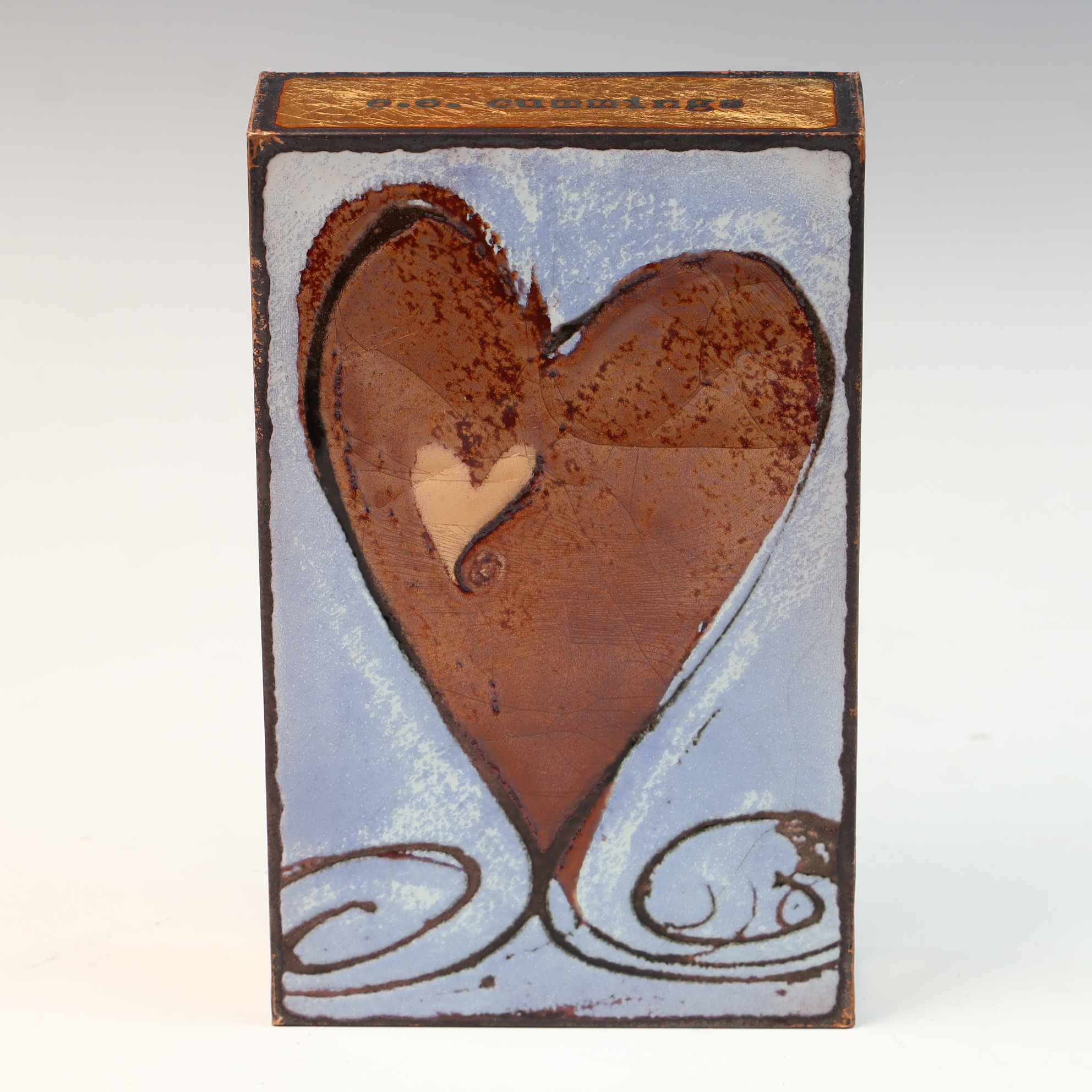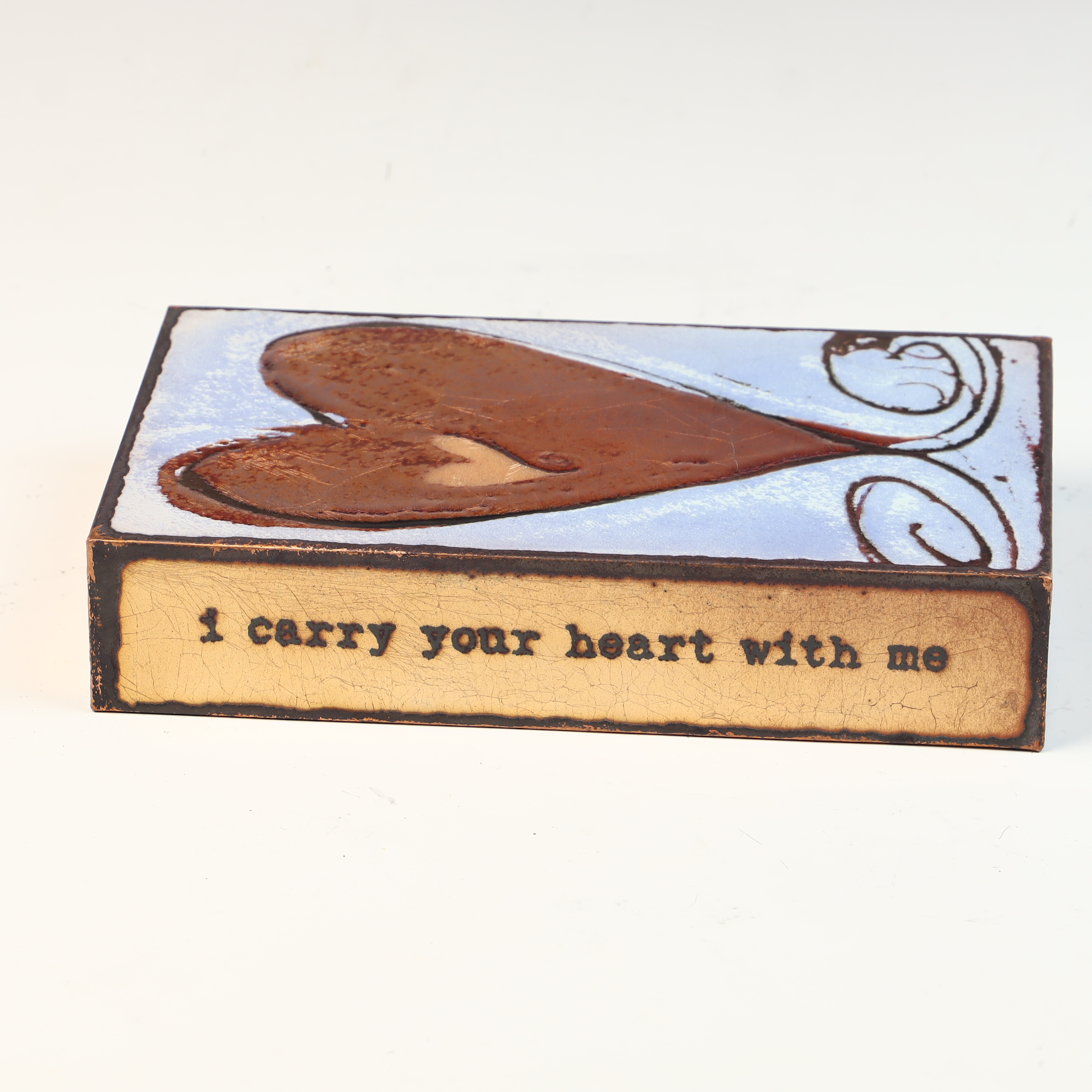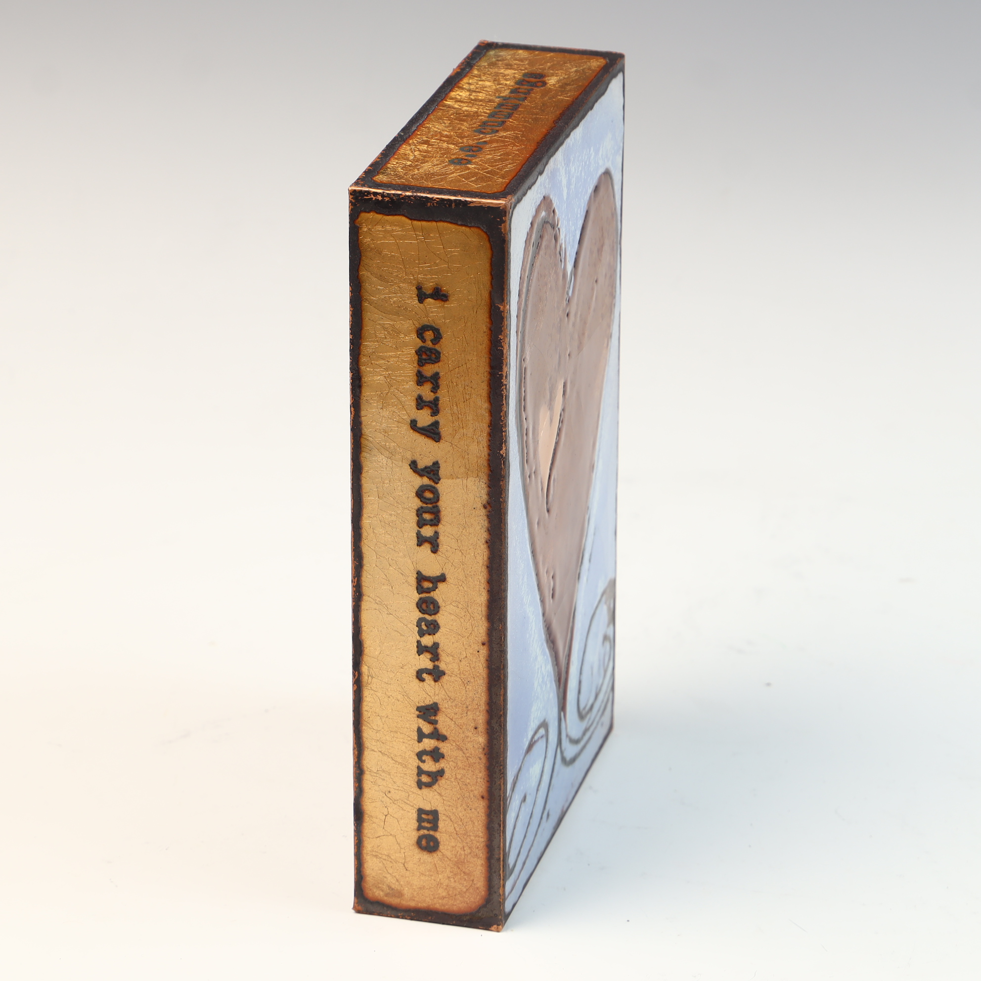 This is a Houston Llew Spiritile, titled Turner Heart II, number 131 in the artist’s collection. The piece is constructed of vitreous enamel (molten glass) fired onto a copper plate that is wrapped around a solid base. The front decorative panel features a large, textured reddish-brown heart containing a smaller, pale-colored heart at its center. This imagery is set against a mottled light blue background with dark scrollwork at the bottom. The sides of the block are finished in a crackled gold-tone enamel. The top edge is inscribed with the name e.e. cummings. The left side edge is inscribed with the text i carry your heart with me, while the right side edge is inscribed (i carry it in my heart). The bottom edge features a stylized black script signature for Houston Llew. The back of the art block is finished in smooth black with a circular hanging point and bears several printed marks: 131, Turner Heart II, spiritiles by [houston llew], Glass on Copper, houstonllew.com, and atlanta usa. The item is accompanied by its original turquoise blue presentation box and a printed Collector’s Guide brochure.