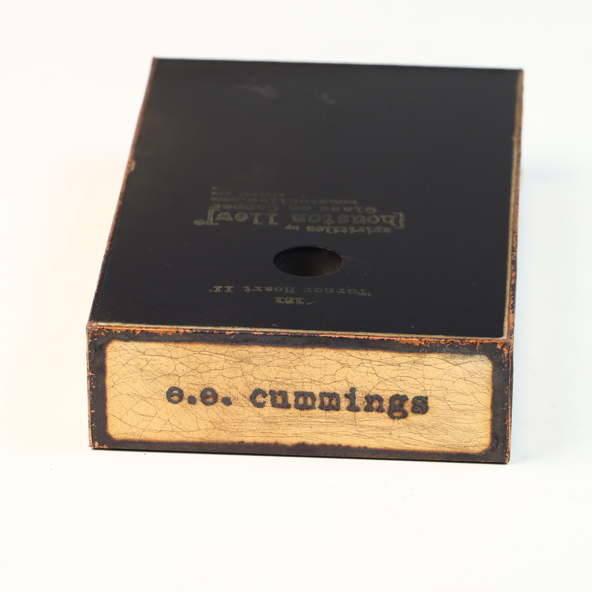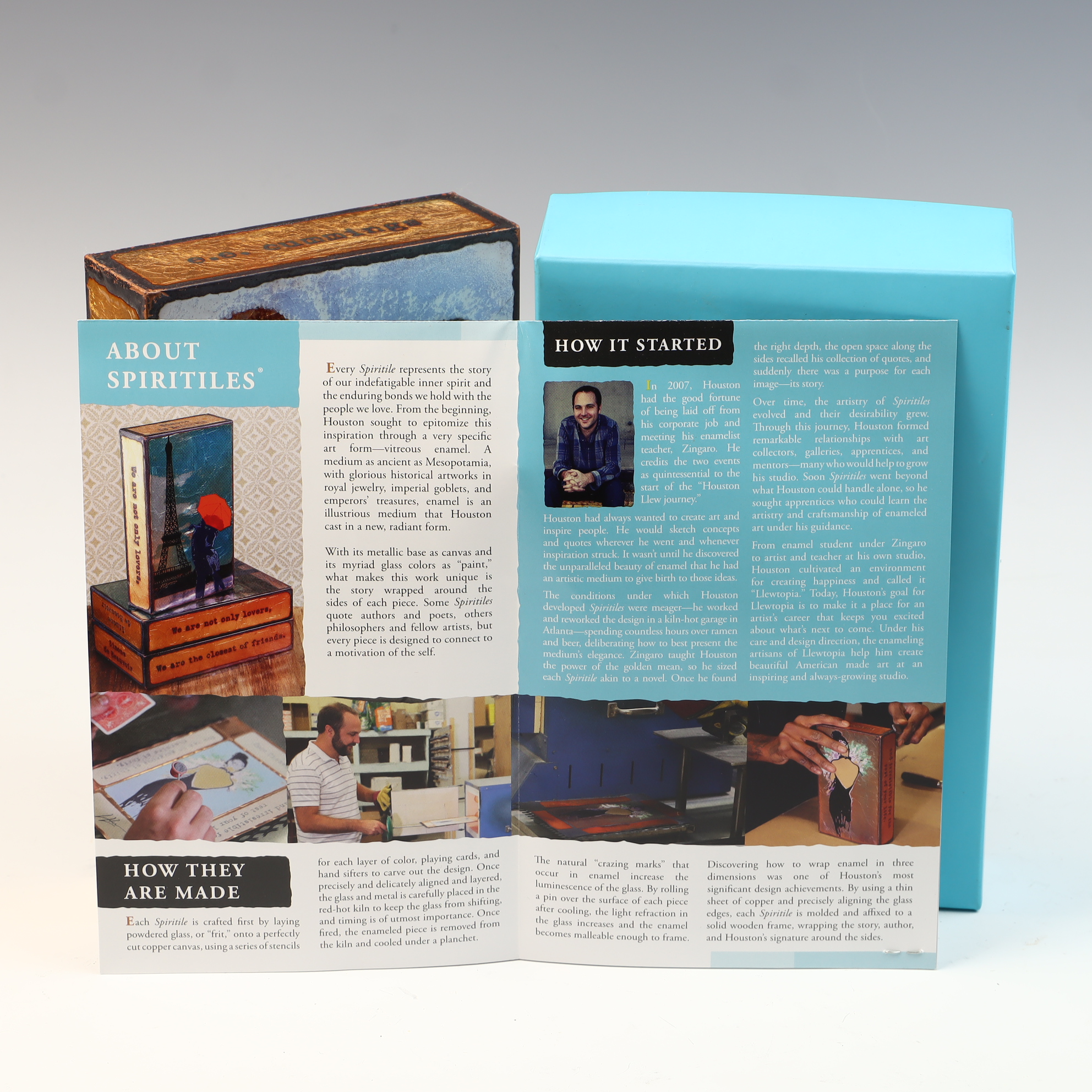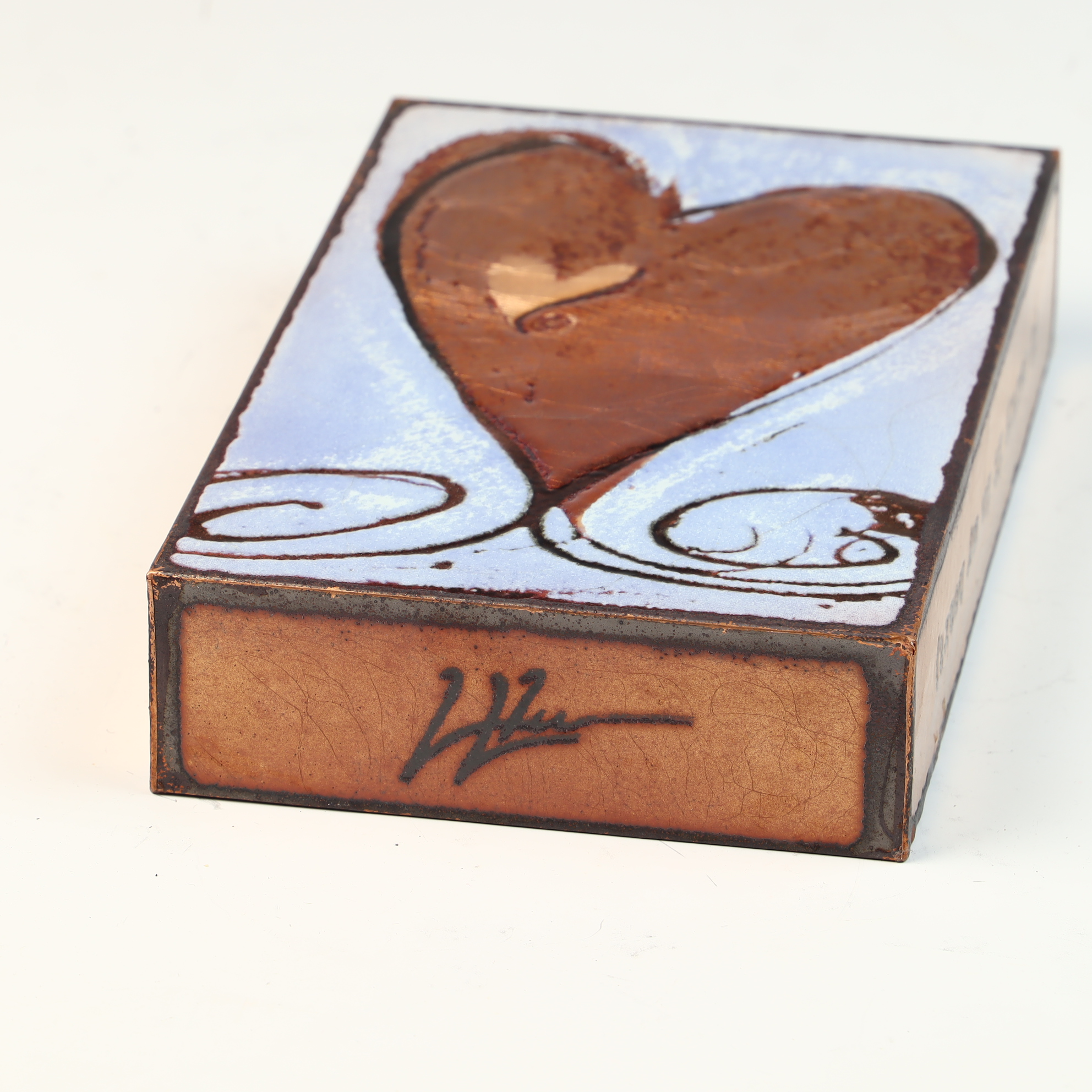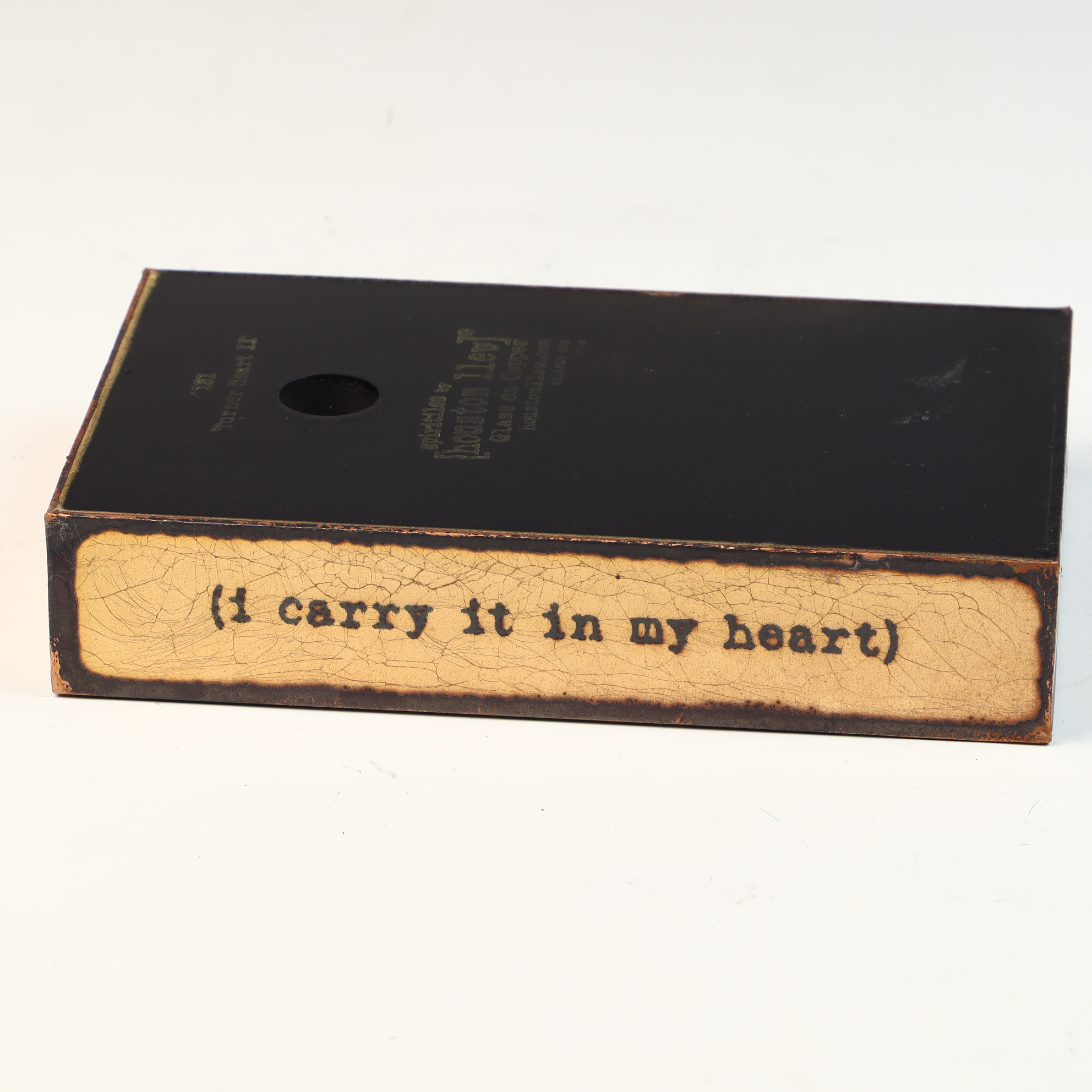 This is a Houston Llew Spiritile, titled Turner Heart II, number 131 in the artist’s collection. The piece is constructed of vitreous enamel (molten glass) fired onto a copper plate that is wrapped around a solid base. The front decorative panel features a large, textured reddish-brown heart containing a smaller, pale-colored heart at its center. This imagery is set against a mottled light blue background with dark scrollwork at the bottom. The sides of the block are finished in a crackled gold-tone enamel. The top edge is inscribed with the name e.e. cummings. The left side edge is inscribed with the text i carry your heart with me, while the right side edge is inscribed (i carry it in my heart). The bottom edge features a stylized black script signature for Houston Llew. The back of the art block is finished in smooth black with a circular hanging point and bears several printed marks: 131, Turner Heart II, spiritiles by [houston llew], Glass on Copper, houstonllew.com, and atlanta usa. The item is accompanied by its original turquoise blue presentation box and a printed Collector’s Guide brochure.