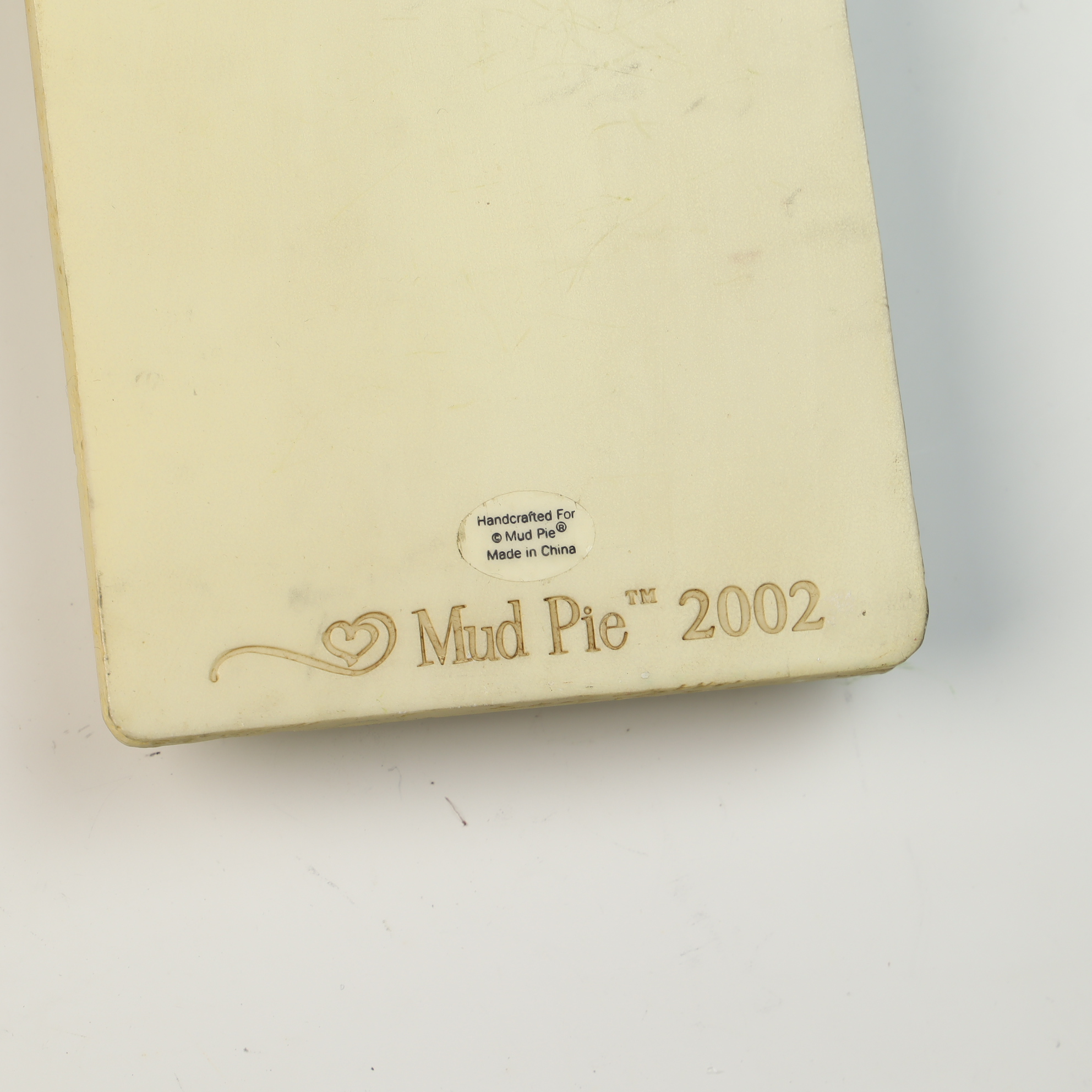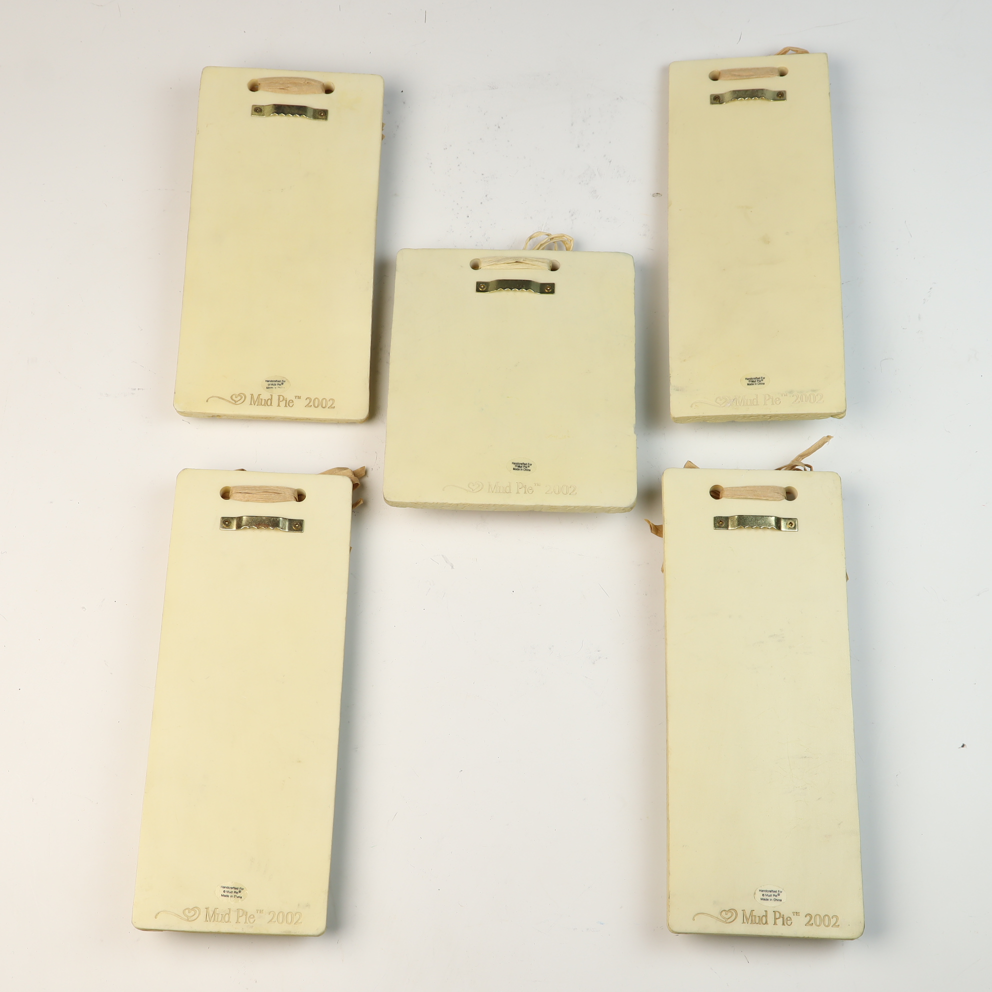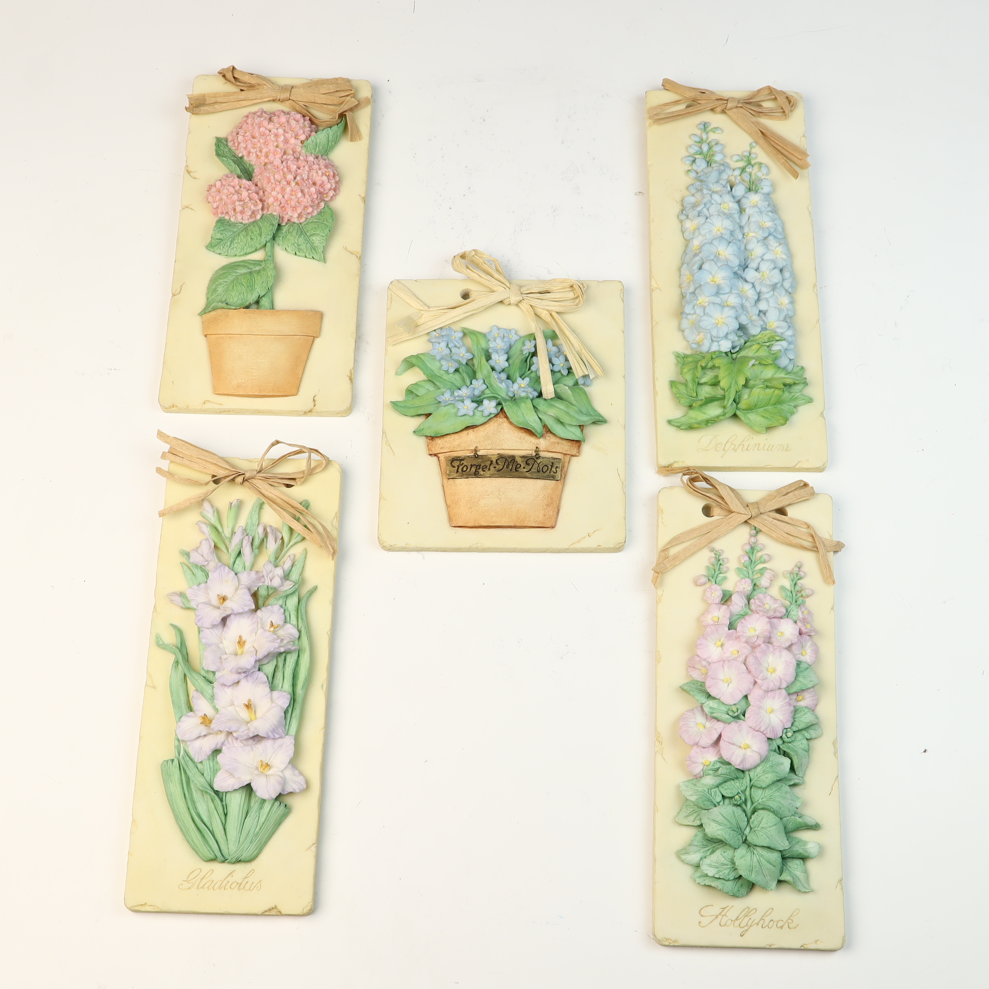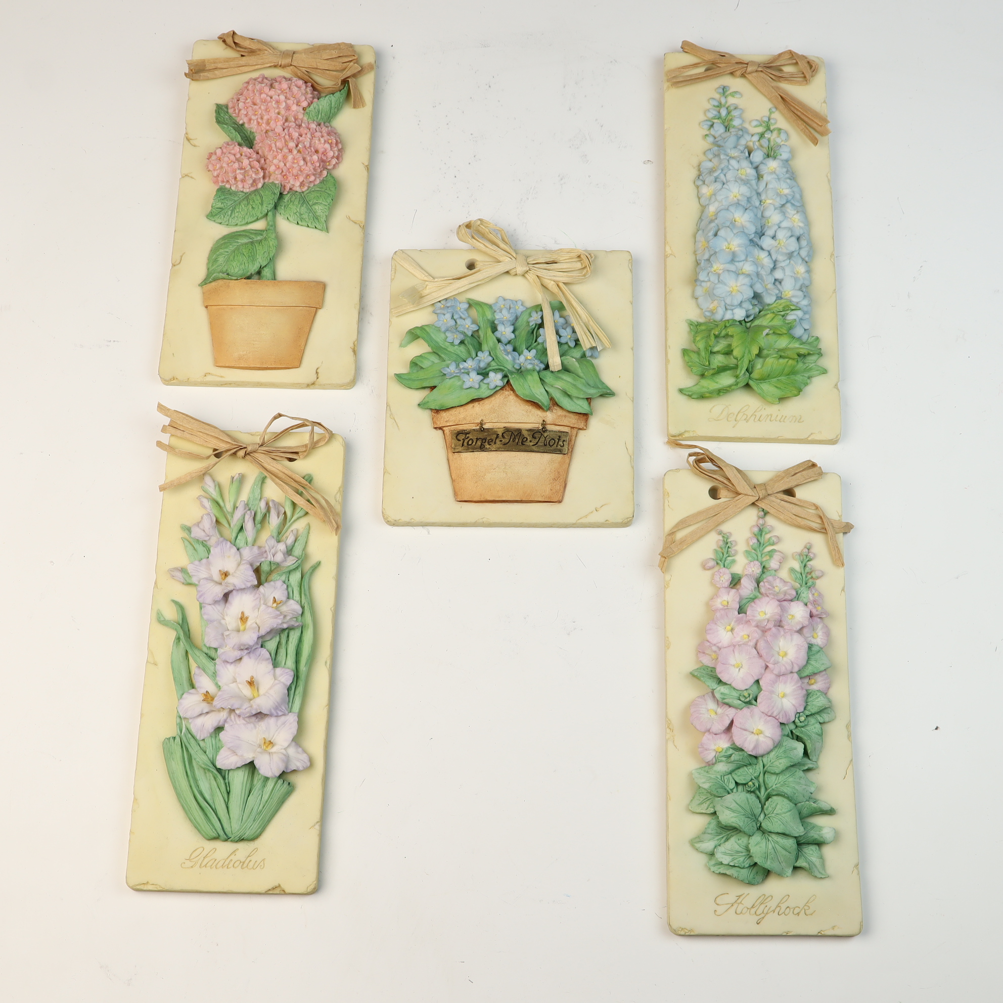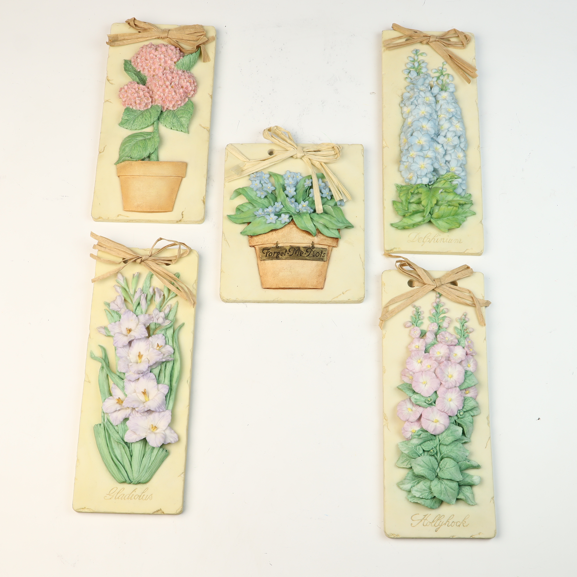 A collection of molded resin-based wall plaques produced by Mud Pie and dated 2002. The assembly features various botanical subjects rendered in high relief, including hydrangeas, forget-me-nots, delphiniums, gladiolus, and hollyhocks. Each piece is finished in soft pastel colors with hand-painted details. Several vertical plaques feature flower names in cursive script at the base, and one plaque features a decorative Forget-Me-Nots tag on the flower pot. Each item is adorned with a raffia ribbon bow at the top and includes a metal sawtooth hanger on the reverse. The reverse of each plaque is marked with an incised heart symbol and Mud Pie 2002, alongside an oval sticker reading Handcrafted For Mud Pie Made in China.