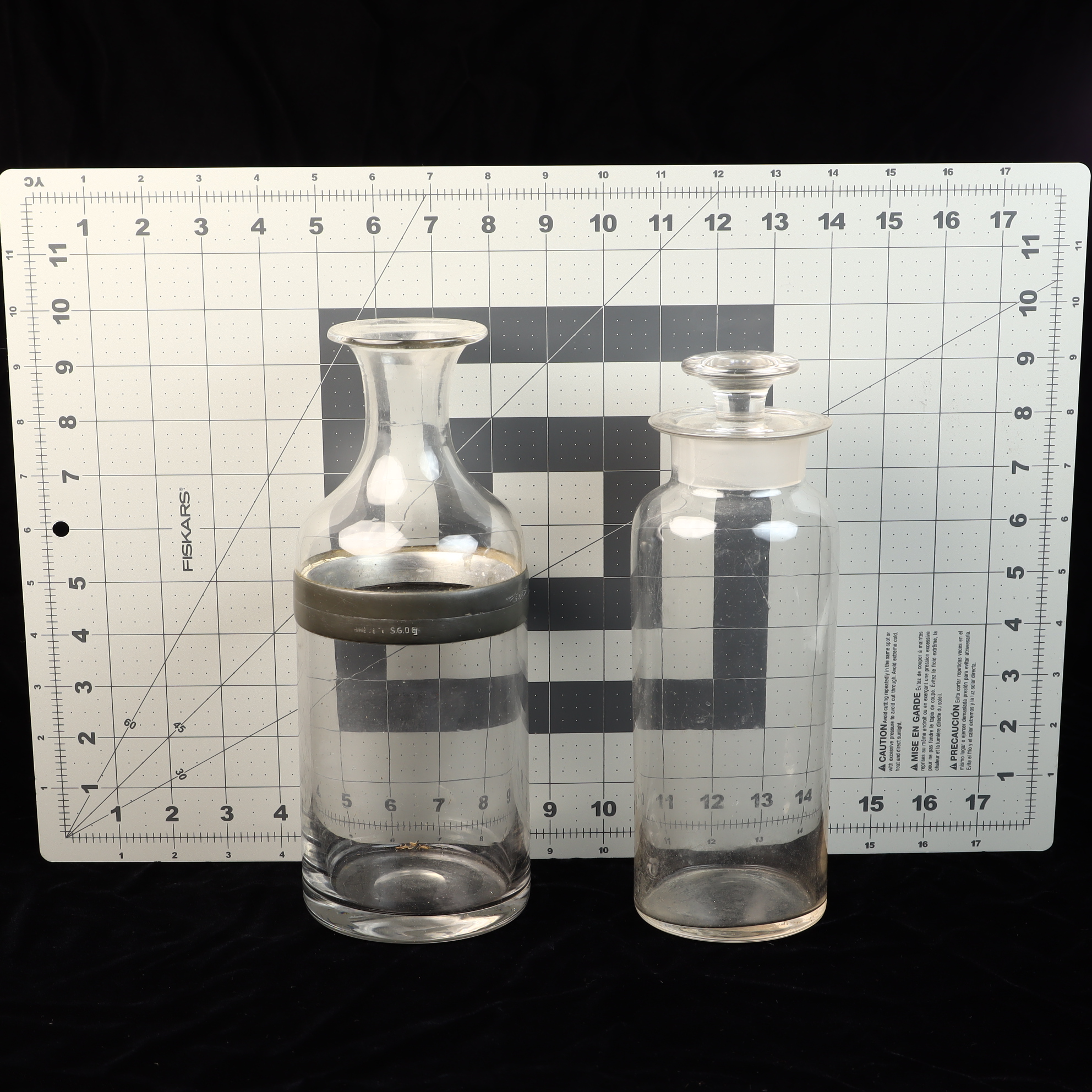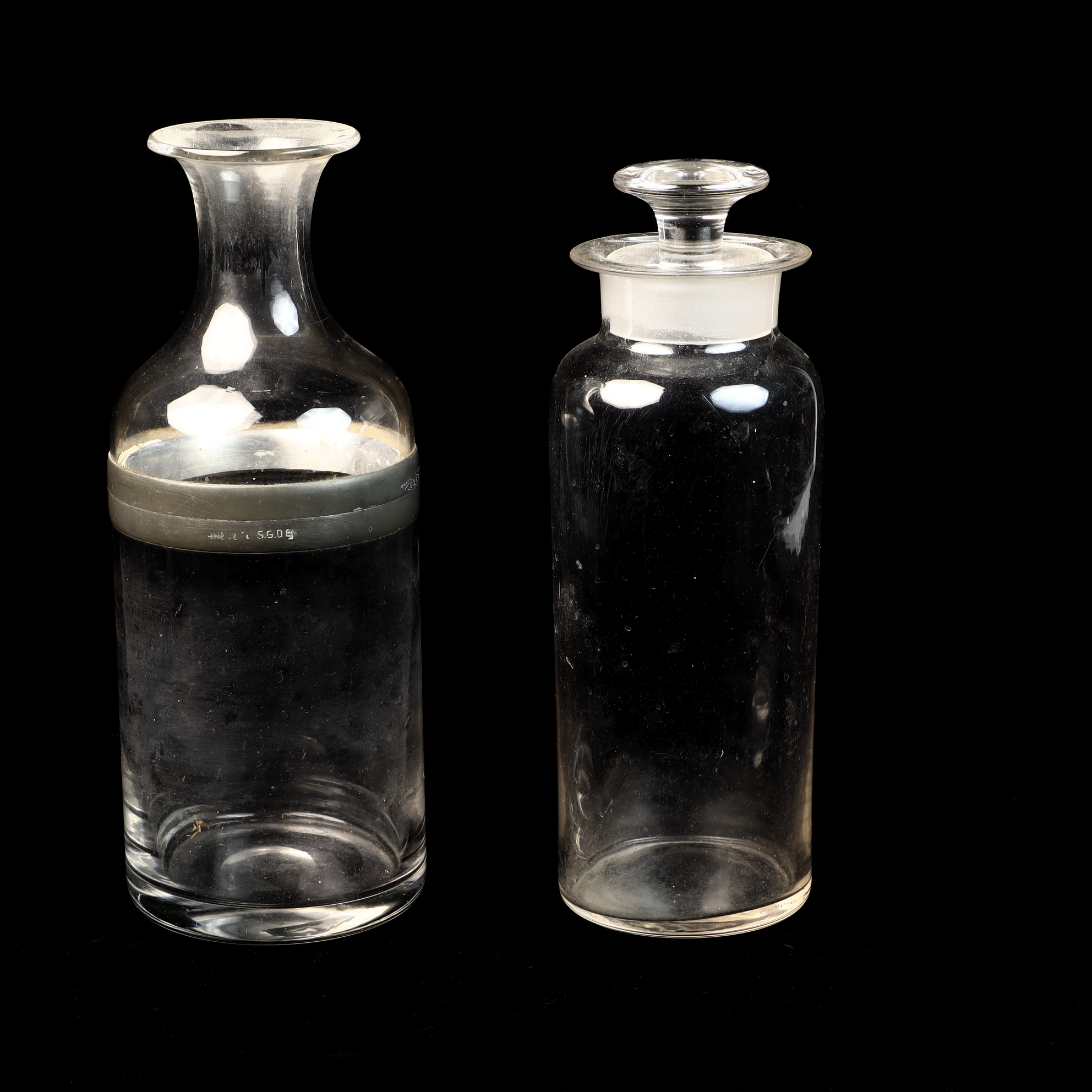 This lot features two clear glass vessels designed for pharmaceutical or laboratory use. The first item is a two-part specialized storage jar comprised of a cylindrical base and a separate upper glass section with a flared rim. The two components are joined by a wide metal collar assembly. The metal band is stamped BTE S.G.D.G on the exterior. The lower edge of the upper metal fitting is marked MARQUE & MODELE DEPOSE and features a diamond-shaped cartouche with the letters E and R flanking a central ampersand. The second item is a cylindrical reagent jar with a wide, ground glass inner rim and a matching clear glass stopper featuring a disc top and a ground glass plug for an airtight seal. Both pieces are made of mold-blown clear glass and have polished, smooth bases.Two-part jar: 10.5 inches height, 4 inches diameterReagent jar: 9 inches height including stopper, 3 inches diameter.