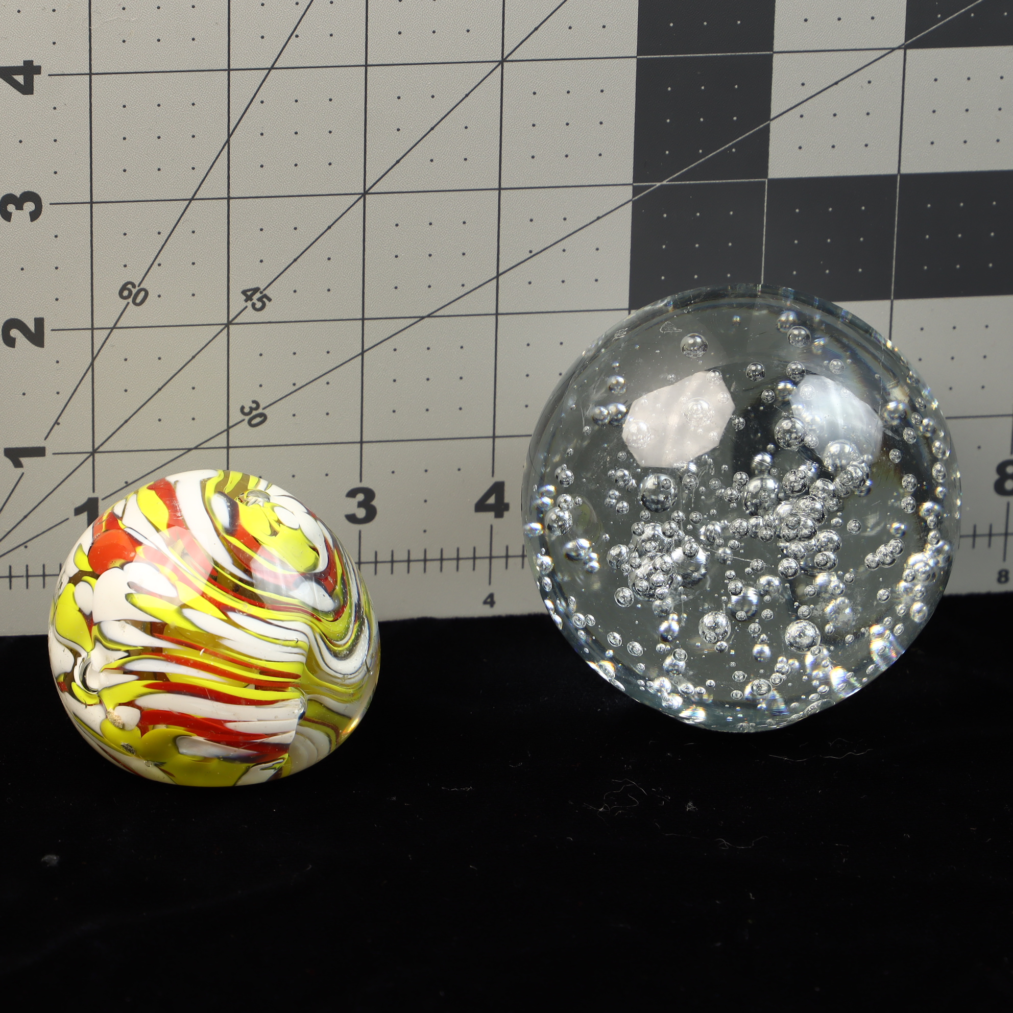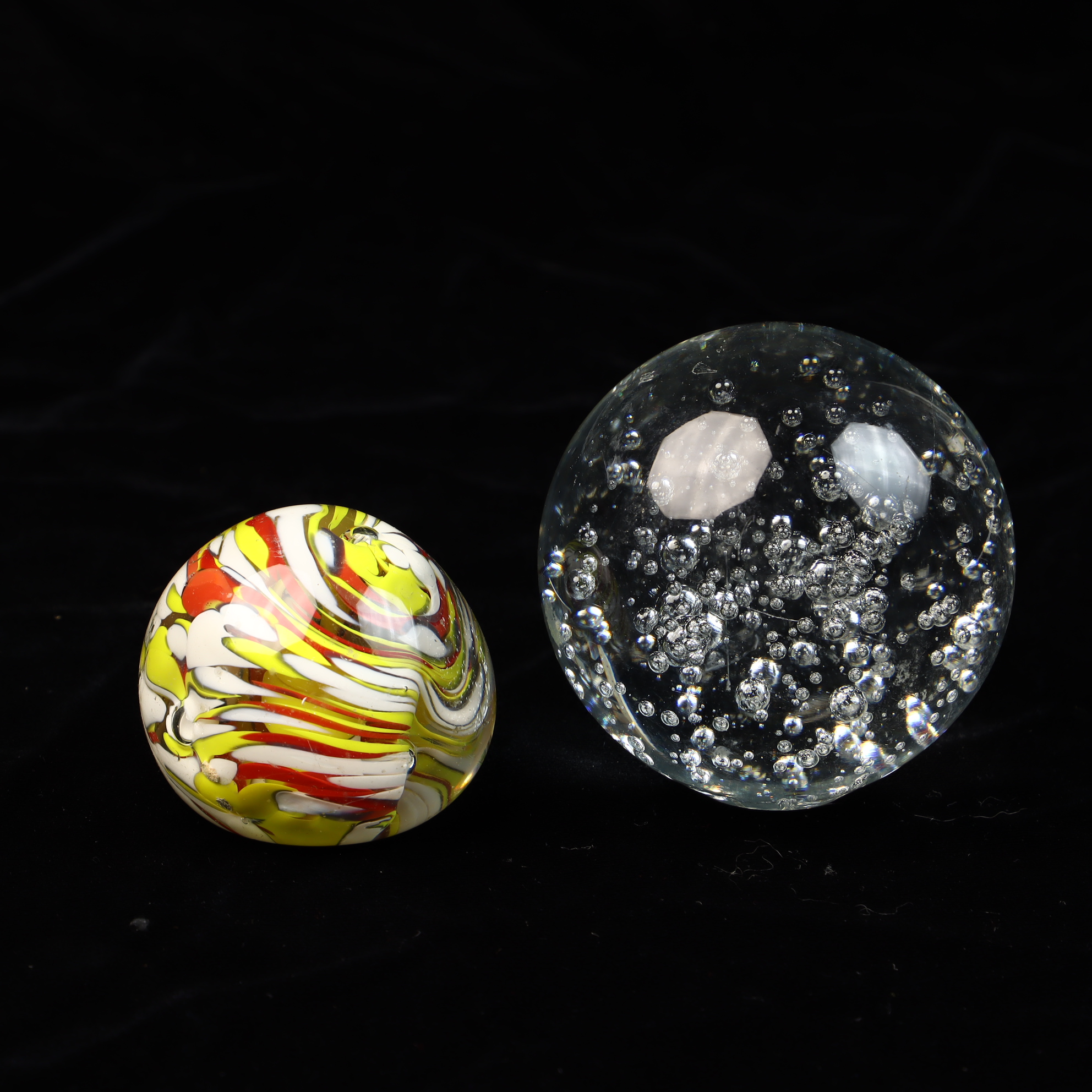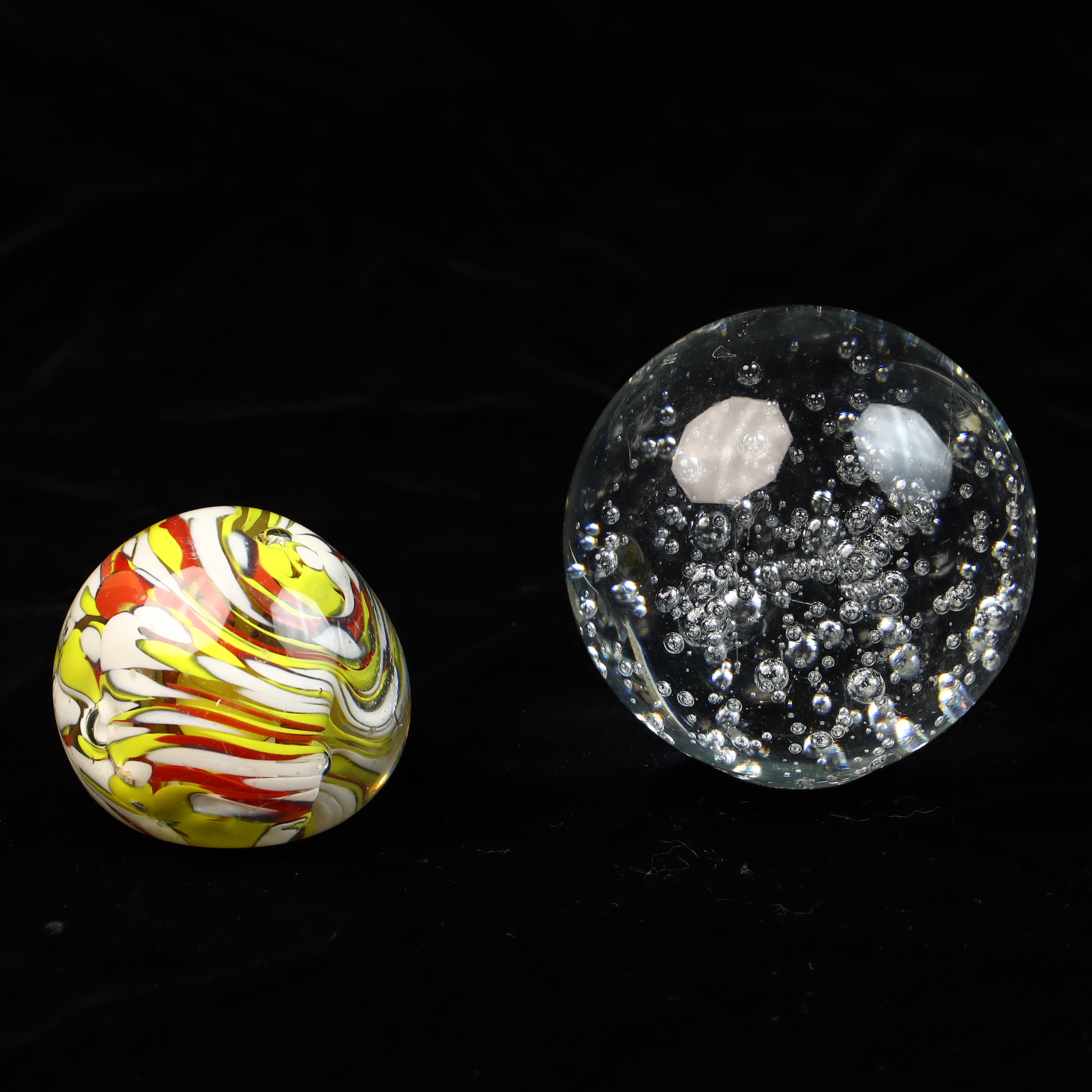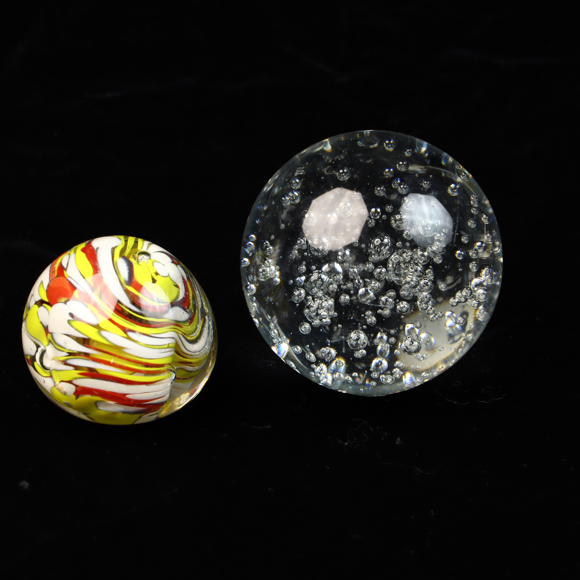 This lot features two distinct decorative glass paperweights. The first is a clear glass sphere featuring a bullicante or controlled bubble effect, with uniform air bubbles arranged in a systematic internal pattern. The second item is a smaller paperweight with a flattened base, containing internal opaque swirls of yellow, red, and white glass. Both pieces are unsigned and do not exhibit any visible maker marks, signatures, or labels.Controlled bubble paperweight: 3.5 inches in diameterMulticolored swirl paperweight: 2.5 inches in diameter.