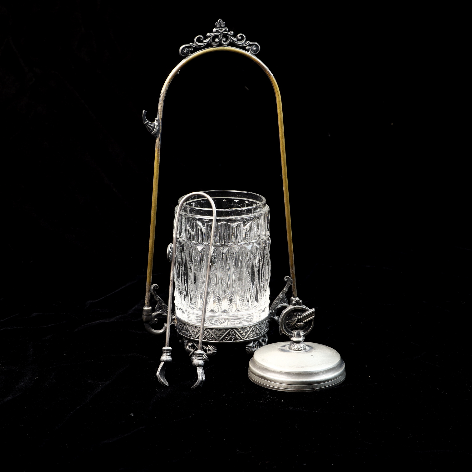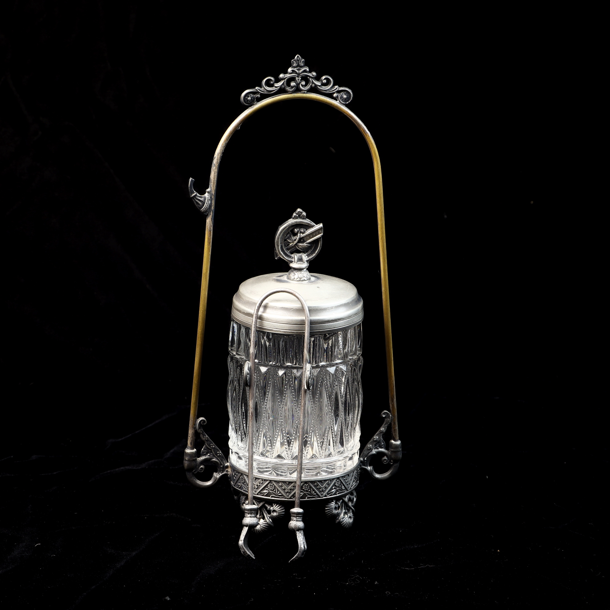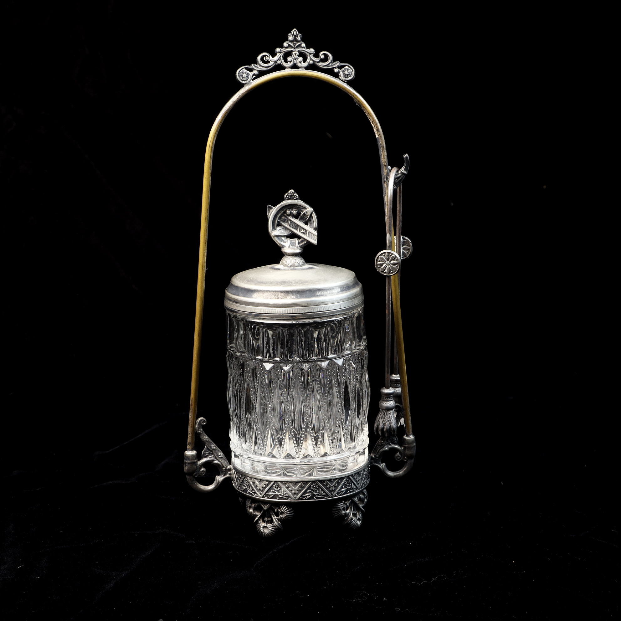 This Victorian-era pickle castor consists of a clear glass jar, a silver-plated lid, an ornate silver-plated stand, and a pair of matching silver-plated tongs. The glass jar features a deep-cut pattern of vertical fluting and diamond-shaped motifs. The silver-plated lid is topped with a decorative finial depicting a circular emblem with a diagonal cross-bar. The stand features a tall arched handle with a scrolling crest at the apex and a hook on one side for hanging the tongs. The base of the stand is decorated with an embossed geometric and floral border and rests on four cast decorative feet. The piece exhibits illegible impressed marks on the underside of the base.Height: 10.5 inches.