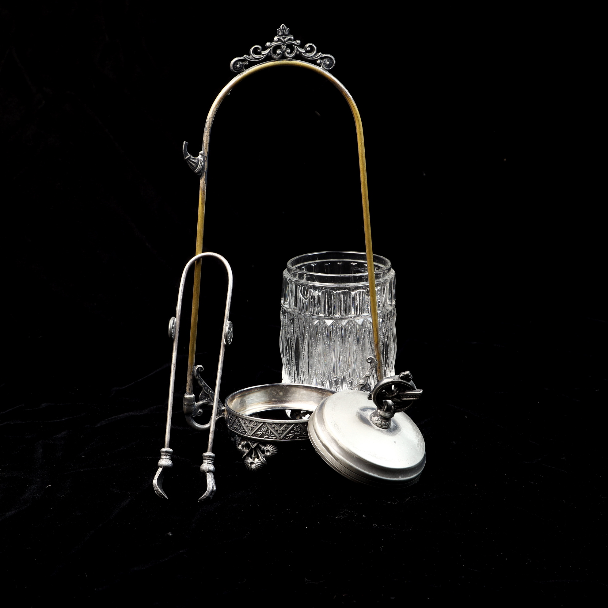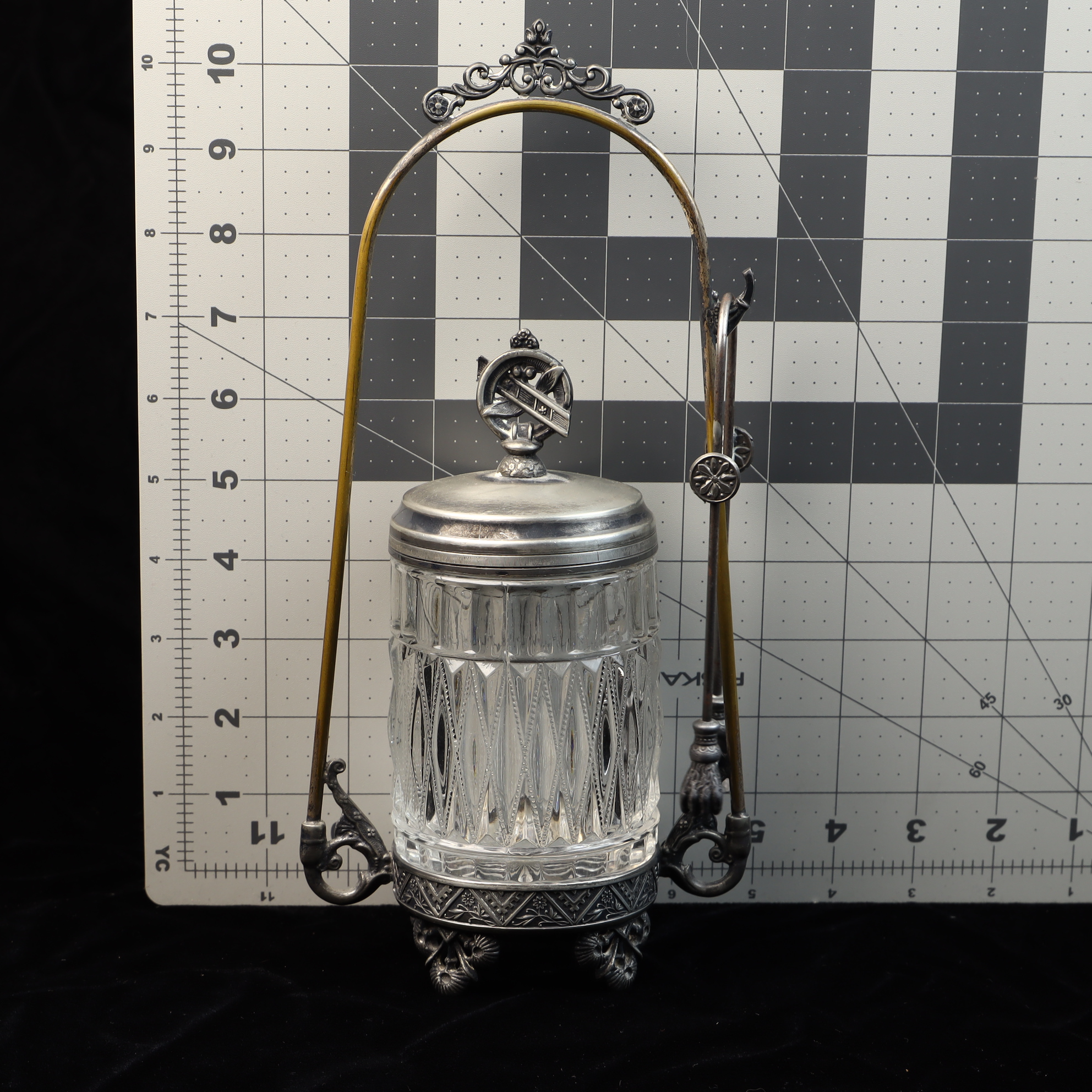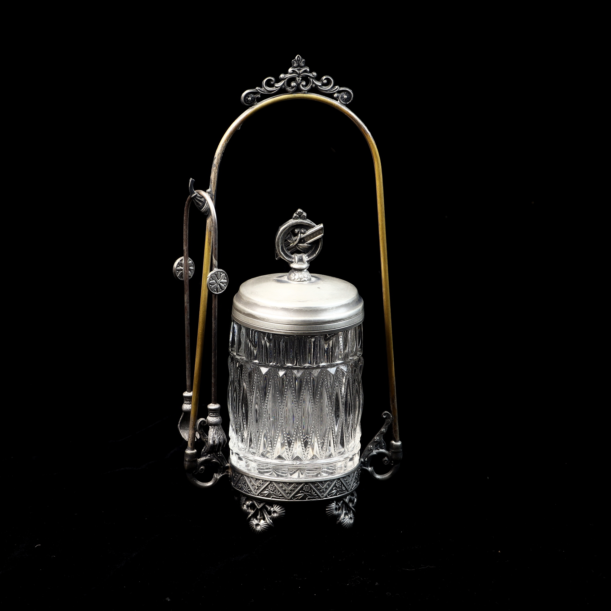 This Victorian-era pickle castor consists of a clear glass jar, a silver-plated lid, an ornate silver-plated stand, and a pair of matching silver-plated tongs. The glass jar features a deep-cut pattern of vertical fluting and diamond-shaped motifs. The silver-plated lid is topped with a decorative finial depicting a circular emblem with a diagonal cross-bar. The stand features a tall arched handle with a scrolling crest at the apex and a hook on one side for hanging the tongs. The base of the stand is decorated with an embossed geometric and floral border and rests on four cast decorative feet. The piece exhibits illegible impressed marks on the underside of the base.Height: 10.5 inches.