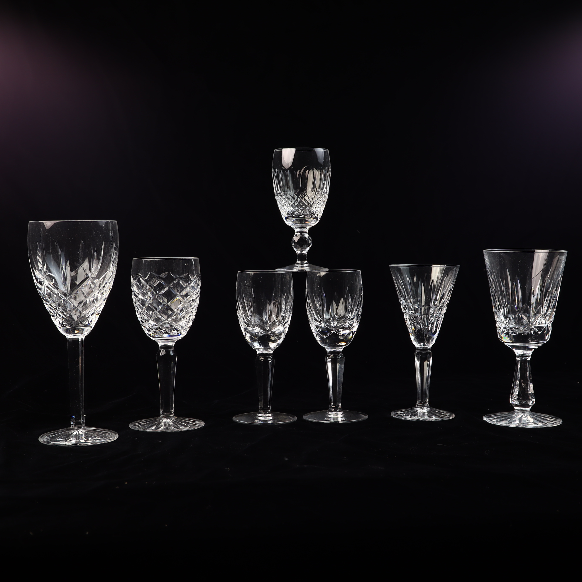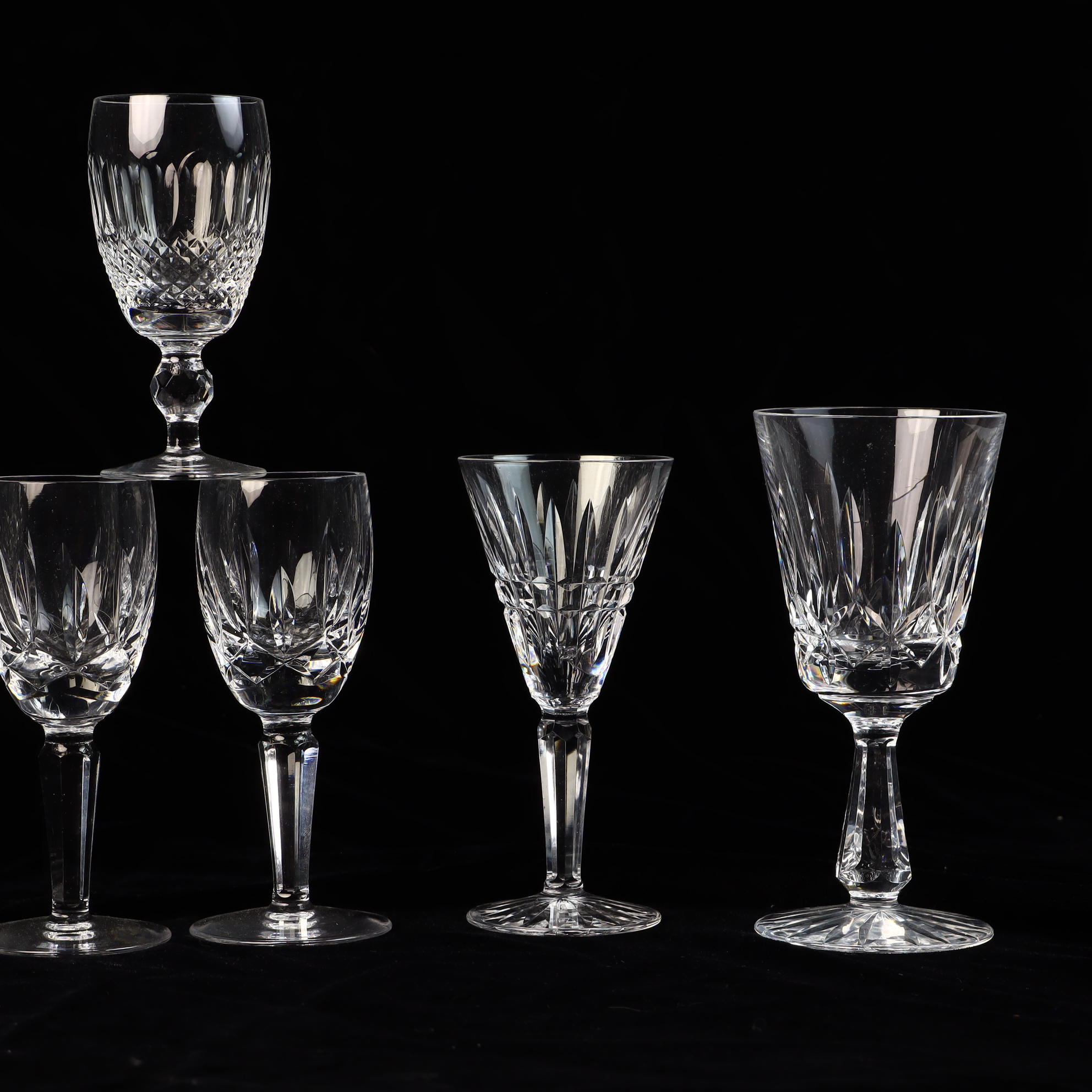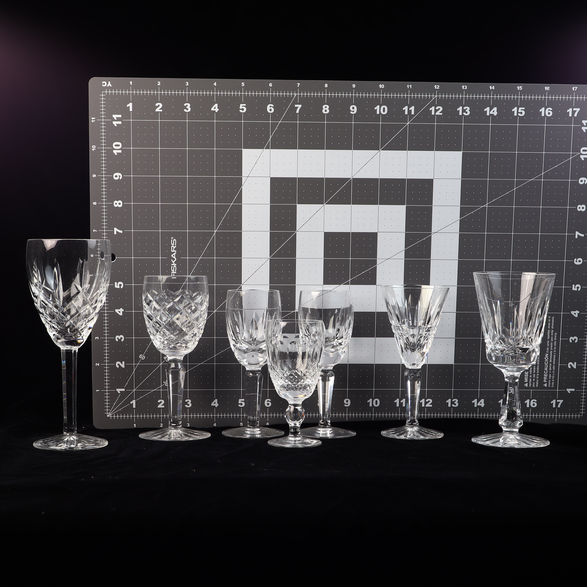 This collection comprises seven pieces of lead crystal stemware produced by Waterford. The group includes several pieces in the Lismore pattern, characterized by a combination of diamond and wedge cuts. Also included is a piece in the Kildare pattern, featuring vertical wedge cuts. The assortment consists of various sizes and forms, including water goblets, wine glasses, and claret or cordial glasses. One glass features a bowl decorated with cross-hatched diamond cuts. An acid-etched Waterford signature in a gothic-style font is located on the base of at least one glass. The stems are variously shaped, including faceted and bulbous designs, and the circular bases feature starburst or plain cut patterns.Heights: 4.75 inches to 7 inches.
