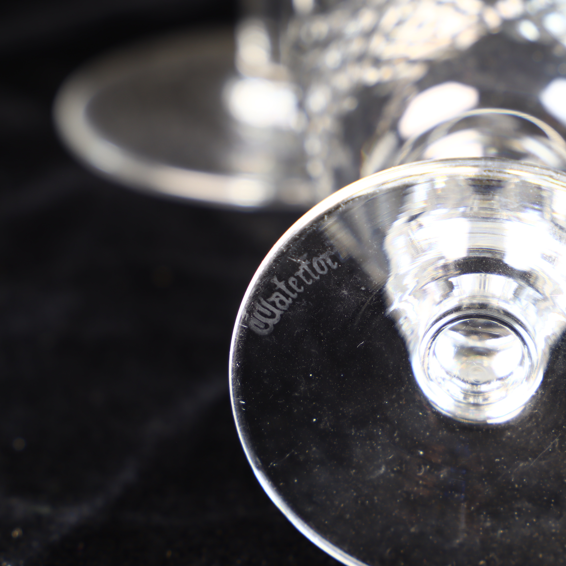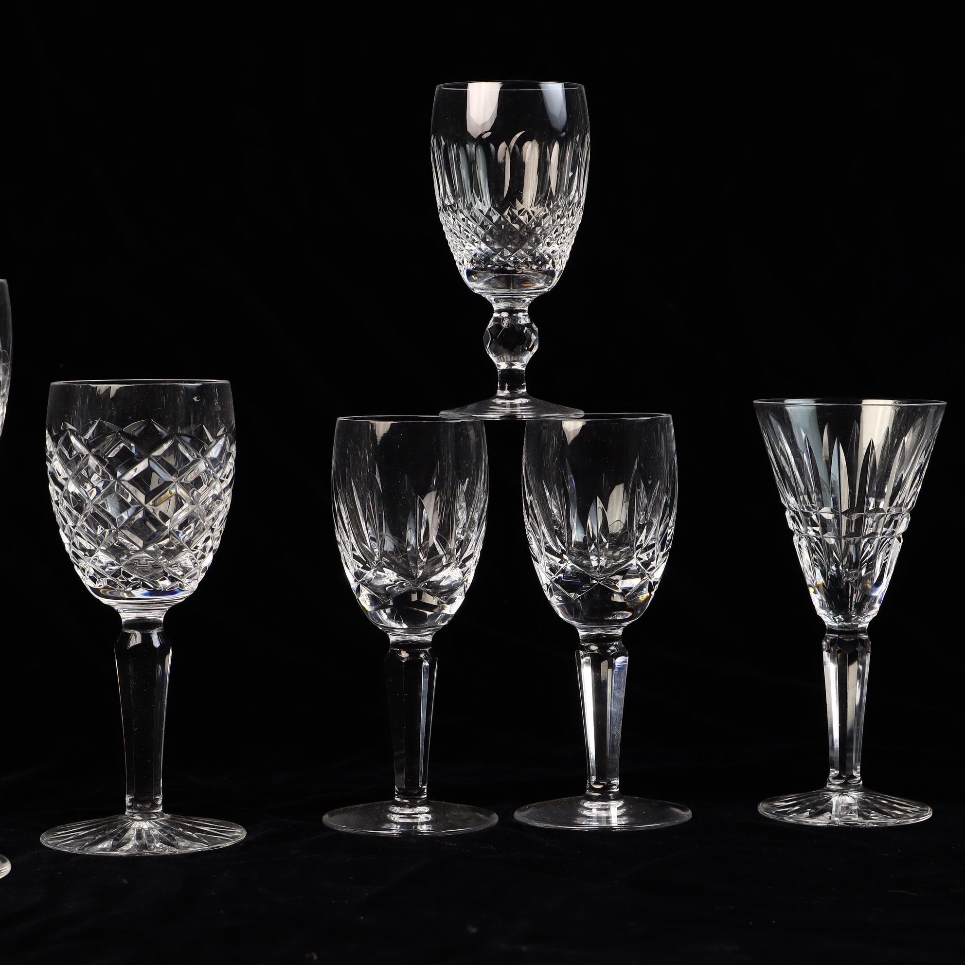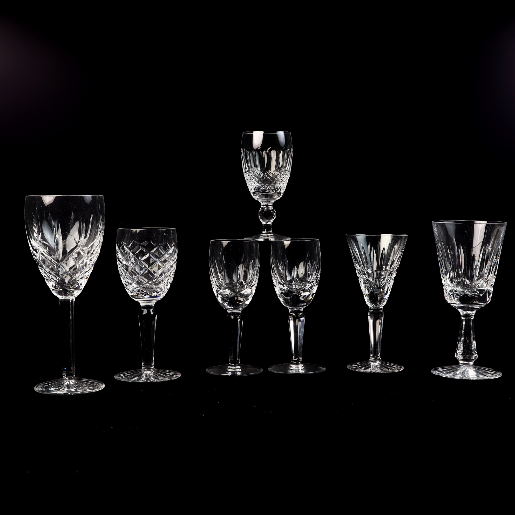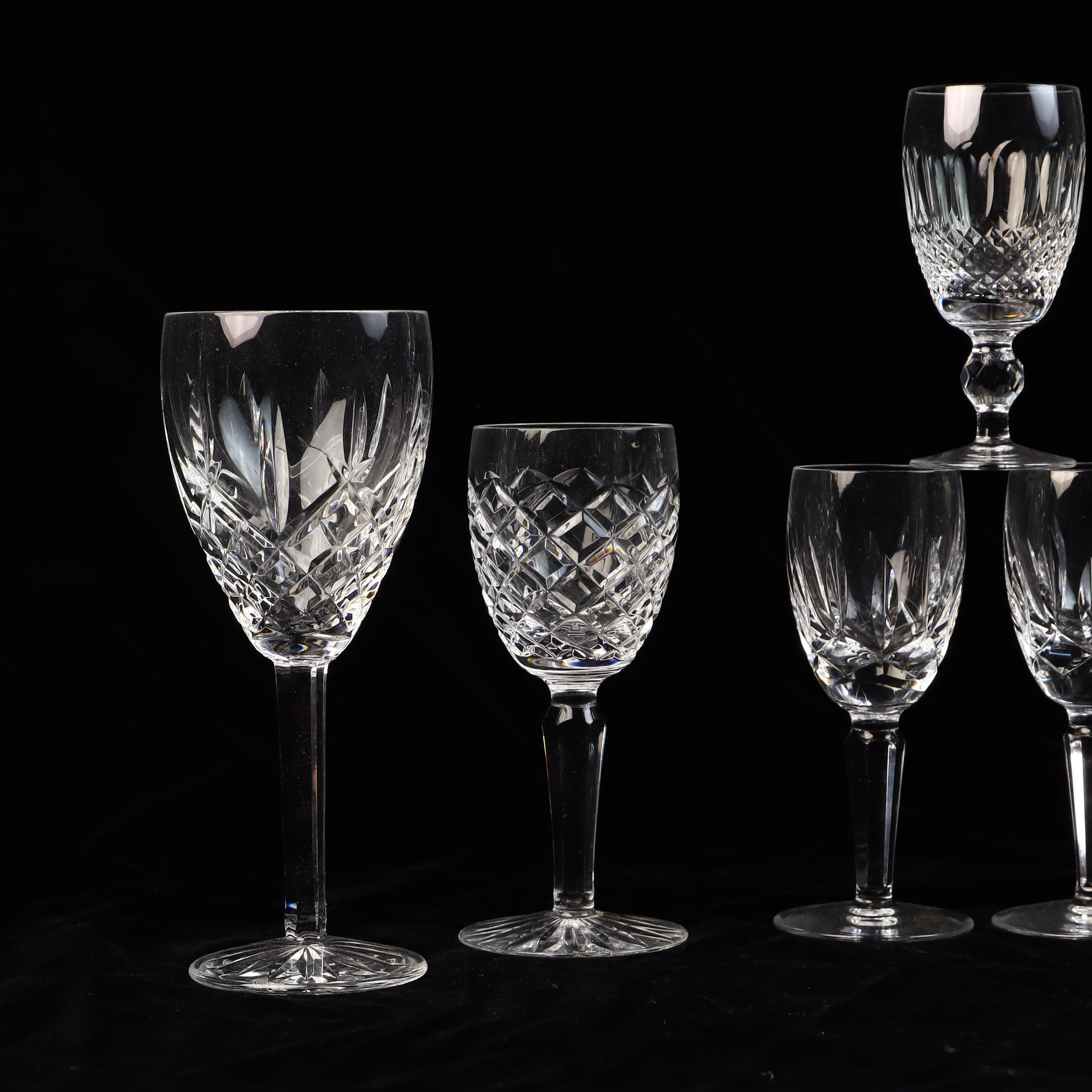 This collection comprises seven pieces of lead crystal stemware produced by Waterford. The group includes several pieces in the Lismore pattern, characterized by a combination of diamond and wedge cuts. Also included is a piece in the Kildare pattern, featuring vertical wedge cuts. The assortment consists of various sizes and forms, including water goblets, wine glasses, and claret or cordial glasses. One glass features a bowl decorated with cross-hatched diamond cuts. An acid-etched Waterford signature in a gothic-style font is located on the base of at least one glass. The stems are variously shaped, including faceted and bulbous designs, and the circular bases feature starburst or plain cut patterns.Heights: 4.75 inches to 7 inches.