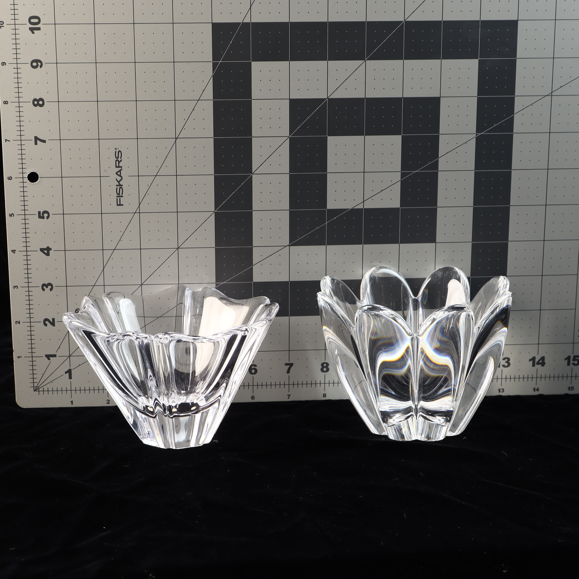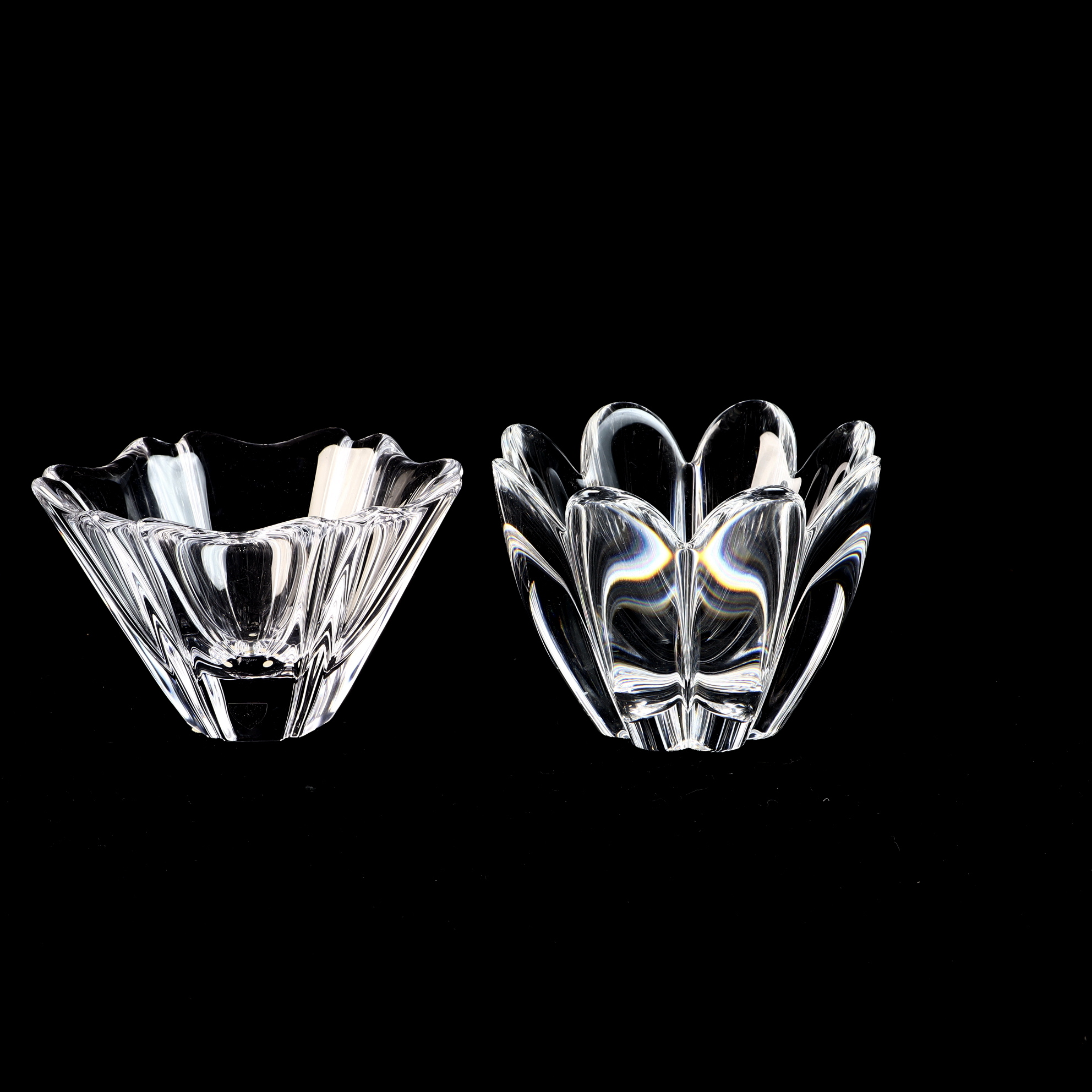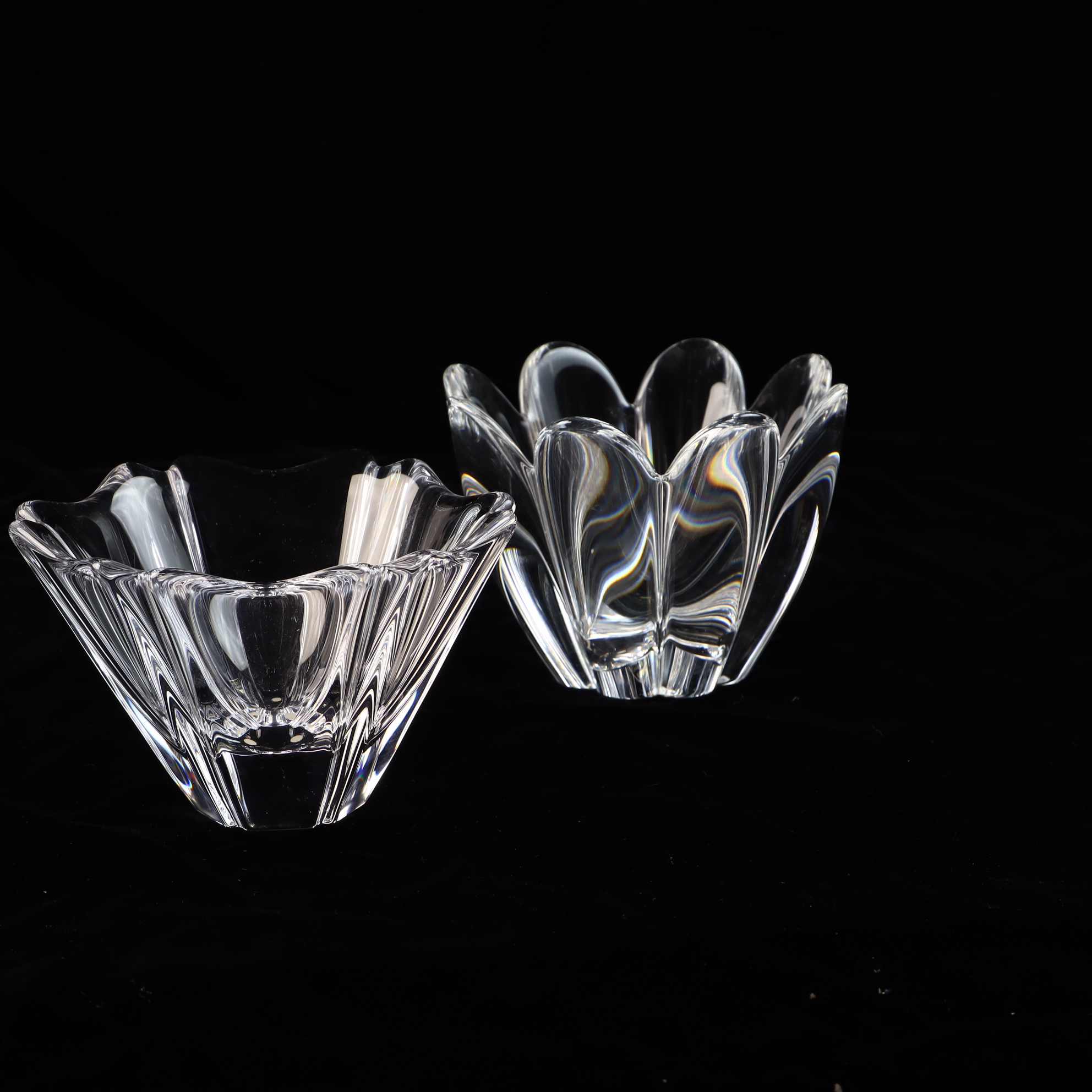 This pair of clear Swedish lead crystal bowls was manufactured by Orrefors. The set features two distinct modernist designs: the Stella pattern and the Orion pattern. The Stella bowl, designed by Anne Nilsson, is characterized by an angular, flared form with an eight-pointed star-shaped rim. The Orion bowl, designed by Lars Hellsten, features a rounded, ten-lobed form reminiscent of a blossoming flower or crown. Both items are made of heavy, high-clarity crystal. One piece retains its original gold and black foil manufacturer’s label which displays the Orrefors fish logo and the text Orrefors Sweden. The base of one bowl is hand-etched with a cursive Orrefors signature. The Stella bowl has three protective felt pads attached to the underside of the base.Stella Bowl: 3 inches (H) x 5.5 inches (W)Orion Bowl: 4 inches (H) x 5.5 inches (W).