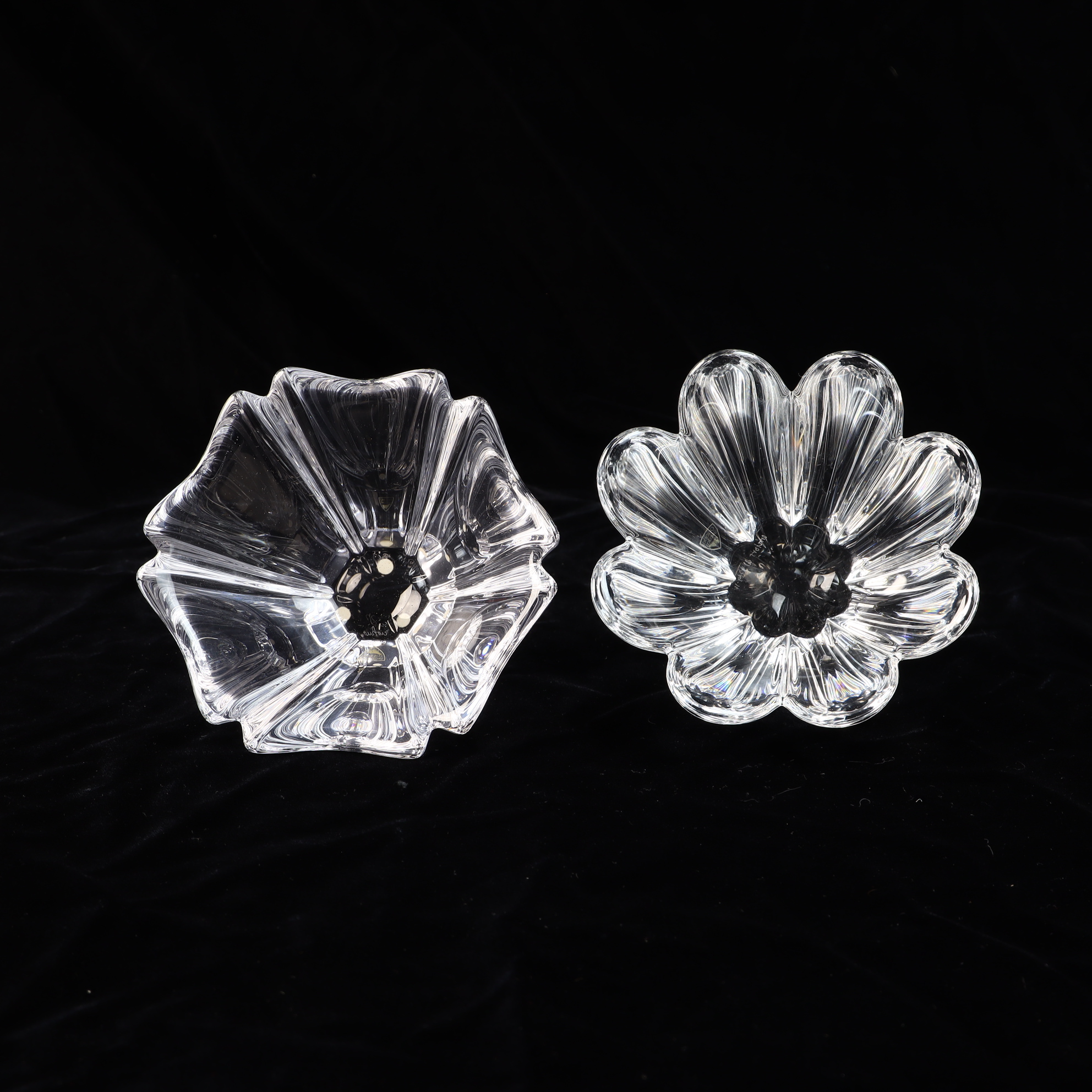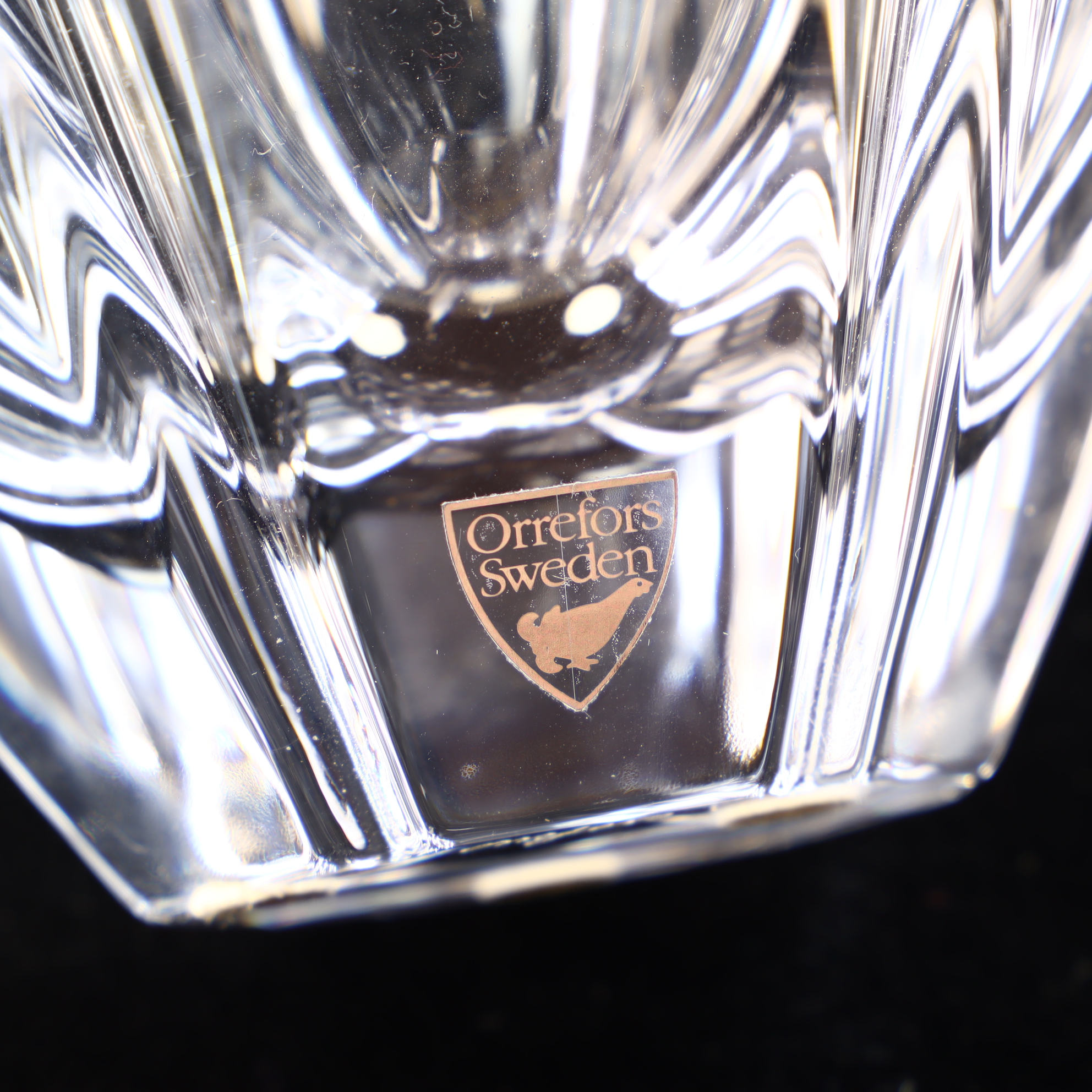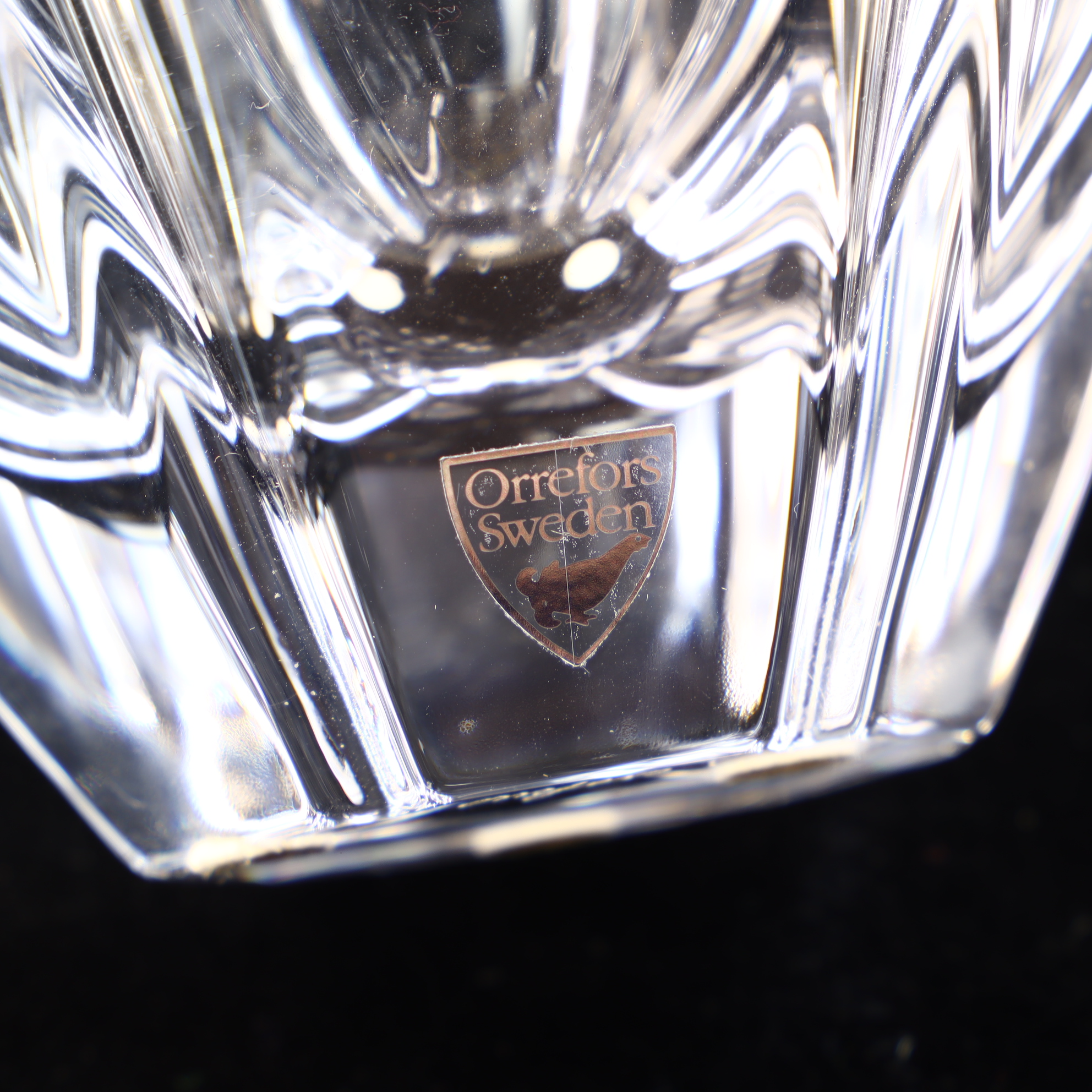 This pair of clear Swedish lead crystal bowls was manufactured by Orrefors. The set features two distinct modernist designs: the Stella pattern and the Orion pattern. The Stella bowl, designed by Anne Nilsson, is characterized by an angular, flared form with an eight-pointed star-shaped rim. The Orion bowl, designed by Lars Hellsten, features a rounded, ten-lobed form reminiscent of a blossoming flower or crown. Both items are made of heavy, high-clarity crystal. One piece retains its original gold and black foil manufacturer’s label which displays the Orrefors fish logo and the text Orrefors Sweden. The base of one bowl is hand-etched with a cursive Orrefors signature. The Stella bowl has three protective felt pads attached to the underside of the base.Stella Bowl: 3 inches (H) x 5.5 inches (W)Orion Bowl: 4 inches (H) x 5.5 inches (W).