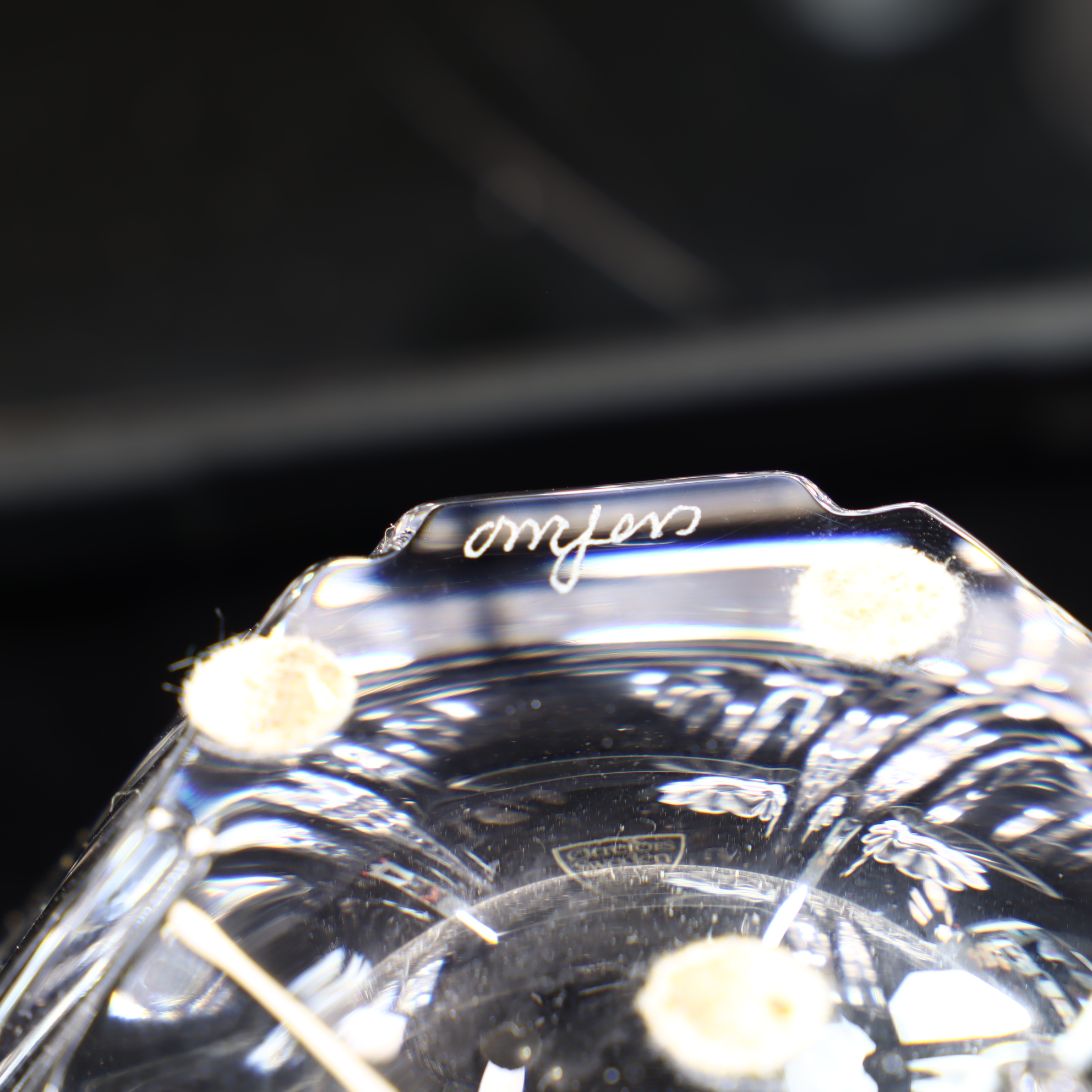 Both crystal bowls are in excellent condition with no visible chips, cracks, or deep scratches. One bowl retains the original manufacturer\'s foil label. Light shelf wear is present on the undersides consistent with age.