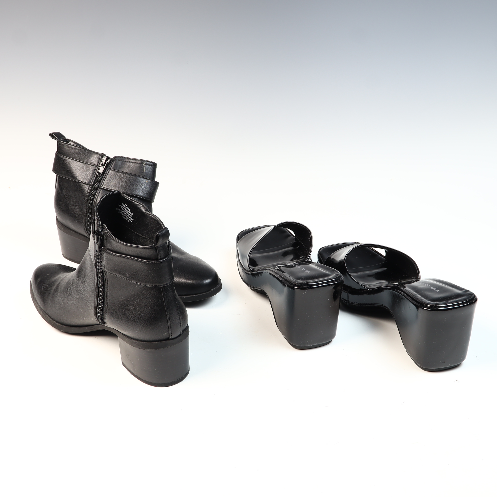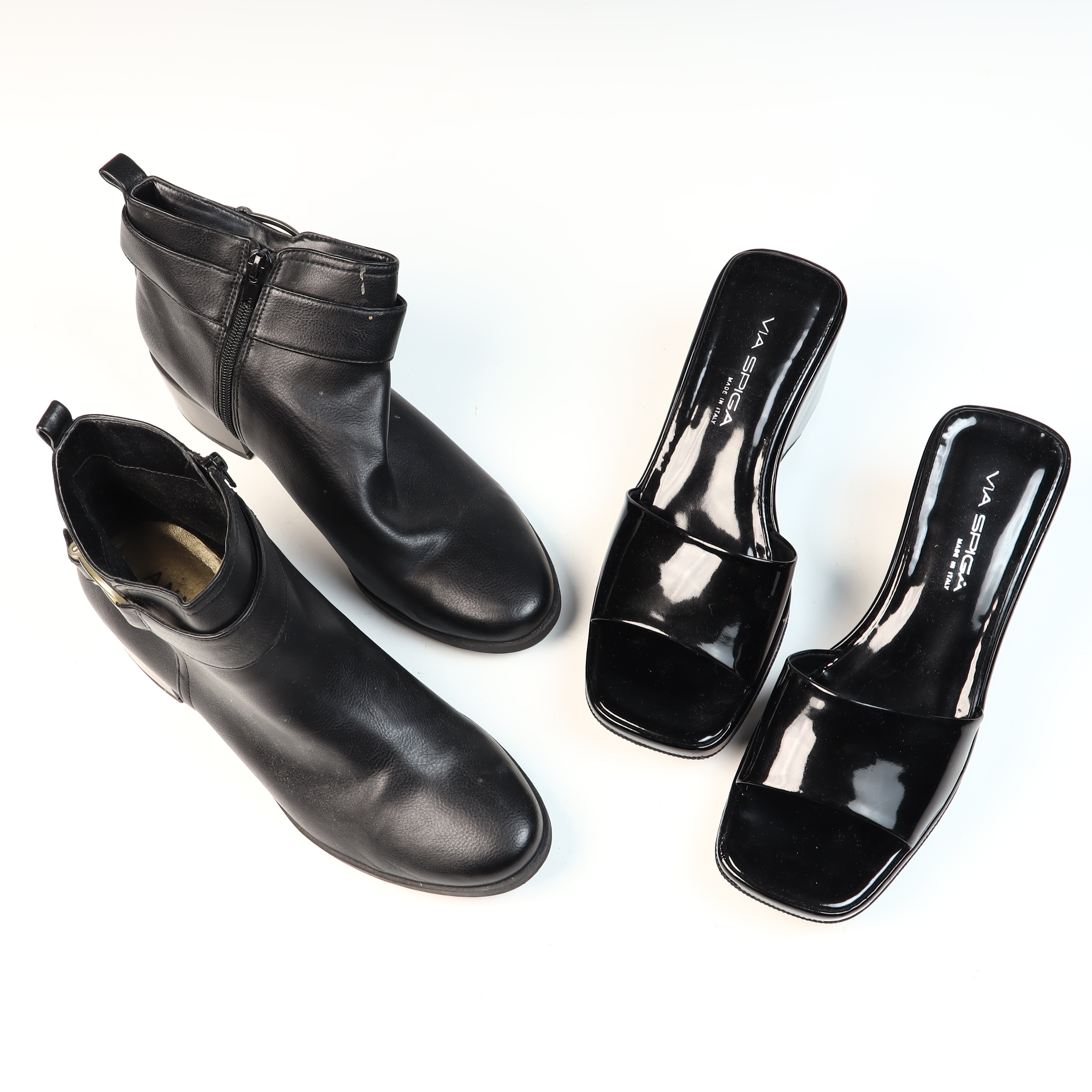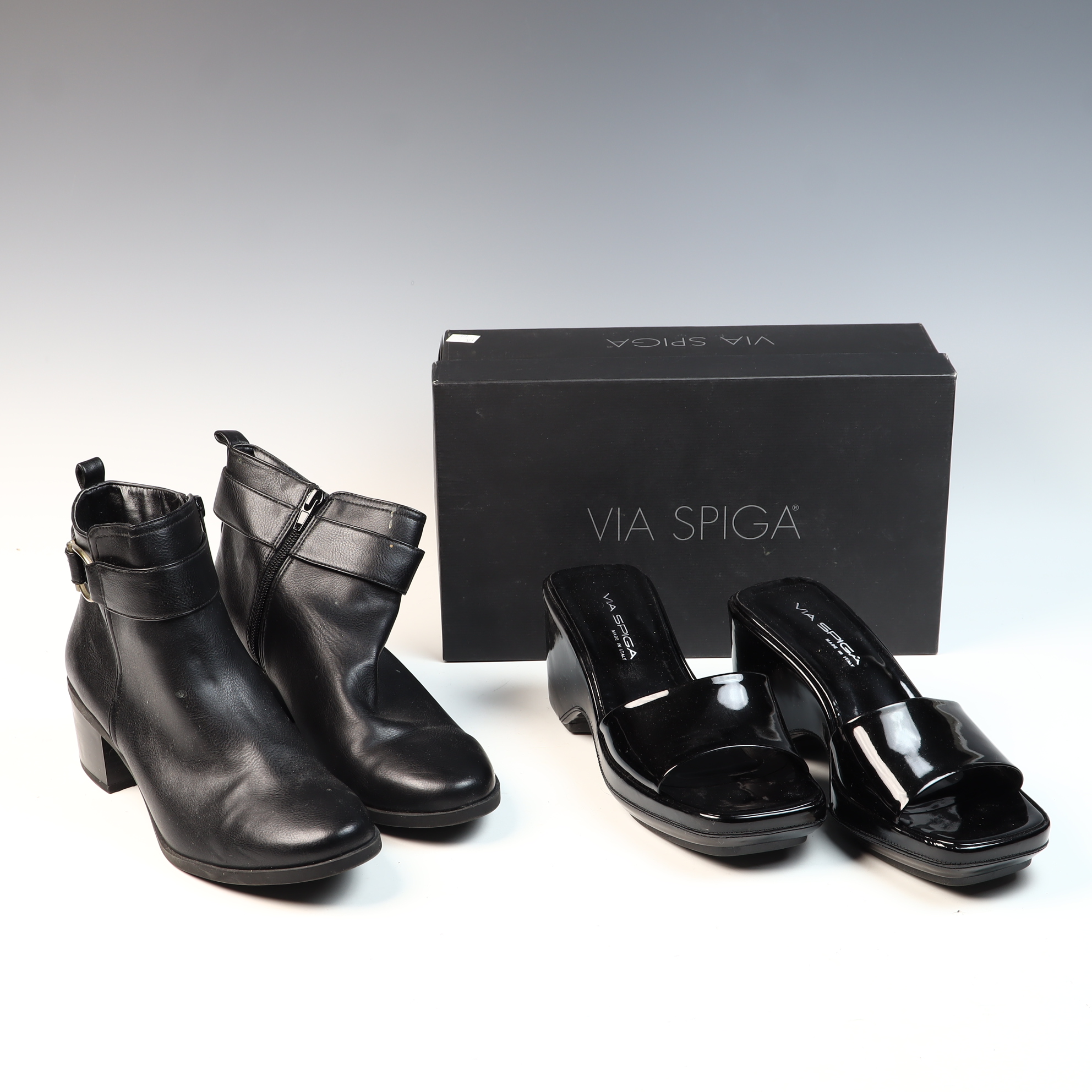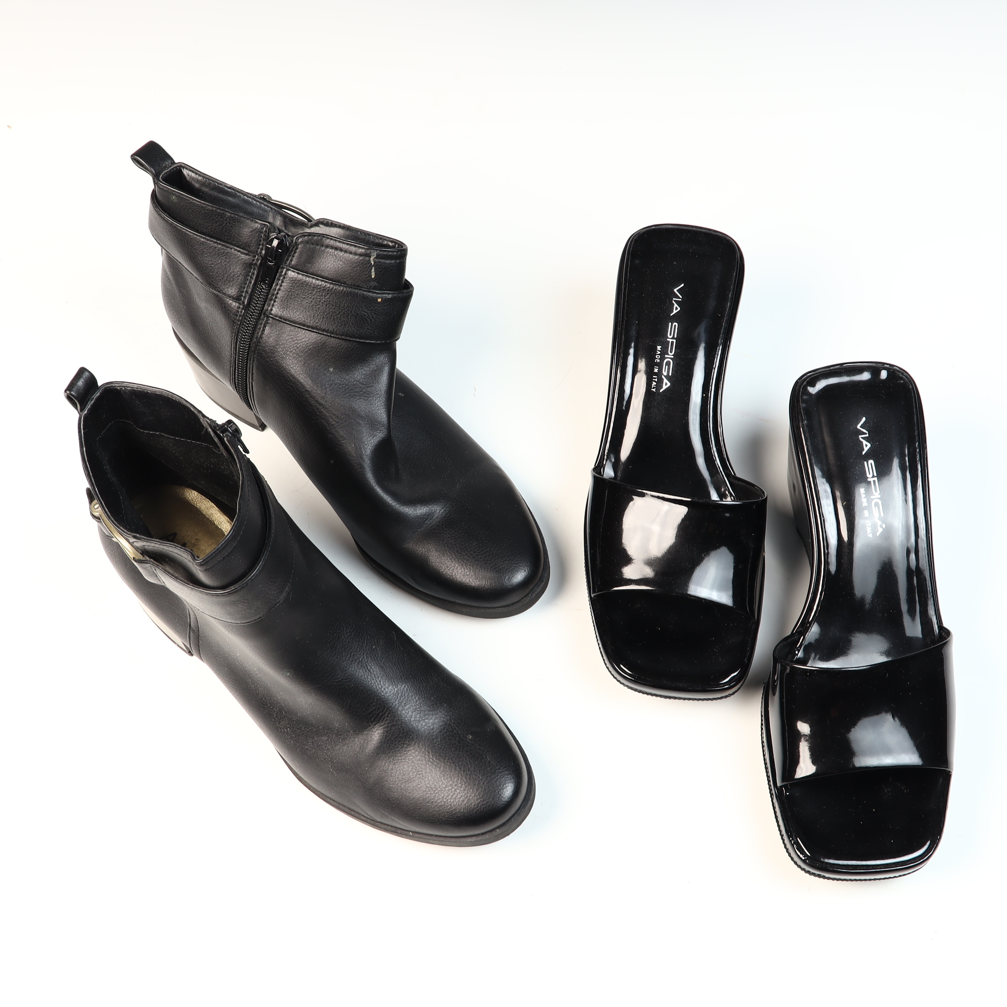 This lot features two pairs of women’s designer shoes in black, both size 9M. The first pair is a set of Anne Klein ankle booties. The design includes a rounded toe, a wrap-around ankle strap with a gold-tone buckle, and a functional inner side zipper. The uppers and balance are constructed from black man-made synthetic materials. The interior is printed with 9M NU JEANNE, MAN MADE UPPER, BALANCE MAN MADE, and MADE IN VIETNAM. The outsoles are embossed with ANNE KLEIN and iFlex, denoting the brand’s comfort technology. The boots feature a block heel.The second pair consists of Via Spiga open-toe slide sandals. These sandals feature a square-toe silhouette and a graduated wedge platform heel. The uppers are composed of black patent leather or high-shine synthetic material. The cushioned insoles are stamped VIA SPIGA and MADE IN ITALY, and the outsoles also bear the VIA SPIGA brand name. This pair includes the original black VIA SPIGA shoe box.Heel height (Boots): Approximately 2.5 inchesHeel height (Sandals): Approximately 3.5 inches.