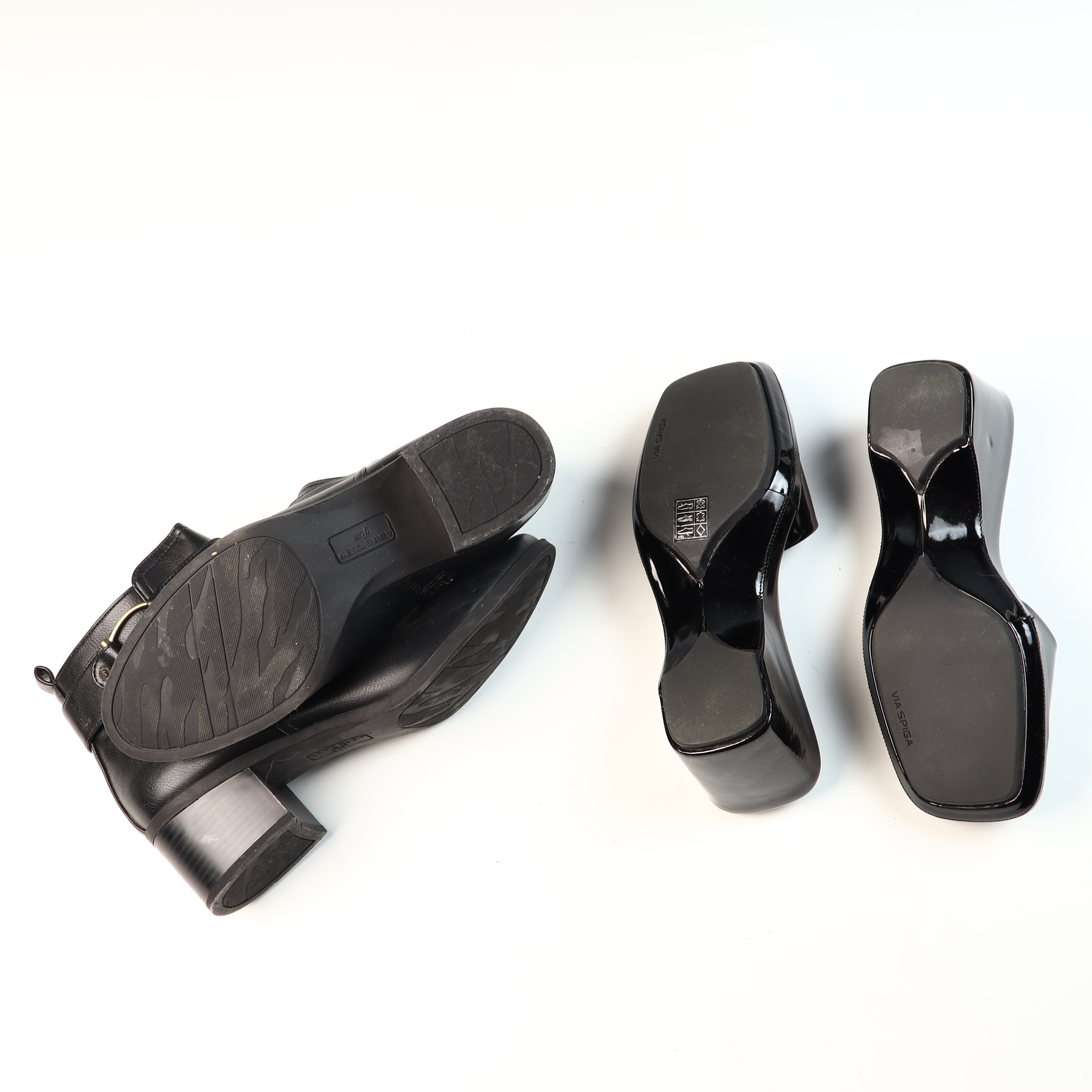 The Anne Klein boots are in good pre-owned condition. The uppers show creasing from normal use, and the outsoles show moderate wear consistent with use. The Via Spiga sandals are in very good pre-owned condition. The patent uppers show minor surface scuffs, and the outsoles show light wear.