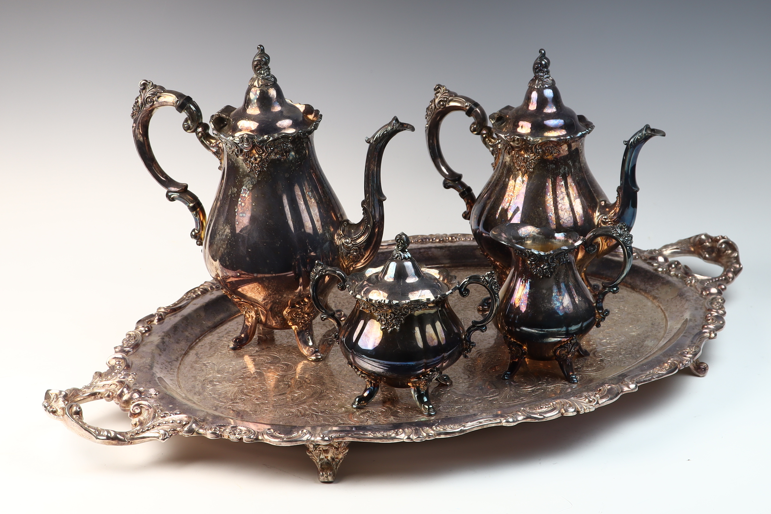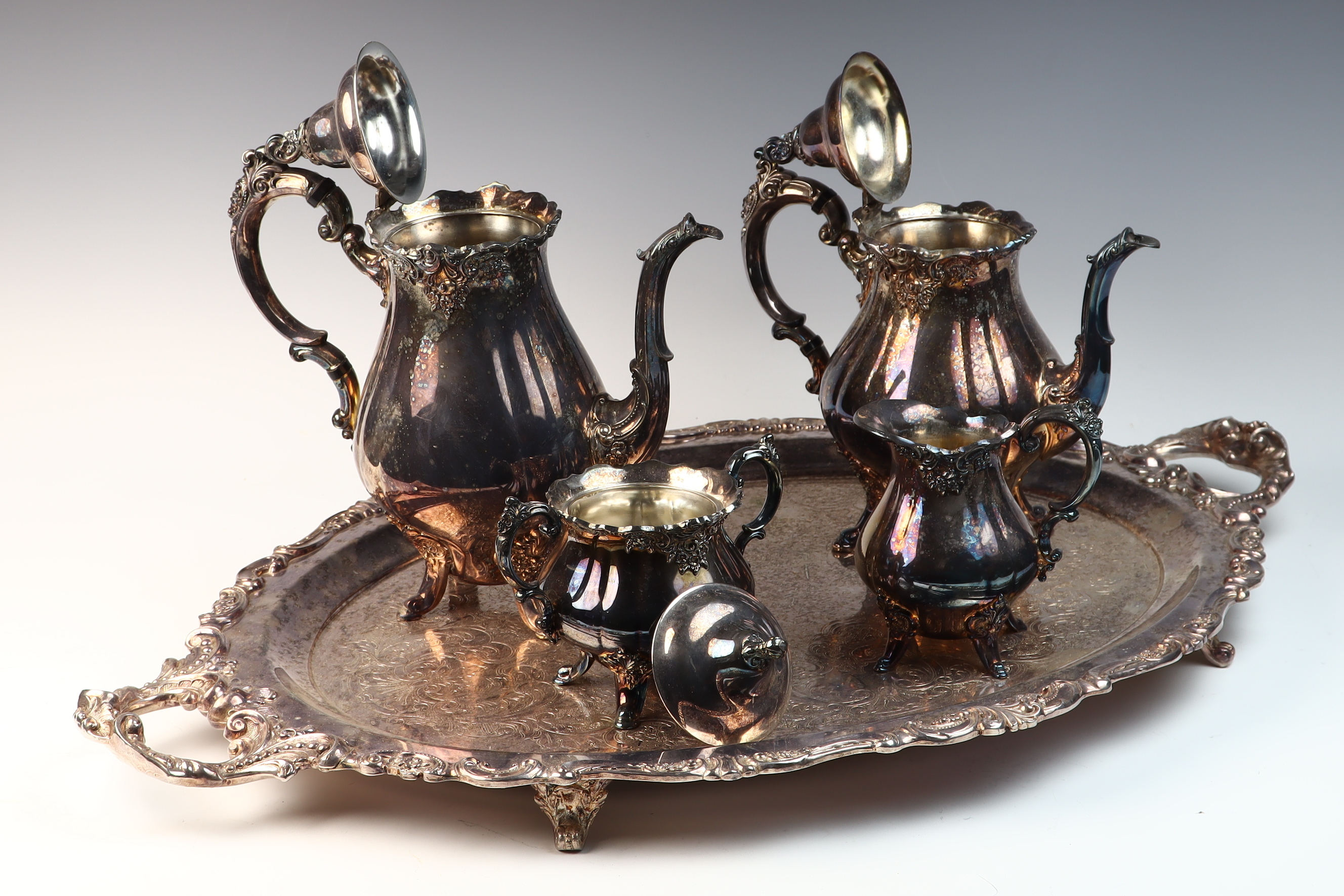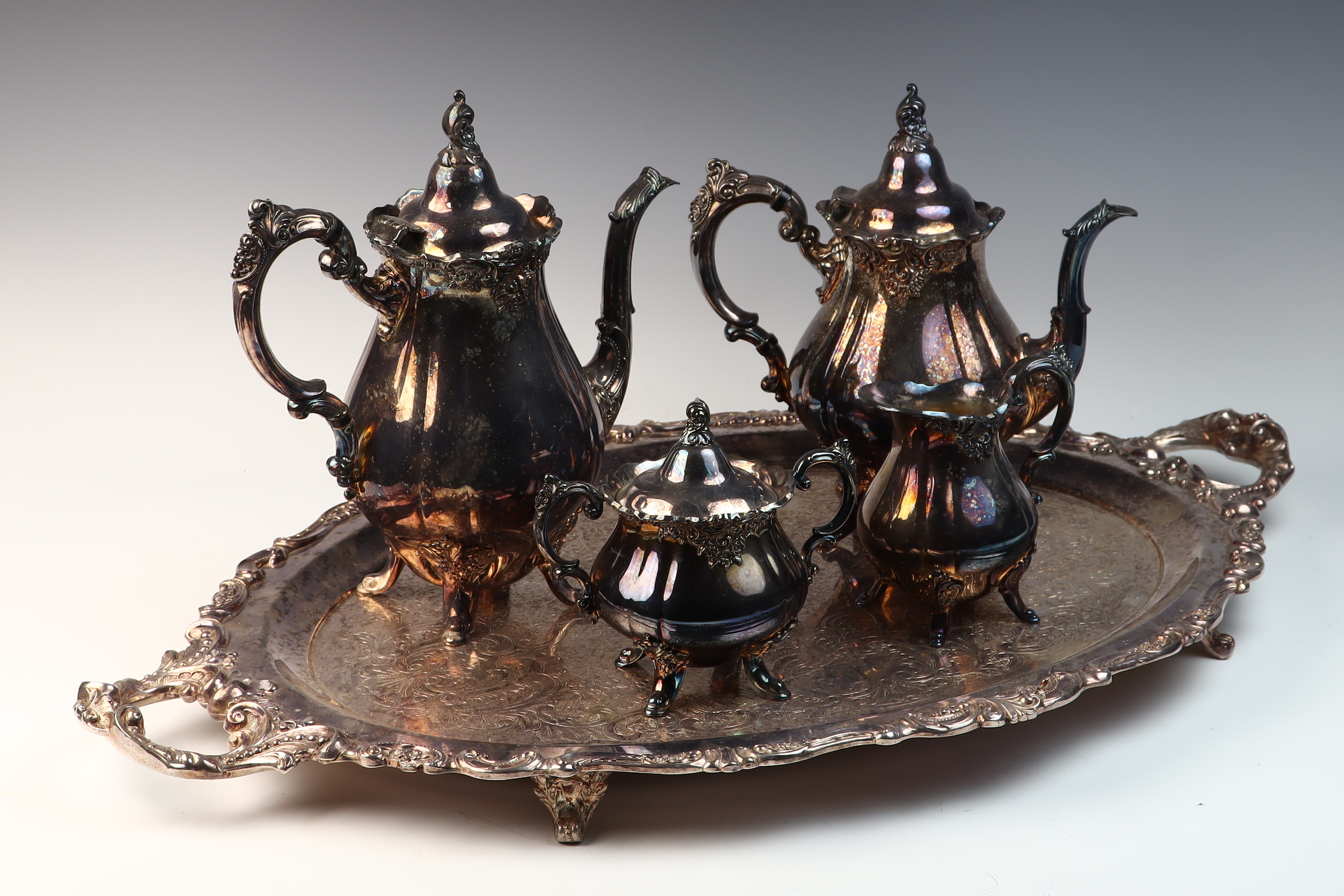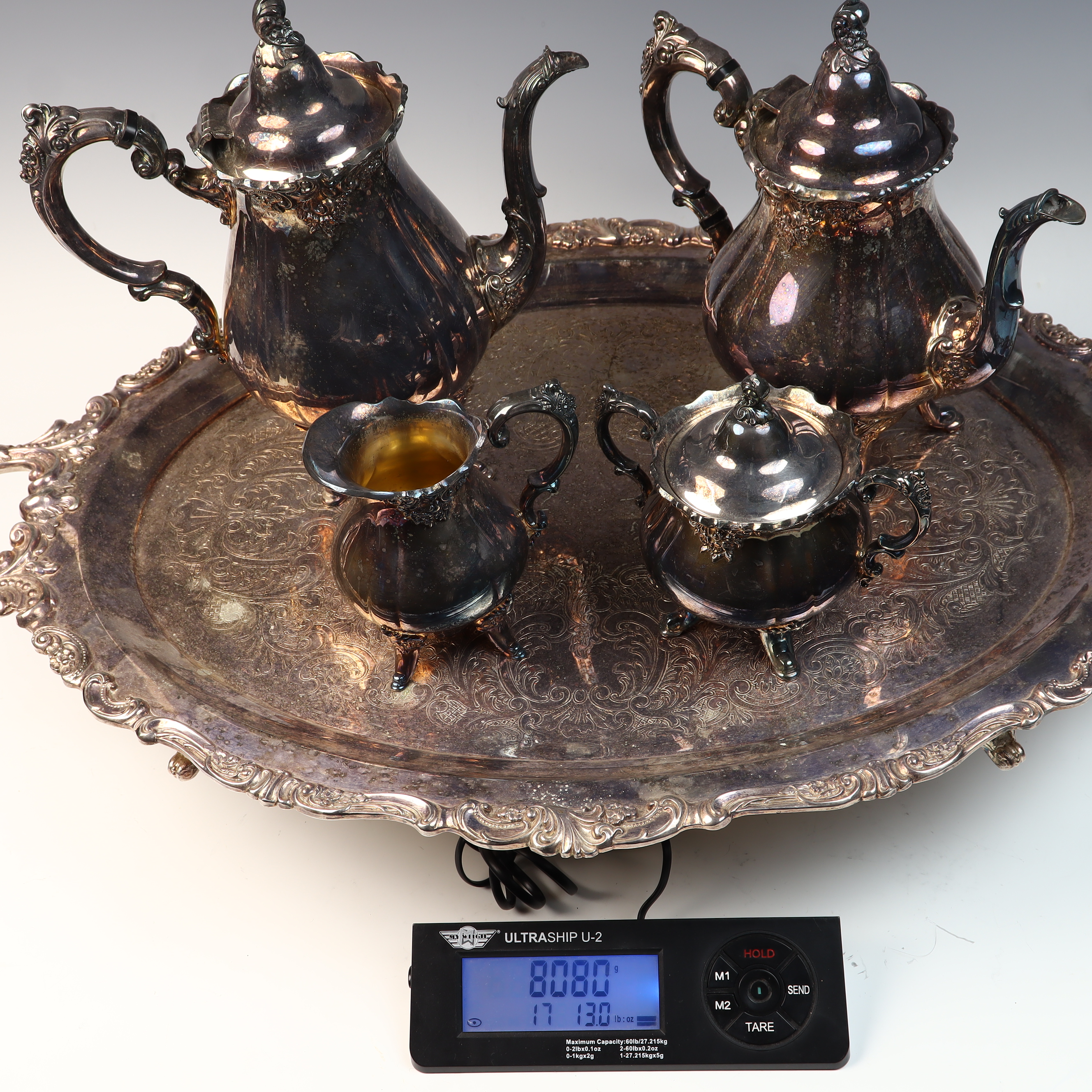 A five-piece silver-plated service presented in an ornate Rococo Revival style, exhibiting visual characteristics similar to the Lancaster Rose pattern by Poole and the Baroque pattern by Wallace. The set includes a coffee pot, a teapot, a covered sugar bowl, a creamer, and a large dual-handled oval tray. Each vessel features a lobed, baluster-form body decorated with embossed and chased foliate scrolls, shell motifs, and floral clusters. The coffee pot, teapot, and sugar bowl are fitted with domed lids surmounted by floral finials. All hollowware pieces are elevated on four scrolled acanthus-leaf feet. The oversized tray features a central field with intricate engraved scrolling foliate patterns, surrounded by a heavy molded rim with shell and scroll accents and two integral handles. No manufacturer marks or hallmarks are visible in the provided photographs.Tray length: 27 inchesTray width: 16.5 inches Coffee pot height: 11 inchesTeapot height: 9.5 inches Sugar bowl height: 7 inches Creamer height: 6 inchesTotal weight: 17 lbs 13.0 oz (8,080 grams).