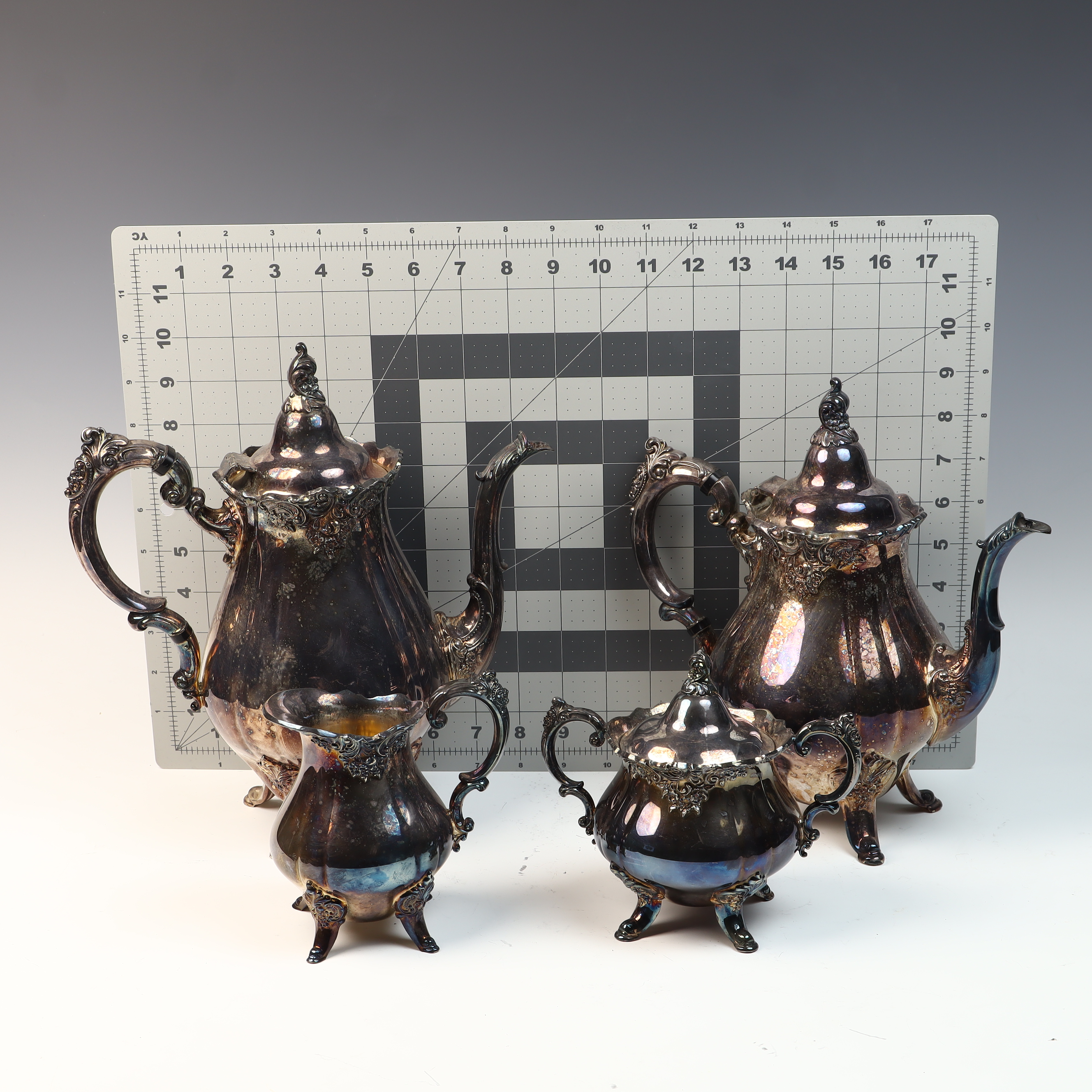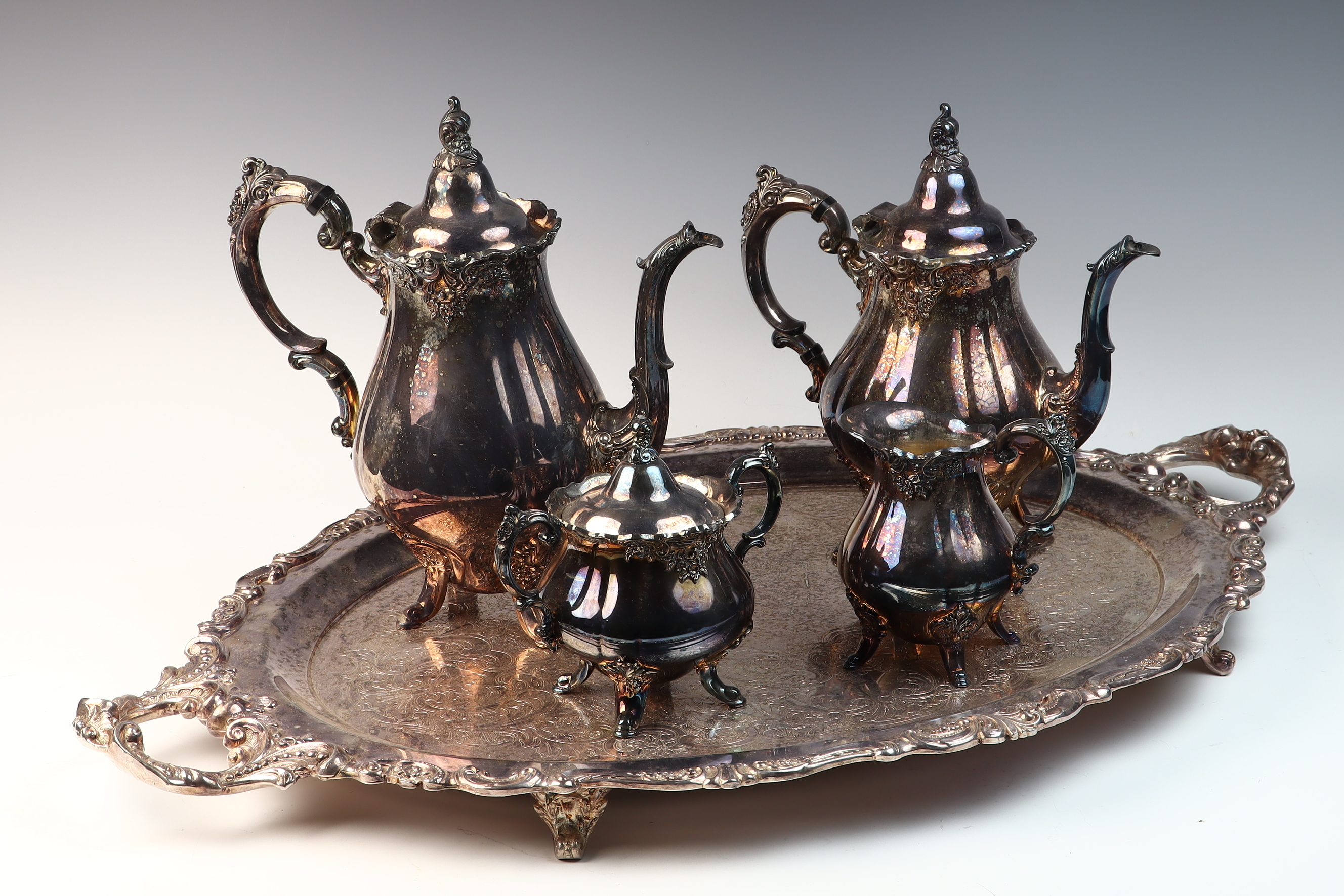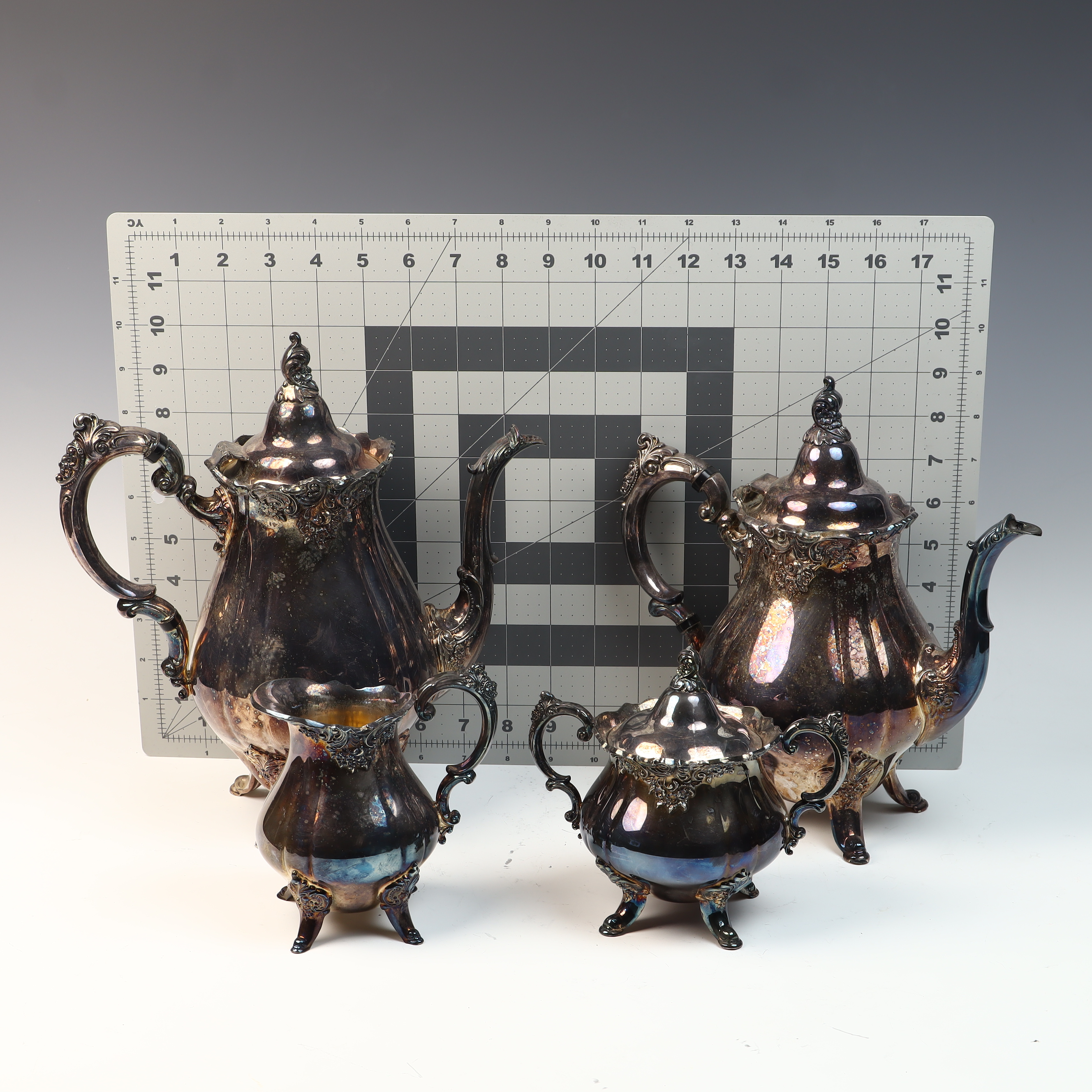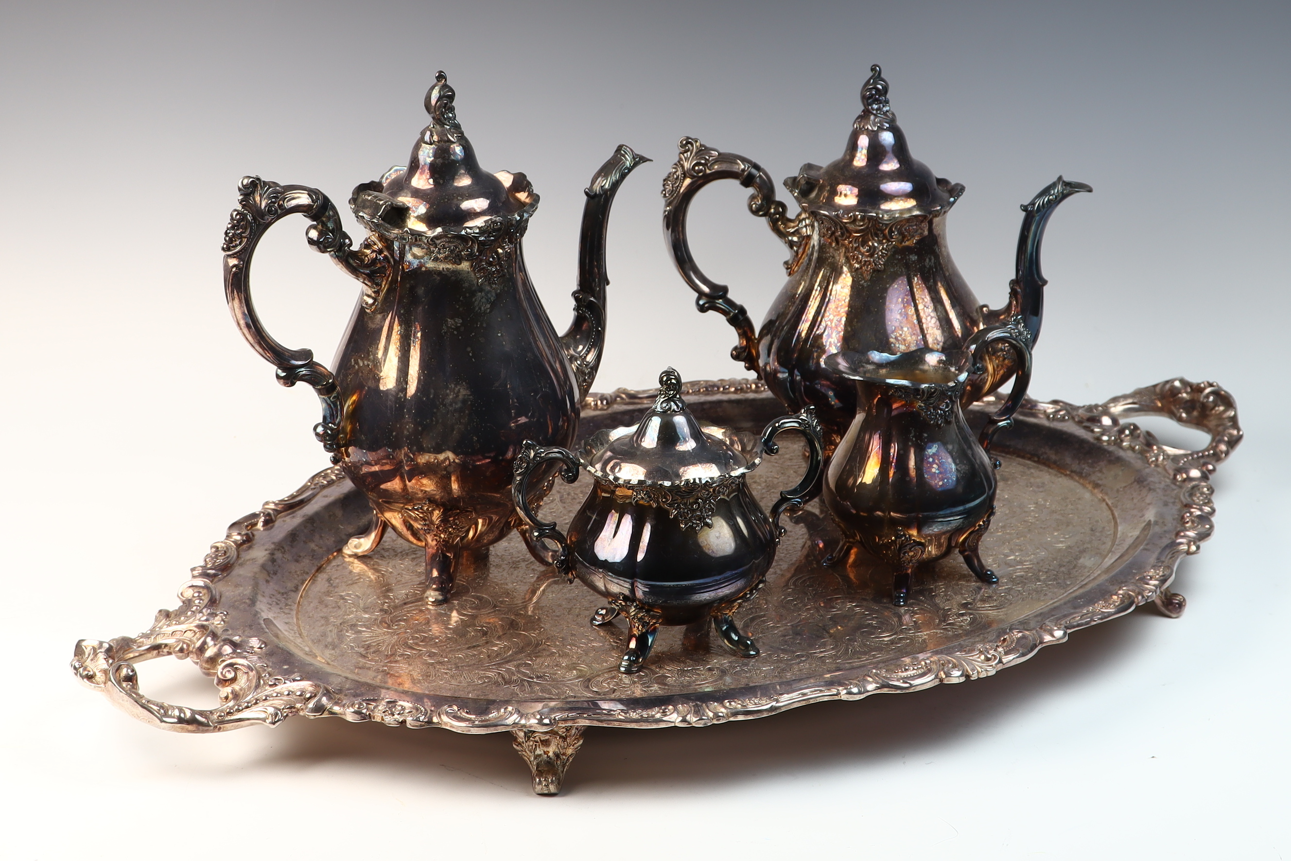 A five-piece silver-plated service presented in an ornate Rococo Revival style, exhibiting visual characteristics similar to the Lancaster Rose pattern by Poole and the Baroque pattern by Wallace. The set includes a coffee pot, a teapot, a covered sugar bowl, a creamer, and a large dual-handled oval tray. Each vessel features a lobed, baluster-form body decorated with embossed and chased foliate scrolls, shell motifs, and floral clusters. The coffee pot, teapot, and sugar bowl are fitted with domed lids surmounted by floral finials. All hollowware pieces are elevated on four scrolled acanthus-leaf feet. The oversized tray features a central field with intricate engraved scrolling foliate patterns, surrounded by a heavy molded rim with shell and scroll accents and two integral handles. No manufacturer marks or hallmarks are visible in the provided photographs.Tray length: 27 inchesTray width: 16.5 inches Coffee pot height: 11 inchesTeapot height: 9.5 inches Sugar bowl height: 7 inches Creamer height: 6 inchesTotal weight: 17 lbs 13.0 oz (8,080 grams).