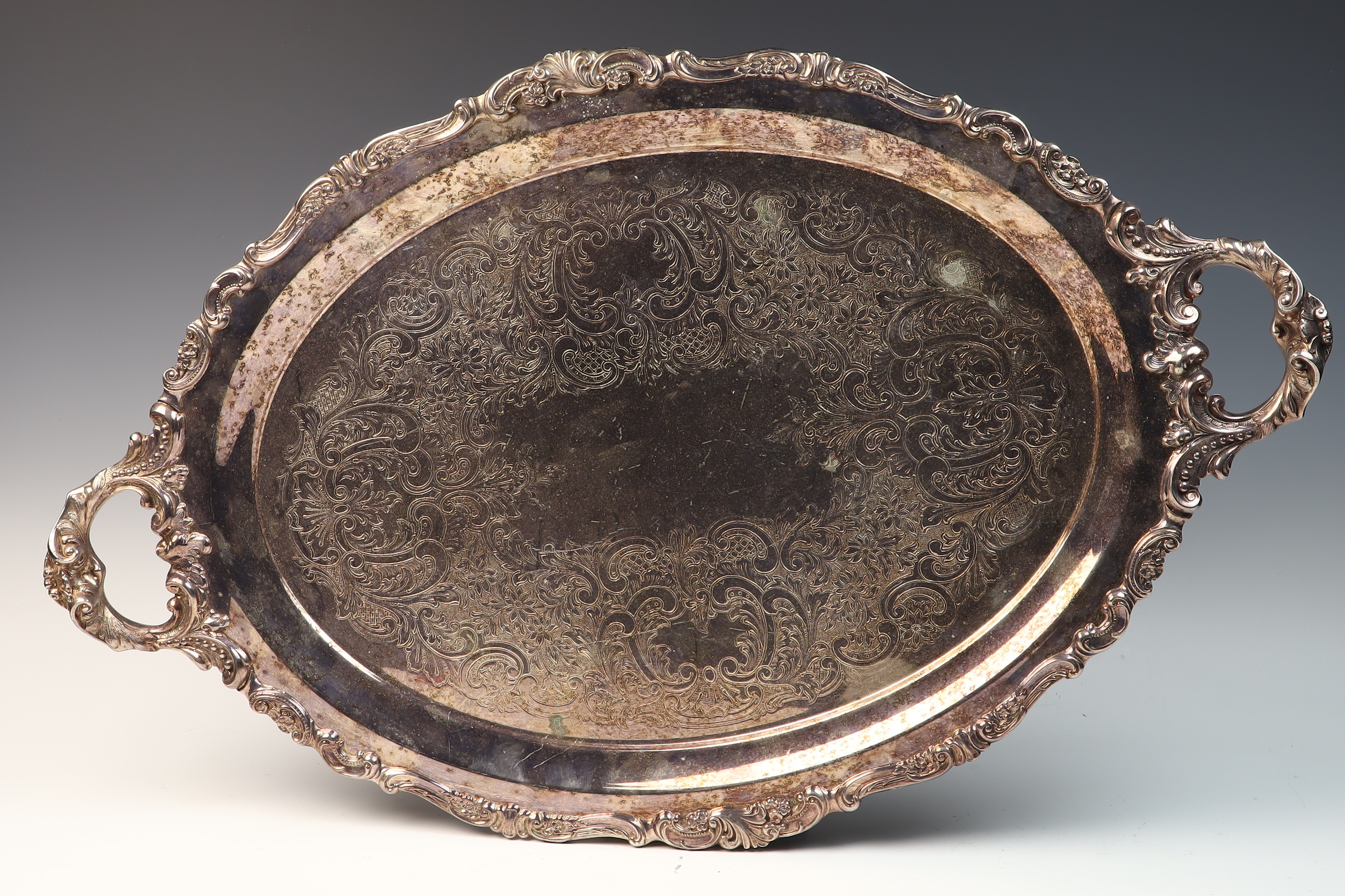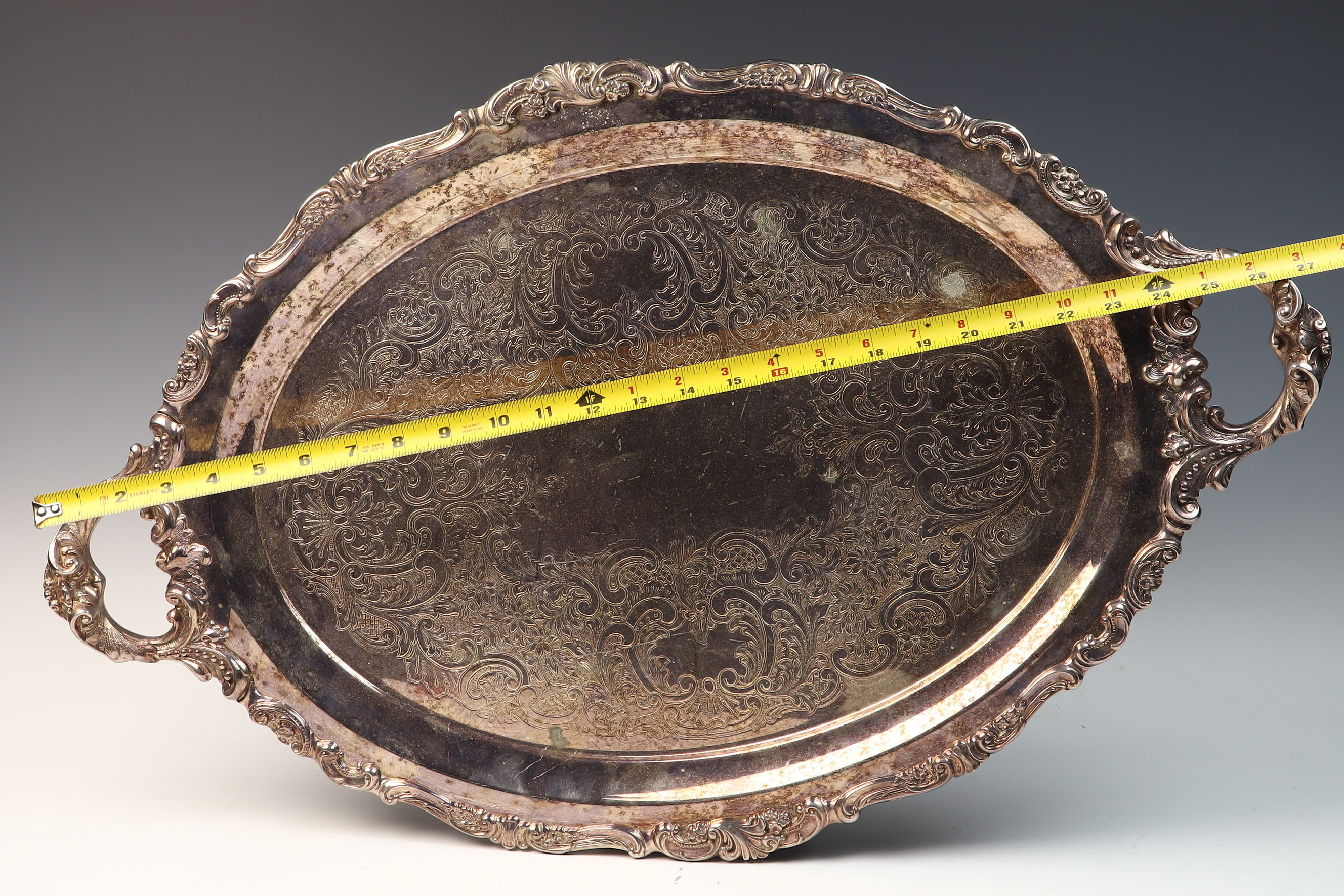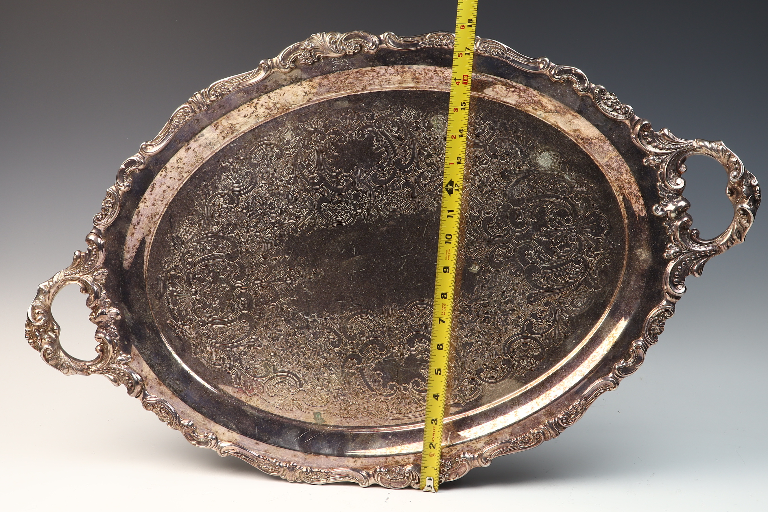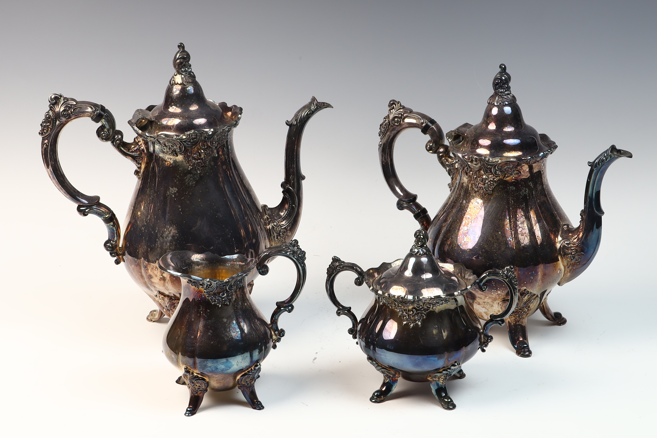 A five-piece silver-plated service presented in an ornate Rococo Revival style, exhibiting visual characteristics similar to the Lancaster Rose pattern by Poole and the Baroque pattern by Wallace. The set includes a coffee pot, a teapot, a covered sugar bowl, a creamer, and a large dual-handled oval tray. Each vessel features a lobed, baluster-form body decorated with embossed and chased foliate scrolls, shell motifs, and floral clusters. The coffee pot, teapot, and sugar bowl are fitted with domed lids surmounted by floral finials. All hollowware pieces are elevated on four scrolled acanthus-leaf feet. The oversized tray features a central field with intricate engraved scrolling foliate patterns, surrounded by a heavy molded rim with shell and scroll accents and two integral handles. No manufacturer marks or hallmarks are visible in the provided photographs.Tray length: 27 inchesTray width: 16.5 inches Coffee pot height: 11 inchesTeapot height: 9.5 inches Sugar bowl height: 7 inches Creamer height: 6 inchesTotal weight: 17 lbs 13.0 oz (8,080 grams).