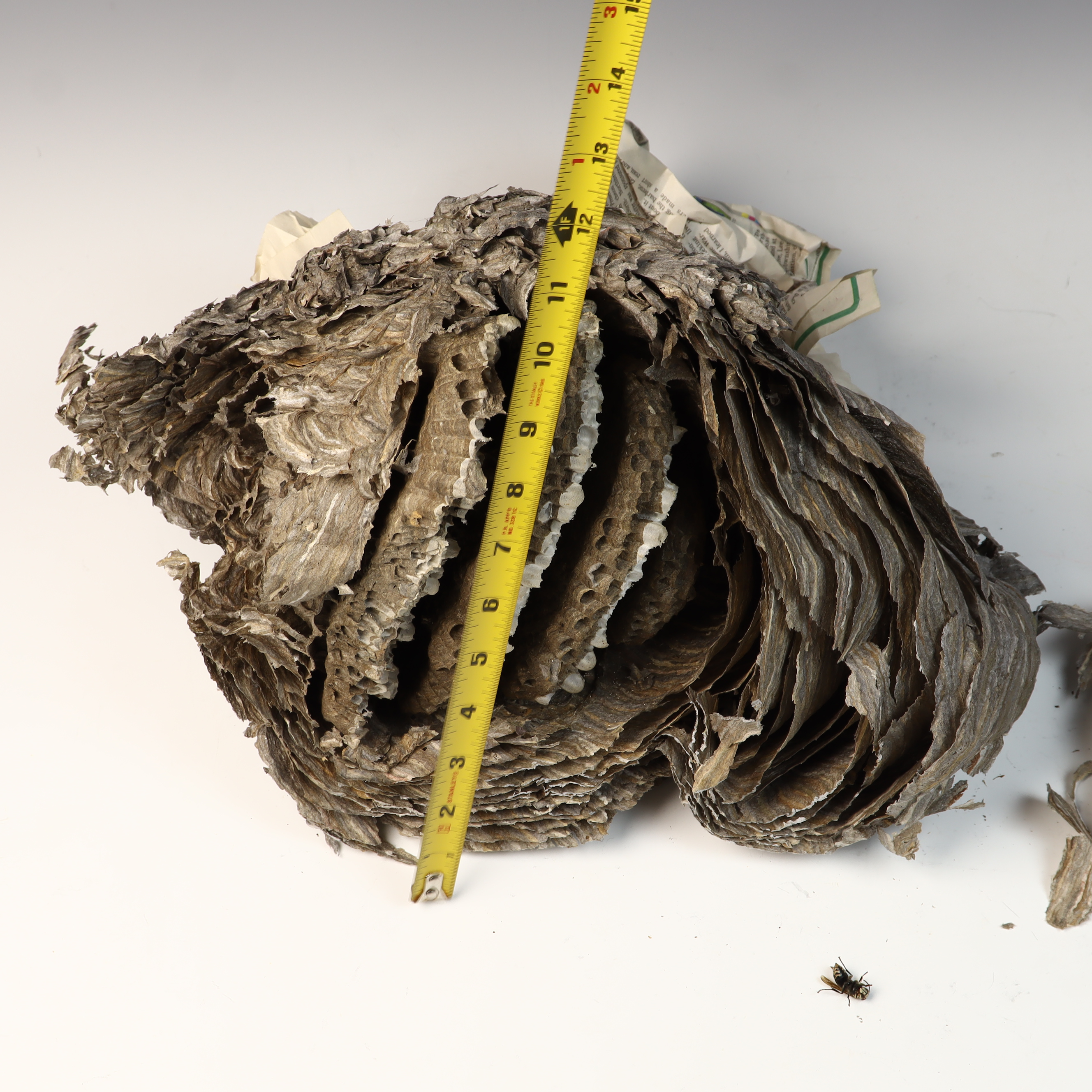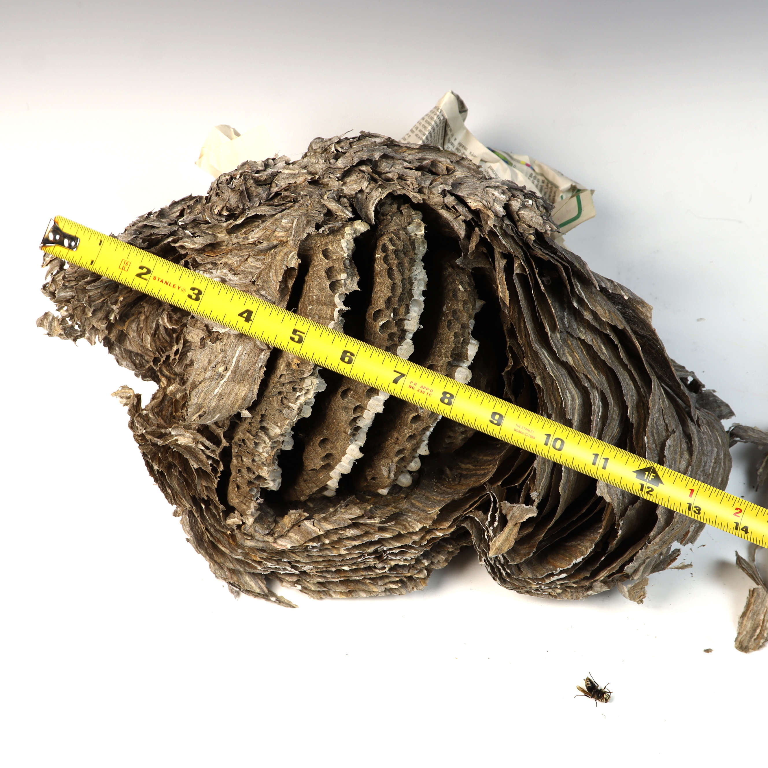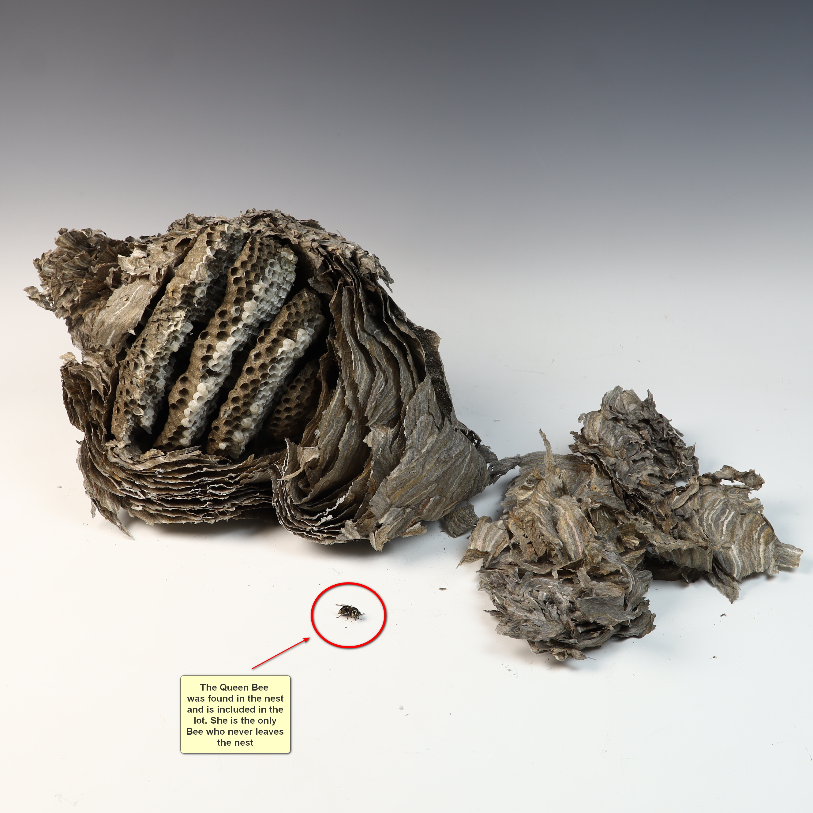 This natural history specimen consists of a substantial aerial nest created by a colony of bald-faced hornets (Dolichovespula maculata) also known as a type of yellowjacket wasp, accompanied by a preserved insect specimen found as the only remainder once the nest was vacated in the winter presumed to be the Queen. The nest is constructed from multiple layers of grey, papery material made from masticated wood fibers. The specimen has been partially opened, revealing the internal structural organization of several (4) horizontal tiers or hives containing hexagonal brood cells. The accompanying insect specimen exhibits the characteristic black and ivory-white markings of the species. A small printed label is included with the lot that identifies the insect as a queen which was the only biologic specimen found inside the hive this past winter however these same species were observed entering and exiting this nest when in season, physical characteristics and nest architecture are consistent with the bald-faced hornet, a member of the yellowjacket wasp family native to North America. Nest: 14 inches (length) x 12 inches (width)Insect: 1 inch (length).