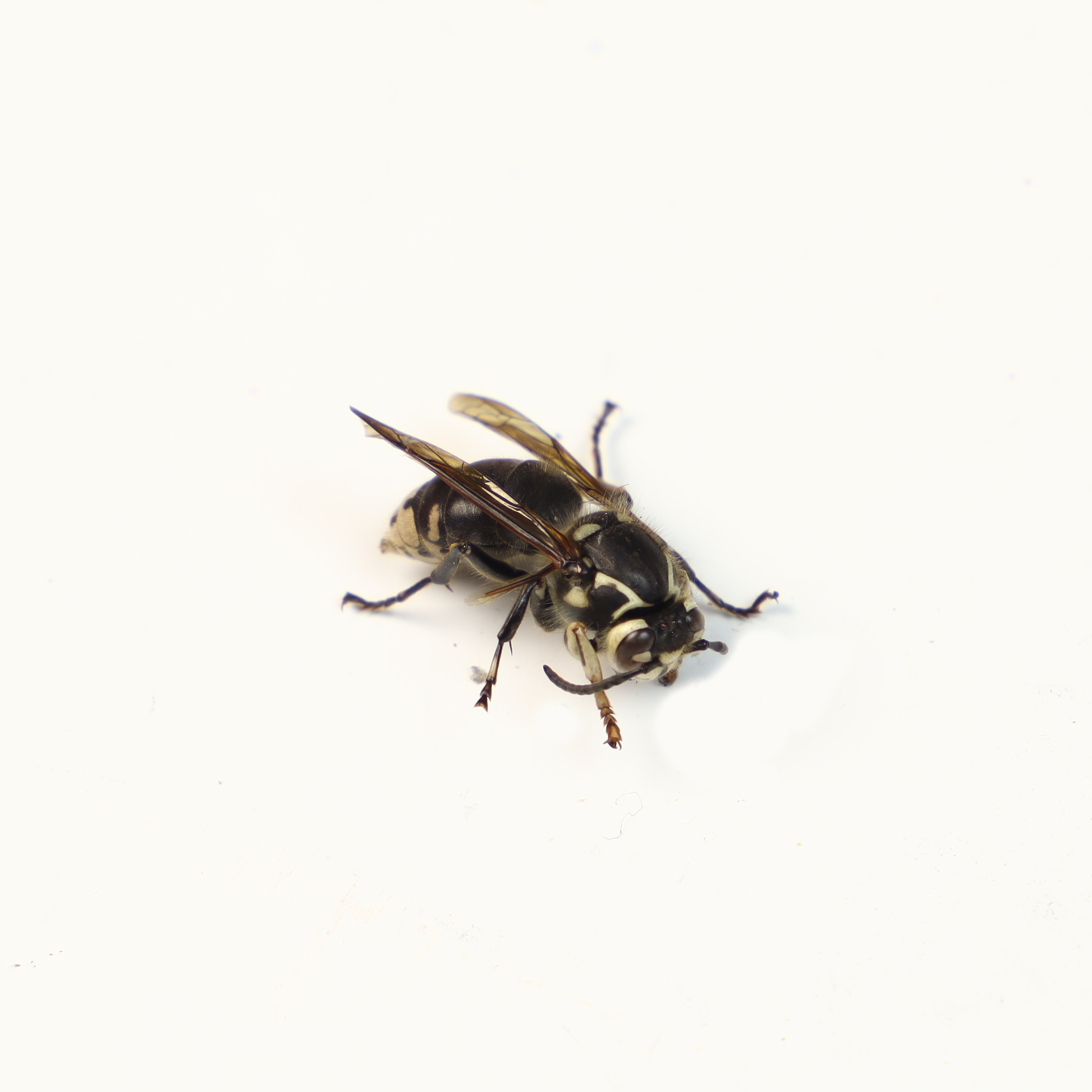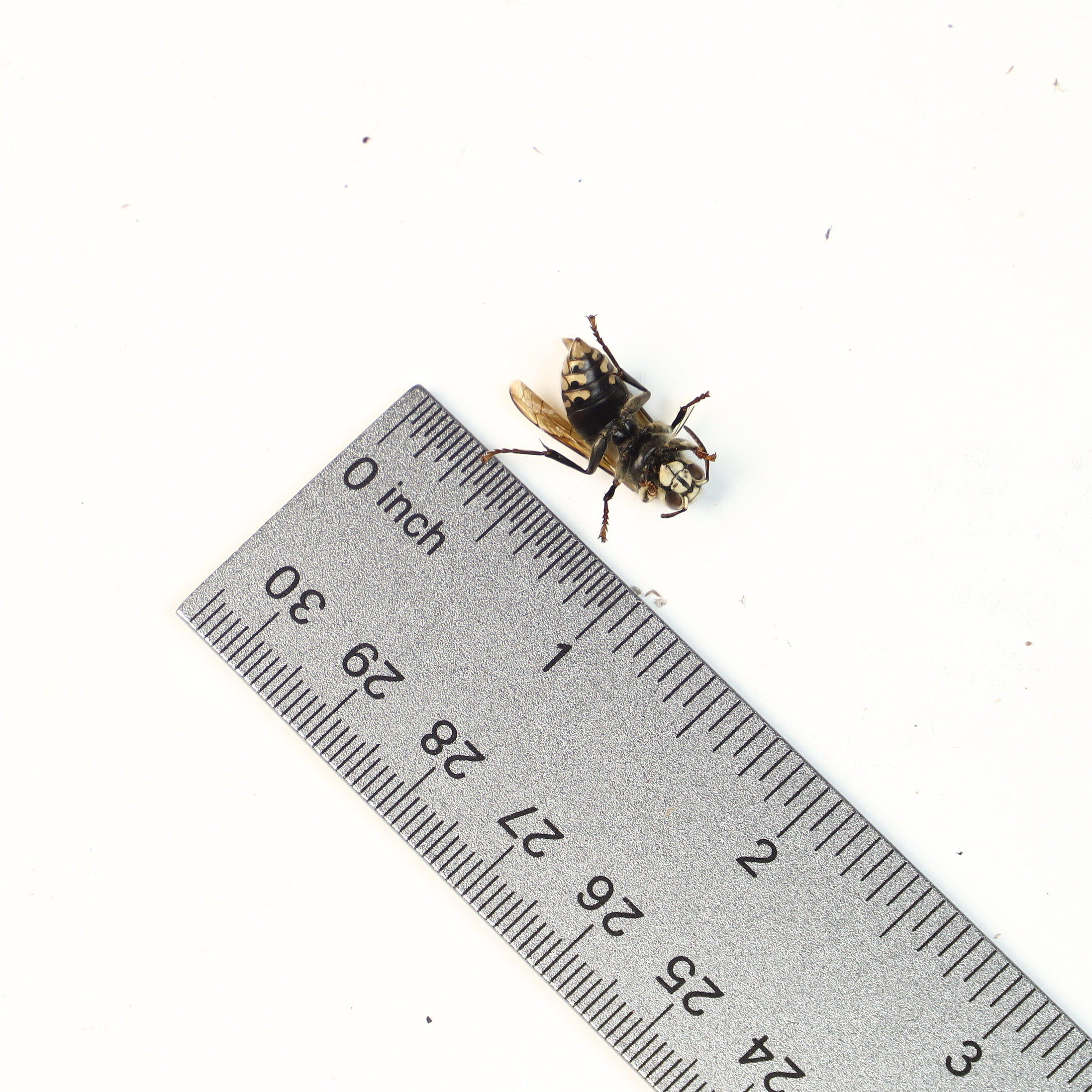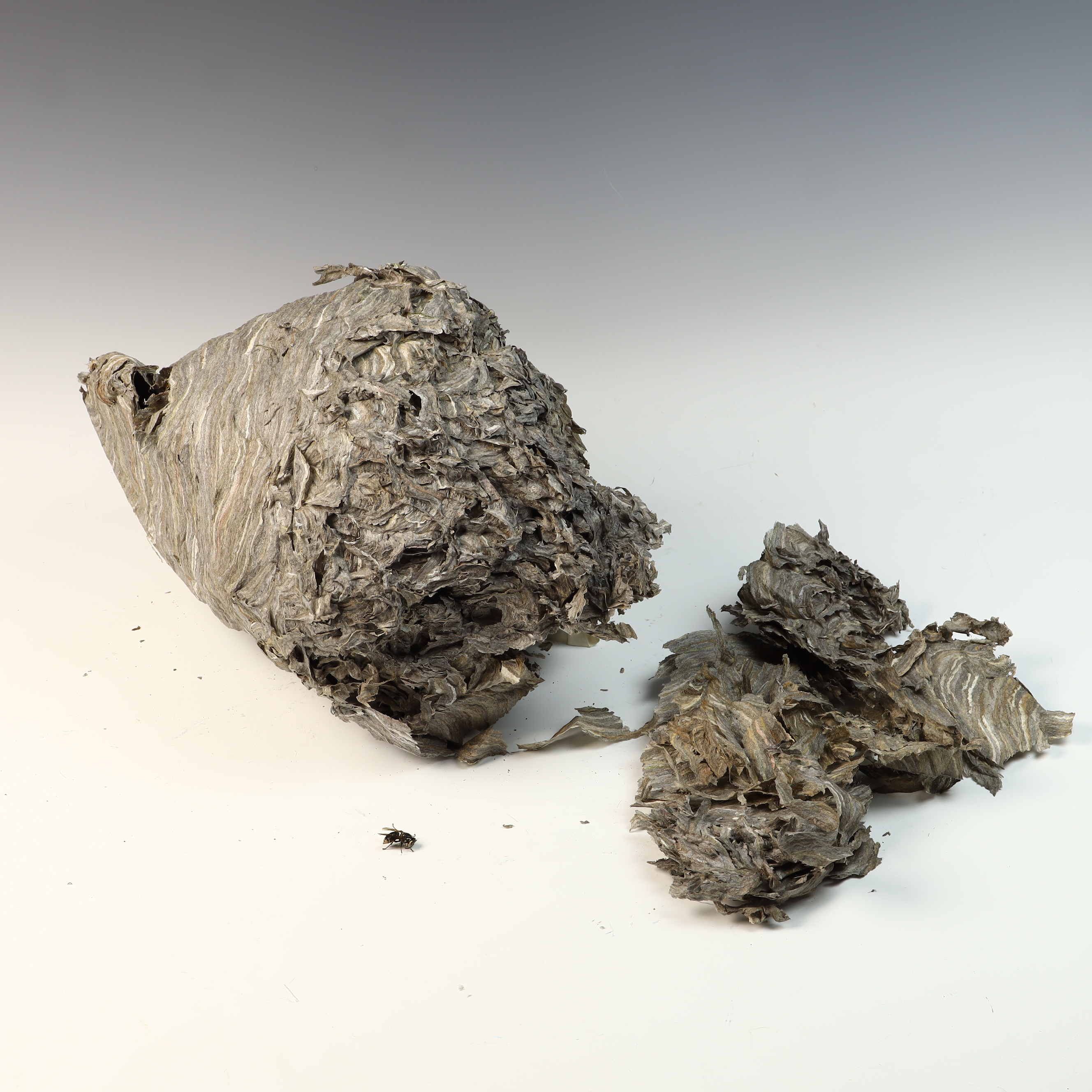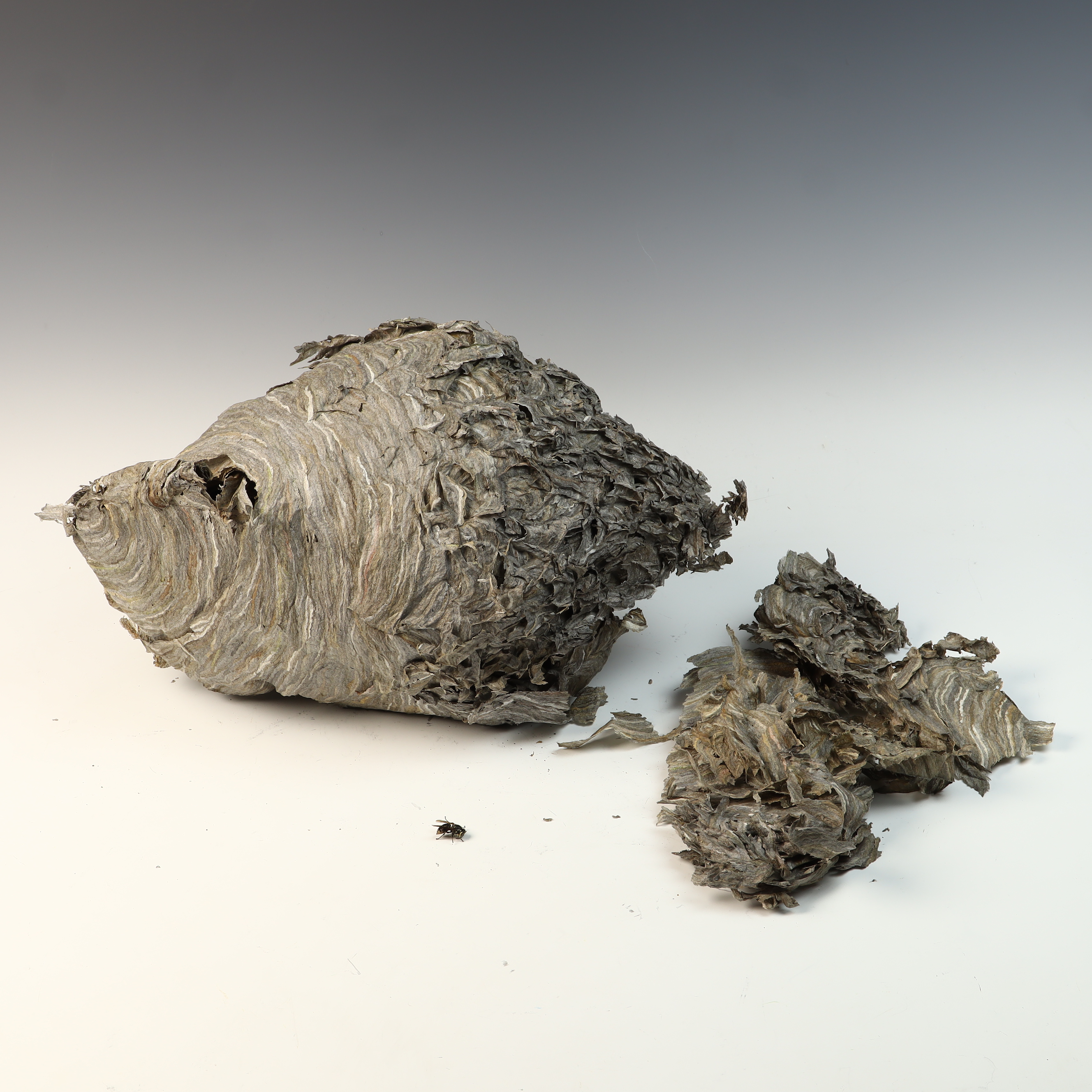 This natural history specimen consists of a substantial aerial nest created by a colony of bald-faced hornets (Dolichovespula maculata) also known as a type of yellowjacket wasp, accompanied by a preserved insect specimen found as the only remainder once the nest was vacated in the winter presumed to be the Queen. The nest is constructed from multiple layers of grey, papery material made from masticated wood fibers. The specimen has been partially opened, revealing the internal structural organization of several (4) horizontal tiers or hives containing hexagonal brood cells. The accompanying insect specimen exhibits the characteristic black and ivory-white markings of the species. A small printed label is included with the lot that identifies the insect as a queen which was the only biologic specimen found inside the hive this past winter however these same species were observed entering and exiting this nest when in season, physical characteristics and nest architecture are consistent with the bald-faced hornet, a member of the yellowjacket wasp family native to North America. Nest: 14 inches (length) x 12 inches (width)Insect: 1 inch (length).