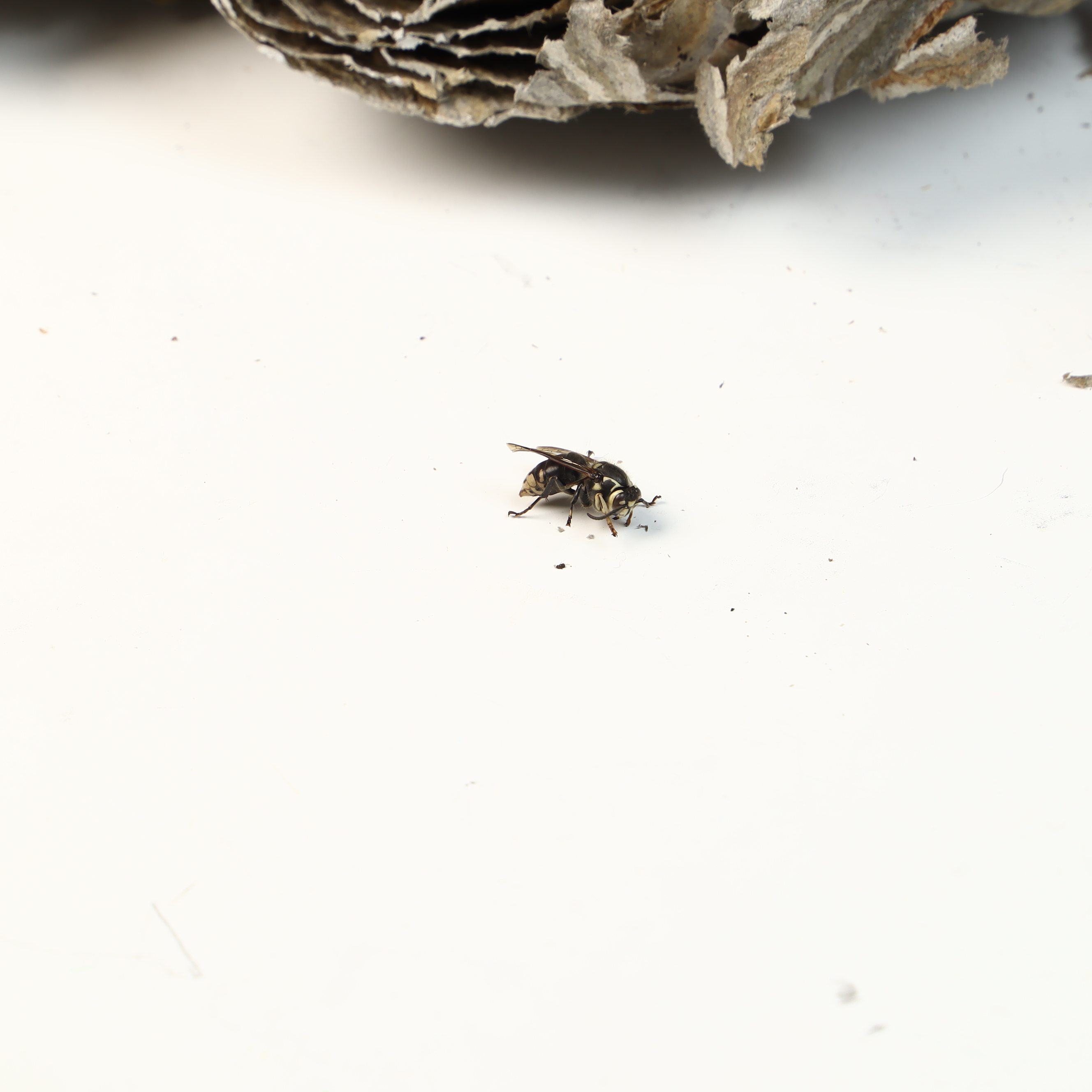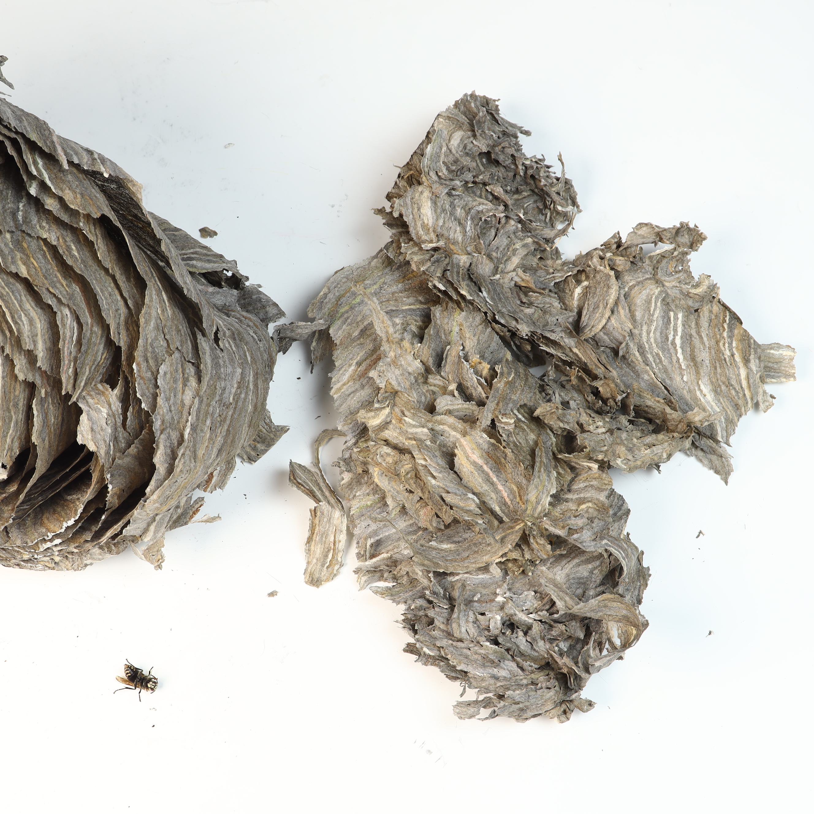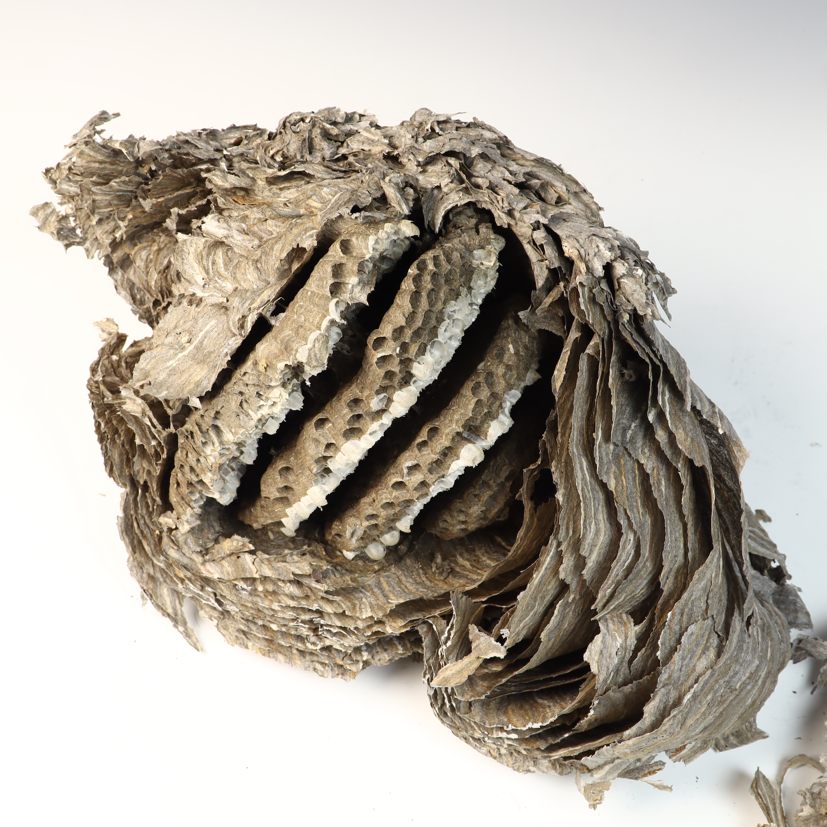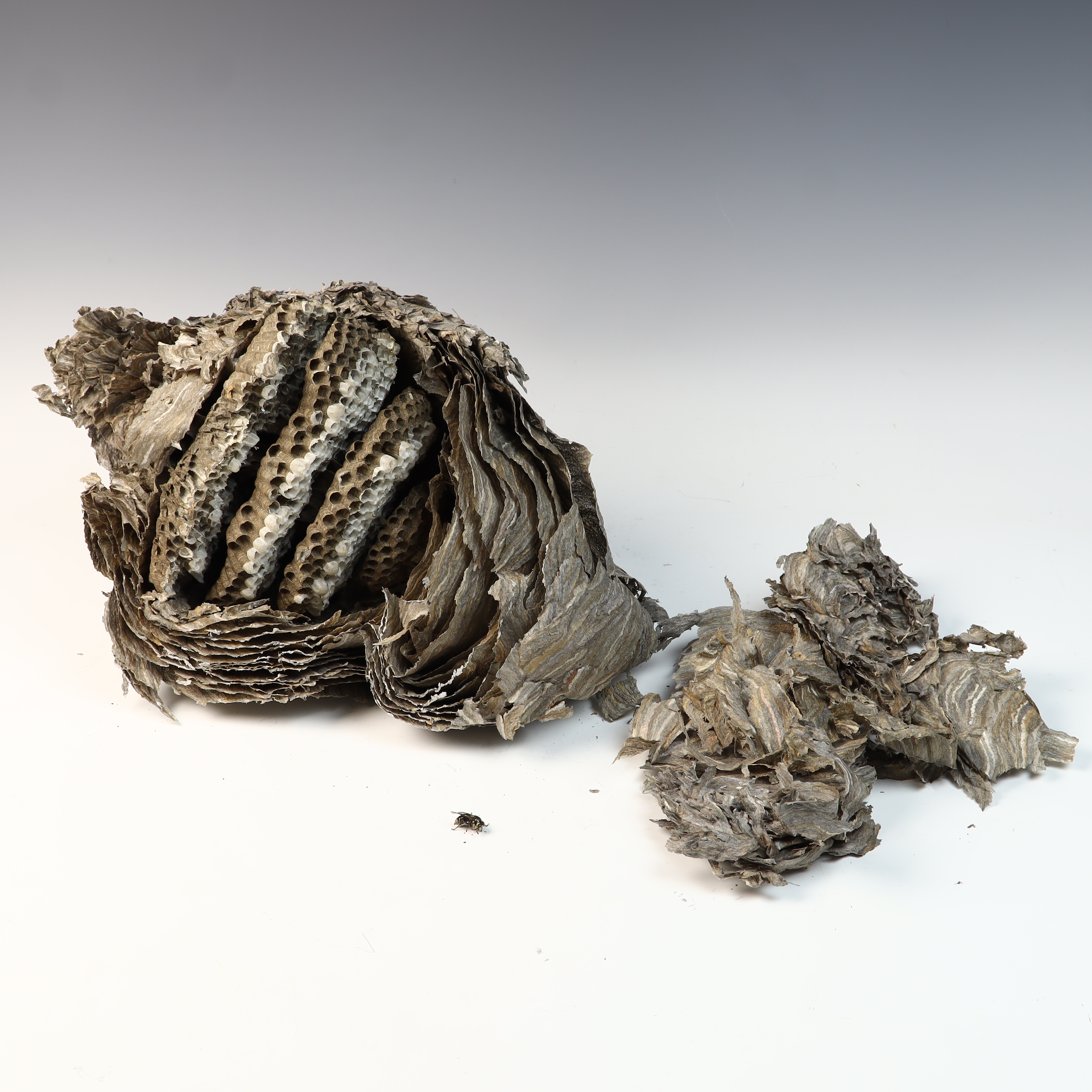 The nest is in a natural, partially fragmented state. The outer envelope is detached in several areas, exposing the internal tiers. Several loose fragments of the outer paper envelope are included with the lot. The insect specimen appears intact.