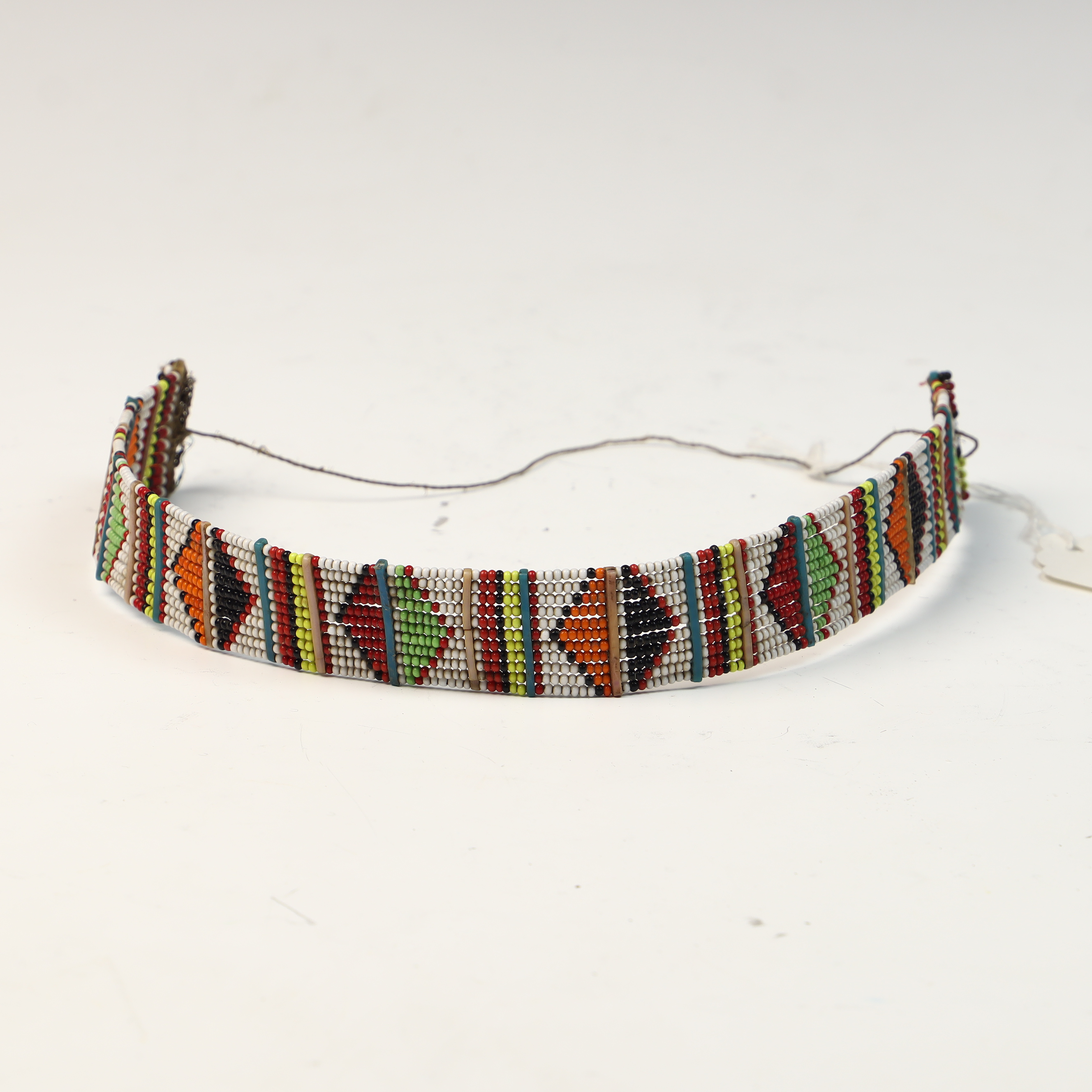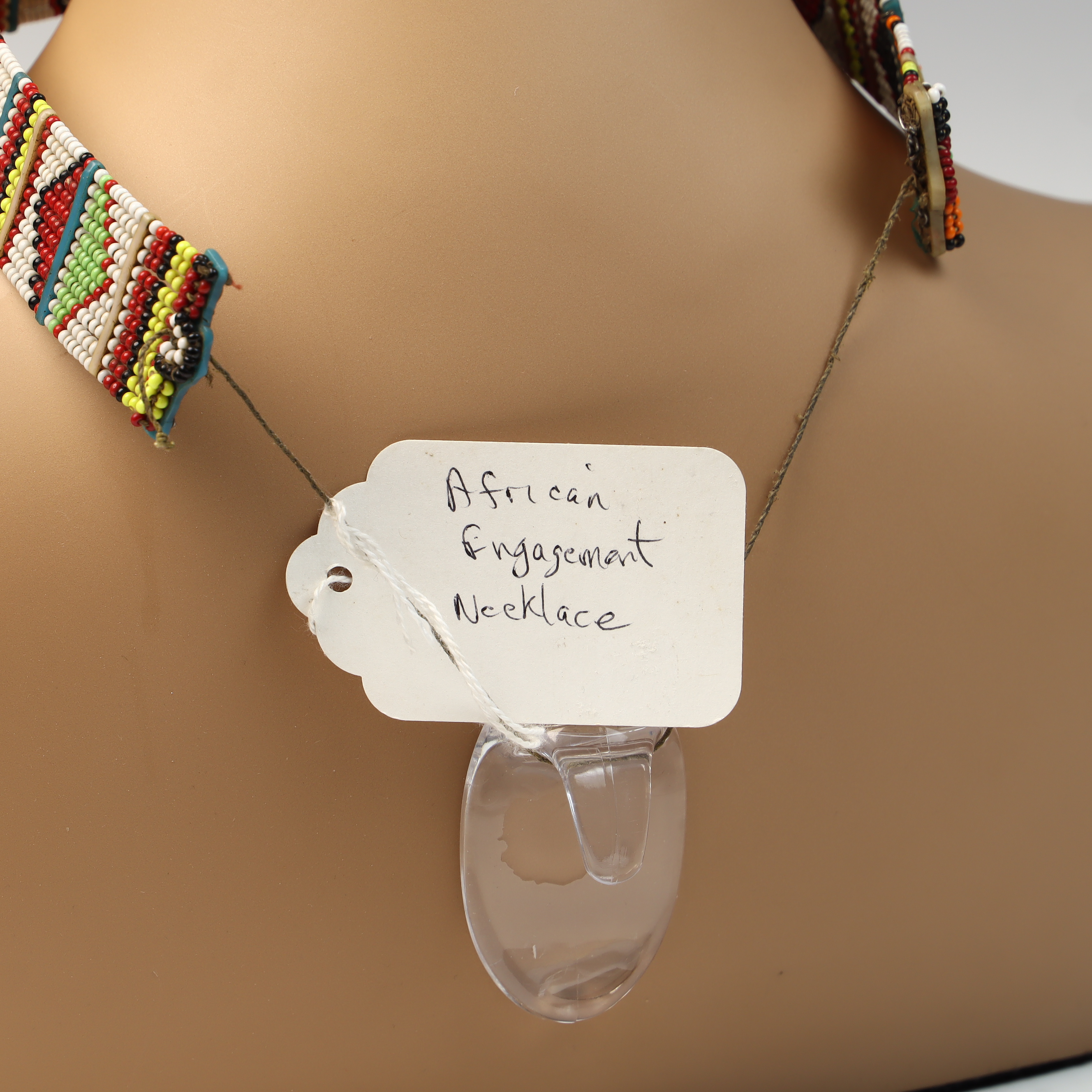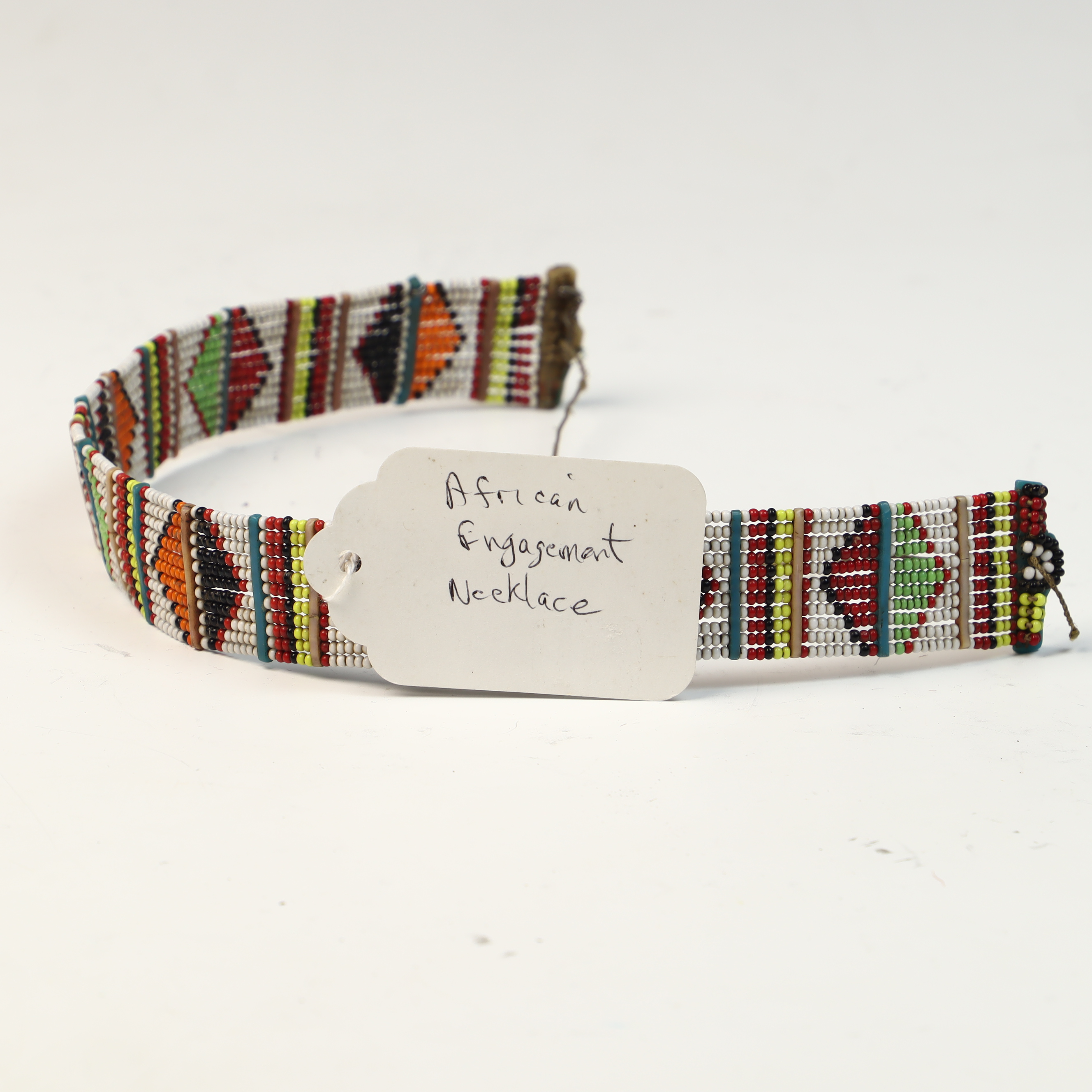 This is an intricate beaded choker-style collar necklace, attributed to the Maasai culture of East Africa or the Zulu Culture of Southern Africa based on its traditional geometric patterns and construction. The necklace is composed of woven glass seed beads. The decorative motifs include nested chevrons in red and green, diamond shapes in orange and black, and vertical stripes in yellow, lime green, and red. The band is structured with vertical spacer bars, and features light blue beaded vertical dividers between the primary pattern blocks. The piece is secured at the back with thin, dark thread ties. It is accompanied by a handwritten paper tag that reads African Engagement Necklace.Length: Choker length, approximately 12 to 14 inches including ties.