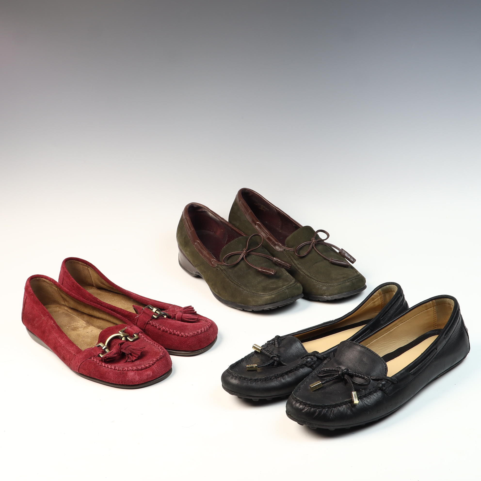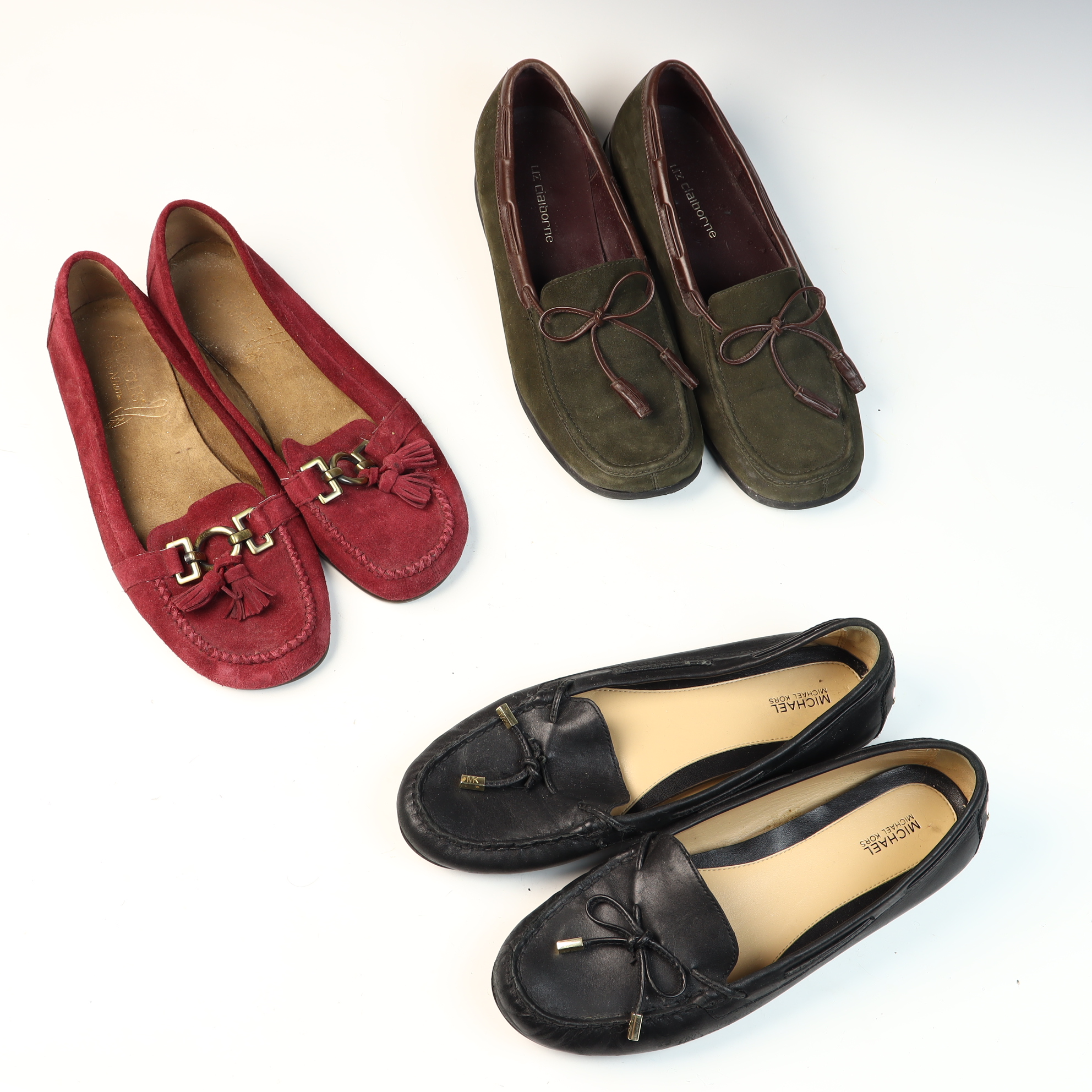 This lot consists of three pairs of women’s loafers, all in size US 9M. The first pair is Michael Michael Kors black pebbled leather driving moccasins. These shoes feature a thin leather bow detail with gold-tone MK branded aglets and a traditional rubber nubby driving outsole. The second pair is by Aerosoles, constructed with burgundy suede uppers. They feature gold-tone horsebit hardware with suede tassels, a moccasin-style stitched toe, and a low wedge synthetic outsole. The third pair is by Liz Claiborne, featuring olive green suede uppers with a leather bow-tie and tassel detail on a textured rubber outsole. All three pairs are marked with their respective brand names on the insoles and outsoles.