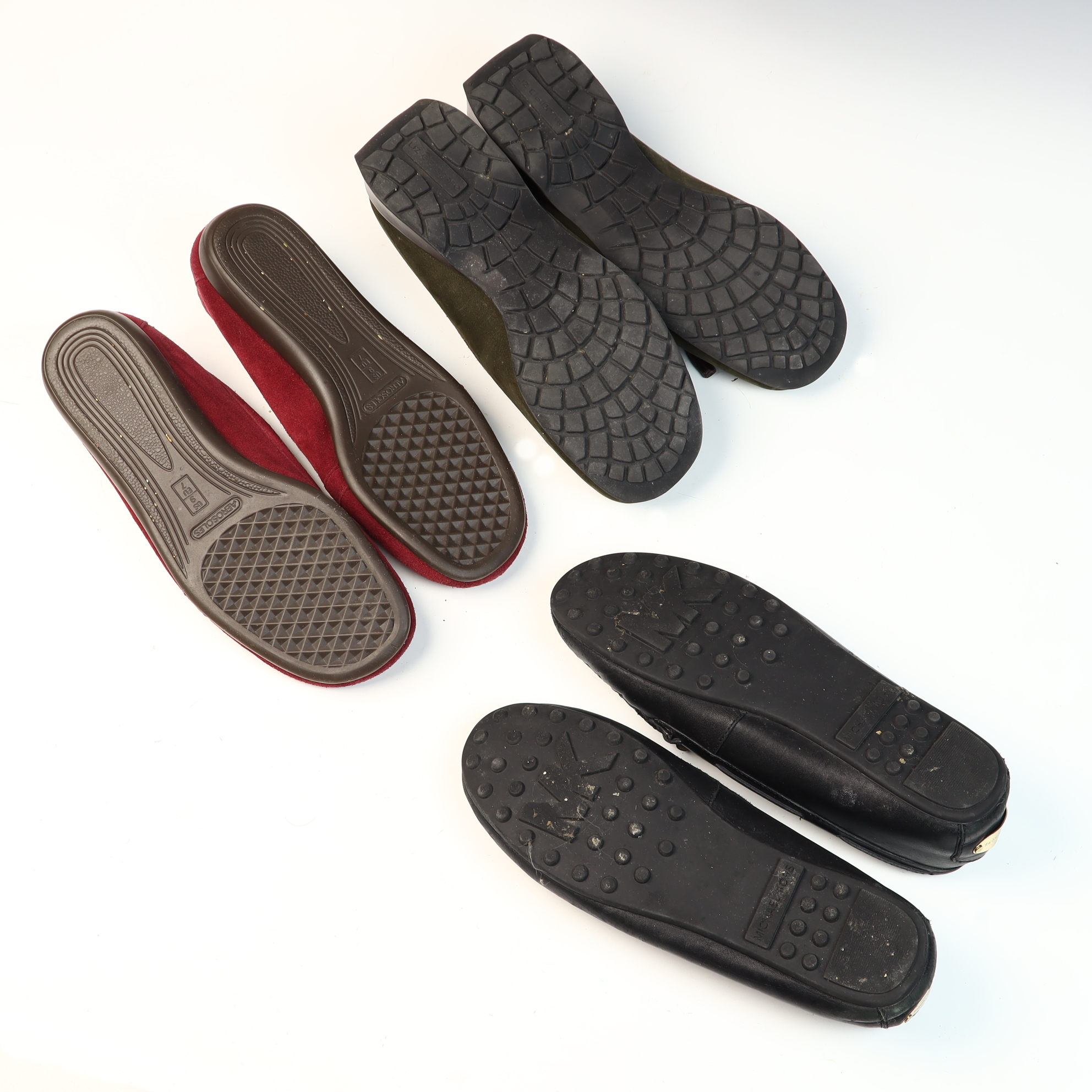 All items are in pre-owned condition. The Michael Kors leather uppers show minor creasing, while the rubber outsoles show moderate wear and smoothing to the nubs at the heel and toe. The Aerosoles suede uppers show light general wear, and the outsoles show moderate wear to the tread. The Liz Claiborne suede uppers show rubbing and light wear, with moderate wear to the outsoles, particularly at the heels. No original packaging or dust bags are included.