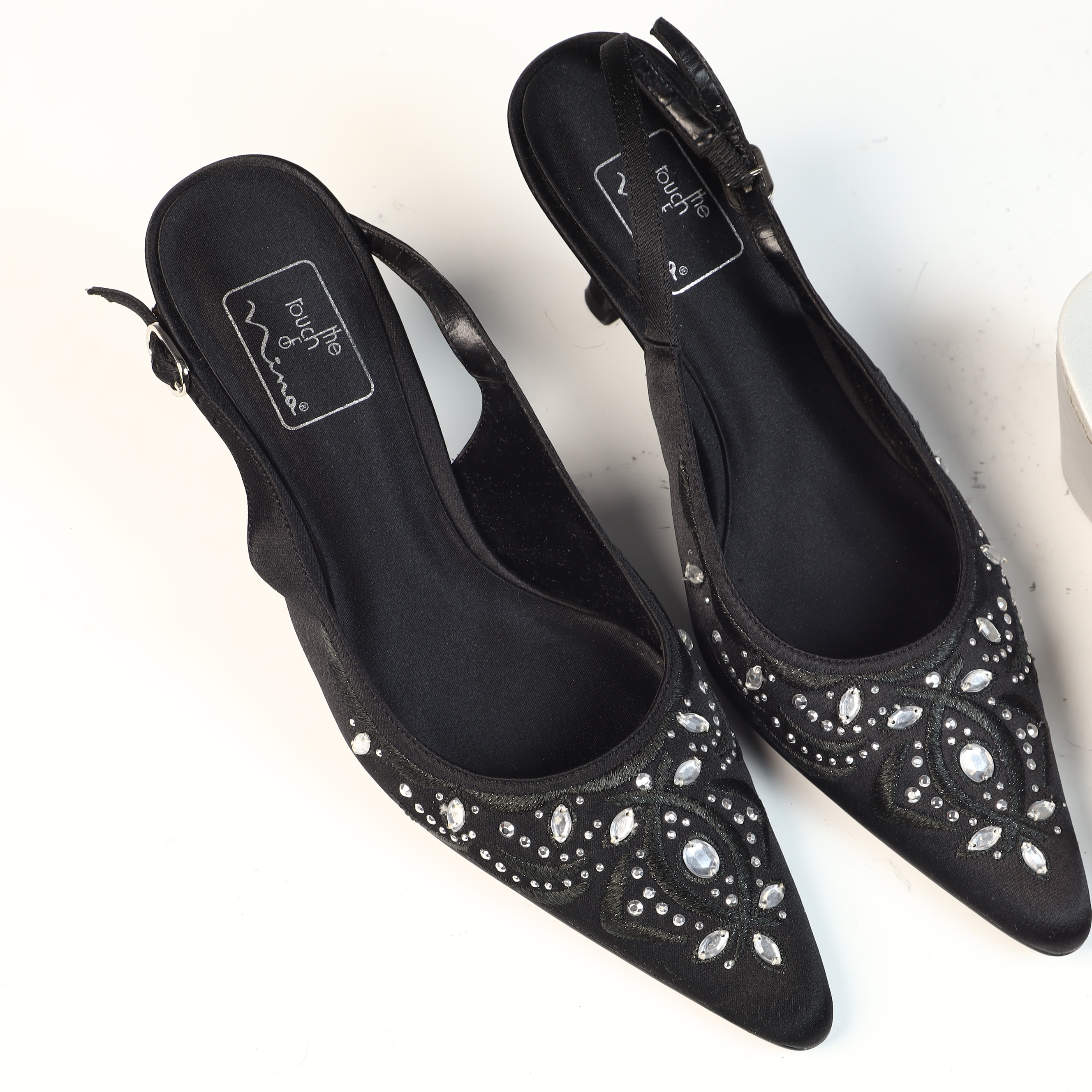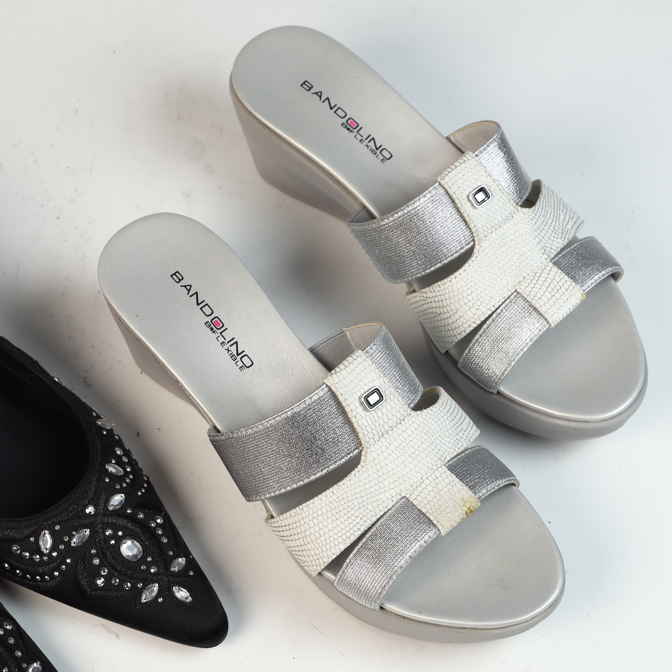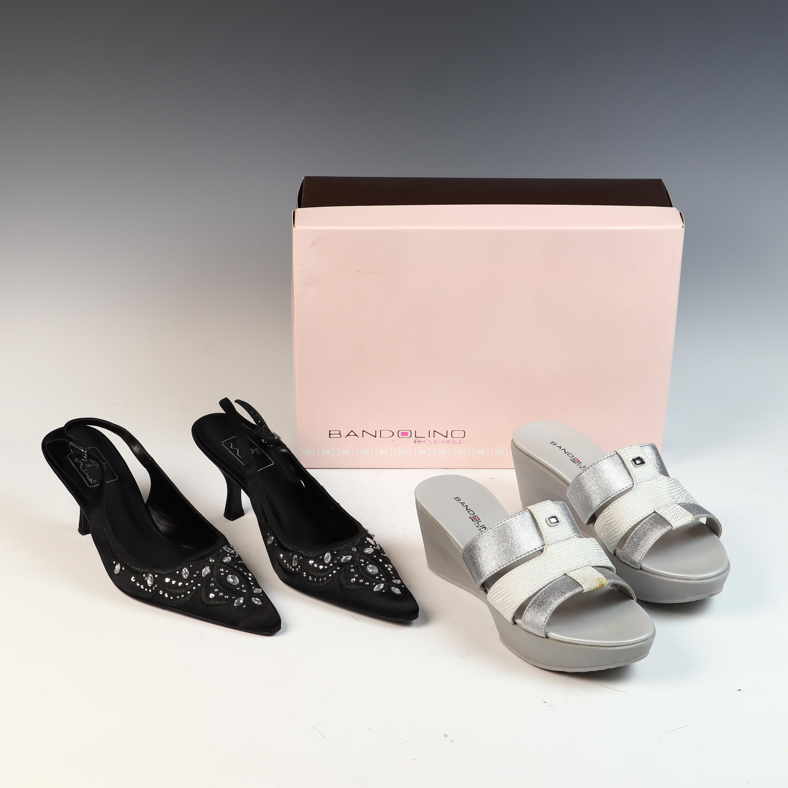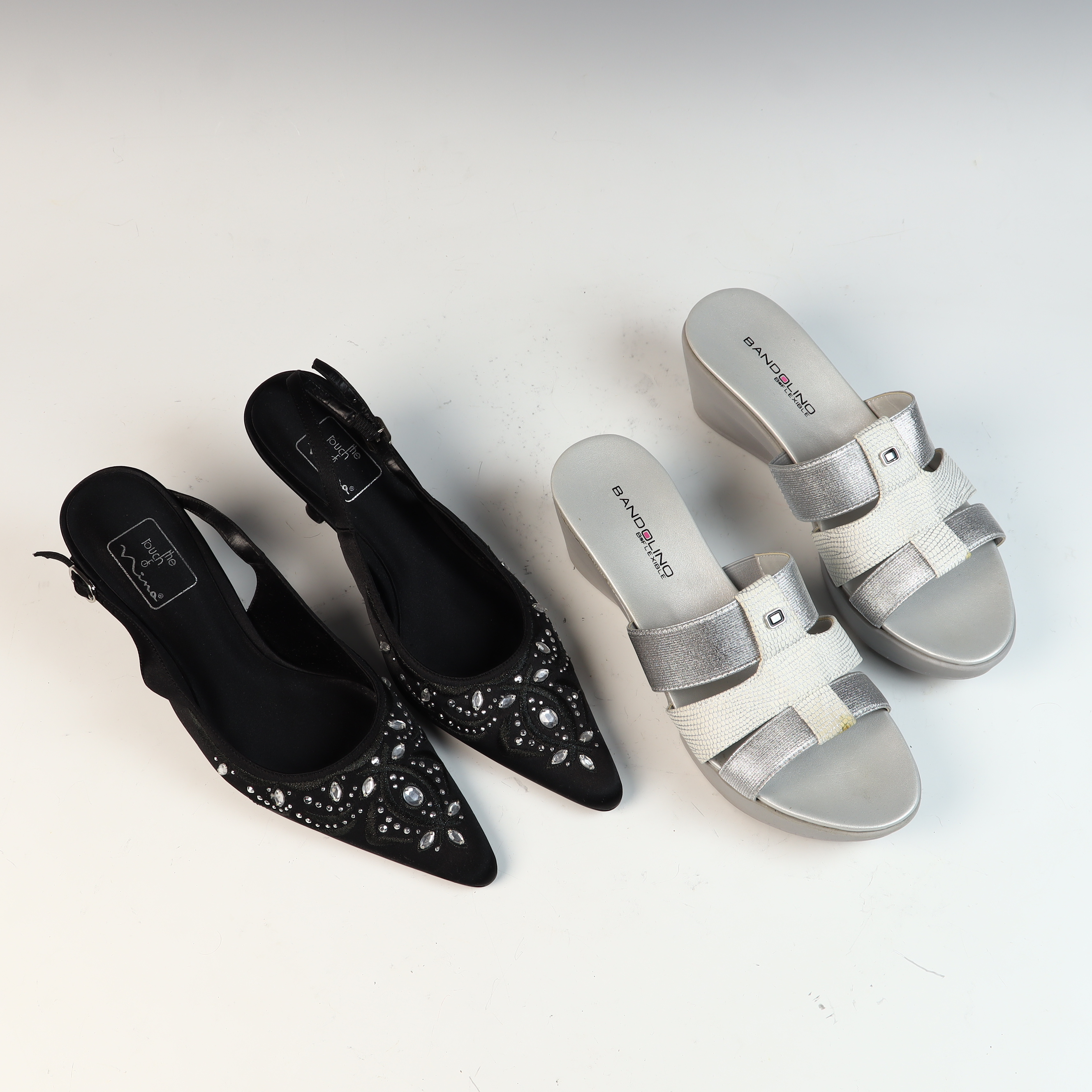 This lot contains two pairs of women’s shoes and one original brand box. The first pair consists of evening slingback heels by The Touch of Nina. These shoes feature black fabric uppers with tonal embroidery and are embellished with clear faceted rhinestones in round and marquise cuts. The style includes a pointed toe, a buckle-closure slingback strap, and a kitten-style heel. The insoles are marked the touch of Nina. The second pair consists of Bandolino B-Flexible wedge slide sandals. These sandals feature a multi-strap synthetic upper with a mix of metallic silver and white embossed faux-leather textures. The center strap is adorned with a small square metallic decorative element. The insoles are marked BANDOLINO B-FLEXIBLE. The lot includes one original Bandolino shoe box with a light pink base and dark brown lid. Size information is not visible in the provided images.