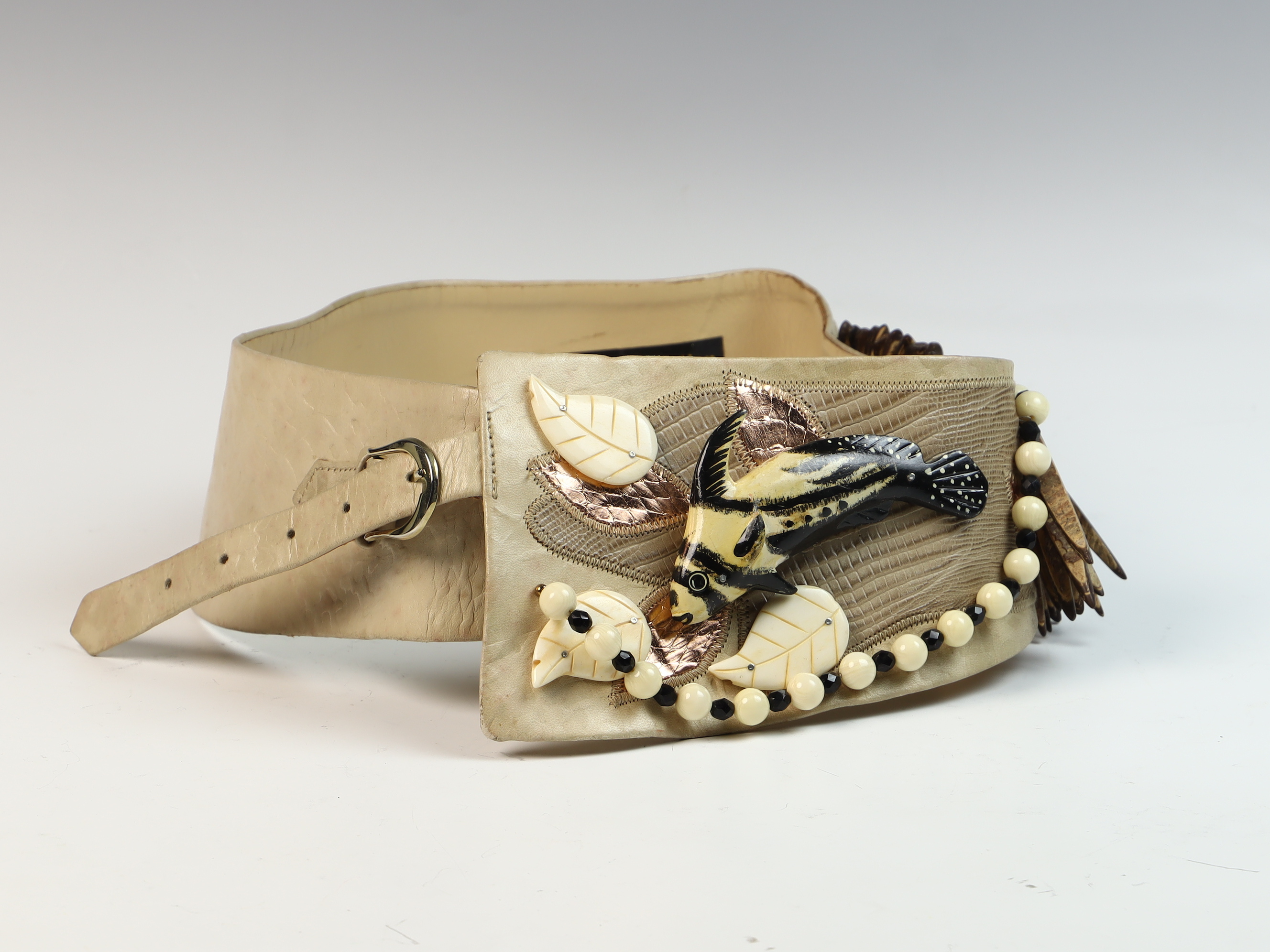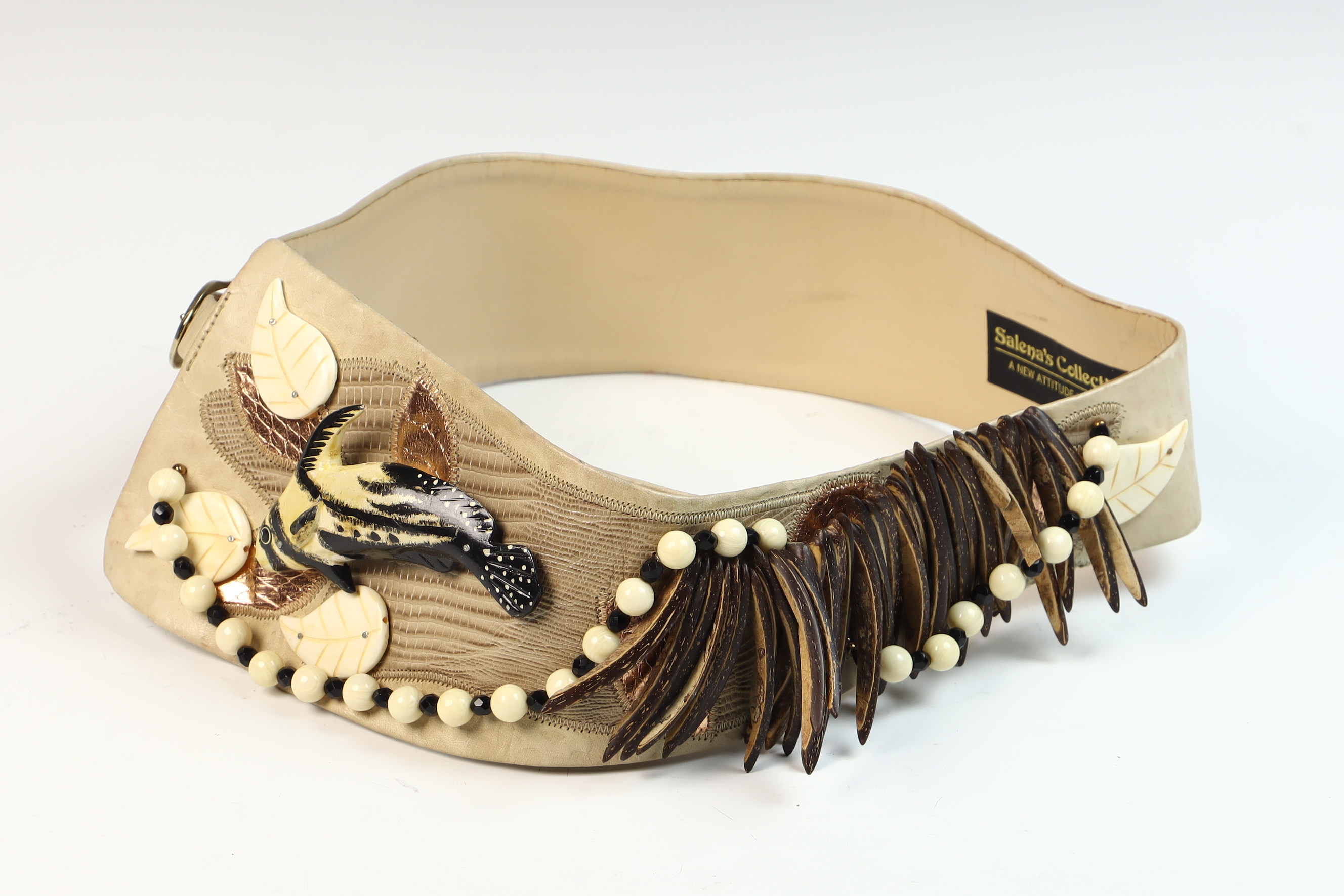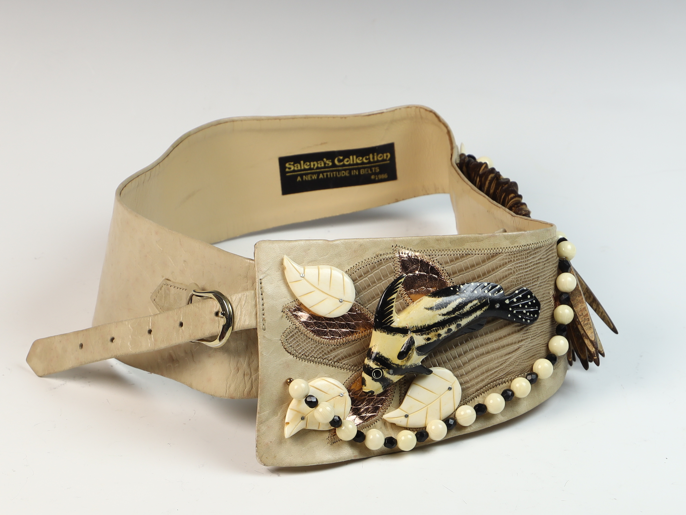 A vintage designer statement belt manufactured by Salena’s Collection. The item is constructed from cream-colored leather with a reptile-embossed texture and a smooth leather lining. The front section is heavily embellished with a three-dimensional sculptural scene featuring a carved resin fish, cream resin leaves, and metallic bronze-finished leaves. A fringe of dark brown polished wooden or seed pod dangles is attached to the side, accented by a strand of alternating cream and black beads that runs along the lower edge of the decorative panel. The interior features a black woven label that reads Salena’s Collection, A NEW ATTITUDE IN BELTS, ©1986. The fastening mechanism consists of a narrow leather strap and a silver-toned metal buckle.Size: Approximately 70 cm.