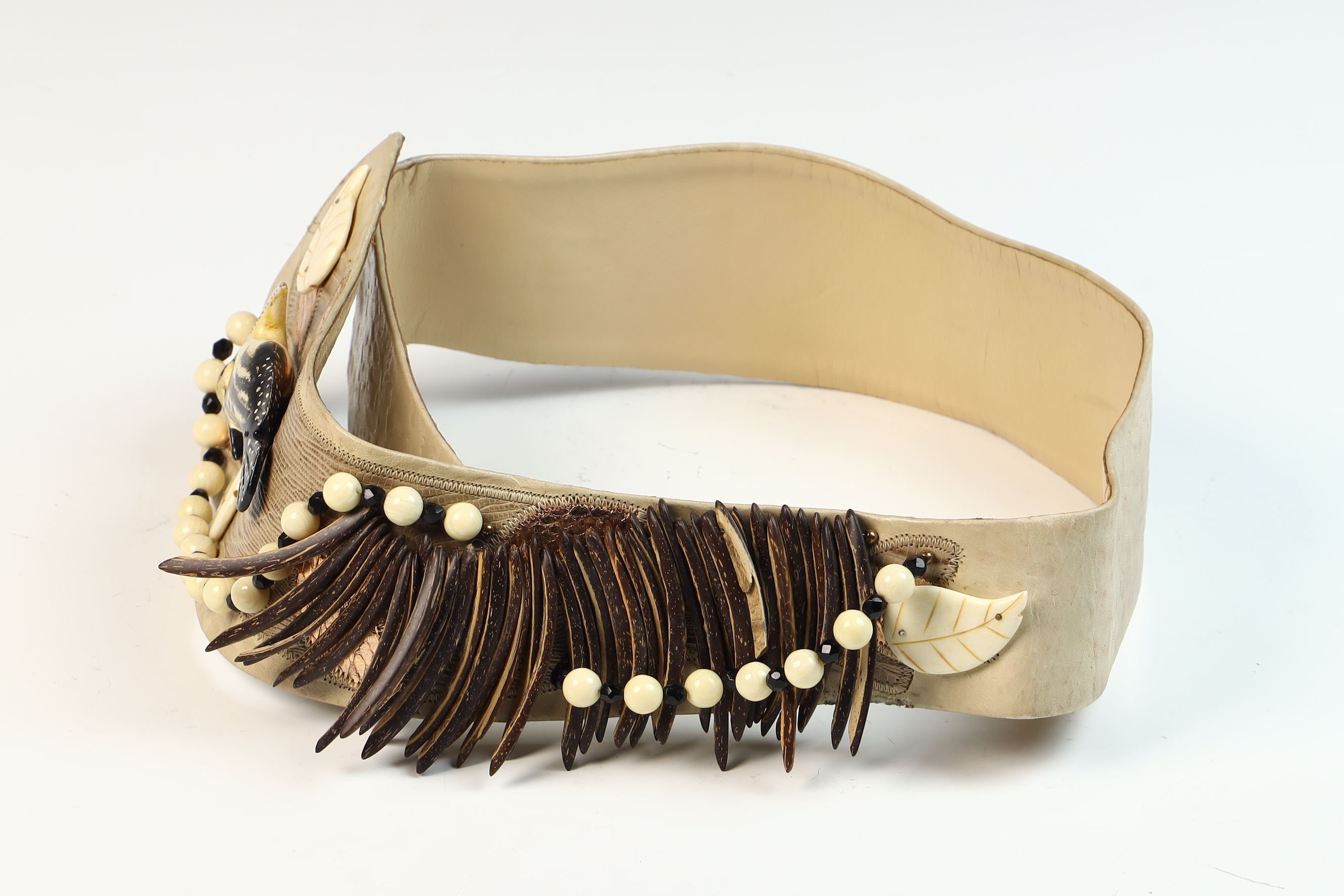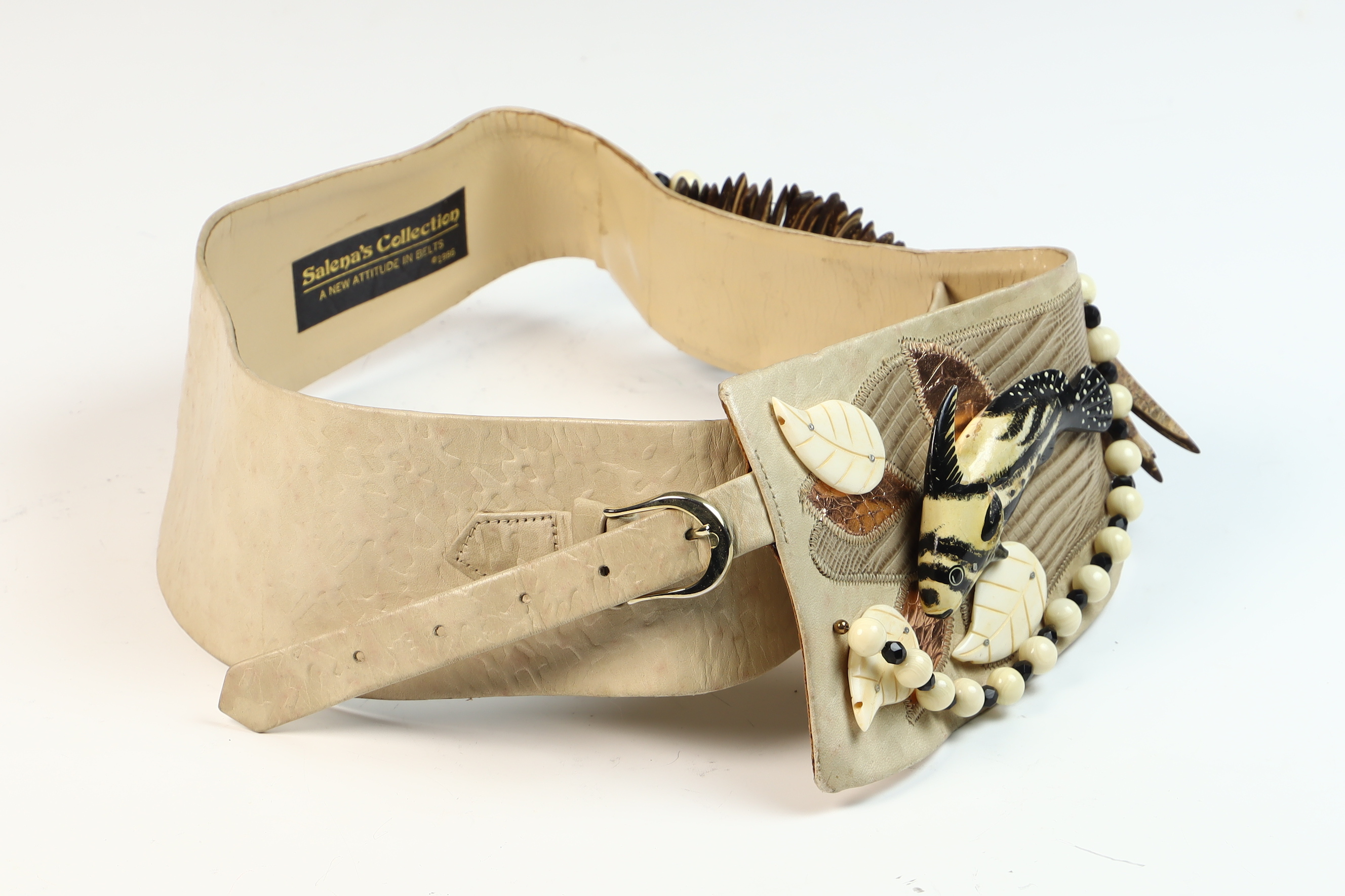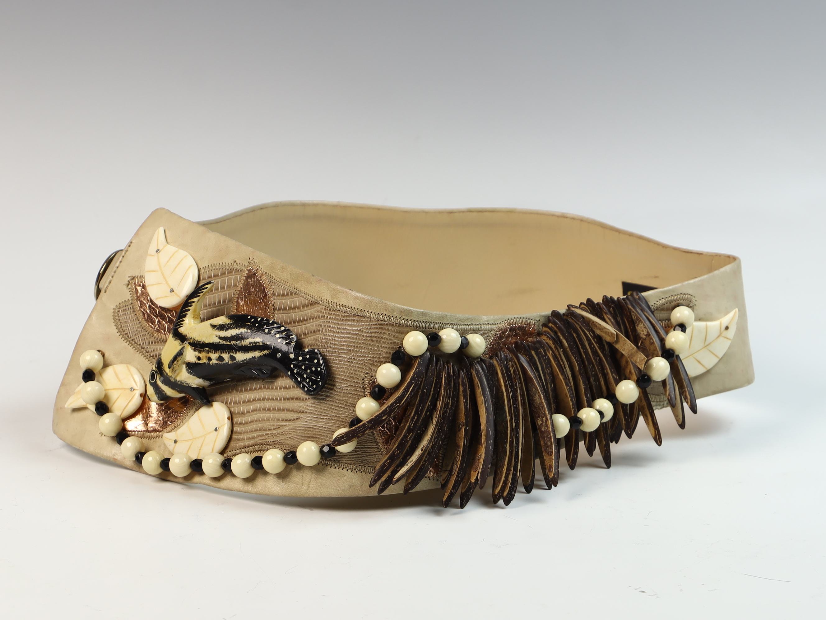 A vintage designer statement belt manufactured by Salena’s Collection. The item is constructed from cream-colored leather with a reptile-embossed texture and a smooth leather lining. The front section is heavily embellished with a three-dimensional sculptural scene featuring a carved resin fish, cream resin leaves, and metallic bronze-finished leaves. A fringe of dark brown polished wooden or seed pod dangles is attached to the side, accented by a strand of alternating cream and black beads that runs along the lower edge of the decorative panel. The interior features a black woven label that reads Salena’s Collection, A NEW ATTITUDE IN BELTS, ©1986. The fastening mechanism consists of a narrow leather strap and a silver-toned metal buckle.Size: Approximately 70 cm.