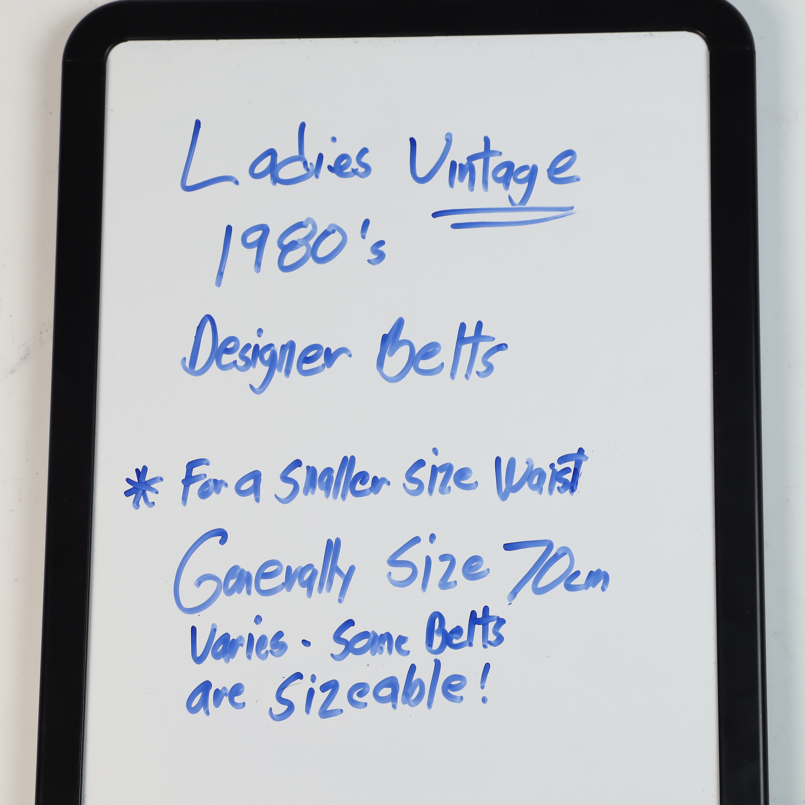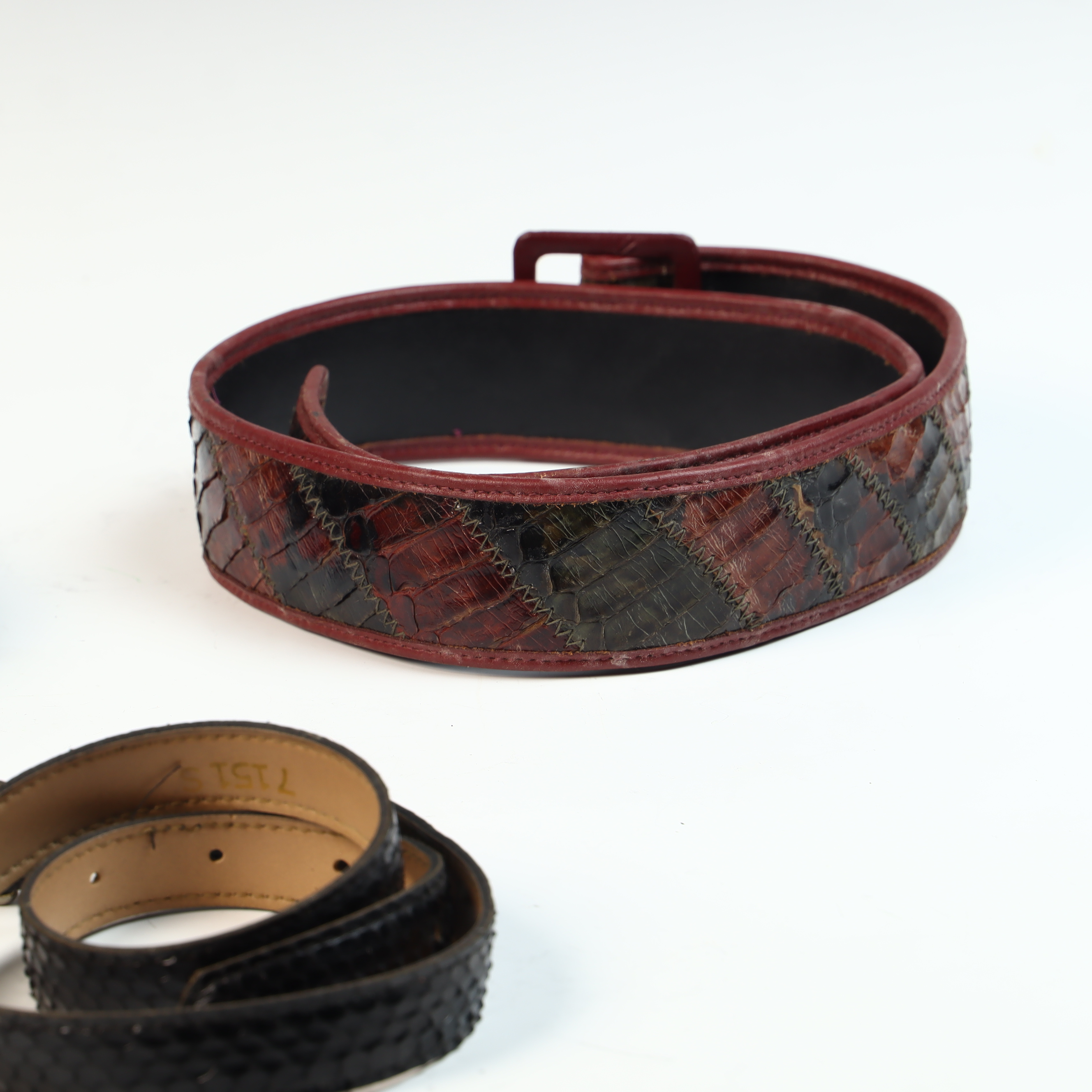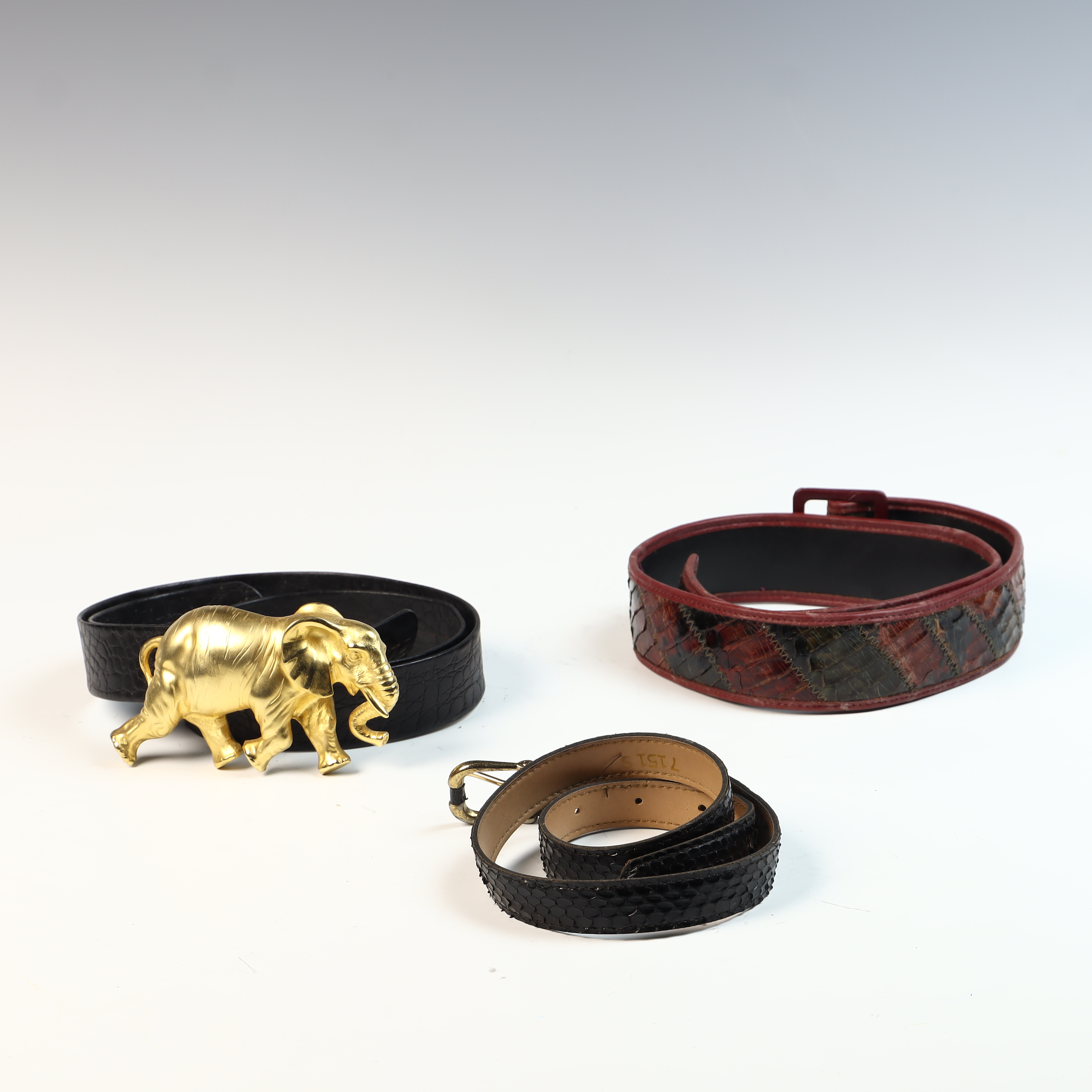 This lot includes three vintage ladies designer belts dating from the 1980s. The collection features a variety of materials including embossed leather and genuine snakeskin, generally sized for a smaller 70cm waist.The first belt is crafted from black leather with an embossed crocodile pattern. It is fitted with a large, sculpted gold-tone metal buckle in the form of a walking elephant. The reverse of the buckle bears the cast mark DRO followed by a copyright symbol.The second belt is a wide waist belt featuring a diagonal patchwork design made from genuine snakeskin in shades of burgundy, forest green, and dark brown. The black interior is stamped in gold with GENUINE SNAKESKIN and the number 8328.The third belt is a slim black snakeskin accessory with a visible scale texture and a gold-tone metal pin buckle. The tan leather interior is stamped with 7151 S and TST L.Size: 70cm.