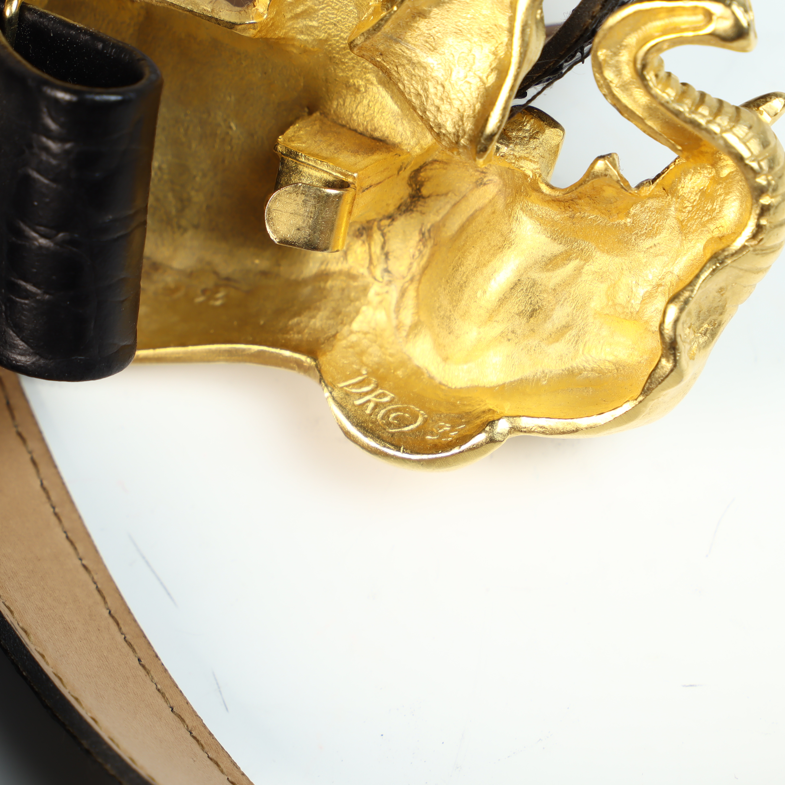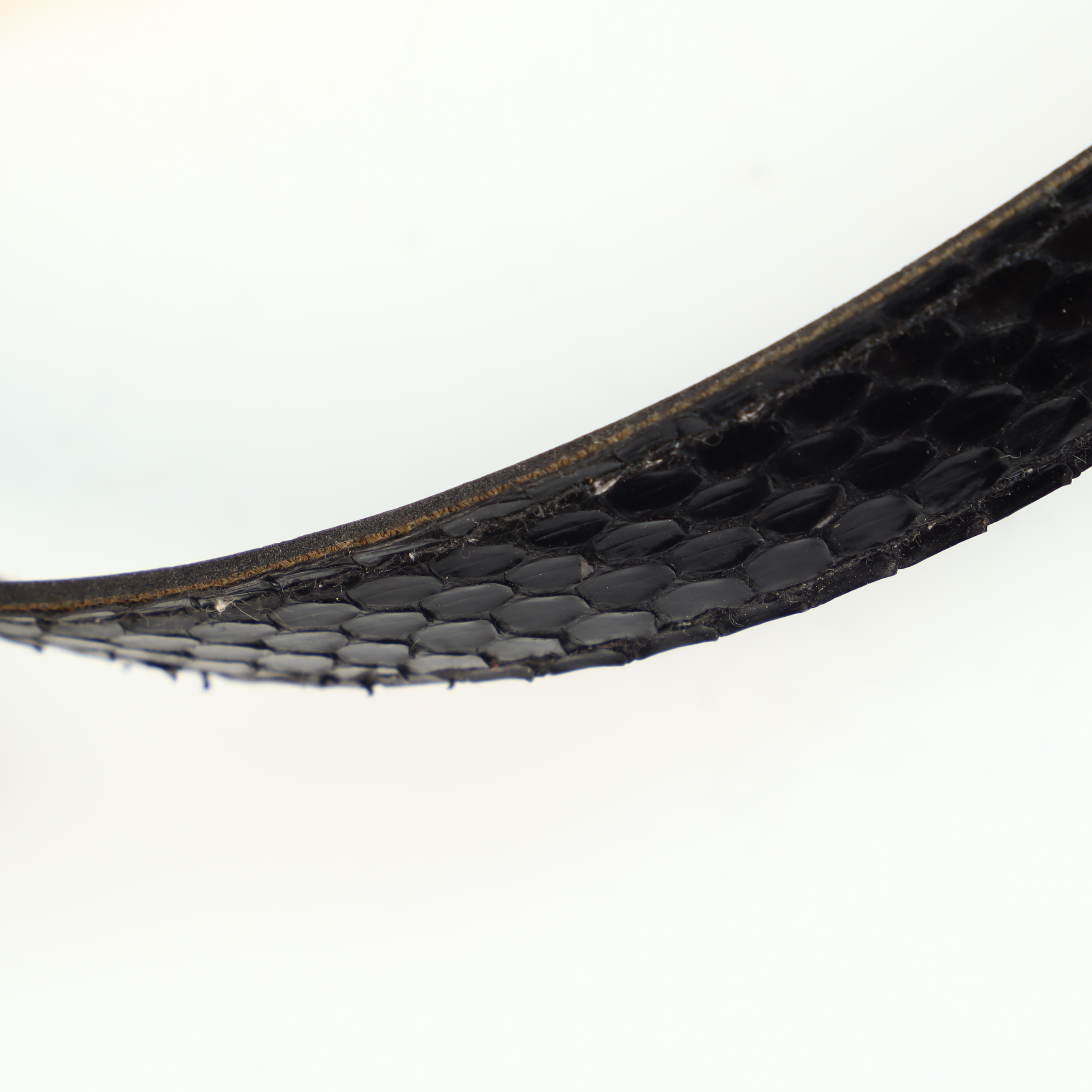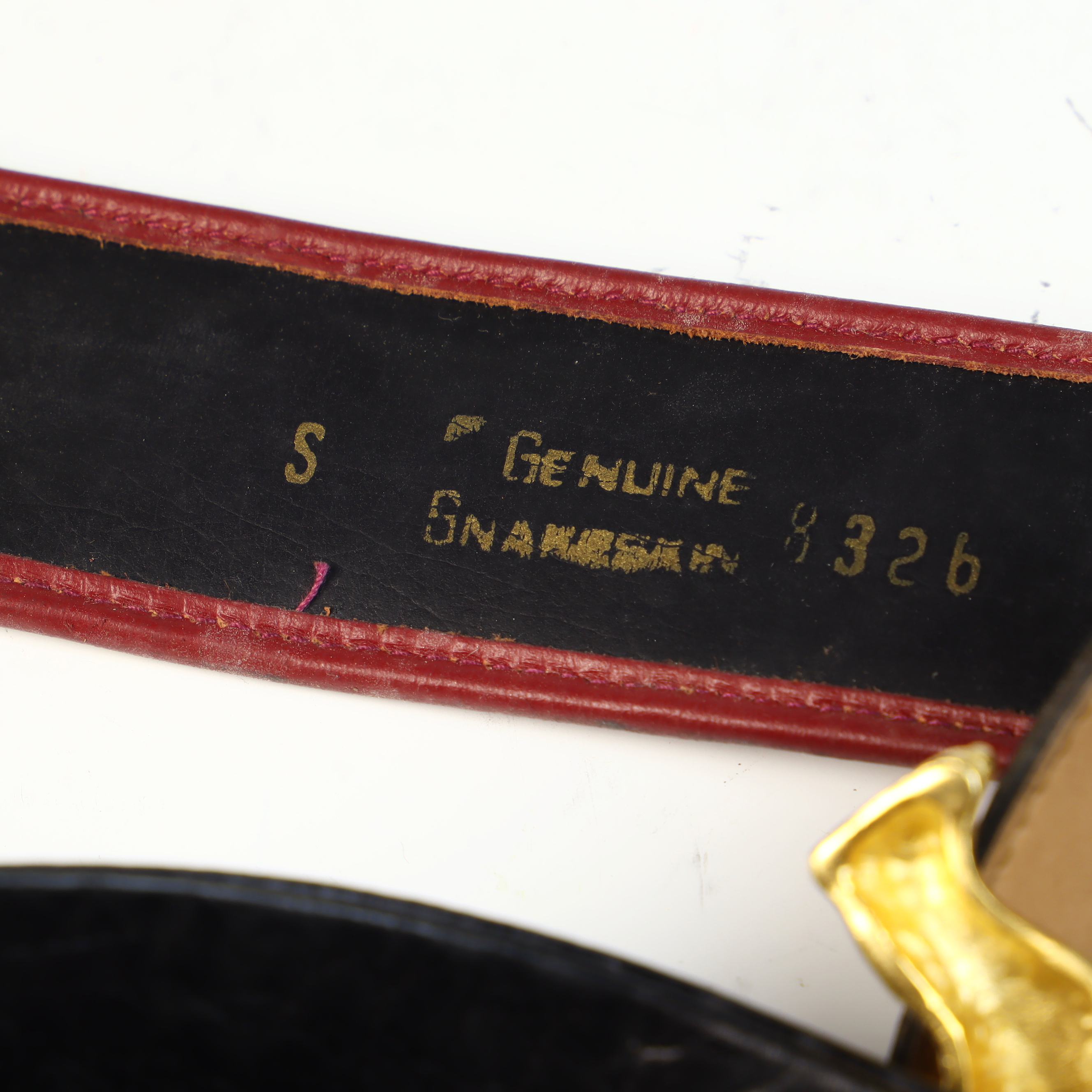 This lot includes three vintage ladies designer belts dating from the 1980s. The collection features a variety of materials including embossed leather and genuine snakeskin, generally sized for a smaller 70cm waist.The first belt is crafted from black leather with an embossed crocodile pattern. It is fitted with a large, sculpted gold-tone metal buckle in the form of a walking elephant. The reverse of the buckle bears the cast mark DRO followed by a copyright symbol.The second belt is a wide waist belt featuring a diagonal patchwork design made from genuine snakeskin in shades of burgundy, forest green, and dark brown. The black interior is stamped in gold with GENUINE SNAKESKIN and the number 8328.The third belt is a slim black snakeskin accessory with a visible scale texture and a gold-tone metal pin buckle. The tan leather interior is stamped with 7151 S and TST L.Size: 70cm.