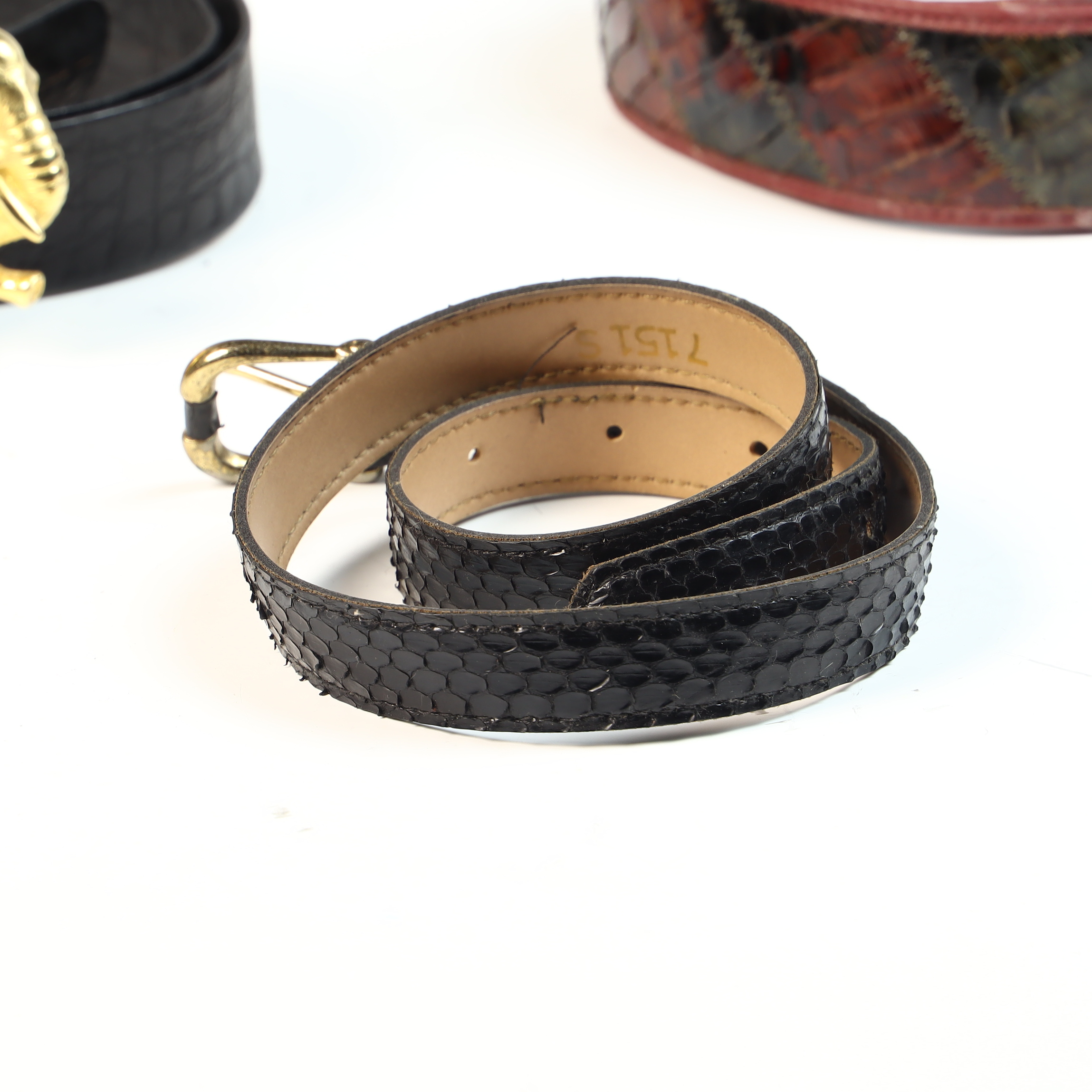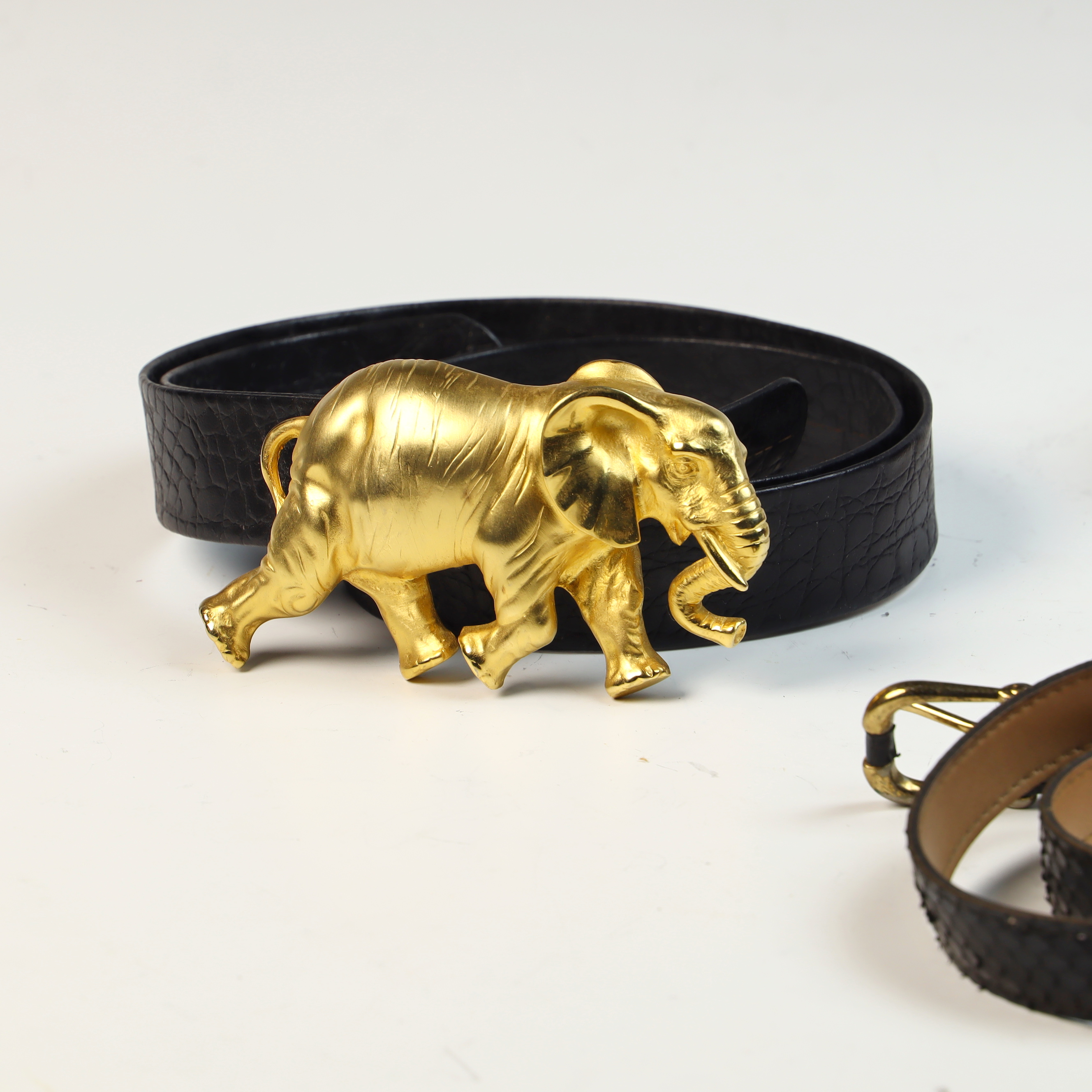 The belts are in good vintage condition overall. The elephant belt shows light wear to the leather strap and minor surface scratches on the gold-tone buckle. The patchwork belt displays minor lifting of the snakeskin scales consistent with age. The slim black belt is in fair to good condition with visible wear and minor delamination along the edges of the strap.