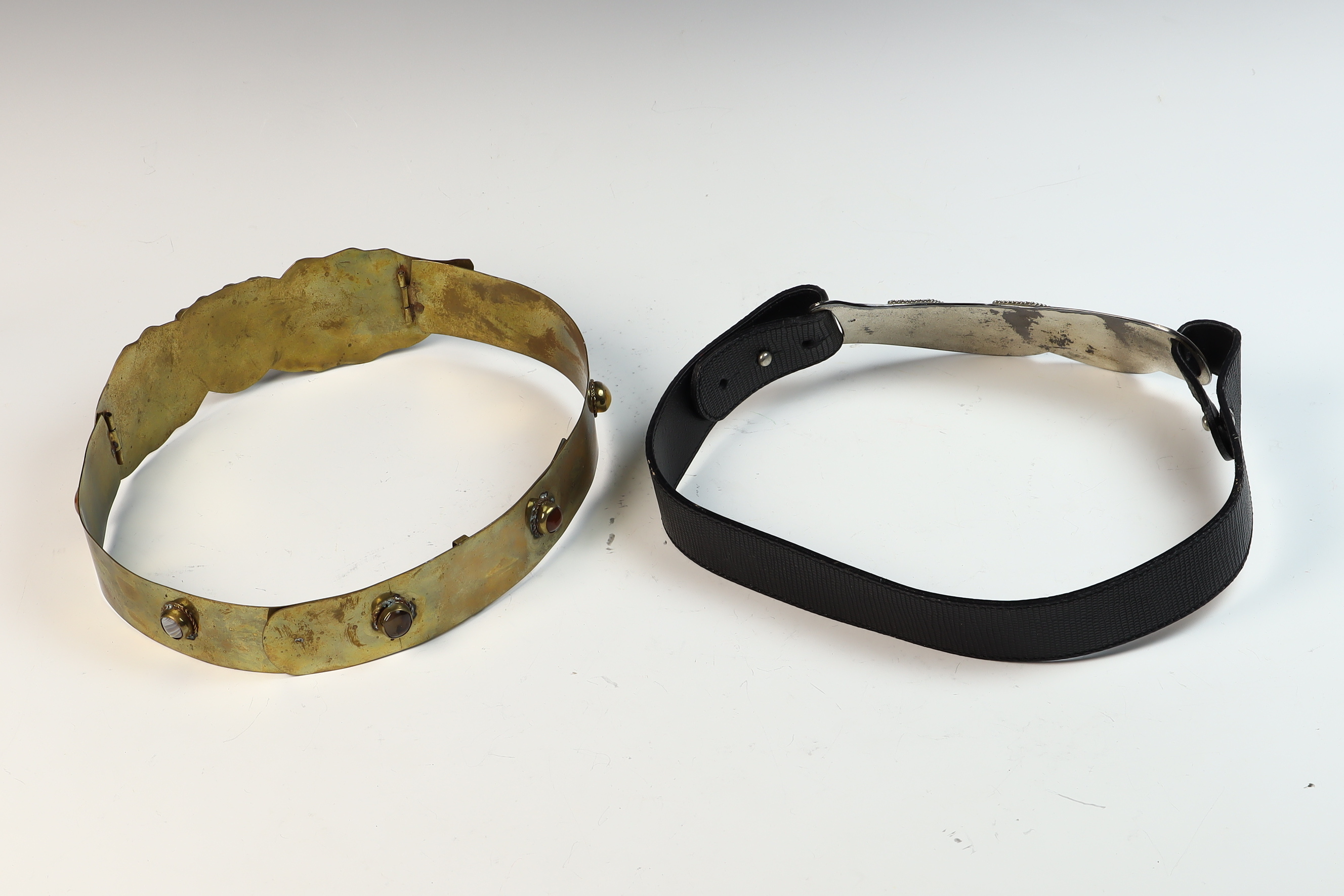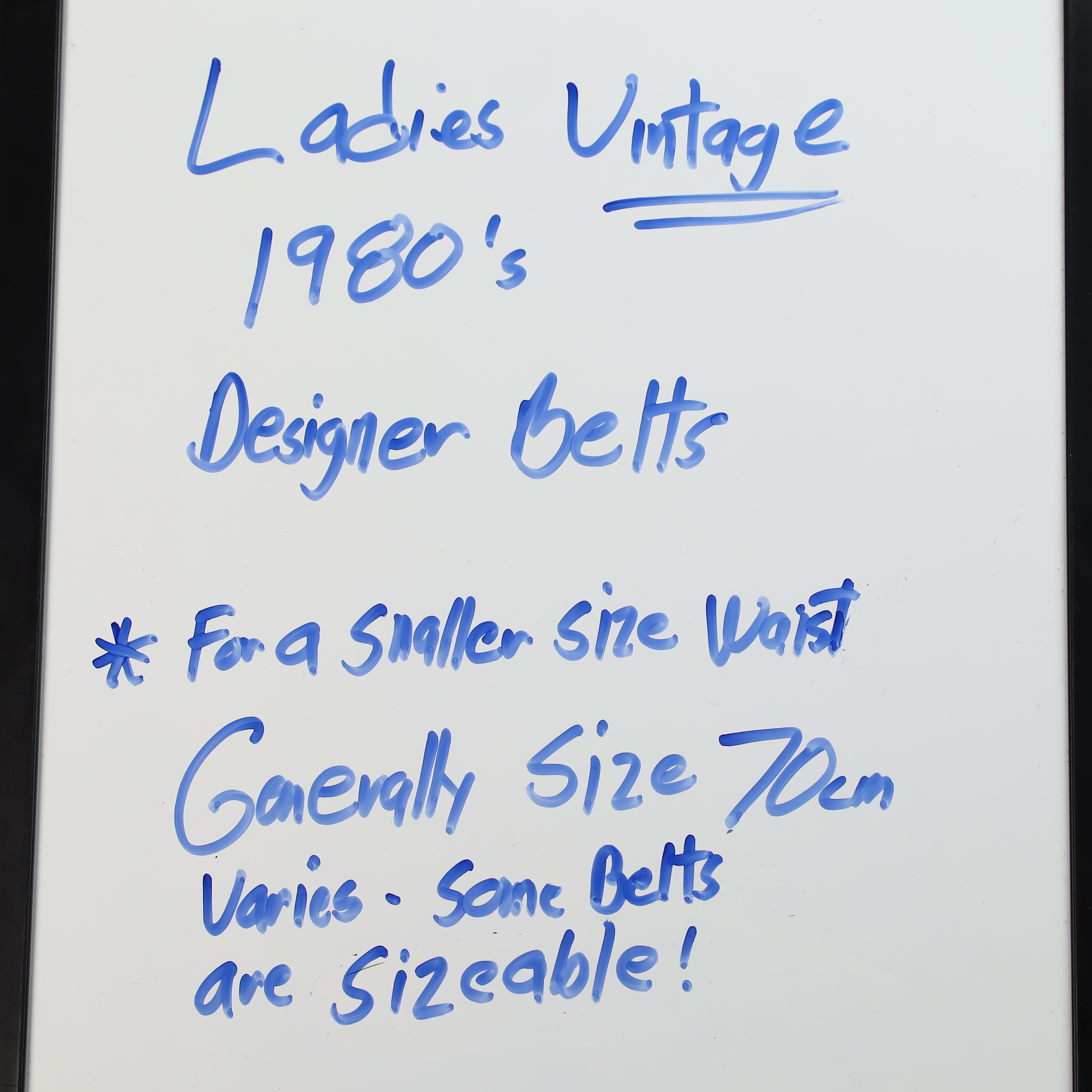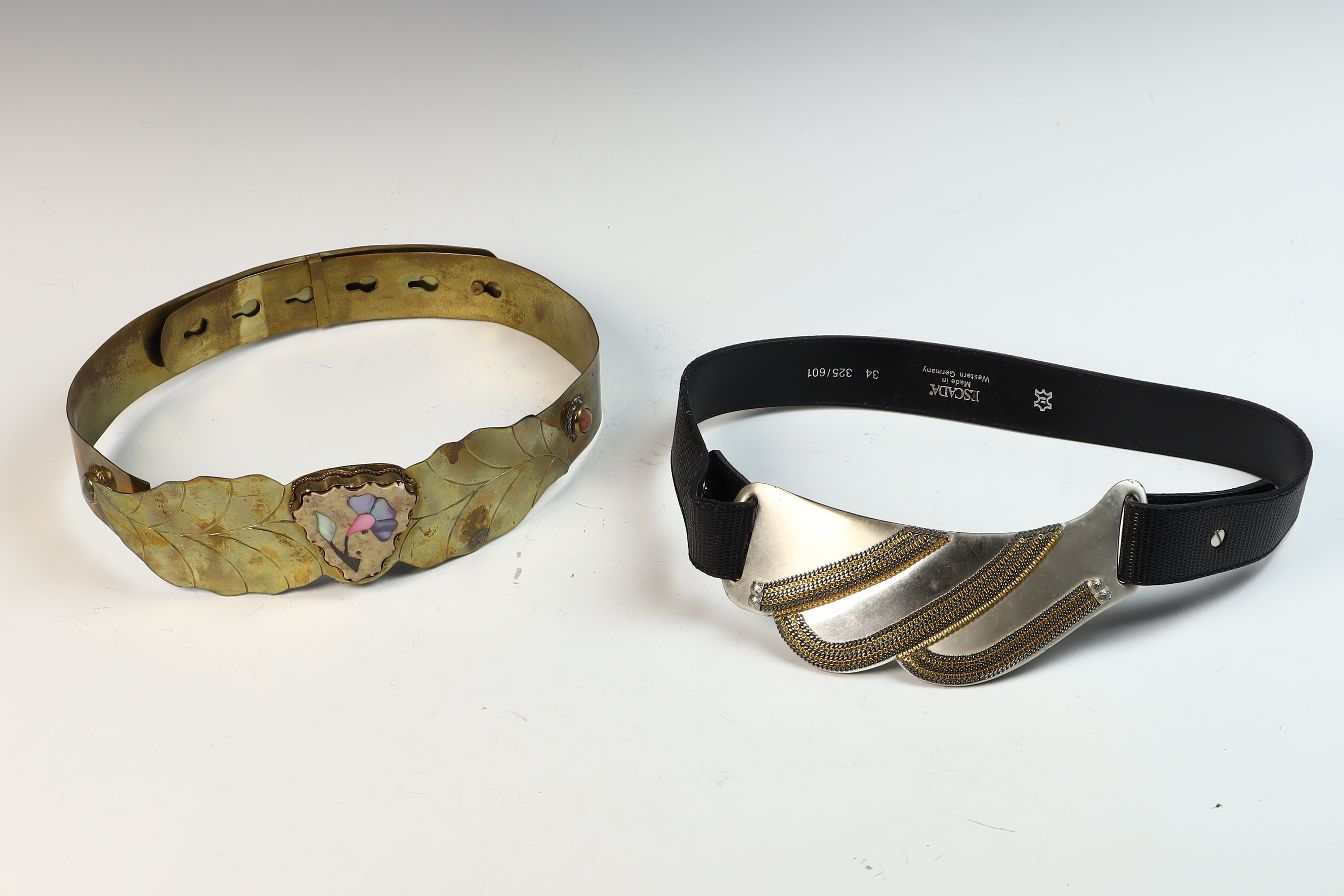 This lot features two vintage ladies fashion belts from the 1980s. The first is a branded Escada belt constructed of black lizard-embossed genuine leather. It is adorned with a large, curved silver-toned metal ornament featuring three diagonal inset bands of gold-toned chain-link mesh. The interior of the strap is stamped with the maker marks ESCADA, Made in Western Germany, size 34, and reference number 325/601, along with a genuine leather symbol. The second item is an unmarked statement waist belt crafted from gold-toned metal. The front is designed with a double-leaf motif flanking a central triangular plaque. This plaque contains an inset floral design in shades of pink, purple, and green, likely shell or enamel. The adjustable metal band is set with small multi-colored cabochon stones along the sides and utilizes a hook-and-eye closure system.Size: 70 cm.