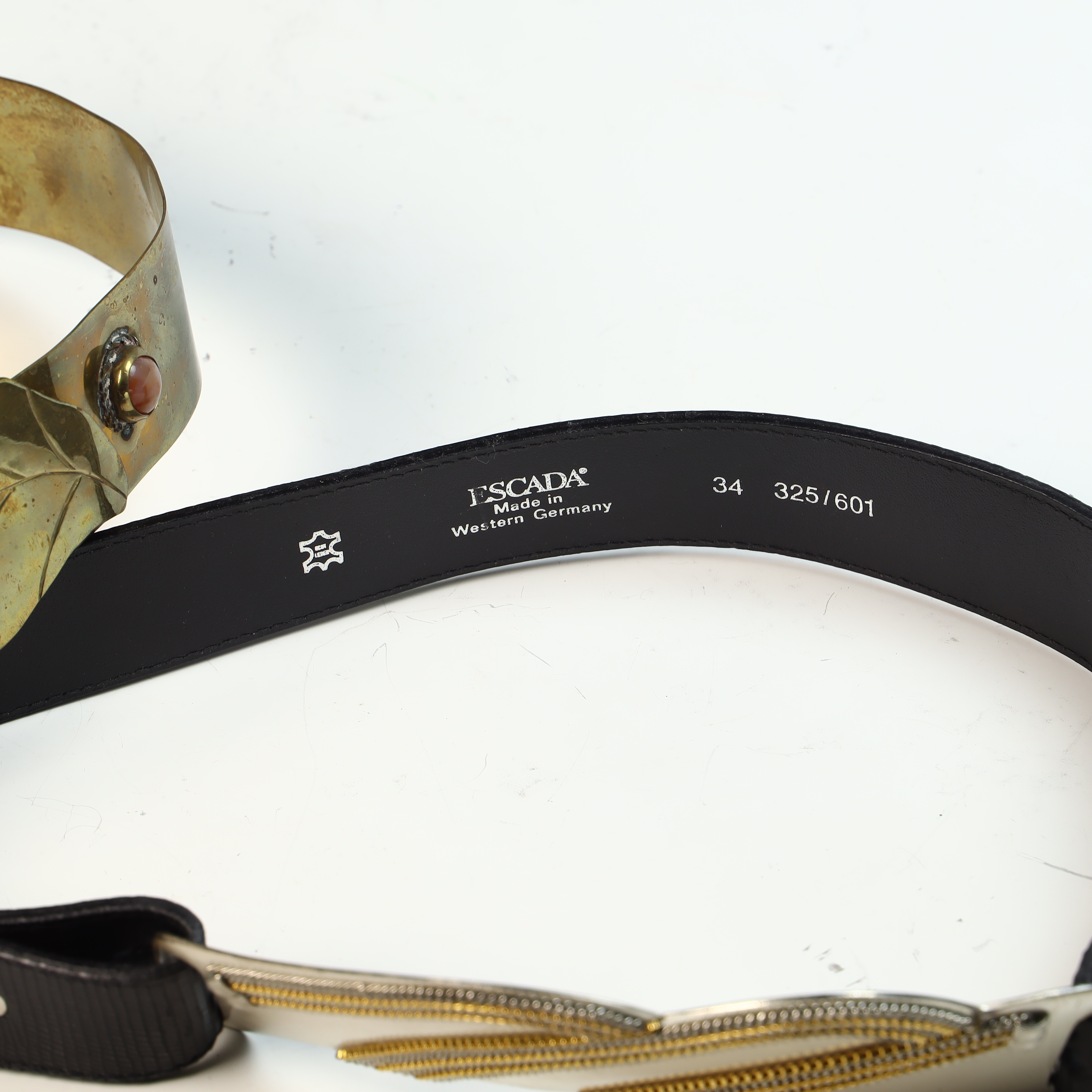 The Escada belt is in good vintage condition showing light surface wear to the leather and minor scuffing to the metal hardware. The metal leaf belt exhibits significant patina, tarnish, and surface wear consistent with age.