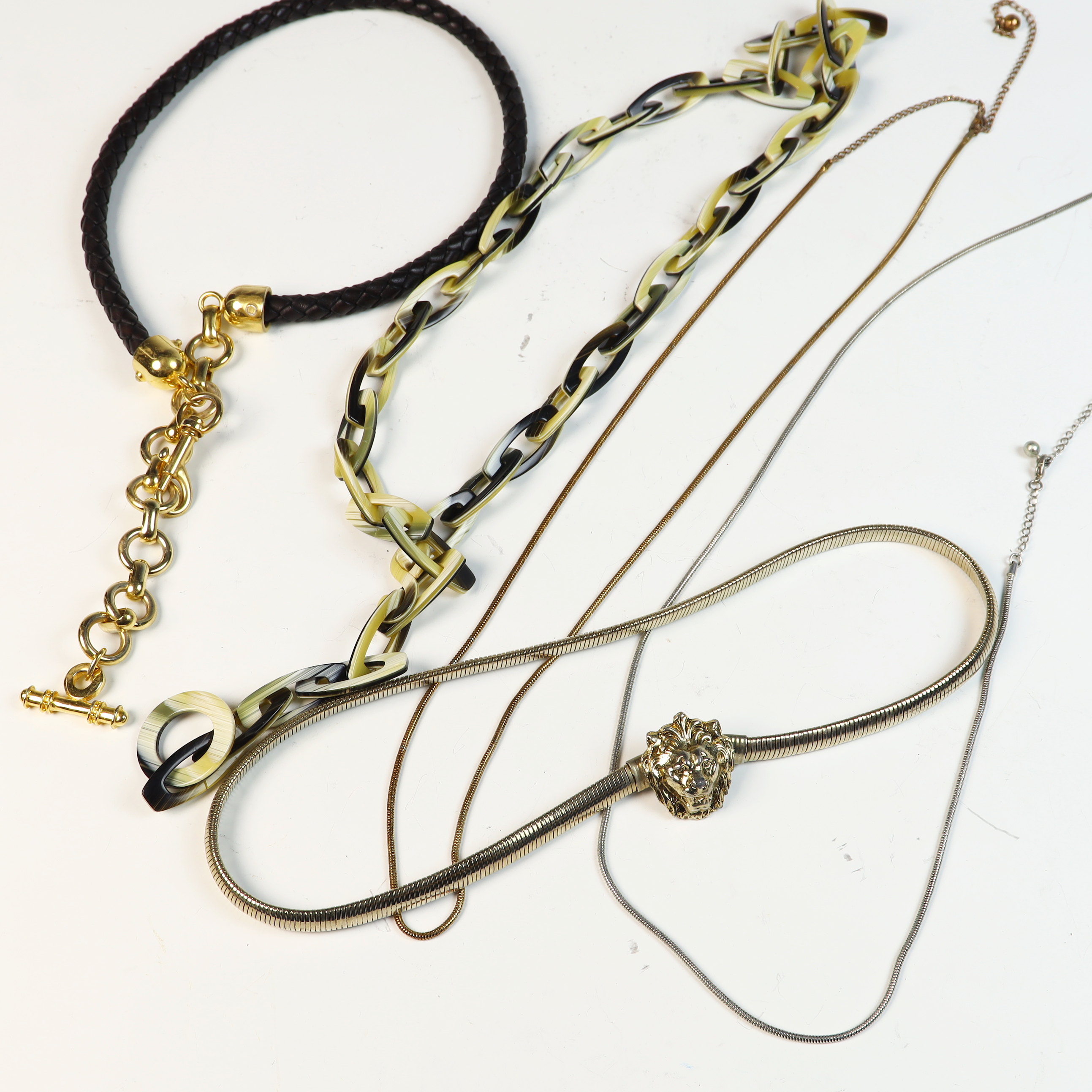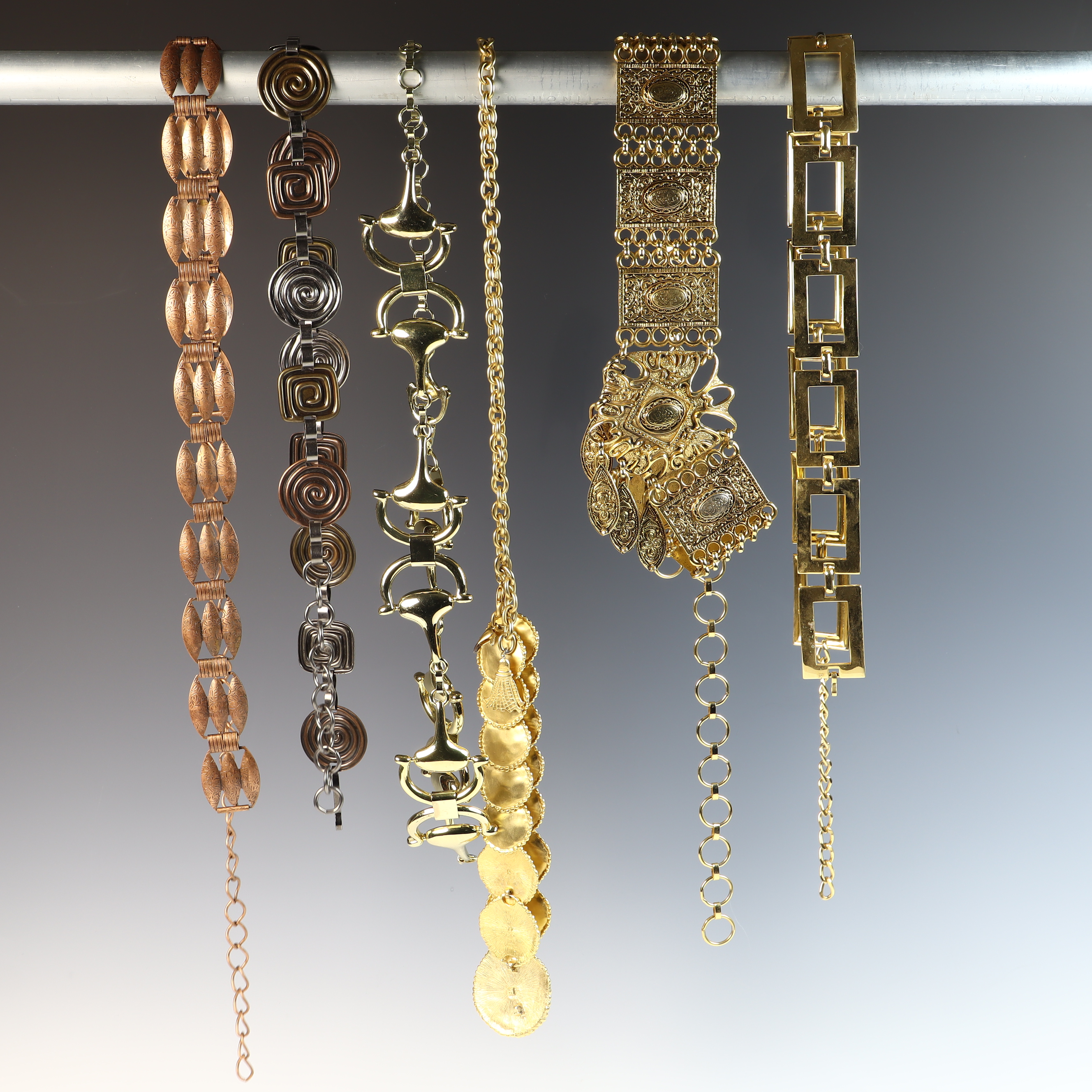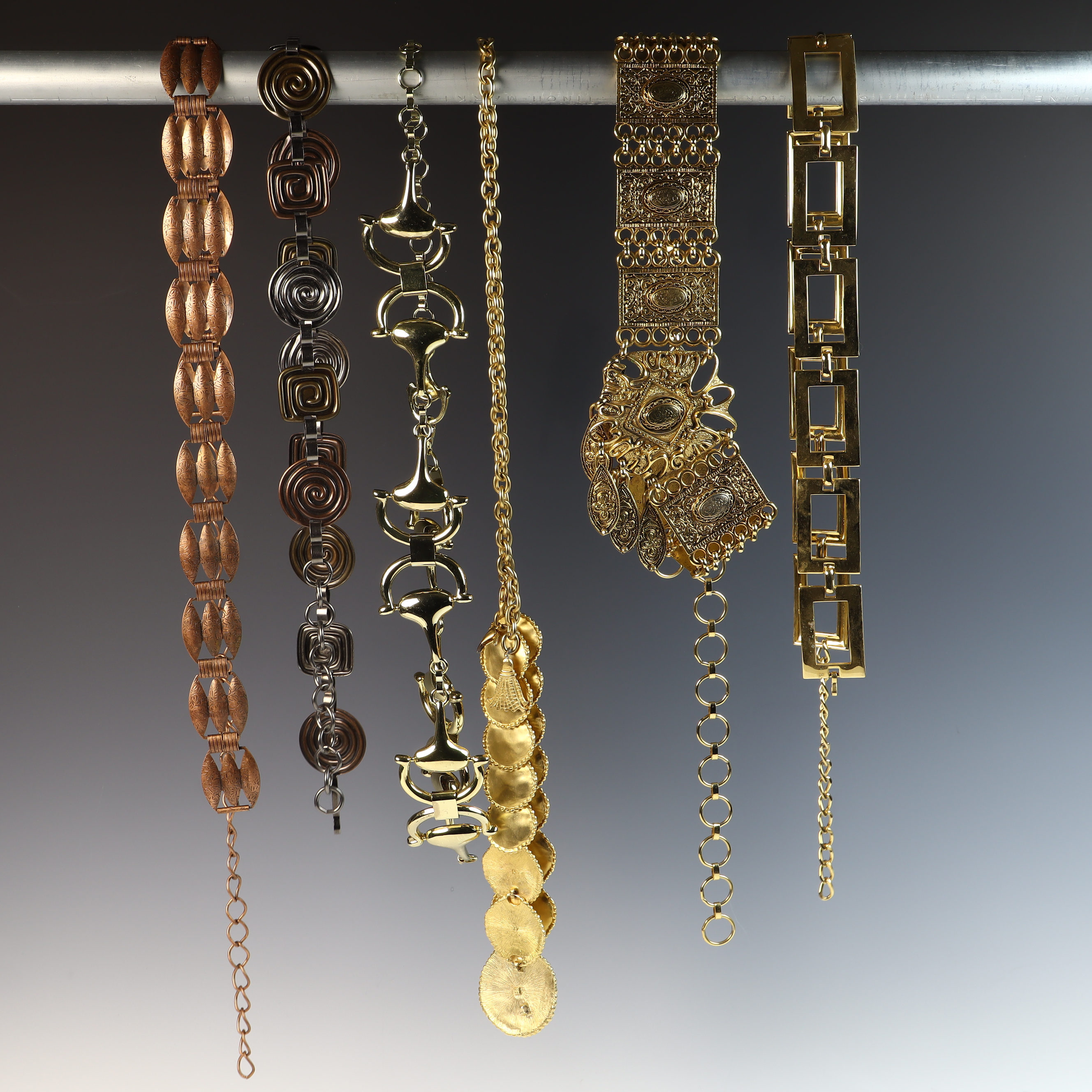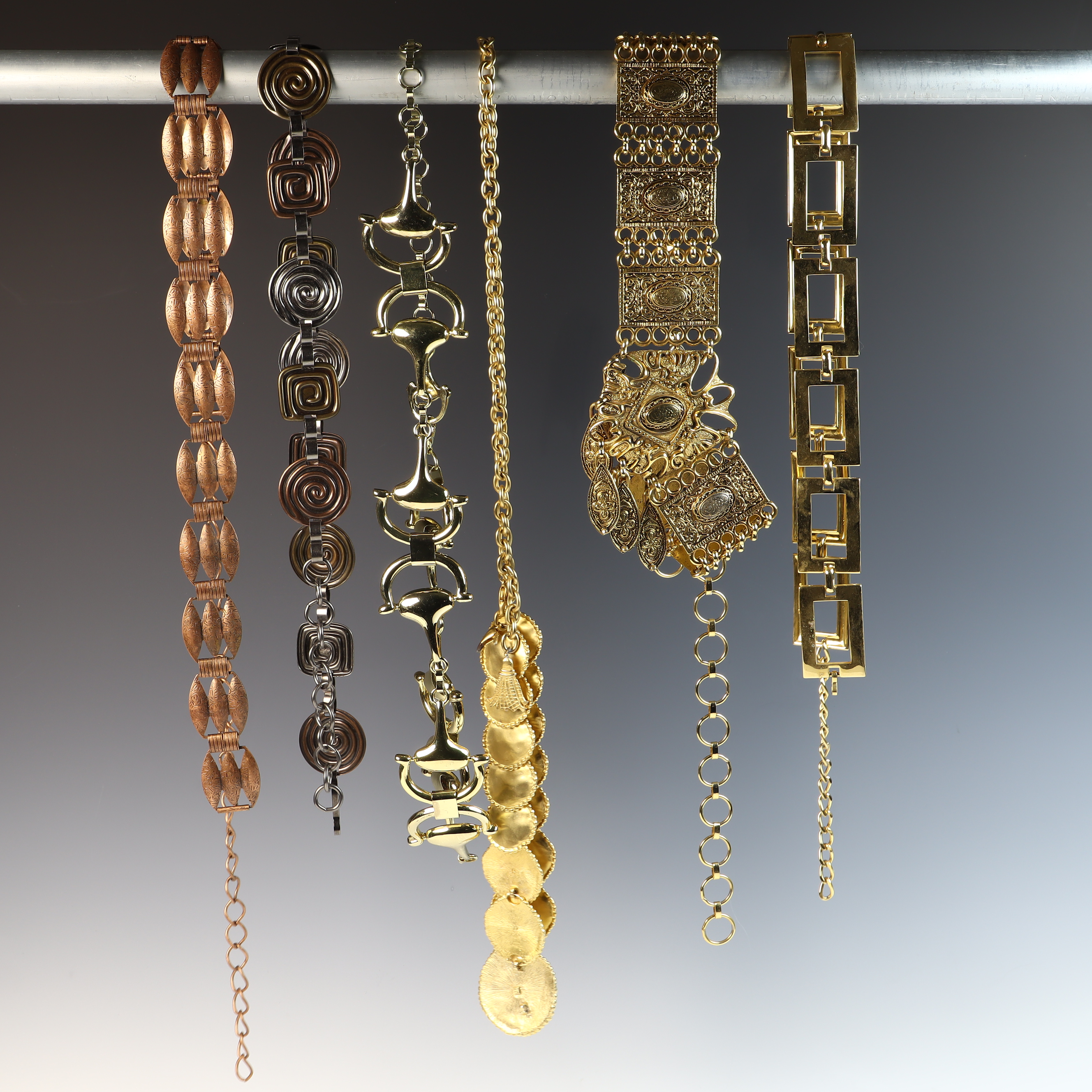 This collection of five vintage fashion belly chain belts and six metal chain belts feature a variety of 1980s styles in metallic, resin, and braided materials. A primary piece is an Anne Klein gold-tone flexible snake-style chain belt featuring a sculpted lion head buckle with a hidden hook-and-eye closure. The reverse of the buckle contains a rectangular plaque stamped ANNE KLEIN. The metallic and chain-link belts in the group include an ornate gold-tone belt with wide rectangular filigree panels and a large central drop element with hanging medallions; an equestrian-style belt with gold-tone articulated interlocking horsebit links; a mixed-metal belt featuring alternating square and circular links with concentric spiral designs in copper, brass, and silver tones; a gold-tone geometric belt with large open rectangular links and a hook and extender chain; a copper-tone belt with articulated links shaped like textured husks or shells; a gold-tone chain belt with suspended hammered-finish disc charms; and two slender snake-chain belts, one in gold-tone and one in silver-tone, both with extender chains. The resin and cord styles include an oversized chunky link belt in marbled translucent and black resin with a gold-tone T-bar toggle closure, and a dark brown braided cord belt with gold-tone hardware ends and a toggle-bar closure.Length: Approximately 70 cm (27.5 inches) generally, with some featuring adjustable extender chains.