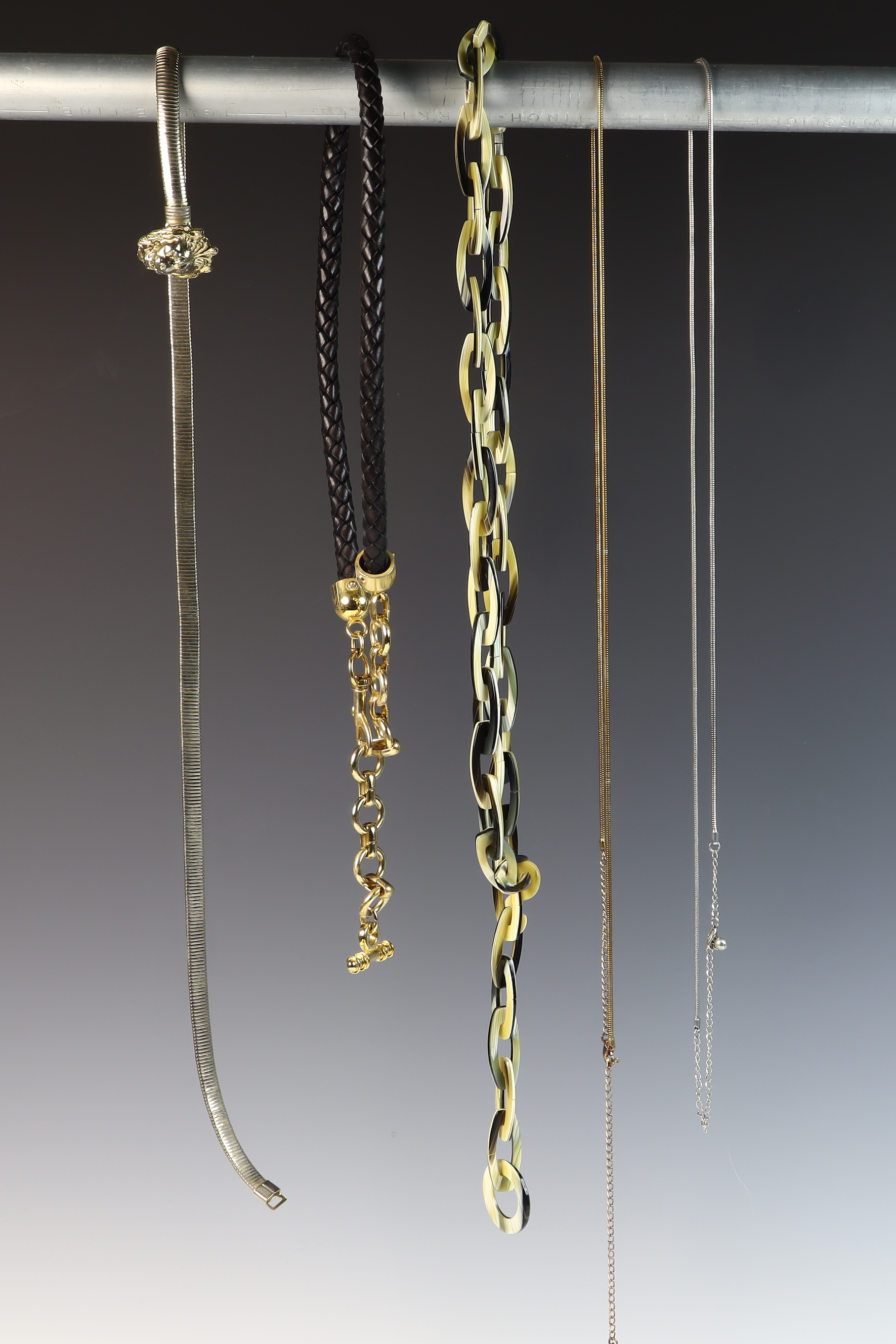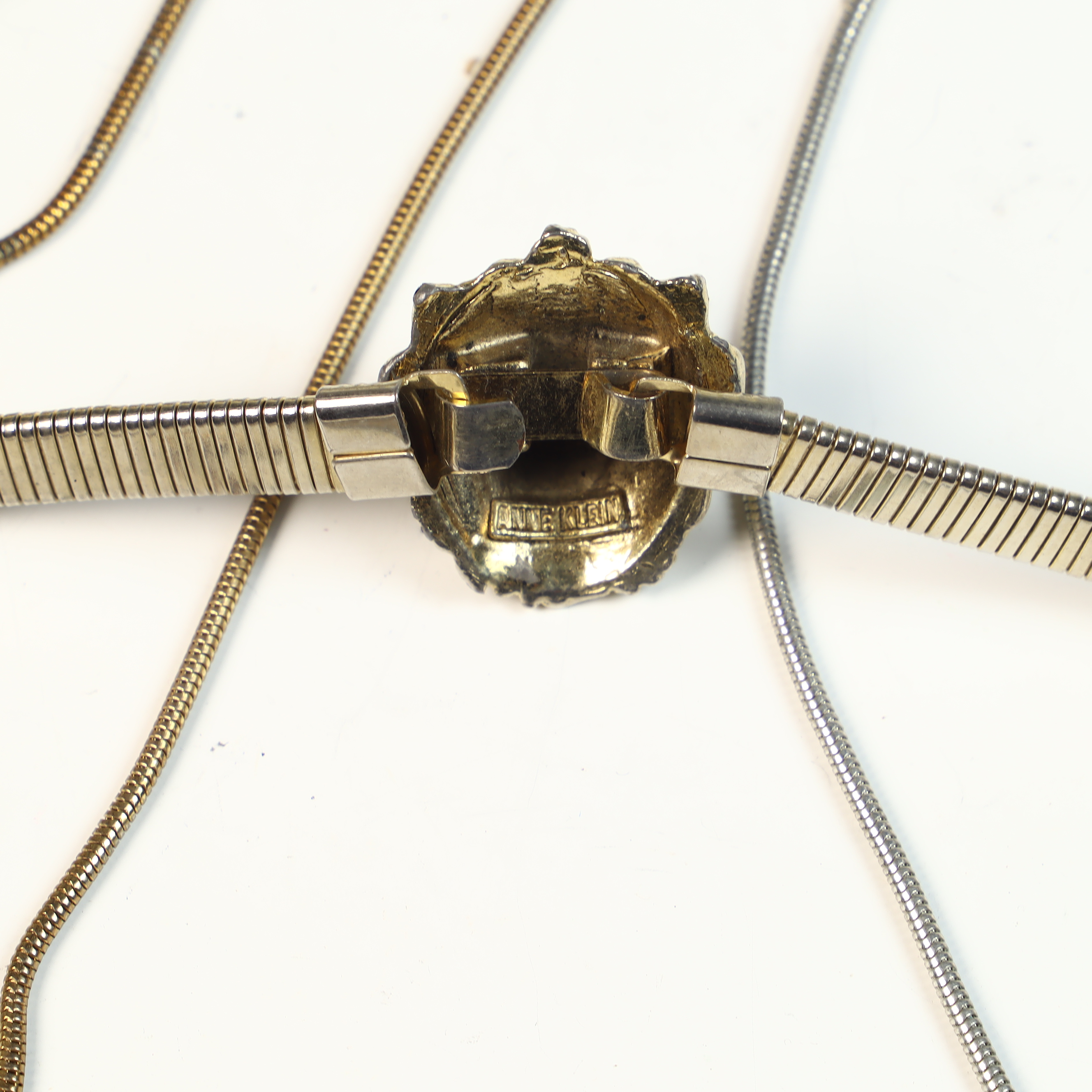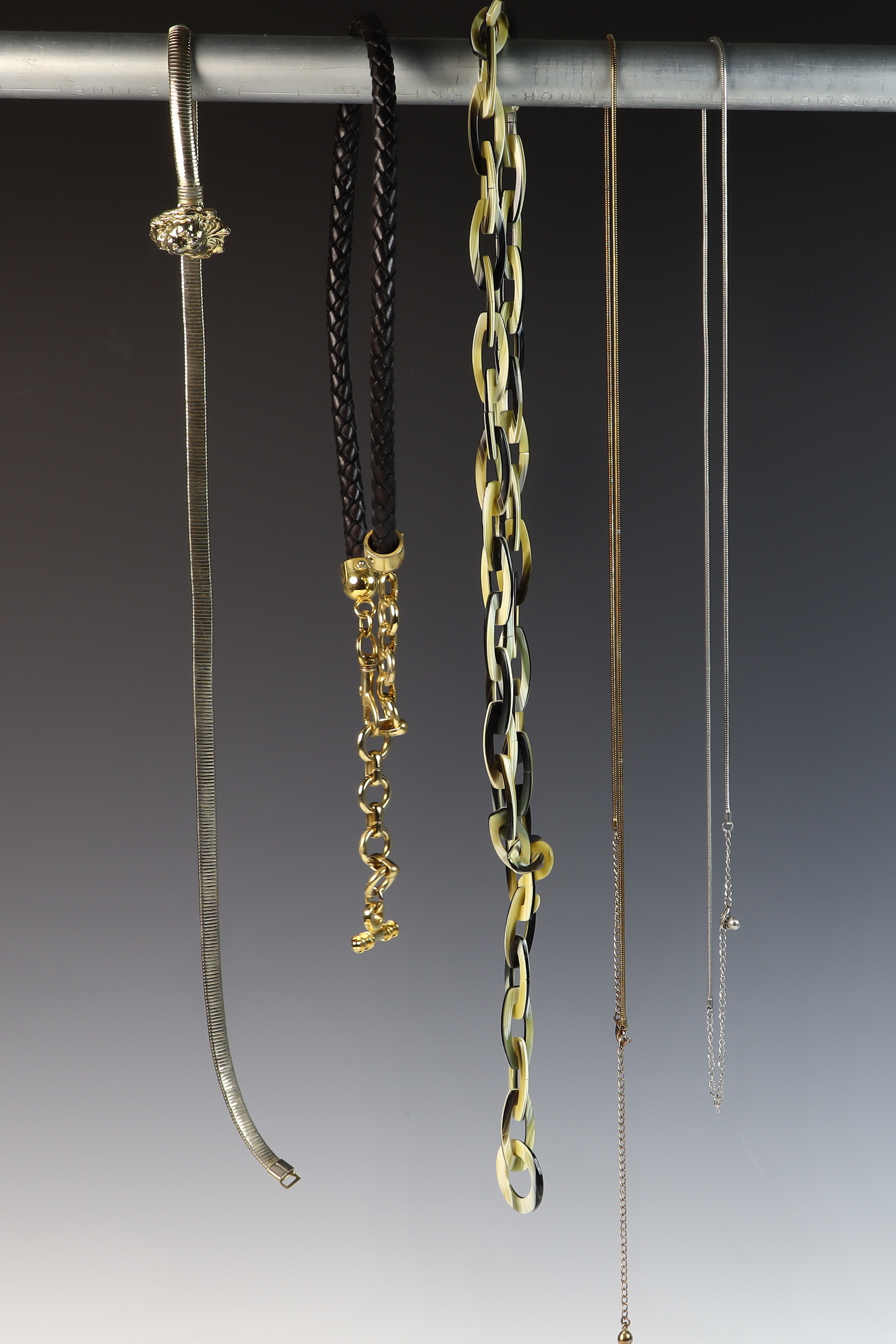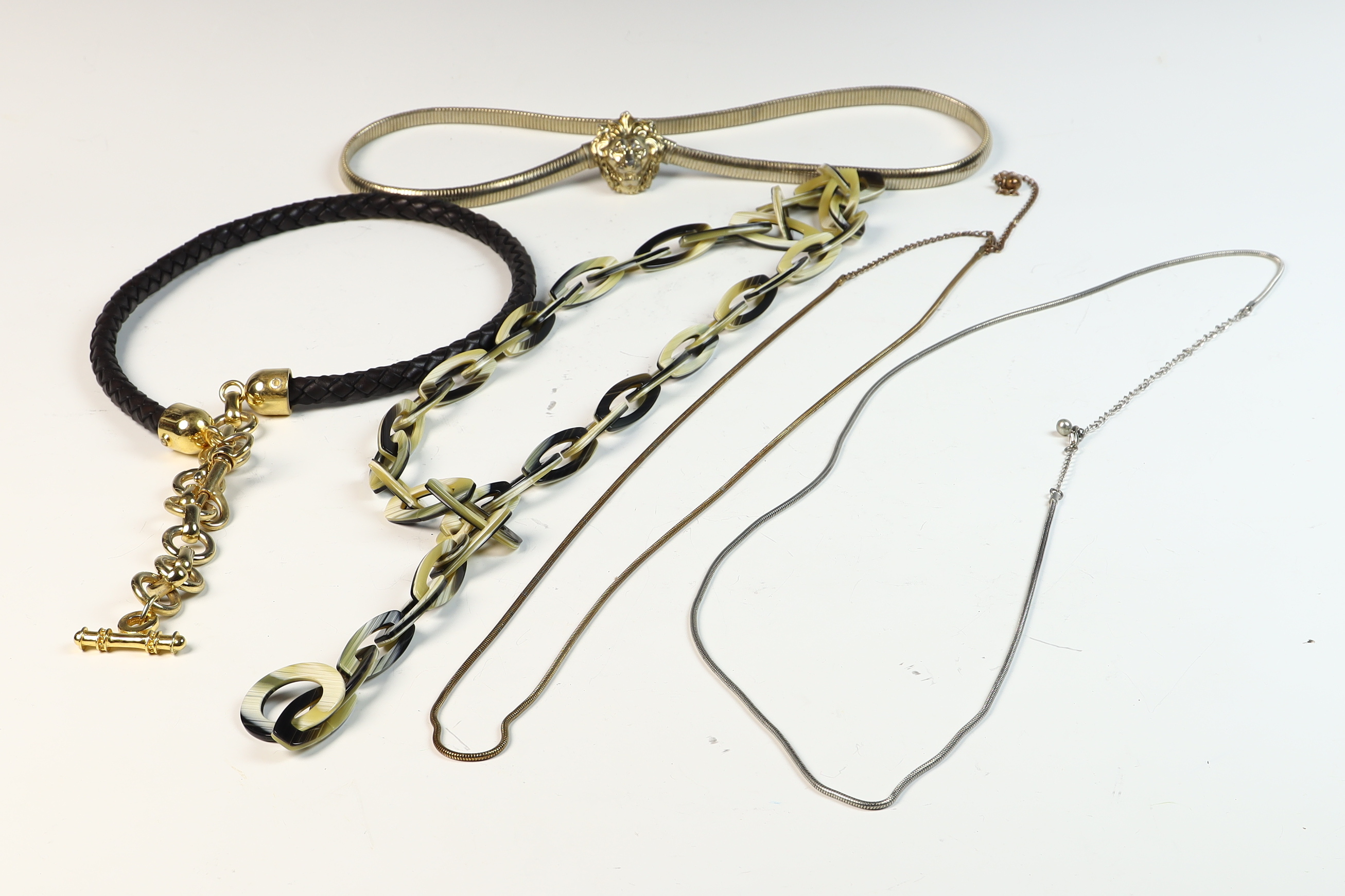 This collection of five vintage fashion belly chain belts and six metal chain belts feature a variety of 1980s styles in metallic, resin, and braided materials. A primary piece is an Anne Klein gold-tone flexible snake-style chain belt featuring a sculpted lion head buckle with a hidden hook-and-eye closure. The reverse of the buckle contains a rectangular plaque stamped ANNE KLEIN. The metallic and chain-link belts in the group include an ornate gold-tone belt with wide rectangular filigree panels and a large central drop element with hanging medallions; an equestrian-style belt with gold-tone articulated interlocking horsebit links; a mixed-metal belt featuring alternating square and circular links with concentric spiral designs in copper, brass, and silver tones; a gold-tone geometric belt with large open rectangular links and a hook and extender chain; a copper-tone belt with articulated links shaped like textured husks or shells; a gold-tone chain belt with suspended hammered-finish disc charms; and two slender snake-chain belts, one in gold-tone and one in silver-tone, both with extender chains. The resin and cord styles include an oversized chunky link belt in marbled translucent and black resin with a gold-tone T-bar toggle closure, and a dark brown braided cord belt with gold-tone hardware ends and a toggle-bar closure.Length: Approximately 70 cm (27.5 inches) generally, with some featuring adjustable extender chains.