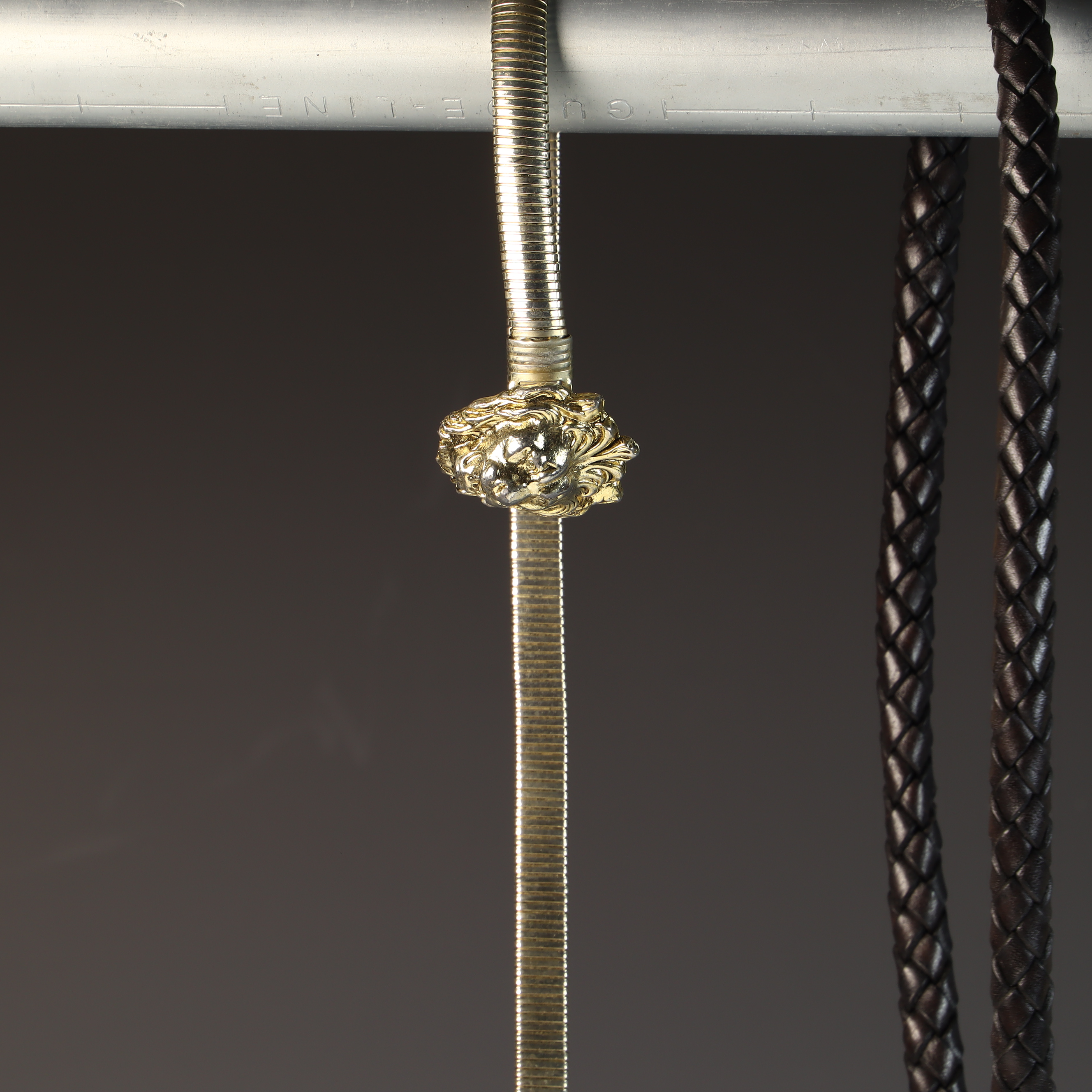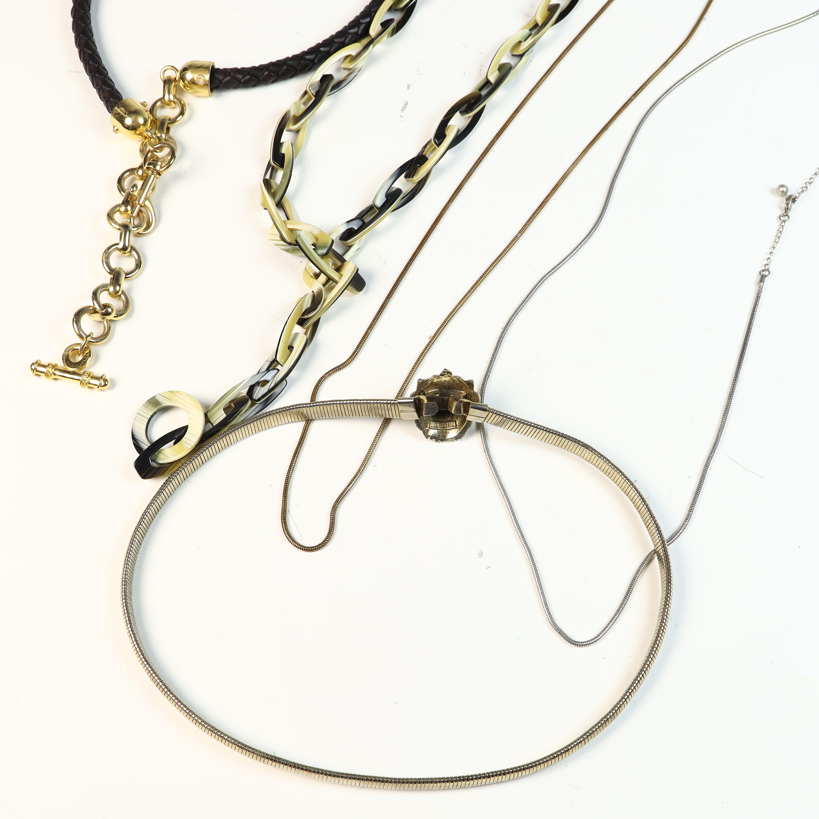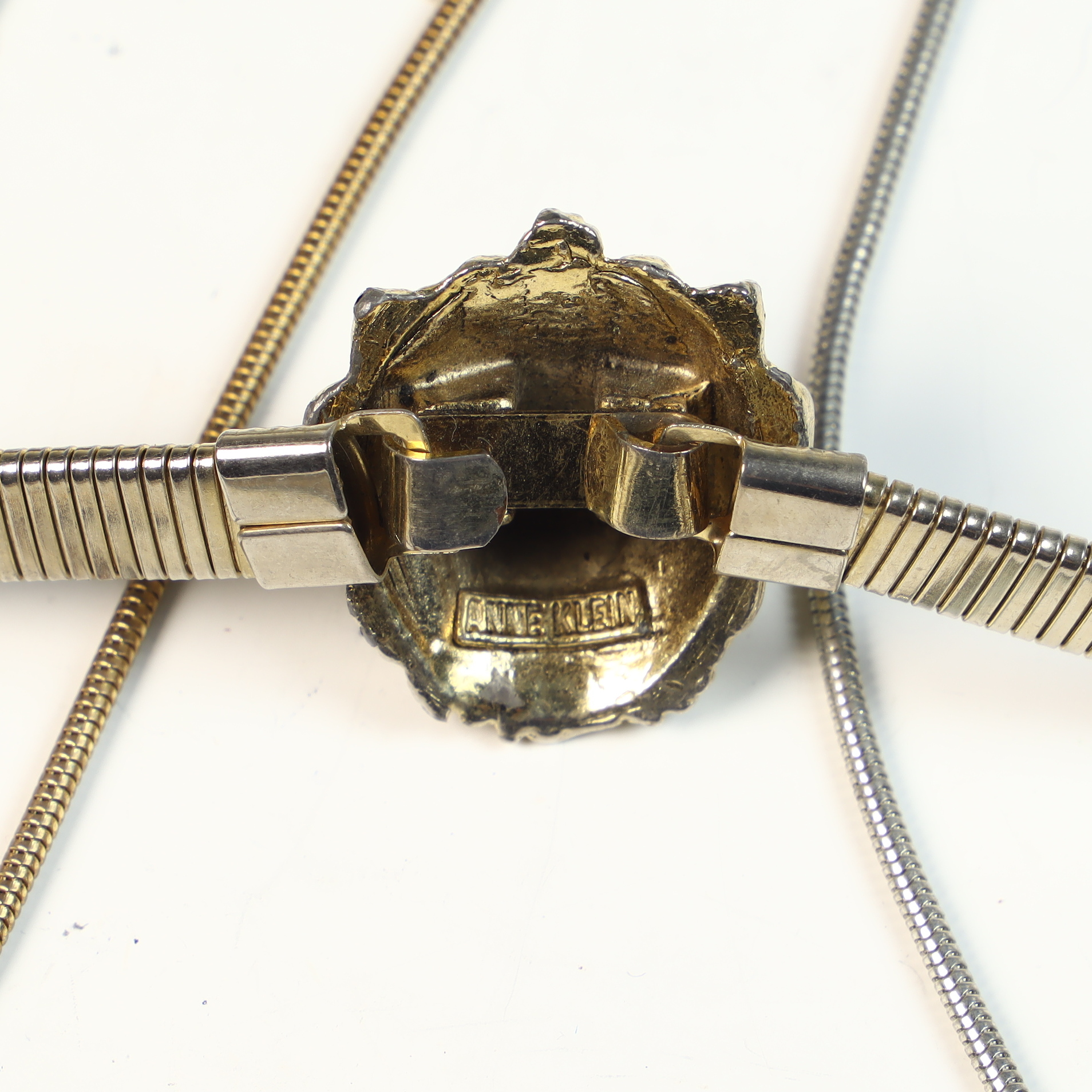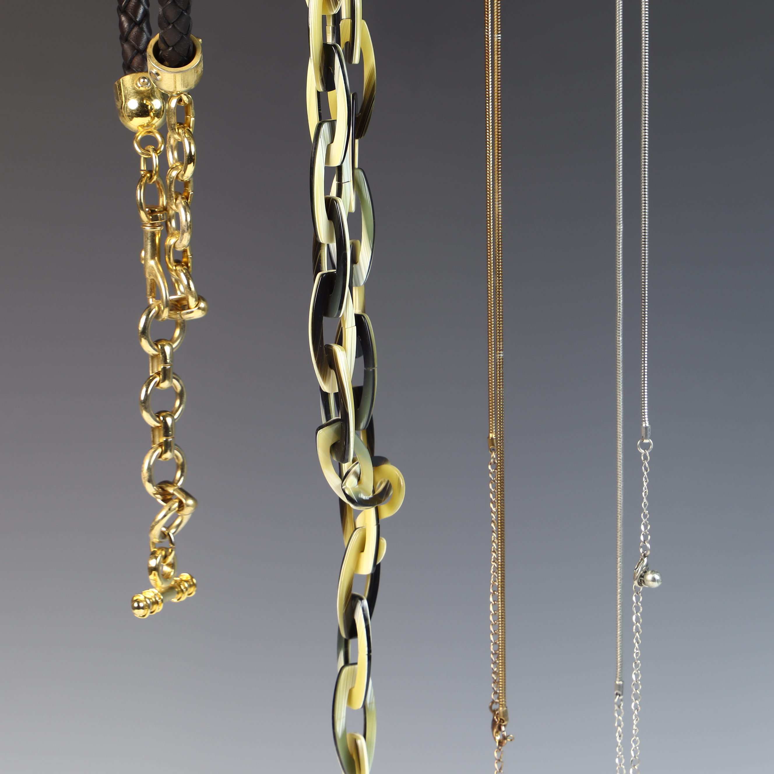 This collection of five vintage fashion belly chain belts and six metal chain belts feature a variety of 1980s styles in metallic, resin, and braided materials. A primary piece is an Anne Klein gold-tone flexible snake-style chain belt featuring a sculpted lion head buckle with a hidden hook-and-eye closure. The reverse of the buckle contains a rectangular plaque stamped ANNE KLEIN. The metallic and chain-link belts in the group include an ornate gold-tone belt with wide rectangular filigree panels and a large central drop element with hanging medallions; an equestrian-style belt with gold-tone articulated interlocking horsebit links; a mixed-metal belt featuring alternating square and circular links with concentric spiral designs in copper, brass, and silver tones; a gold-tone geometric belt with large open rectangular links and a hook and extender chain; a copper-tone belt with articulated links shaped like textured husks or shells; a gold-tone chain belt with suspended hammered-finish disc charms; and two slender snake-chain belts, one in gold-tone and one in silver-tone, both with extender chains. The resin and cord styles include an oversized chunky link belt in marbled translucent and black resin with a gold-tone T-bar toggle closure, and a dark brown braided cord belt with gold-tone hardware ends and a toggle-bar closure.Length: Approximately 70 cm (27.5 inches) generally, with some featuring adjustable extender chains.